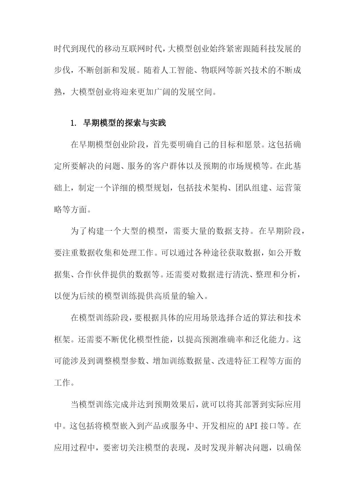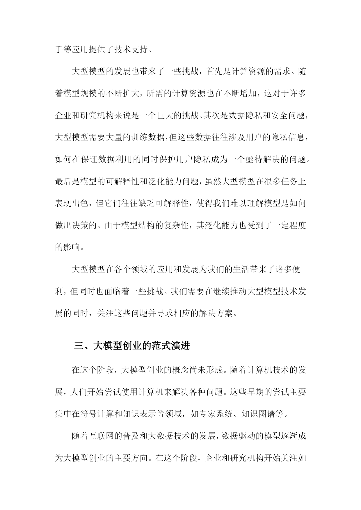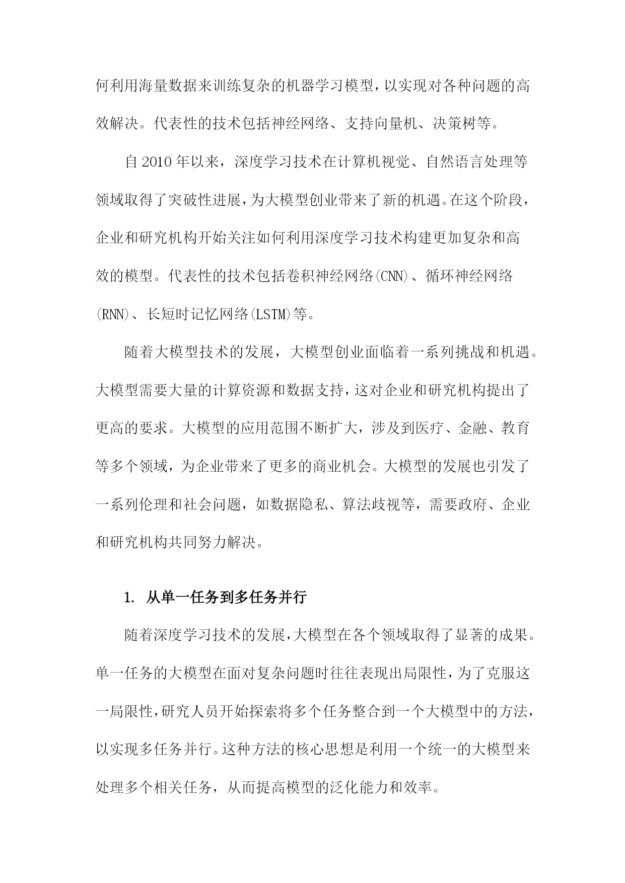 大模型创业:范式演进与理论建构一、大模型创业的背景与意义随着人工智能技术的飞速发展,大模型创业已经成为了当今科技领域的一个热门话题。从自然语言处理、计算机视觉到语音识别等领域,大模型的应用已经渗透到了各个行业,为人们的生产和生活带来了极大的便利。在这个背景下,大模型创业不仅具有巨大的市场潜力,而且对于推动科技创新、促进产业升级具有重要的意义。大模型创业有助于推动科技创新,在过去的几十年里,人工智能技术取得了显著的进步,但仍然存在许多局限性,如模型泛化能力不足、计算资源消耗巨大等。通过大模型创业,研究者们可以不断地挑战这些技术难题,提高人工智能的性能,从而推动整个领域的发展。大模型创业对于促进产业升级具有重要意义,随着大数据、云计算等技术的发展,大模型的应用场景越来越广泛,涵盖了金融、医疗、教育等多个领域。这不仅可以提高各个行业的生产效率,而且还可以为人们提供更加智能化的服务,满足人们日益增长的需求。大模型创业还有助于培养人才,随着大模型创业的火热,越来越多的年轻人投身于这个领域,从事相关的研究和开发工作。这不仅为我国培养了大量的科技人才,而且还为社会输送了一批具备创新精神和实践能力的复合型人才。大模型创业作为一种新兴的创业模式,其背景和意义都十分重要。在未来的发展过程中,我们应该充分发挥大模型的优势,不断创新和完善相关技术,为推动科技创新和产业升级做出更大的贡献。1.大数据时代的到来随着互联网技术的飞速发展,尤其是移动互联网的普及,人类社会进入了一个全新的大数据时代。在这个时代,数据的产生、传输和处理速度远远超过了以往任何时候,而数据的价值也变得越来越显著。大数据时代的到来,为各行各业带来了前所未有的机遇和挑战。大数据时代的到来使得信息的获取和传播变得更加便捷,人们获取信息的方式主要是通过书籍、报纸、电视等传统媒体,而这些媒体的信息量有限,更新速度较慢。在大数据时代,人们可以通过互联网轻松地获取海量的信息,实时了解世界各地的动态。这使得企业可以更加迅速地了解市场需求,制定相应的战略和政策。大数据还为企业提供了丰富的用户行为数据,有助于企业更好地了解用户的喜好和需求,从而提高产品和服务的质量。大数据时代的到来为创新和发展提供了强大的动力,由于数据的匮乏和处理能力的限制,许多企业和行业的创新受到了很大的制约。在大数据时代,企业和行业可以通过对大量数据的挖掘和分析,发现潜在的商业价值和发展趋势。这不仅有助于企业找到新的商业模式和市场机会,还能够推动整个社会的进步和发展。通过对医疗数据的分析,科学家们发现了一些新型疾病的特征和治疗方法,为人类的健康事业做出了贡献。大数据时代的到来也带来了一系列的挑战,如何有效地存储、管理和分析大量的数据,如何保护用户的隐私和数据安全,如何确保数据的准确性和可靠性等问题,都需要我们不断地进行研究和探索。大数据时代的竞争也变得愈发激烈,企业和个人需要不断地学习和掌握新的技能和知识,以适应这个快速变化的时代。大数据时代的到来为我们带来了前所未有的机遇和挑战,只有抓住这些机遇,应对好这些挑战,我们才能在这个时代中取得成功。2.人工智能技术的快速发展自20世纪50年代以来,人工智能(AI)技术经历了从规则驱动到数据驱动的范式演进。特别是在21世纪初,随着计算能力的提升和大数据技术的发展,深度学习成为AI领域的研究热点。深度学习是一种基于神经网络的机器学习方法,通过多层次的数据表示和抽象来实现复杂任务的学习。在这一阶段,AI技术取得了显著的进展,如图像识别、语音识别、自然语言处理等领域的技术水平得到了极大的提升。随着AI技术的快速发展,也带来了一系列挑战和问题。数据隐私和安全问题日益突出,大规模的数据收集和处理过程中,用户的隐私信息容易被泄露或滥用。AI技术的可解释性不足。许多复杂的AI模型,如深度神经网络,其内部结构和决策过程难以理解,这在一定程度上限制了AI技术在关键领域的应用。AI技术的不公平性也是一个亟待解决的问题。由于训练数据的偏见和模型的优化目标,AI系统可能在某些场景下表现出对特定群体的不公平对待。为了应对这些挑战,学者们开始关注AI技术的伦理、法律和社会影响等问题,构建了一系列理论框架和指导原则。可解释性AI(XAI)旨在提高AI模型的可解释性,使其决策过程更加透明;公平性AI(FairnessAI)关注AI技术的公平性问题。确保其符合人类价值观和法律法规。政府和企业高度重视AI技术的发展。2017年,国务院发布了《新一代人工智能发展规划》,明确提出要加快发展以人工智能为核心的新一代信息技术产业。中国在AI领域取得了一系列重要成果,如百度的深度学习平台、阿里巴巴的机器翻译系统、腾讯的计算机视觉等。中国的科研机构和高校也在积极开展AI技术研究和人才培养,为我国AI产