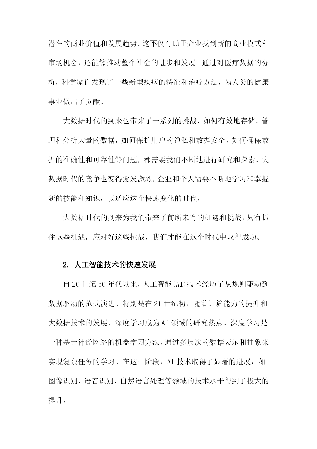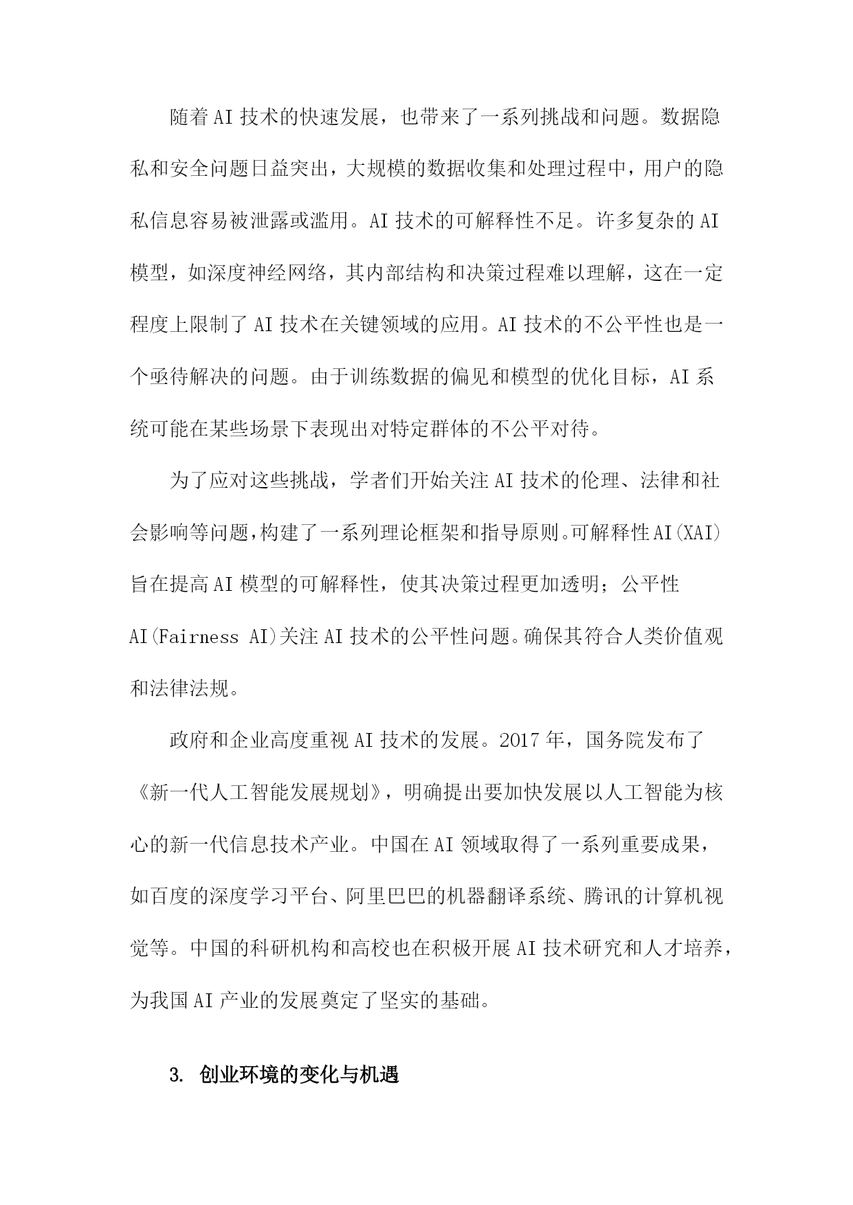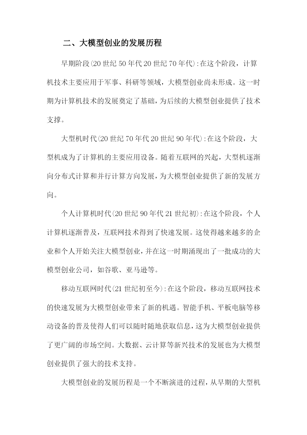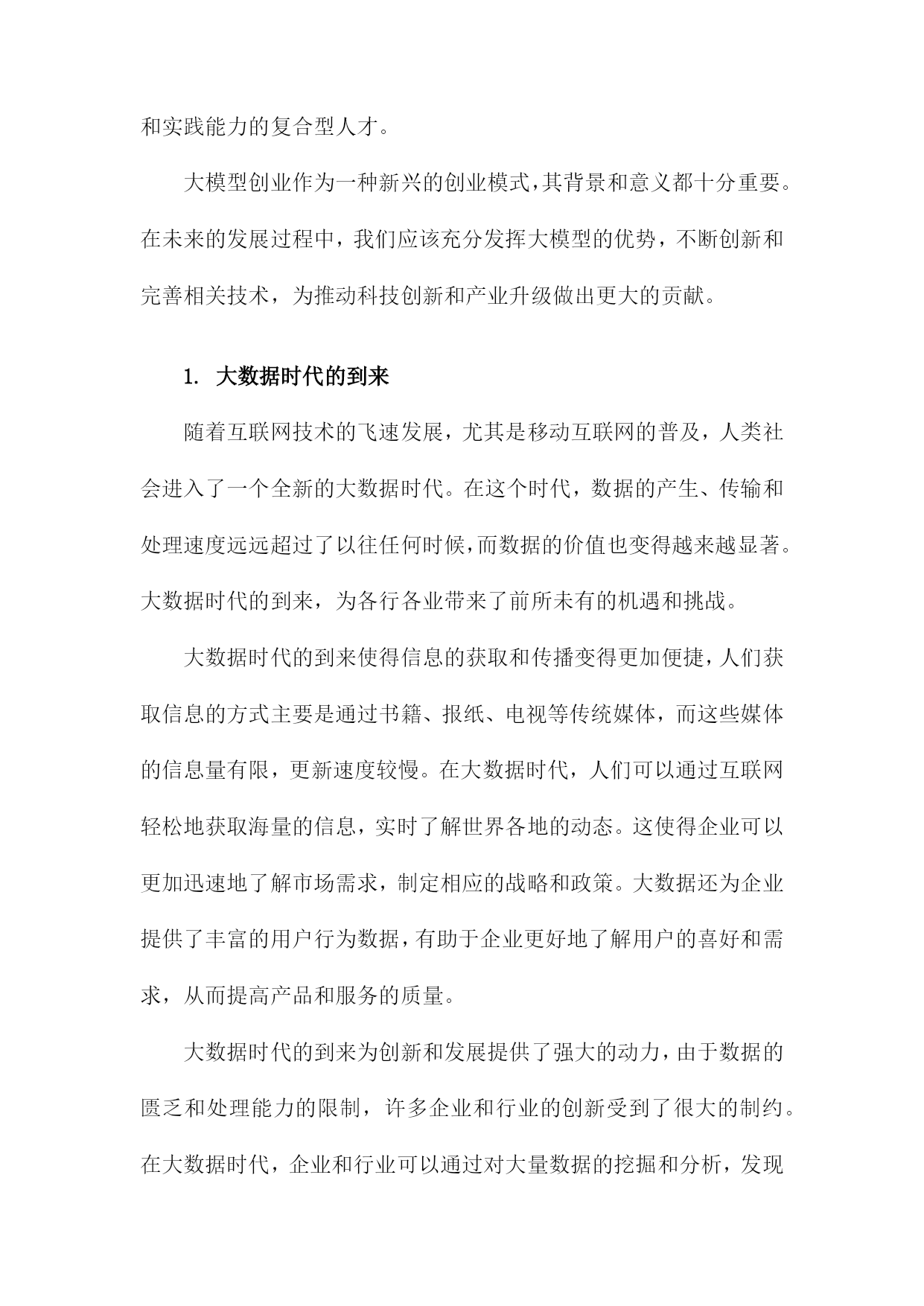 大模型创业:范式演进与理论建构一、大模型创业的背景与意义随着人工智能技术的飞速发展,大模型创业已经成为了当今科技领域的一个热门话题。从自然语言处理、计算机视觉到语音识别等领域,大模型的应用已经渗透到了各个行业,为人们的生产和生活带来了极大的便利。在这个背景下,大模型创业不仅具有巨大的市场潜力,而且对于推动科技创新、促进产业升级具有重要的意义。大模型创业有助于推动科技创新,在过去的几十年里,人工智能技术取得了显著的进步,但仍然存在许多局限性,如模型泛化能力不足、计算资源消耗巨大等。通过大模型创业,研究者们可以不断地挑战这些技术难题,提高人工智能的性能,从而推动整个领域的发展。大模型创业对于促进产业升级具有重要意义,随着大数据、云计算等技术的发展,大模型的应用场景越来越广泛,涵盖了金融、医疗、教育等多个领域。这不仅可以提高各个行业的生产效率,而且还可以为人们提供更加智能化的服务,满足人们日益增长的需求。大模型创业还有助于培养人才,随着大模型创业的火热,越来越多的年轻人投身于这个领域,从事相关的研究和开发工作。这不仅为我国培养了大量的科技人才,而且还为社会输送了一批具备创新精神和实践能力的复合型人才。大模型创业作为一种新兴的创业模式,其背景和意义都十分重要。在未来的发展过程中,我们应该充分发挥大模型的优势,不断创新和完善相关技术,为推动科技创新和产业升级做出更大的贡献。1.大数据时代的到来随着互联网技术的飞速发展,尤其是移动互联网的普及,人类社会进入了一个全新的大数据时代。在这个时代,数据的产生、传输和处理速度远远超过了以往任何时候,而数据的价值也变得越来越显著。大数据时代的到来,为各行各业带来了前所未有的机遇和挑战。大数据时代的到来使得信息的获取和传播变得更加便捷,人们获取信息的方式主要是通过书籍、报纸、电视等传统媒体,而这些媒体的信息量有限,更新速度较慢。在大数据时代,人们可以通过互联网轻松地获取海量的信息,实时了解世界各地的动态。这使得企业可以更加迅速地了解市场需求,制定相应的战略和政策。大数据还为企业提供了丰富的用户行为数据,有助于企业更好地了解用户的喜好和需求,从而提高产品和服务的质量。大数据时代的到来为创新和发展提供了强大的动力,由于数据的匮乏和处理能力的限制,许多企业和行业的创新受到了很大的制约。在大数据时代,企业和行业可以通过对大量数据的挖掘和分析,发现潜在的商业价值和发展趋势。这不仅有助于企业找到新的商业模式和市场机会,还能够推动整个社会的进步和发展。通过对医疗数据的分析,科学家们发现了一些新型疾病的特征和治疗方法,为人类的健康事业做出了贡献。大数据时代的到来也带来了一系列的挑战,如何有效地存储、管理和分析大量的数据,如何保护用户的隐私和数据安全,如何确保数据的准确性和可靠性等问题,都需要我们不断地进行研究和探索。大数据时代的竞争也变得愈发激烈,企业和个人需要不断地学习和掌握新的技能和知识,以适应这个快速变化的时代。大数据时代的到来为我们带来了前所未有的机遇和挑战,只有抓住这些机遇,应对好这些挑战,我们才能在这个时代中取得成功。2.人工智能技术的快速发展自20世纪50年代以来,人工智能(AI)技术经历了从规则驱动到数据驱动的范式演进。特别是在21世纪初,随着计算能力的提升和大数据技术的发展,深度学习成为AI领域的研究热点。深度学习是一种基于神经网络的机器学习方法,通过多层次的数据表示和抽象来实现复杂任务的学习。在这一阶段,AI技术取得了显著的进展,如图像识别、语音识别、自然语言处理等领域的技术水平得到了极大的提升。随着AI技术的快速发展,也带来了一系列挑战和问题。数据隐私和安全问题日益突出,大规模的数据收集和处理过程中,用户的隐私信息容易被泄露或滥用。AI技术的可解释性不足。许多复杂的AI模型,如深度神经网络,其内部结构和决策过程难以理解,这在一定程度上限制了AI技术在关键领域的应用。AI技术的不公平性也是一个亟待解决的问题。由于训练数据的偏见和模型的优化目标,AI系统可能在某些场景下表现出对特定群体的不公平对待。为了应对这些挑战,学者们开始关注AI技术的伦理、法律和社会影响等问题,构建了一系列理论框架和指导原则。可解释性AI(XAI)旨在提高AI模型的可解释性,使其决策过程更加透明;公平性AI(FairnessAI)关注AI技术的公平性问题。确保其符合人类价值观和法律法规。政府和企业高度重视AI技术的发展。2017年,国务院发布了《新一代人工智能发展规划》,明确提出要加快发展以人工智能为核心的新一代信息技术产业。中国在AI领域取得了一系列重要成果,如百度的深度学习平台、阿里巴巴的机器翻译系统、腾讯的计算机视觉等。中国的科研机构和高校也在积极开展AI技术研究和人才培养,为我国AI产