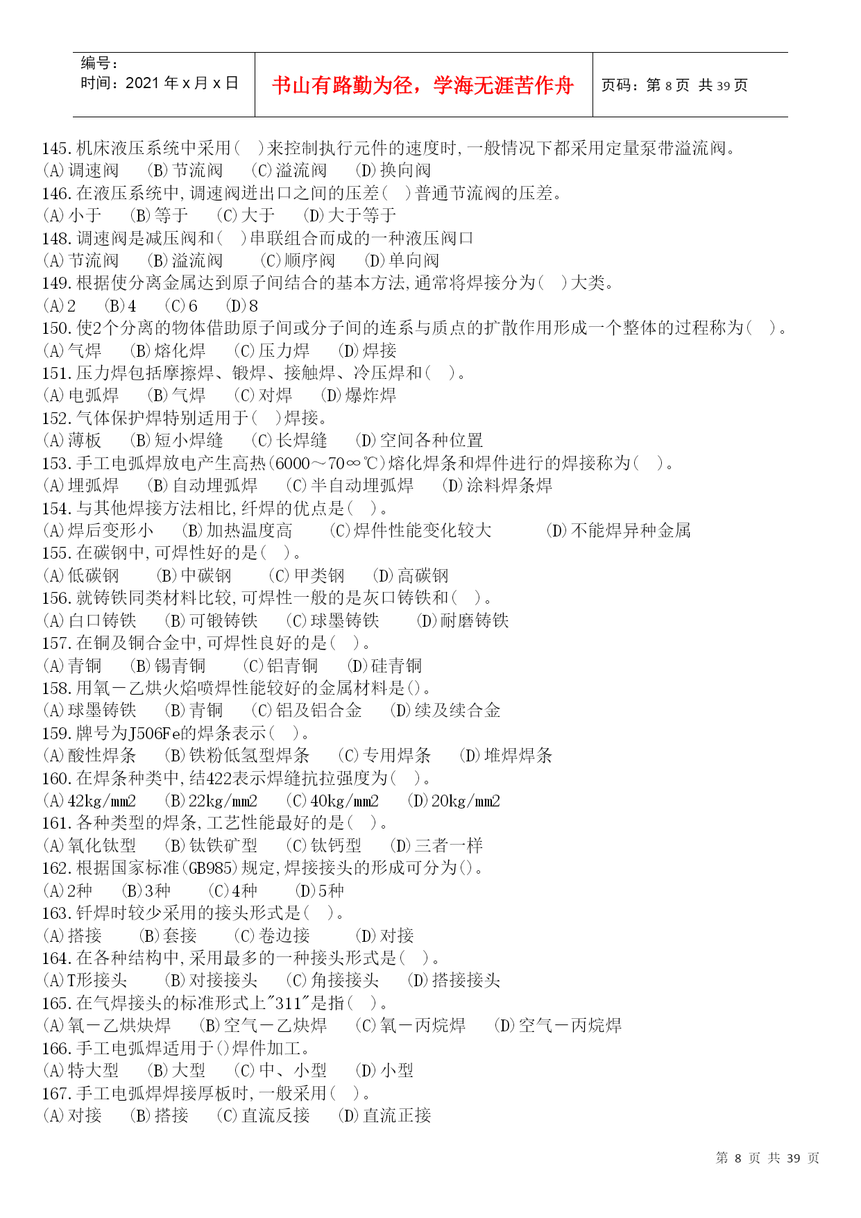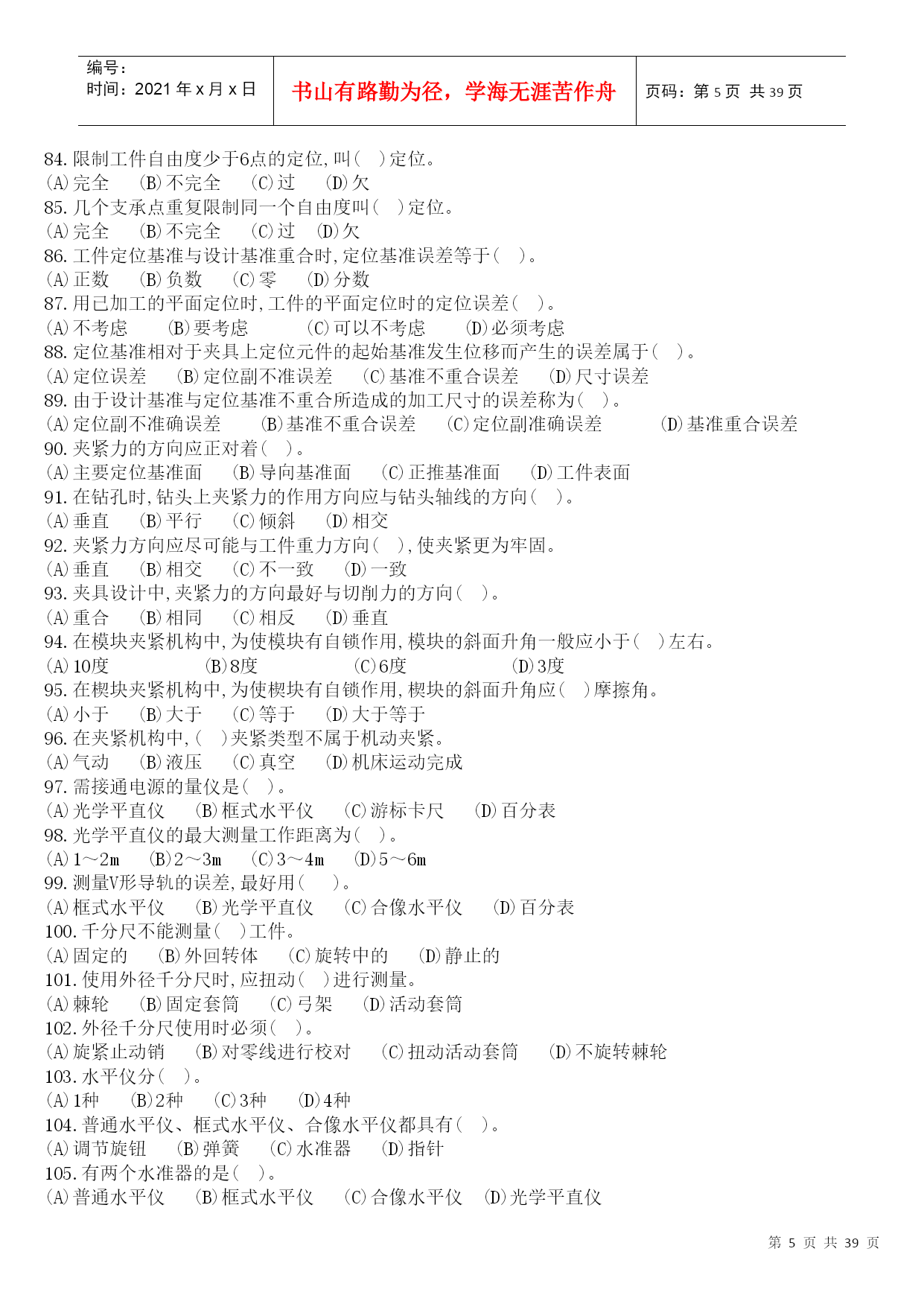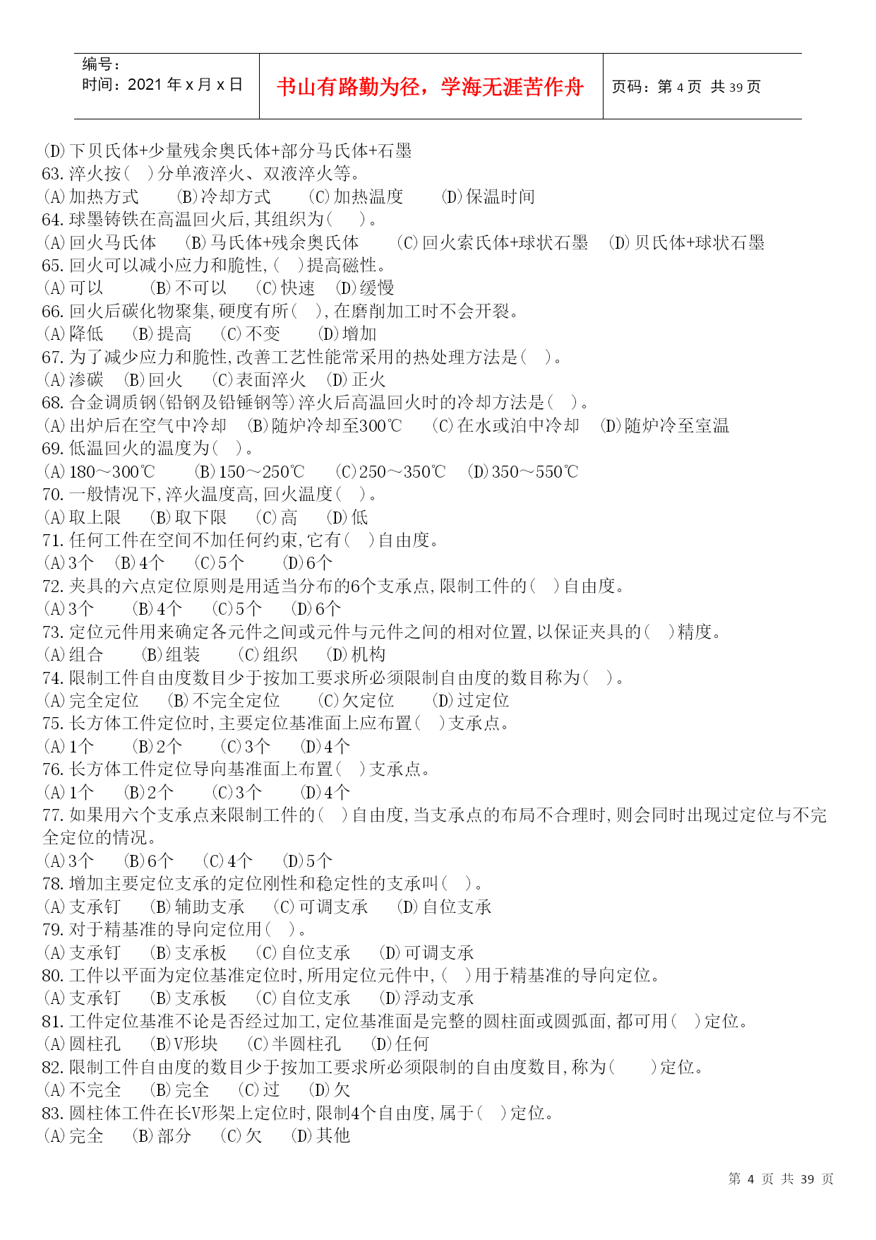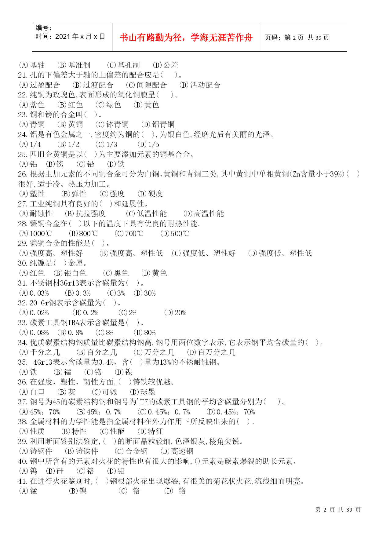 编号:时间:2021年x月x日书山有路勤为径,学海无涯苦作舟页码:第PAGE39页共NUMPAGES39页第PAGE\*MERGEFORMAT39页共NUMPAGES\*MERGEFORMAT39页机械高级工理论知识试题一、选择题(每题4个选项,只有1个是正确的,将正确的选项填入括号内)1.在产品设计中,一般都先画出机器或部件的()。(A)装配图(B)零件图(C)三视图(D)剖视图2.装配图表达机器和部件的()、工作原理和技术要求。(A)形状结构(B)尺寸要求(C)装配关系(D)表面粗糙度3.一般情况下,应选择能清楚地表达部件主要()的方向,作为装配图中主视图的投影方向。(A)外部结构(B)内部结构(C)装配关系(D)工作原理4.用来表达对称部件的内部构造及外部形状的是()。(A)剖视(B)半剖视(C)全部剖视(D)局部剖视5.装配图中的滚动轴承被剖开后,它的一边应详细画出,而另一边可()画。(A)不用(B)略(C)粗略(D)简6.装配图中相邻2个(或3个)零件的剖面线方向相反,或者方向一致,但()不、等。(A)大小(B)长短(C)粗细(D)间距7.在装配图中,相邻零件的接触面和相配合表面只用()来表示两面相接触。(A)不画线(B)一条线(C)两条线(D)孕条线8.产品的装配分不同形式,把产品装配分为部装和总装,分配给个人或各小组来完成的装配叫()装配形式。(A)集中(B)活动(C)移动(D)分散9.装配工作的指导性文件是(),它是工人进行装配工作的依据。(A)装配的工艺规程(B)总装配图(C)部件装配图(D)装配单元系统图10.能够简明直观地反映出产品装配顺序的是()。(A)总装配图(B)所有部件装配图(C)装配单元系统图(D)装配工艺流程图11.零件图的技术要求的内容包括表面粗糙度、尺寸公差、表面形位公差、()及表面修饰等。(A)位置公差(B)工艺基准(C)设计基准(D)热处理12.当采用公差代号标注线性尺寸的公差时,公差代号应注在基本尺寸的()。(A)右边(B)左边(C)上边(D)下边13.位置公差是指关联实际要素的位置对()所允许的变动全量。(A)基准(B)平面(C)标准(D)表面14.零件图选择的基本要求是用一组视图,完整、清晰地表达出零件的(),并力求制图简便。(A)整体(B)结构形状(C)结构(D)特征15.最能反映零件形状特征的视图叫(),它是零件图中最主要的视图。(A)俯视图(B)左视图(C)主视图(D)右视图16.主视图与俯视图保持()的垂直对应关系。(A)前后(B)左右(C)上下(D)重叠17.当机件对称,且在图上恰好有一轮廓线与对称中心线重合时,采用半剖视有矛盾,此时也可采()。(A)局部剖视(B)全剖视(C)旋转剖视(D)阶梯剖18.基本尺寸相同时,相互结合的孔和轴公差之间的关系称为()。(A)配合(B)间隙配合(C)过渡配合(D)过盈配合19.在设计工作中,基本尺寸确定后,公差与配合的选择主要有3个方面内容:确定公差等级、确定基准和确定()。(A)公差带(B)配合(C)尺寸(D)代号20.采用()可以缩减所用定值刀具、量具和数量,有利于加工。(A)基轴(B)基准制(C)基孔制(D)公差21.孔的下偏差大于轴的上偏差的配合应是()。(A)过盈配合(B)过渡配合(C)间隙配合(D)活动配合22.纯铜为玫瑰色,表面形成的氧化铜膜呈()。(A)紫色(B)红色(C)绿色(D)黄色23.铜和镑的合金叫()。(A)青铜(B)黄铜(C)钵青铜(D)铝青铜24.铝是有色金属之一,密度约为铜的(),为银白色,经磨光后有美丽的光泽。(A)1/4(B)1/2(C)1/3(D)1/525.四旧企黄铜是以()为主要添加元素的铜基合金。(A)铝(B)镑(C)铅(D)铁26.根据主加元素的不同铜合金可分为白铜、黄铜和青铜三类,其中黄铜中单相黄铜(Zn含量小于39%)()很好,适于冷、热压力加工。(A)塑性(B)弹性(C)强度(D)硬度27.工业纯铜具有良好的()和延展性。(A)耐蚀性(B)抗拉强度(C)低温性能(D)高温性能28.镰铜合金在()以下的温度下具有优良的耐热性能。(A)1000℃(B)800℃(C)700℃(D)500℃29.镰铜合金的性能是()。(A)强度高、塑性好(B)强度高、塑性低(C)强度低、塑性好(D)强度低、塑性低30.纯镰是()金属。(A)红色(B)银白色(C)黑色(D)黄色31.不锈钢材3Gr13表示含碳量为()。(A)0.03%(B)0.3%(C)3%(D)30%32.20Gr钢表示含碳量为()。(A)0.02%(B)0.2%(C)2%(