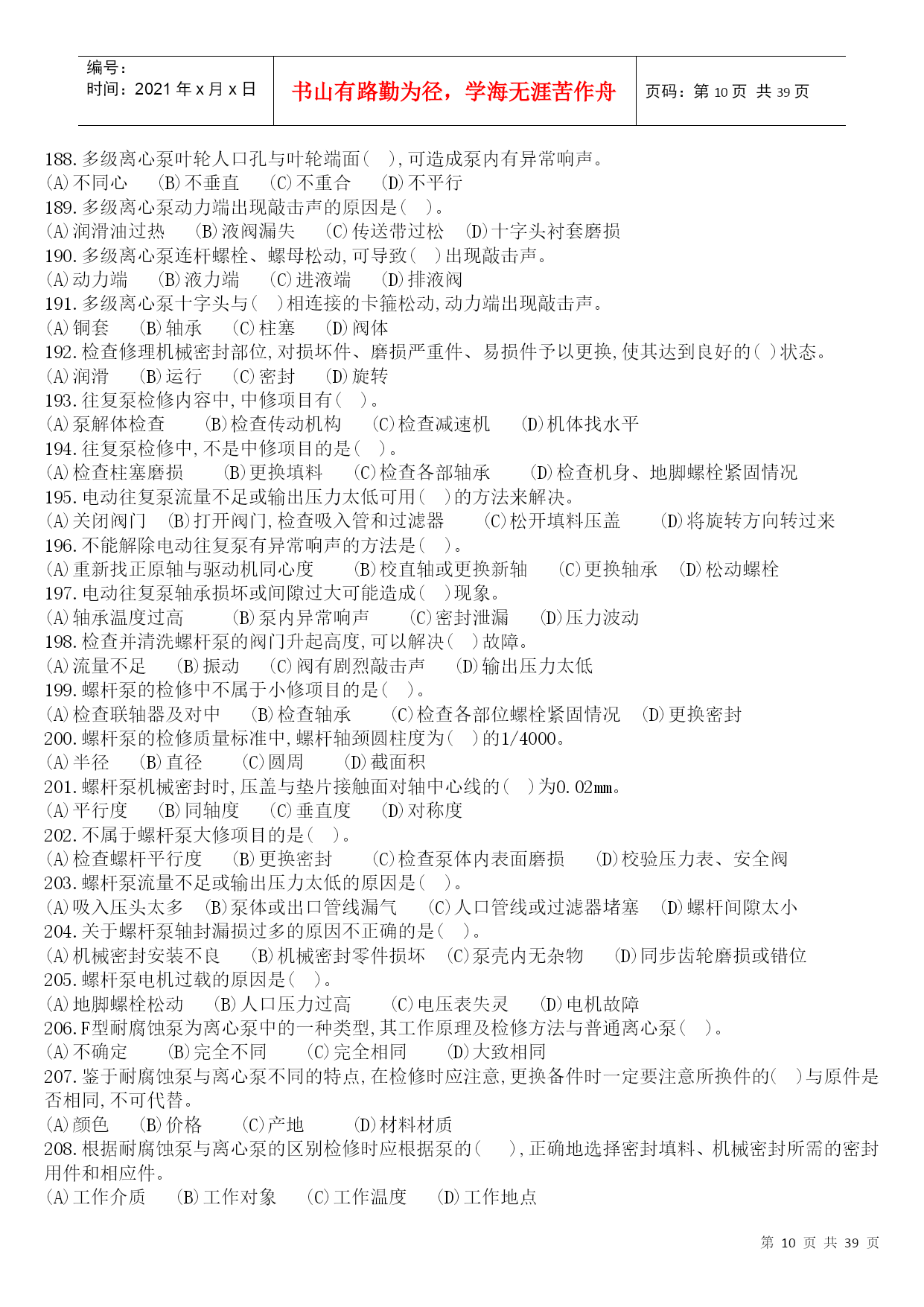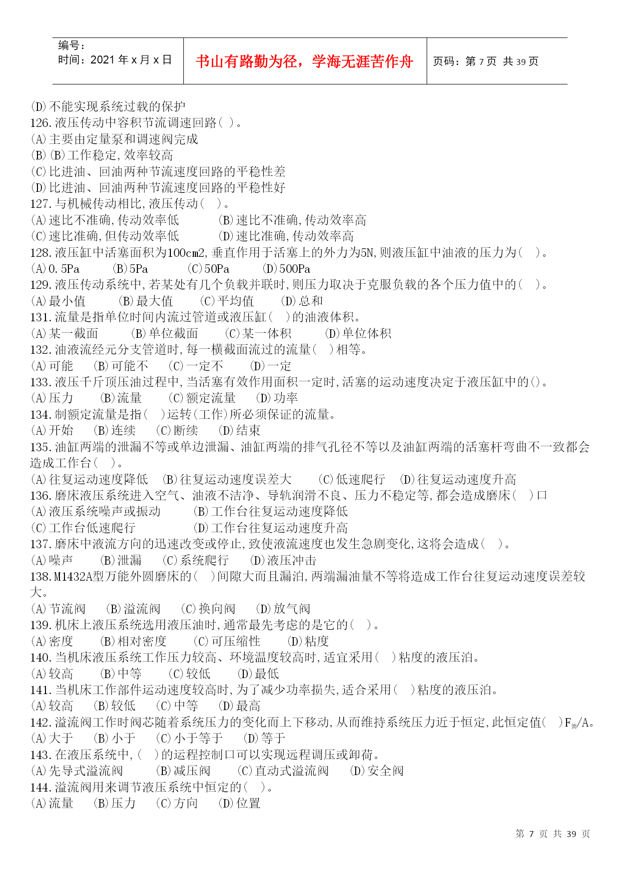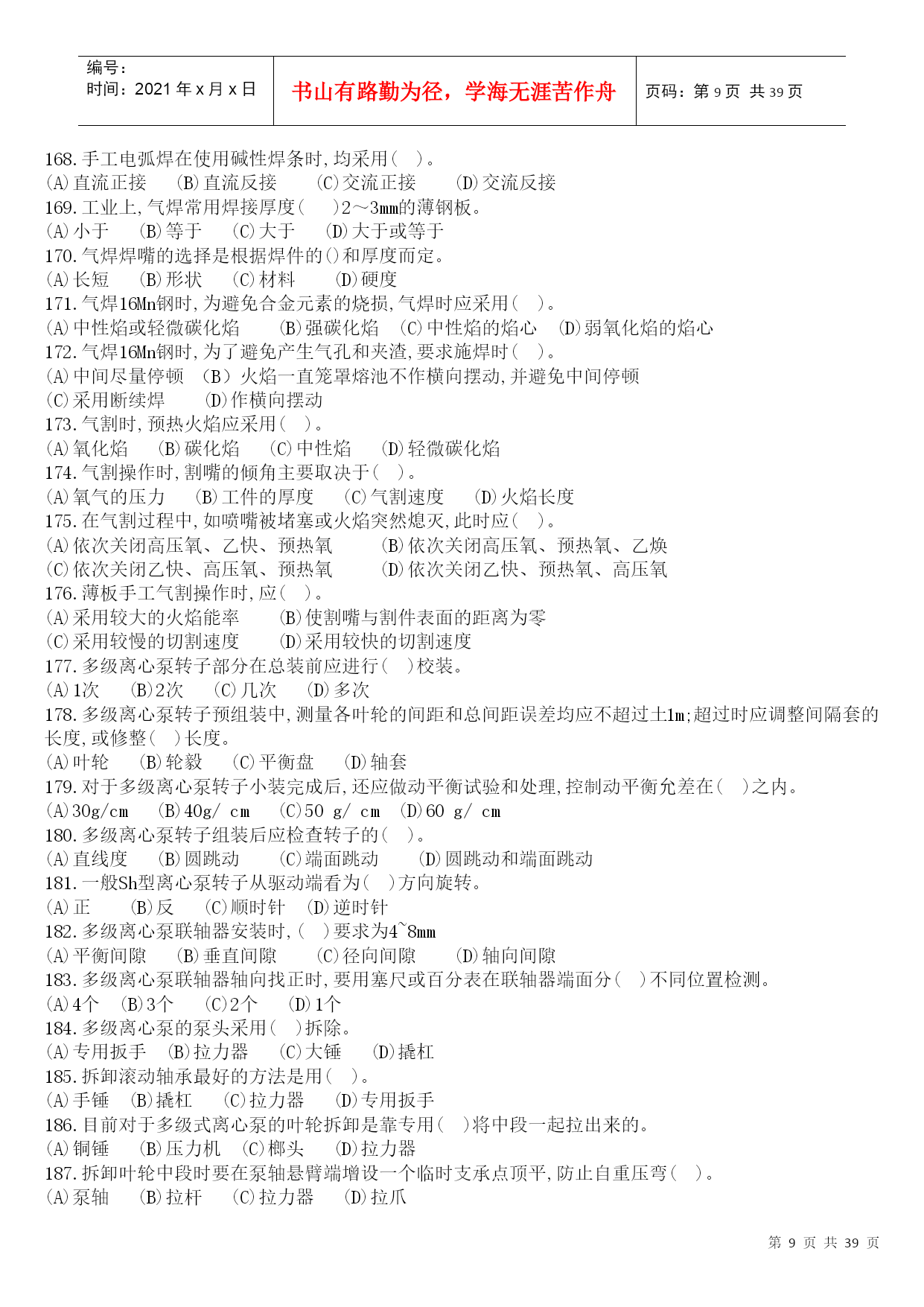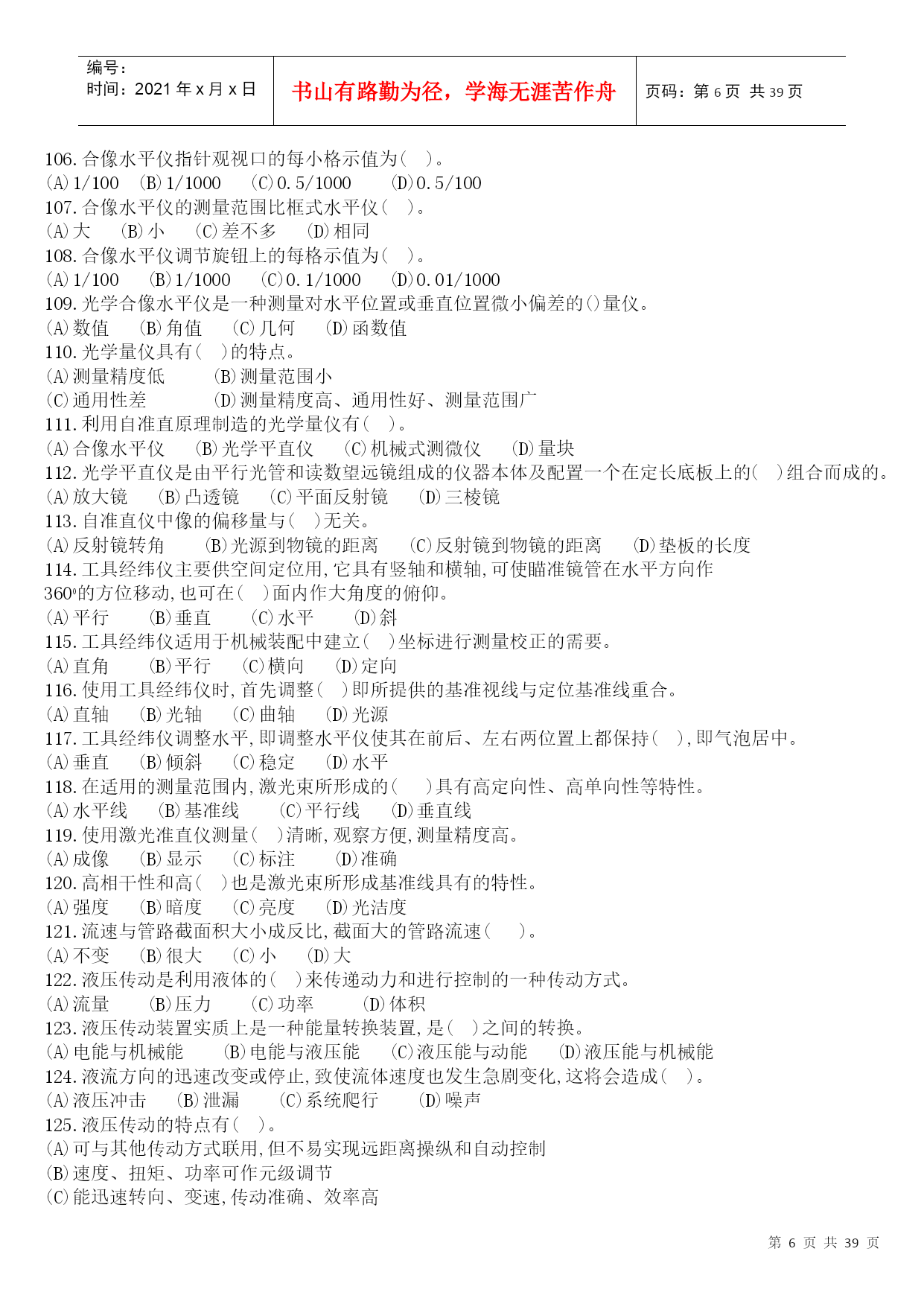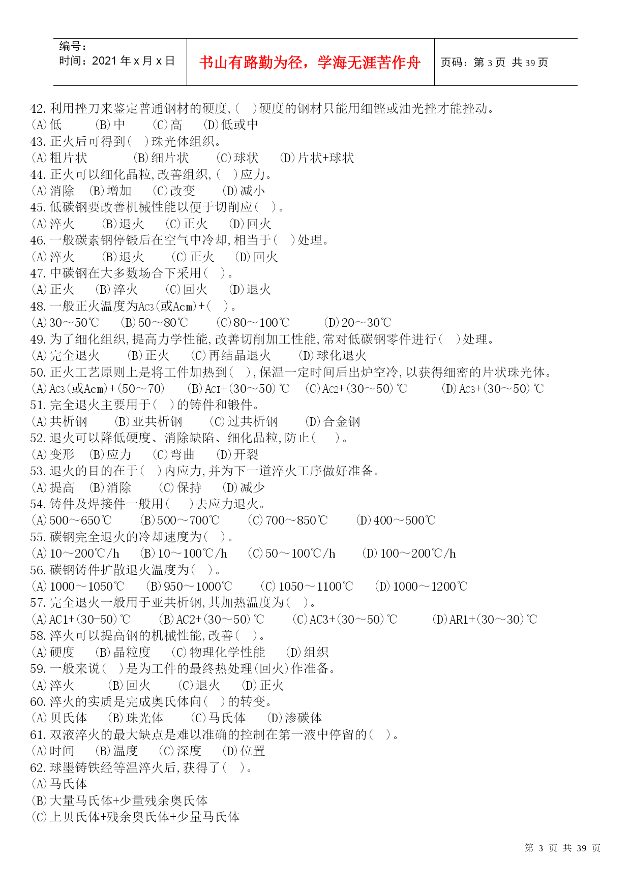 编号:时间:2021年x月x日书山有路勤为径,学海无涯苦作舟页码:第PAGE39页共NUMPAGES39页第PAGE\*MERGEFORMAT39页共NUMPAGES\*MERGEFORMAT39页机械高级工理论知识试题一、选择题(每题4个选项,只有1个是正确的,将正确的选项填入括号内)1.在产品设计中,一般都先画出机器或部件的()。(A)装配图(B)零件图(C)三视图(D)剖视图2.装配图表达机器和部件的()、工作原理和技术要求。(A)形状结构(B)尺寸要求(C)装配关系(D)表面粗糙度3.一般情况下,应选择能清楚地表达部件主要()的方向,作为装配图中主视图的投影方向。(A)外部结构(B)内部结构(C)装配关系(D)工作原理4.用来表达对称部件的内部构造及外部形状的是()。(A)剖视(B)半剖视(C)全部剖视(D)局部剖视5.装配图中的滚动轴承被剖开后,它的一边应详细画出,而另一边可()画。(A)不用(B)略(C)粗略(D)简6.装配图中相邻2个(或3个)零件的剖面线方向相反,或者方向一致,但()不、等。(A)大小(B)长短(C)粗细(D)间距7.在装配图中,相邻零件的接触面和相配合表面只用()来表示两面相接触。(A)不画线(B)一条线(C)两条线(D)孕条线8.产品的装配分不同形式,把产品装配分为部装和总装,分配给个人或各小组来完成的装配叫()装配形式。(A)集中(B)活动(C)移动(D)分散9.装配工作的指导性文件是(),它是工人进行装配工作的依据。(A)装配的工艺规程(B)总装配图(C)部件装配图(D)装配单元系统图10.能够简明直观地反映出产品装配顺序的是()。(A)总装配图(B)所有部件装配图(C)装配单元系统图(D)装配工艺流程图11.零件图的技术要求的内容包括表面粗糙度、尺寸公差、表面形位公差、()及表面修饰等。(A)位置公差(B)工艺基准(C)设计基准(D)热处理12.当采用公差代号标注线性尺寸的公差时,公差代号应注在基本尺寸的()。(A)右边(B)左边(C)上边(D)下边13.位置公差是指关联实际要素的位置对()所允许的变动全量。(A)基准(B)平面(C)标准(D)表面14.零件图选择的基本要求是用一组视图,完整、清晰地表达出零件的(),并力求制图简便。(A)整体(B)结构形状(C)结构(D)特征15.最能反映零件形状特征的视图叫(),它是零件图中最主要的视图。(A)俯视图(B)左视图(C)主视图(D)右视图16.主视图与俯视图保持()的垂直对应关系。(A)前后(B)左右(C)上下(D)重叠17.当机件对称,且在图上恰好有一轮廓线与对称中心线重合时,采用半剖视有矛盾,此时也可采()。(A)局部剖视(B)全剖视(C)旋转剖视(D)阶梯剖18.基本尺寸相同时,相互结合的孔和轴公差之间的关系称为()。(A)配合(B)间隙配合(C)过渡配合(D)过盈配合19.在设计工作中,基本尺寸确定后,公差与配合的选择主要有3个方面内容:确定公差等级、确定基准和确定()。(A)公差带(B)配合(C)尺寸(D)代号20.采用()可以缩减所用定值刀具、量具和数量,有利于加工。(A)基轴(B)基准制(C)基孔制(D)公差21.孔的下偏差大于轴的上偏差的配合应是()。(A)过盈配合(B)过渡配合(C)间隙配合(D)活动配合22.纯铜为玫瑰色,表面形成的氧化铜膜呈()。(A)紫色(B)红色(C)绿色(D)黄色23.铜和镑的合金叫()。(A)青铜(B)黄铜(C)钵青铜(D)铝青铜24.铝是有色金属之一,密度约为铜的(),为银白色,经磨光后有美丽的光泽。(A)1/4(B)1/2(C)1/3(D)1/525.四旧企黄铜是以()为主要添加元素的铜基合金。(A)铝(B)镑(C)铅(D)铁26.根据主加元素的不同铜合金可分为白铜、黄铜和青铜三类,其中黄铜中单相黄铜(Zn含量小于39%)()很好,适于冷、热压力加工。(A)塑性(B)弹性(C)强度(D)硬度27.工业纯铜具有良好的()和延展性。(A)耐蚀性(B)抗拉强度(C)低温性能(D)高温性能28.镰铜合金在()以下的温度下具有优良的耐热性能。(A)1000℃(B)800℃(C)700℃(D)500℃29.镰铜合金的性能是()。(A)强度高、塑性好(B)强度高、塑性低(C)强度低、塑性好(D)强度低、塑性低30.纯镰是()金属。(A)红色(B)银白色(C)黑色(D)黄色31.不锈钢材3Gr13表示含碳量为()。(A)0.03%(B)0.3%(C)3%(D)30%32.20Gr钢表示含碳量为()。(A)0.02%(B)0.2%(C)2%(