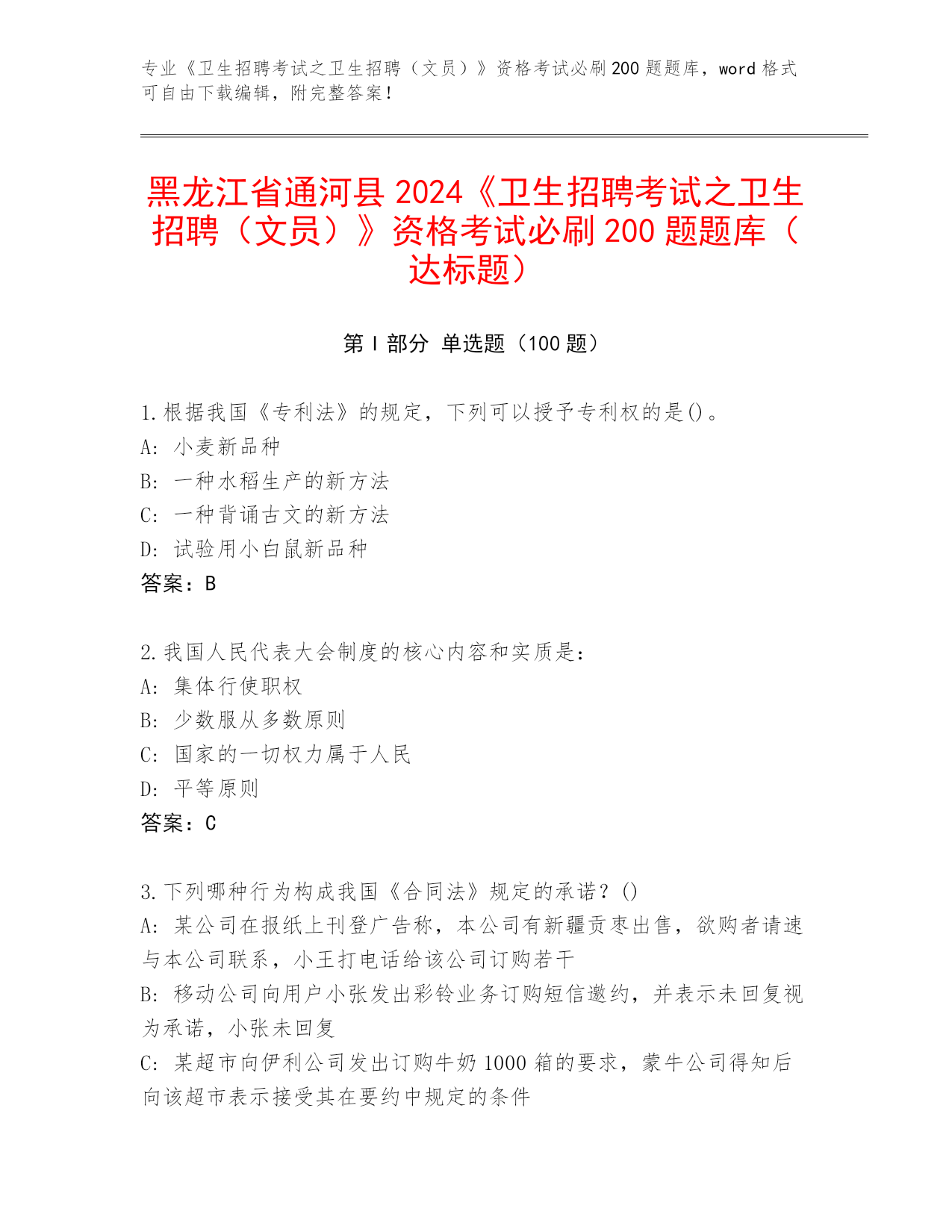 黑龙江省通河县2024《卫生招聘考试之卫生招聘(文员)》资格考试必刷200题题库(达标题)