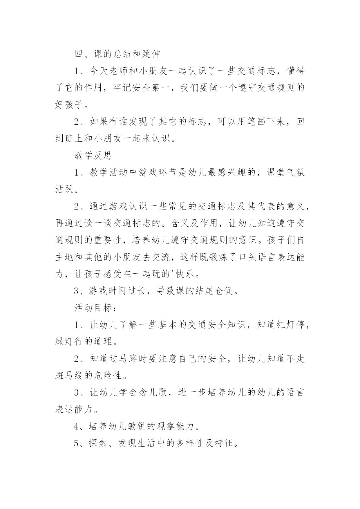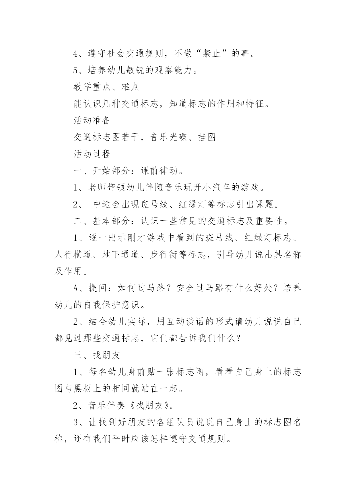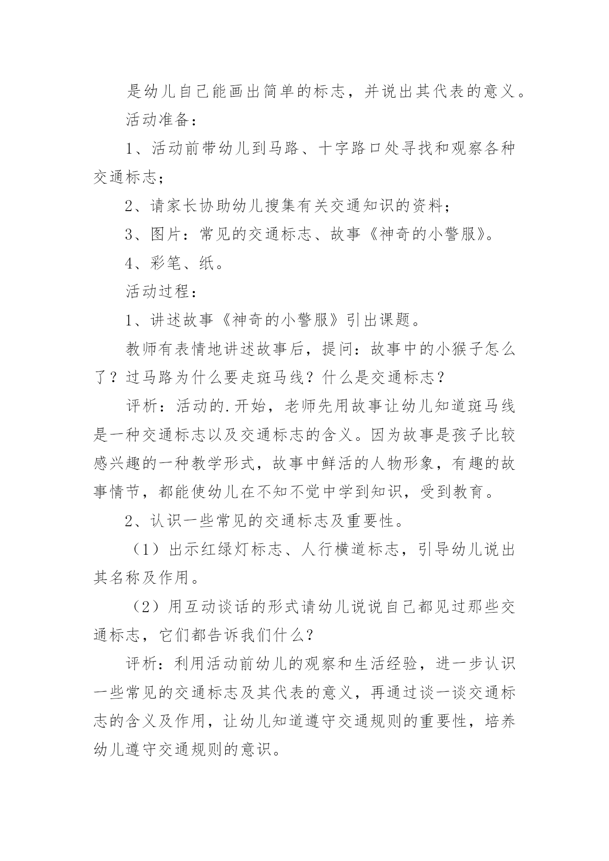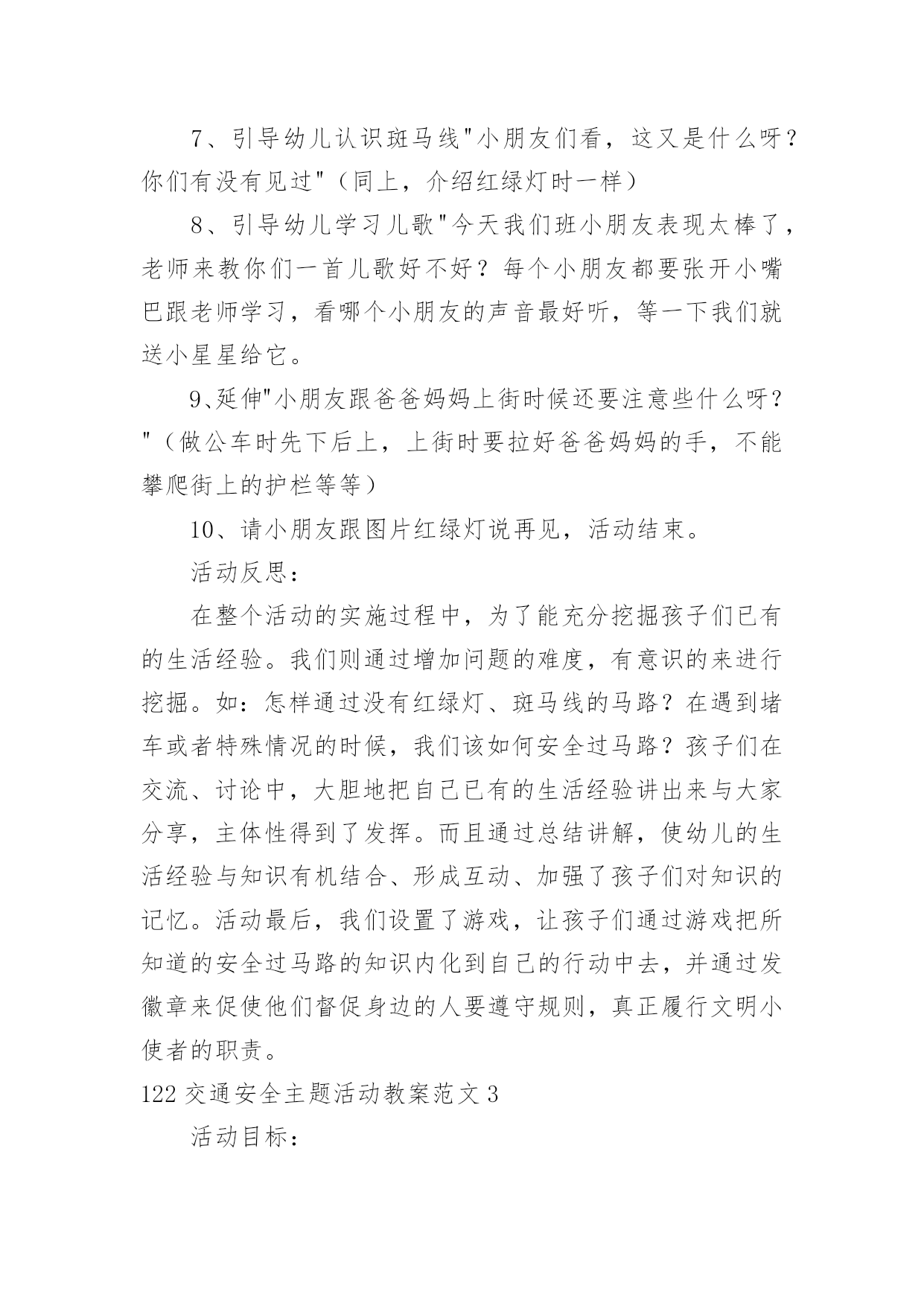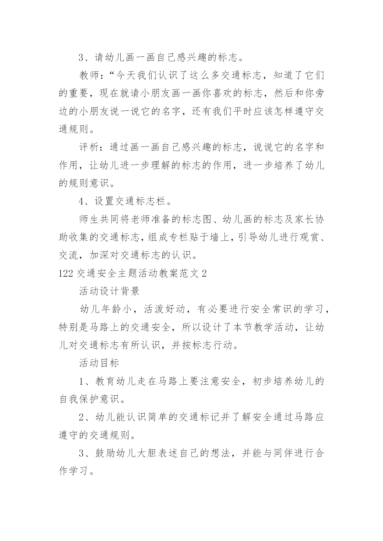 122交通安全主题活动教案122交通安全主题活动教案范文作为一位优秀的人民教师,就不得不需要编写教案,教案有利于教学水平的提高,有助于教研活动的开展。那么优秀的教案是什么样的呢?下面是小编收集整理的122交通安全主题活动教案范文,欢迎阅读,希望大家能够喜欢。122交通安全主题活动教案范文1活动目标:1、让幼儿通过活动感受到交通标志作用大,初步培养幼儿遵守交通规则的意识。2、鼓励幼儿大胆表述自己的想法,并能与同伴进行合作学习。3、让幼儿认识常见的交通标志,知道它们所代表的意义并能画出一些简单的标志。4、培养幼儿敏锐的观察能力。5、加强幼儿的安全意识。活动重点难点:活动重点:重点是让幼儿感受交通标志作用大。活动难点:是幼儿自己能画出简单的标志,并说出其代表的意义。活动准备:1、活动前带幼儿到马路、十字路口处寻找和观察各种交通标志;2、请家长协助幼儿搜集有关交通知识的资料;3、图片:常见的交通标志、故事《神奇的小警服》。4、彩笔、纸。活动过程:1、讲述故事《神奇的小警服》引出课题。教师有表情地讲述故事后,提问:故事中的小猴子怎么了?过马路为什么要走斑马线?什么是交通标志?评析:活动的.开始,老师先用故事让幼儿知道斑马线是一种交通标志以及交通标志的含义。因为故事是孩子比较感兴趣的一种教学形式,故事中鲜活的人物形象,有趣的故事情节,都能使幼儿在不知不觉中学到知识,受到教育。2、认识一些常见的交通标志及重要性。(1)出示红绿灯标志、人行横道标志,引导幼儿说出其名称及作用。(2)用互动谈话的形式请幼儿说说自己都见过那些交通标志,它们都告诉我们什么?评析:利用活动前幼儿的观察和生活经验,进一步认识一些常见的交通标志及其代表的意义,再通过谈一谈交通标志的含义及作用,让幼儿知道遵守交通规则的重要性,培养幼儿遵守交通规则的意识。3、请幼儿画一画自己感兴趣的标志。教师:“今天我们认识了这么多交通标志,知道了它们的重要,现在就请小朋友画一画你喜欢的标志,然后和你旁边的小朋友说一说它的名字,还有我们平时应该怎样遵守交通规则。评析:通过画一画自己感兴趣的标志,说说它的名字和作用,让幼儿进一步理解的标志的作用,进一步培养了幼儿的规则意识。4、设置交通标志栏。师生共同将老师准备的标志图、幼儿画的标志及家长协助收集的交通标志,组成专栏贴于墙上,引导幼儿进行观赏、交流,加深对交通标志的认识。122交通安全主题活动教案范文2活动设计背景幼儿年龄小,活泼好动,有必要进行安全常识的学习,特别是马路上的交通安全,所以设计了本节教学活动,让幼儿对交通标志有所认识,并按标志行动。活动目标1、教育幼儿走在马路上要注意安全,初步培养幼儿的自我保护意识。2、幼儿能认识简单的交通标记并了解安全通过马路应遵守的交通规则。3、鼓励幼儿大胆表述自己的想法,并能与同伴进行合作学习。4、遵守社会交通规则,不做“禁止”的事。5、培养幼儿敏锐的观察能力。教学重点、难点能认识几种交通标志,知道标志的作用和特征。活动准备交通标志图若干,音乐光碟、挂图活动过程一、开始部分:课前律动。1、老师带领幼儿伴随音乐玩开小汽车的游戏。2、中途会出现斑马线、红绿灯等标志引出课题。二、基本部分:认识一些常见的交通标志及重要性。1、逐一出示刚才游戏中看到的斑马线、红绿灯标志、人行横道、地下通道、步行街等标志,引导幼儿说出其名称及作用。A、提问:如何过马路?安全过马路有什么好处?培养幼儿的自我保护意识。2、结合幼儿实际,用互动谈话的形式请幼儿说说自己都见过那些交通标志,它们都告诉我们什么?三、找朋友1、每名幼儿身前贴一张标志图,看看自己身上的标志图与黑板上的相同就站在一起。2、音乐伴奏《找朋友》。3、让找到好朋友的各组队员说说自己身上的标志图名称,还有我们平时应该怎样遵守交通规则。四、课的总结和延伸1、今天老师和小朋友一起认识了一些交通标志,懂得了它的作用,牢记安全第一,我们要做一个遵守交通规则的好孩子。2、如果有谁发现了其它的标志,可以用笔画下来,回到班上和小朋友一起来认识。教学反思1、教学活动中游戏环节是幼儿最感兴趣的,课堂气氛活跃。2、通过游戏认识一些常见的交通标志及其代表的意义,再通过谈一谈交通标志的。含义及作用,让幼儿知道遵守交通规则的重要性,培养幼儿遵守交通规则的意识。孩子们自主地和其他的小朋友去交流,这样既锻炼了口头语言表达能力,让孩子感受在一起玩的'快乐。3、游戏时间过长,导致课的结尾仓促。活动目标:1、让幼儿了解一些基本的交通安全知识,知道红灯停,绿灯行的道理。2、知道过马路时要注意自己的安全,让幼儿知道不走斑马线的危险性。3、让幼儿学会念儿歌,进一步培养幼儿的幼儿的语言表达能力。4、培养幼儿敏锐的观察能力。5、探索、发现生活中的多样性及特征。活动准备:1、图片红绿灯、斑马线2、儿歌《交通灯》活动过