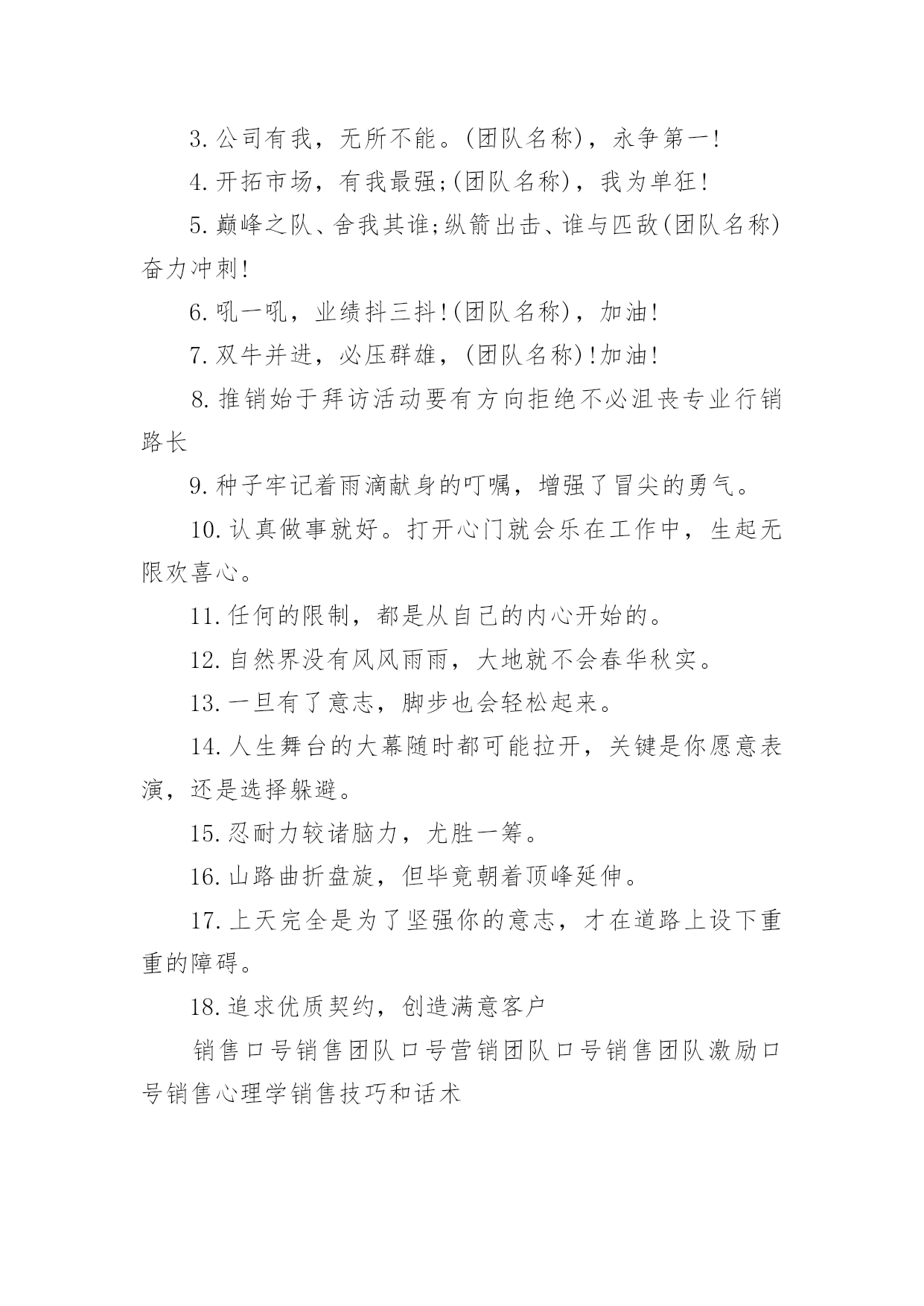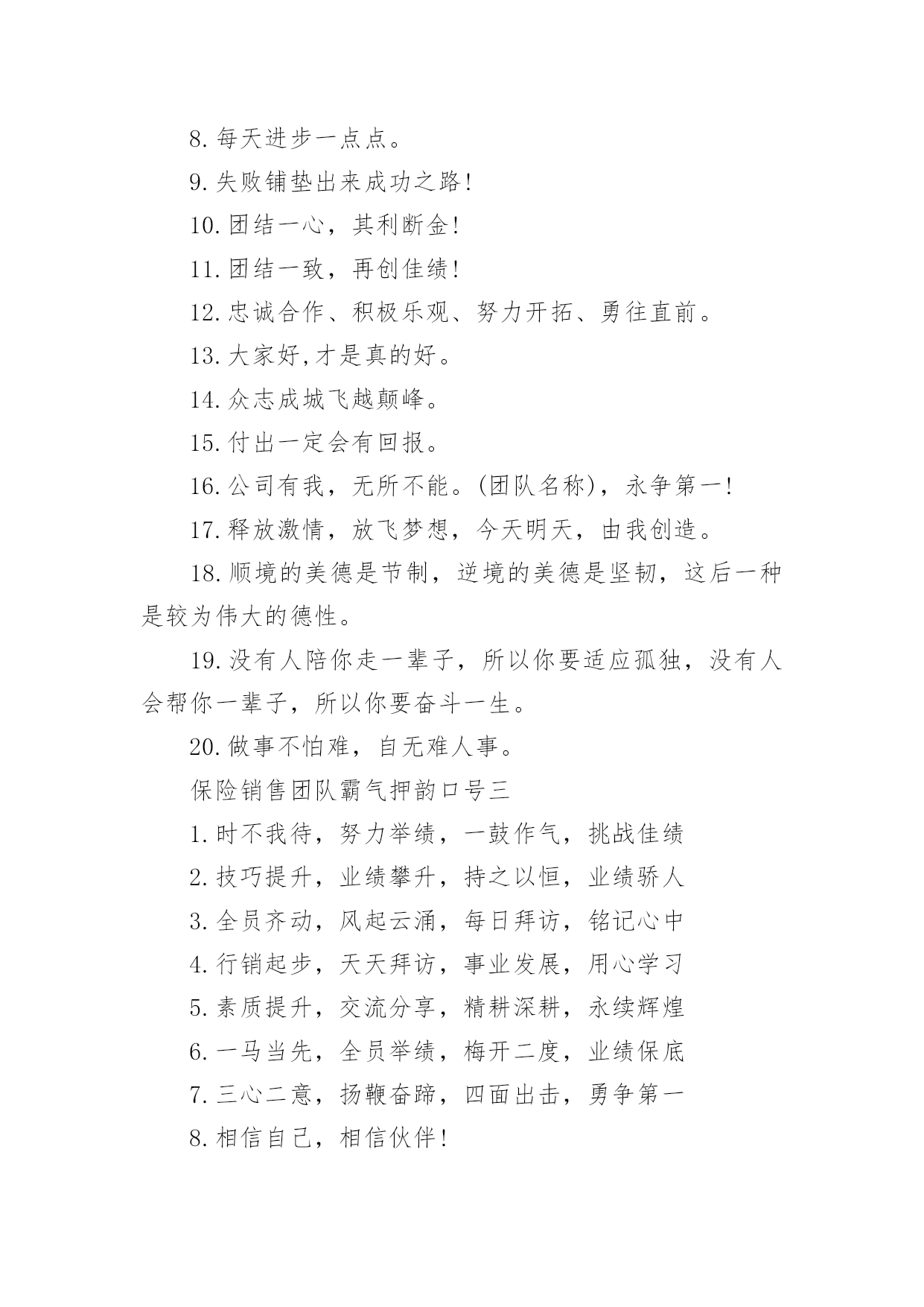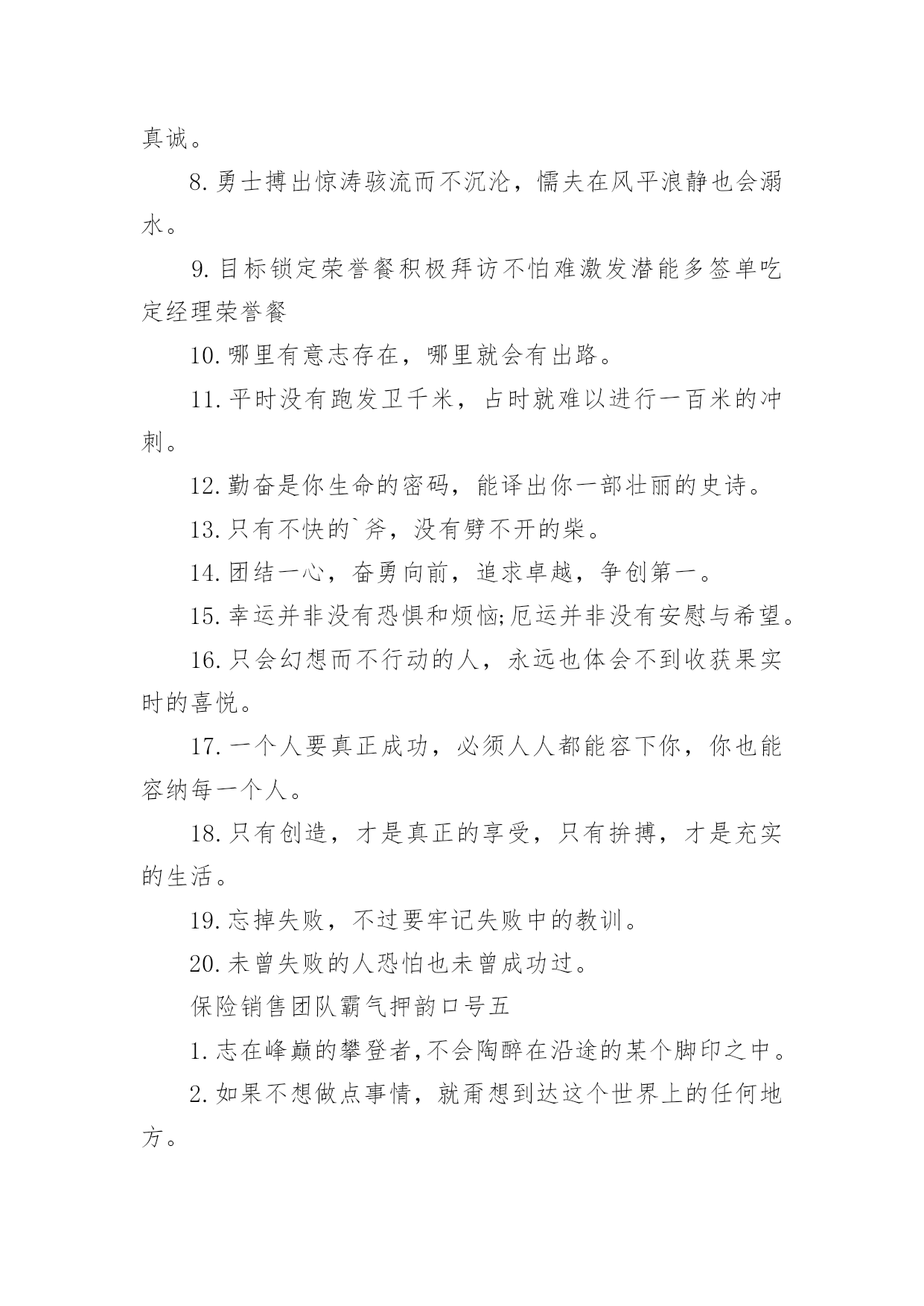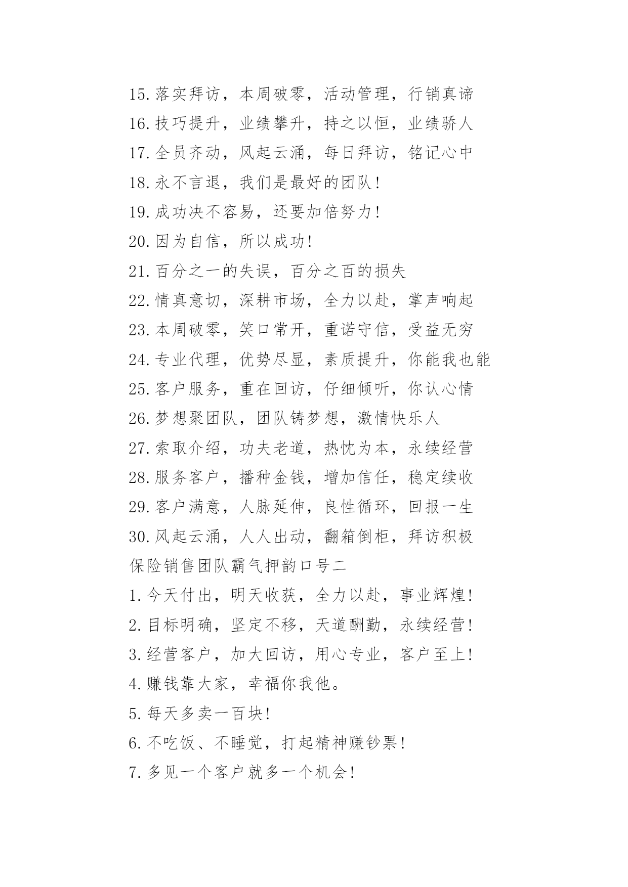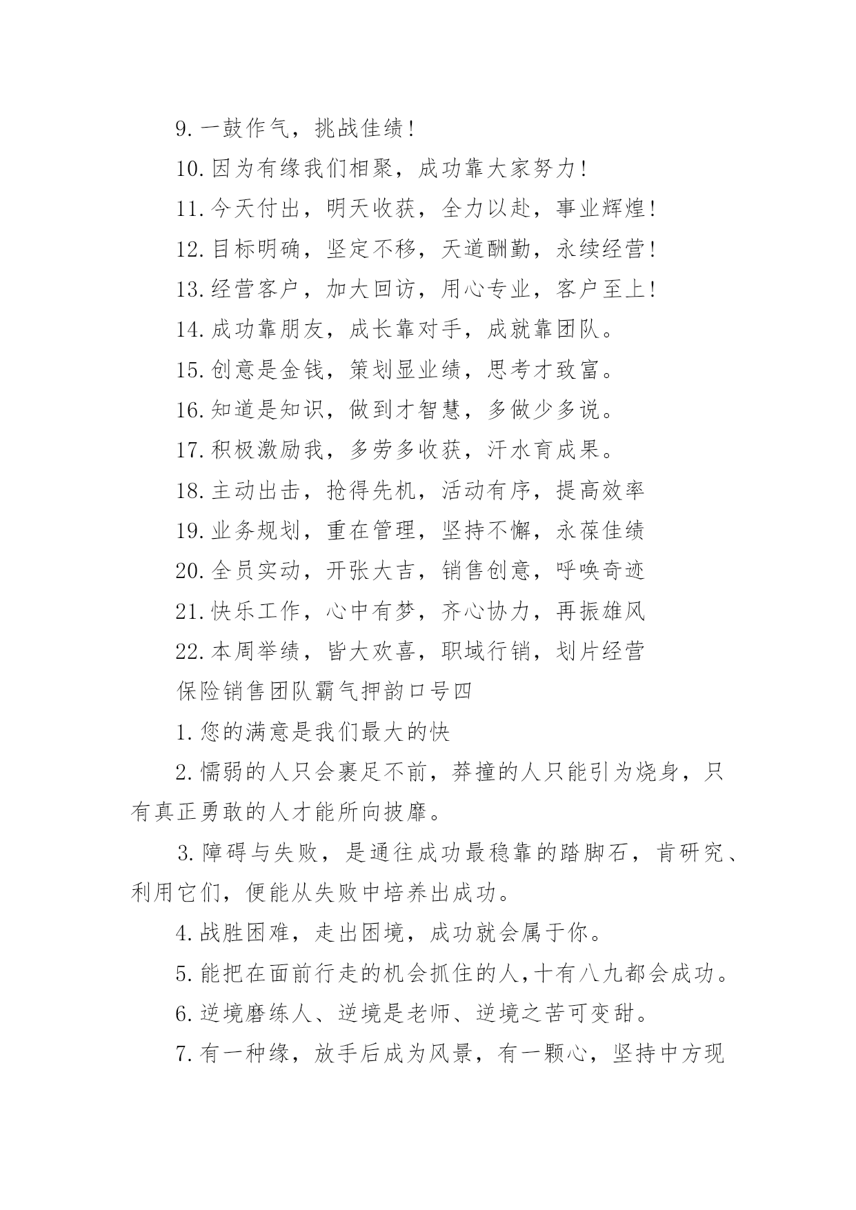 保险销售团队霸气押韵口号保险销售团队霸气押韵口号在销售行业一般所有的销售团队都会有一个销售口号,就是为了鼓舞士气,同时给心里增加自信。房地产销售日益增加,那么下面是口号网小编整理的:保险销售团队霸气押韵口号相关内容,希望对你能够有所帮助。更多内容请继续关注口号网保险销售团队霸气押韵口号一1.目标明确,坚定不移,天道酬勤,永续经营2.经营客户,加大回访,用心专业,客户至上3.今天付出,明天收获,全力以赴,事业辉煌4.品质观念须放眼于大局,着手于微小5.品质最重要,每个环节要做到6.要想企业不衰老,建立体系须趁早7.等待是失败的源头,行动是成功的开始8.失败与挫折只是暂时的,成功已不会太遥远!9.道路是曲折的,“钱”途无限光明!10.回馈客户,从我做起,心中有情,客户有心11.观念身先,技巧神显,持之以恒,芝麻开门12.攻守并重,全员实动,活动目标,服务导向13.精领天下,英才神话14.时不我待,努力举绩,一鼓作气,挑战佳绩15.落实拜访,本周破零,活动管理,行销真谛16.技巧提升,业绩攀升,持之以恒,业绩骄人17.全员齐动,风起云涌,每日拜访,铭记心中18.永不言退,我们是最好的团队!19.成功决不容易,还要加倍努力!20.因为自信,所以成功!21.百分之一的失误,百分之百的损失22.情真意切,深耕市场,全力以赴,掌声响起23.本周破零,笑口常开,重诺守信,受益无穷24.专业代理,优势尽显,素质提升,你能我也能25.客户服务,重在回访,仔细倾听,你认心情26.梦想聚团队,团队铸梦想,激情快乐人27.索取介绍,功夫老道,热忱为本,永续经营28.服务客户,播种金钱,增加信任,稳定续收29.客户满意,人脉延伸,良性循环,回报一生30.风起云涌,人人出动,翻箱倒柜,拜访积极保险销售团队霸气押韵口号二1.今天付出,明天收获,全力以赴,事业辉煌!2.目标明确,坚定不移,天道酬勤,永续经营!3.经营客户,加大回访,用心专业,客户至上!4.赚钱靠大家,幸福你我他。5.每天多卖一百块!6.不吃饭、不睡觉,打起精神赚钞票!7.多见一个客户就多一个机会!8.每天进步一点点。9.失败铺垫出来成功之路!10.团结一心,其利断金!11.团结一致,再创佳绩!12.忠诚合作、积极乐观、努力开拓、勇往直前。13.大家好,才是真的好。14.众志成城飞越颠峰。15.付出一定会有回报。16.公司有我,无所不能。(团队名称),永争第一!17.释放激情,放飞梦想,今天明天,由我创造。18.顺境的美德是节制,逆境的美德是坚韧,这后一种是较为伟大的德性。19.没有人陪你走一辈子,所以你要适应孤独,没有人会帮你一辈子,所以你要奋斗一生。20.做事不怕难,自无难人事。保险销售团队霸气押韵口号三1.时不我待,努力举绩,一鼓作气,挑战佳绩2.技巧提升,业绩攀升,持之以恒,业绩骄人3.全员齐动,风起云涌,每日拜访,铭记心中4.行销起步,天天拜访,事业发展,用心学习5.素质提升,交流分享,精耕深耕,永续辉煌6.一马当先,全员举绩,梅开二度,业绩保底7.三心二意,扬鞭奋蹄,四面出击,勇争第一8.相信自己,相信伙伴!9.一鼓作气,挑战佳绩!10.因为有缘我们相聚,成功靠大家努力!11.今天付出,明天收获,全力以赴,事业辉煌!12.目标明确,坚定不移,天道酬勤,永续经营!13.经营客户,加大回访,用心专业,客户至上!14.成功靠朋友,成长靠对手,成就靠团队。15.创意是金钱,策划显业绩,思考才致富。16.知道是知识,做到才智慧,多做少多说。17.积极激励我,多劳多收获,汗水育成果。18.主动出击,抢得先机,活动有序,提高效率19.业务规划,重在管理,坚持不懈,永葆佳绩20.全员实动,开张大吉,销售创意,呼唤奇迹21.快乐工作,心中有梦,齐心协力,再振雄风22.本周举绩,皆大欢喜,职域行销,划片经营保险销售团队霸气押韵口号四1.您的满意是我们最大的快2.懦弱的人只会裹足不前,莽撞的人只能引为烧身,只有真正勇敢的人才能所向披靡。3.障碍与失败,是通往成功最稳靠的踏脚石,肯研究、利用它们,便能从失败中培养出成功。4.战胜困难,走出困境,成功就会属于你。5.能把在面前行走的机会抓住的人,十有八九都会成功。6.逆境磨练人、逆境是老师、逆境之苦可变甜。7.有一种缘,放手后成为风景,有一颗心,坚持中方现真诚。8.勇士搏出惊涛骇流而不沉沦,懦夫在风平浪静也会溺水。9.目标锁定荣誉餐积极拜访不怕难激发潜能多签单吃定经理荣誉餐10.哪里有意志存在,哪里就会有出路。11.平时没有跑发卫千米,占时就难以进行一百米的冲刺。12.勤奋是你生命的密码,能译出你一部壮丽的史诗。13.只有不快的`斧,没有劈不开的柴。14.团结一心,奋勇向前,追求卓越,争创第一。15.幸运并非没有恐惧和烦恼;厄运并非没有安慰与希望。16.只