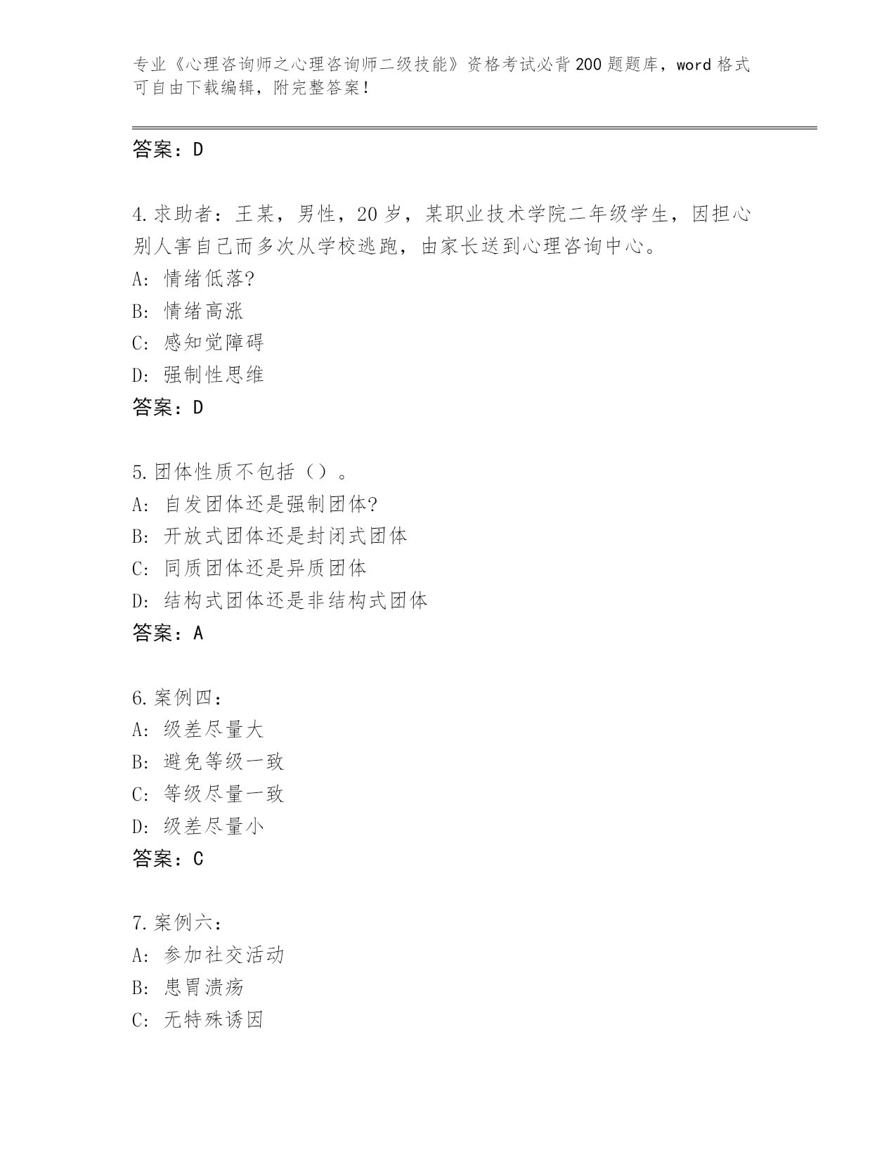 内部使用湖北省《心理咨询师之心理咨询师二级技能》资格考试必背200题真题题库含答案【巩固】