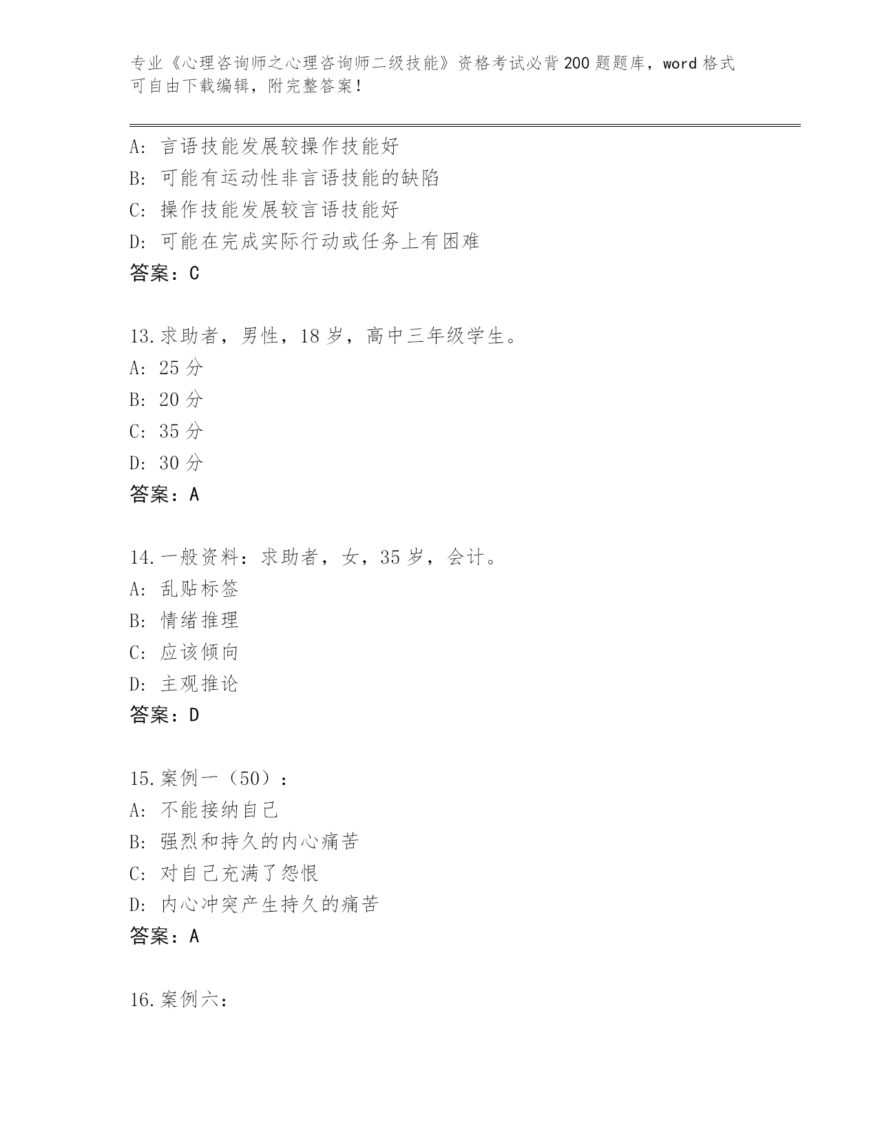 山西省整理《心理咨询师之心理咨询师二级技能》资格考试必背200题【含答案】