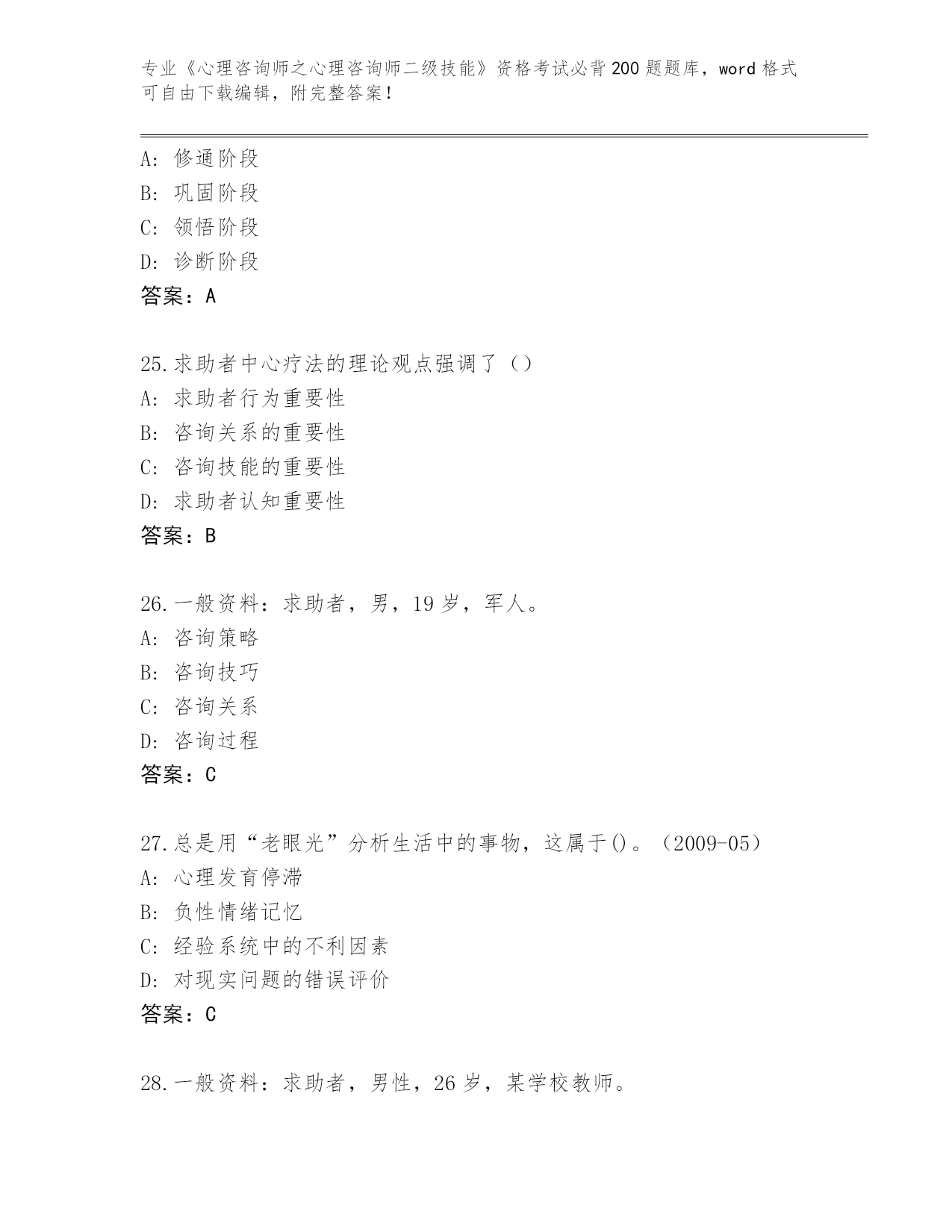 内部使用湖北省《心理咨询师之心理咨询师二级技能》资格考试必背200题通关秘籍题库【模拟题】