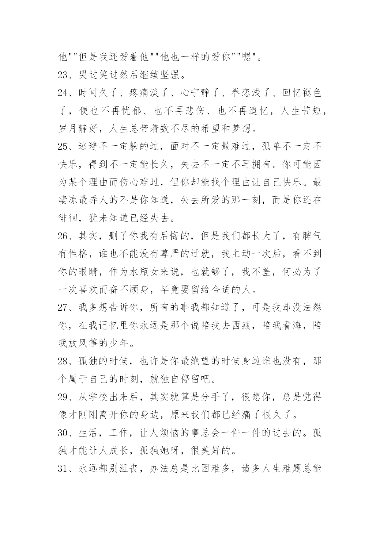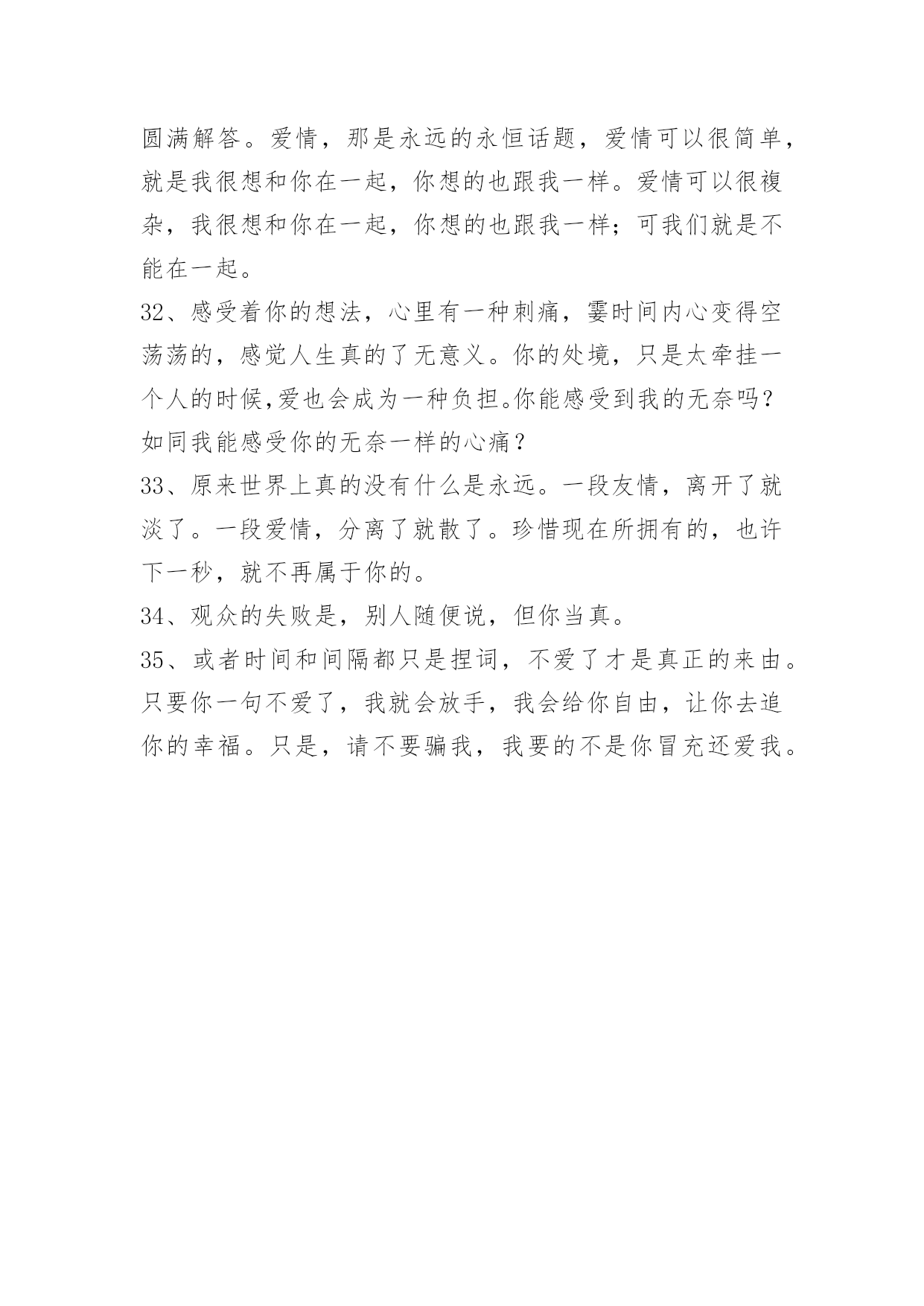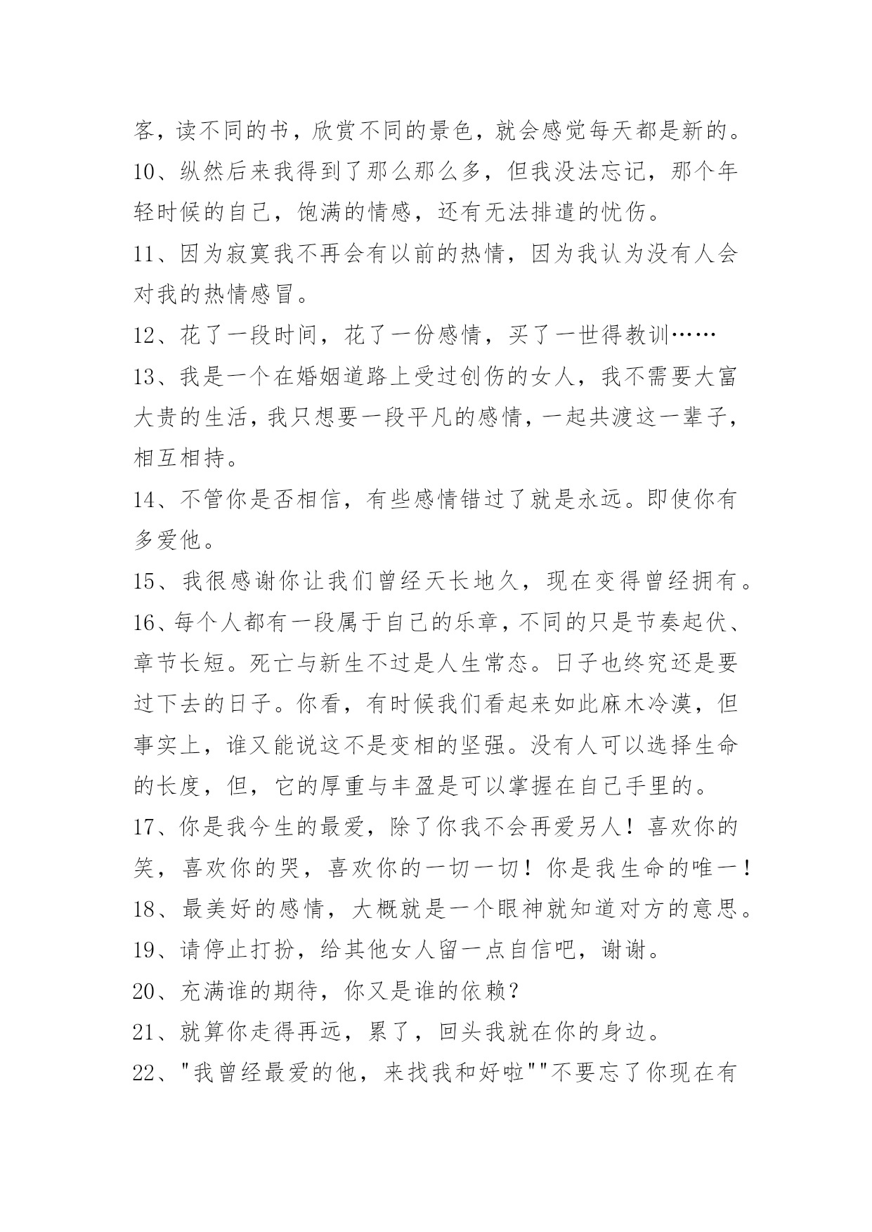 感人的情感语录35条【实用】2023年感人的情感语录35条幸福是一种豁达的生活态度,更是一种内心超脱的生活智慧,相逢何必鼻孔酸,心中有痛少几句,多少心头宽恕事,当做梦中不曾是,这一趟人生几十年,相逢了多少善缘,敷衍了多少难堪,做自己人生的仁波切,禅心一片似云闲。以下是小编收集整理的感人的情感语录35条,欢迎大家阅读。1、就算你把我的一切带走,起码我还剩下我的回忆。2、这一秒开始相信,幸福就会慢慢接近。3、与其埋怨世界,不如改变自己。管好自己的心,做好自己的事,比什么都强。人生无完美,曲折亦风景。别把失去看得过重,放弃是另一种拥有;不要经常艳羡他人,人做到了,心悟到了,相信属于你的风景就在下一个拐弯处。4、随时随地抱抱自己喜欢的人是一种幸福。5、很多人说要爱我一辈子,可半辈子还没到,他们就失信了。6、臣妾遇见了所有的不平凡,却自始至终,没遇过那么平凡的君。7、原来我是那么地不愿和你有任何的矛盾,我只是静心静意而已。8、一场流光,倾情演绎生命的轮回。那段最美丽的遇见如春天的柳絮,飞舞在浪漫的空气里,就像跳跃着的幸福乐章。9、工作可以重复,日子不要重复。同的日子服务不同的旅客,读不同的书,欣赏不同的景色,就会感觉每天都是新的。10、纵然后来我得到了那么那么多,但我没法忘记,那个年轻时候的自己,饱满的情感,还有无法排遣的忧伤。11、因为寂寞我不再会有以前的热情,因为我认为没有人会对我的热情感冒。12、花了一段时间,花了一份感情,买了一世得教训……13、我是一个在婚姻道路上受过创伤的女人,我不需要大富大贵的生活,我只想要一段平凡的感情,一起共渡这一辈子,相互相持。14、不管你是否相信,有些感情错过了就是永远。即使你有多爱他。15、我很感谢你让我们曾经天长地久,现在变得曾经拥有。16、每个人都有一段属于自己的乐章,不同的只是节奏起伏、章节长短。死亡与新生不过是人生常态。日子也终究还是要过下去的日子。你看,有时候我们看起来如此麻木冷漠,但事实上,谁又能说这不是变相的坚强。没有人可以选择生命的长度,但,它的厚重与丰盈是可以掌握在自己手里的。17、你是我今生的最爱,除了你我不会再爱另人!喜欢你的笑,喜欢你的哭,喜欢你的一切一切!你是我生命的唯一!18、最美好的感情,大概就是一个眼神就知道对方的意思。19、请停止打扮,给其他女人留一点自信吧,谢谢。20、充满谁的期待,你又是谁的依赖?21、就算你走得再远,累了,回头我就在你的身边。22、"我曾经最爱的他,来找我和好啦""不要忘了你现在有他""但是我还爱着他""他也一样的爱你""嗯"。23、哭过笑过然后继续坚强。24、时间久了、疼痛淡了、心宁静了、眷恋浅了、回忆褪色了,便也不再忧郁、也不再悲伤、也不再追忆,人生苦短,岁月静好,人生总带着数不尽的希望和梦想。25、逃避不一定躲的过,面对不一定最难过,孤单不一定不快乐,得到不一定能长久,失去不一定不再拥有。你可能因为某个理由而伤心难过,但你却能找个理由让自己快乐。最凄凉最弄人的不是你知道,失去所爱的那一刻,而是你还在徘徊,犹未知道已经失去。26、其实,删了你我有后悔的,但是我们都长大了,有脾气有性格,谁也不能没有尊严的迁就,我主动一次后,看不到你的眼睛,作为水瓶女来说,也就够了,我不差,何必为了一次喜欢而奋不顾身,毕竟要留给合适的人。27、我多想告诉你,所有的事我都知道了,可是我却没法怨你,在我记忆里你永远是那个说陪我去西藏,陪我看海,陪我放风筝的少年。28、孤独的时候,也许是你最绝望的时候身边谁也没有,那个属于自己的时刻,就独自停留吧。29、从学校出来后,其实就算是分手了,很想你,总是觉得像才刚刚离开你的身边,原来我们都已经痛了很久了。30、生活,工作,让人烦恼的事总会一件一件的过去的。孤独才能让人成长,孤独她呀,很美好的。31、永远都别沮丧,办法总是比困难多,诸多人生难题总能圆满解答。爱情,那是永远的永恒话题,爱情可以很简单,就是我很想和你在一起,你想的也跟我一样。爱情可以很複杂,我很想和你在一起,你想的也跟我一样;可我们就是不能在一起。32、感受着你的想法,心里有一种刺痛,霎时间内心变得空荡荡的,感觉人生真的了无意义。你的处境,只是太牵挂一个人的时候,爱也会成为一种负担。你能感受到我的无奈吗?如同我能感受你的无奈一样的心痛?33、原来世界上真的没有什么是永远。一段友情,离开了就淡了。一段爱情,分离了就散了。珍惜现在所拥有的,也许下一秒,就不再属于你的。34、观众的失败是,别人随便说,但你当真。35、或者时间和间隔都只是捏词,不爱了才是真正的来由。只要你一句不爱了,我就会放手,我会给你自由,让你去追你的幸福。只是,请不要骗我,我要的不是你冒充还爱我。