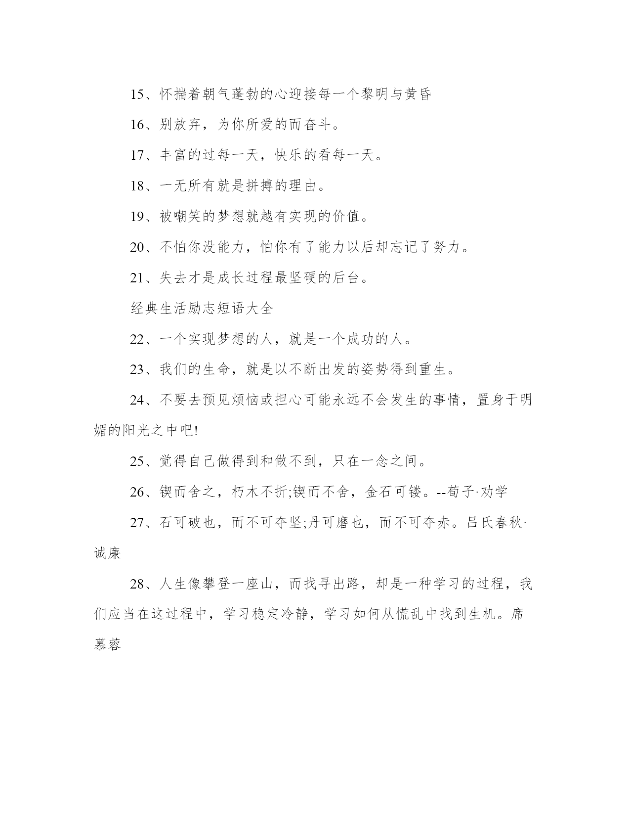 经典生活励志警句大全2、人类的希望像是一颗永恒的星,乌云掩不住它的光芒。特别是在今天,和平不是一个理想,一个梦,它是万人的愿望。--巴金3、我们是国家的主人,应该处处为国家着想。--雷锋4、我们爱我们的民族,这是我们自信心的源泉。--周恩来5、路是脚踏出来的,历史是人写出来的。人的每一步行动都在书写自己的历史。--吉鸿昌6、形成天才的决定因素应该是勤奋。……有几分勤学苦练是成正比例的。--郭沫若7、自觉心是进步之母,自贱心是堕落之源,故自觉心不可无,自贱心不可有。--邹韬奋8、我们活着不能与草木同腐,不能醉生梦死,枉度人生,要有所作为。--方志敏9、做人也要像蜡烛一样,在有限的一生中有一分热发一分光,给人以光明,给人以温暖。--萧楚女10、精诚所加,金石为开。--后汉书·光武十王列传11、站起来,擦干汗水。走下去,生活还要继续。12、这一路你可以哭,但一定不能怂13、没实力的愤怒毫无意义。14、心中种下快乐,就不会悲伤。15、怀揣着朝气蓬勃的心迎接每一个黎明与黄昏16、别放弃,为你所爱的而奋斗。17、丰富的过每一天,快乐的看每一天。18、一无所有就是拼搏的理由。19、被嘲笑的梦想就越有实现的价值。20、不怕你没能力,怕你有了能力以后却忘记了努力。21、失去才是成长过程最坚硬的后台。经典生活励志短语大全22、一个实现梦想的人,就是一个成功的人。23、我们的生命,就是以不断出发的姿势得到重生。24、不要去预见烦恼或担心可能永远不会发生的事情,置身于明媚的阳光之中吧!25、觉得自己做得到和做不到,只在一念之间。26、锲而舍之,朽木不折;锲而不舍,金石可镂。--荀子·劝学27、石可破也,而不可夺坚;丹可磨也,而不可夺赤。吕氏春秋·诚廉28、人生像攀登一座山,而找寻出路,却是一种学习的过程,我们应当在这过程中,学习稳定冷静,学习如何从慌乱中找到生机。席慕蓉29、一分钟一秒钟自满,在这一分一秒间就停止了自己吸收的生命和排泄的生命。只有接受批评才能排泄精神的一切渣滓。只有吸收他人的意见。我才能添加精神上新的滋养品。--徐特立30、知识是从刻苦劳动中得来的,任何成就都是刻苦劳动的结果。--宋庆龄
