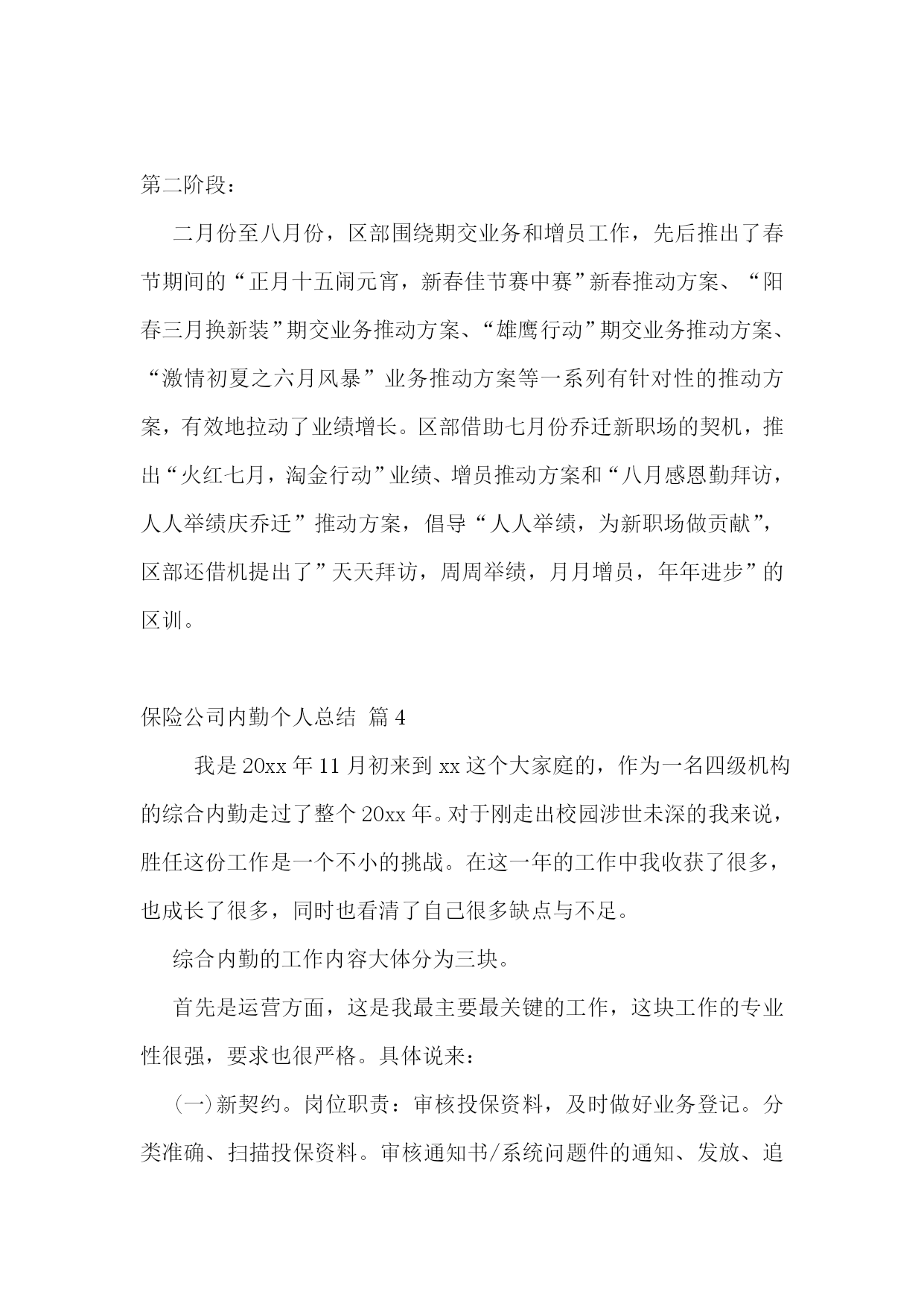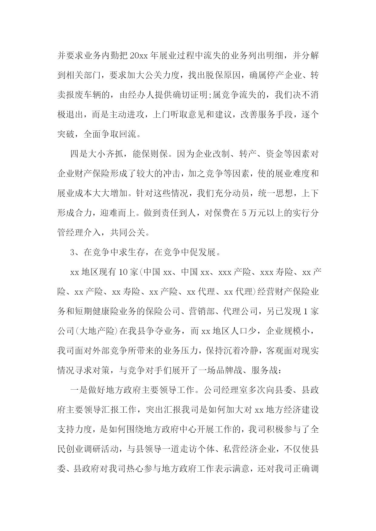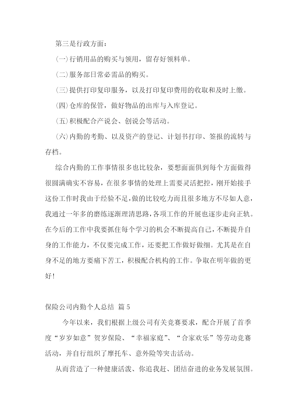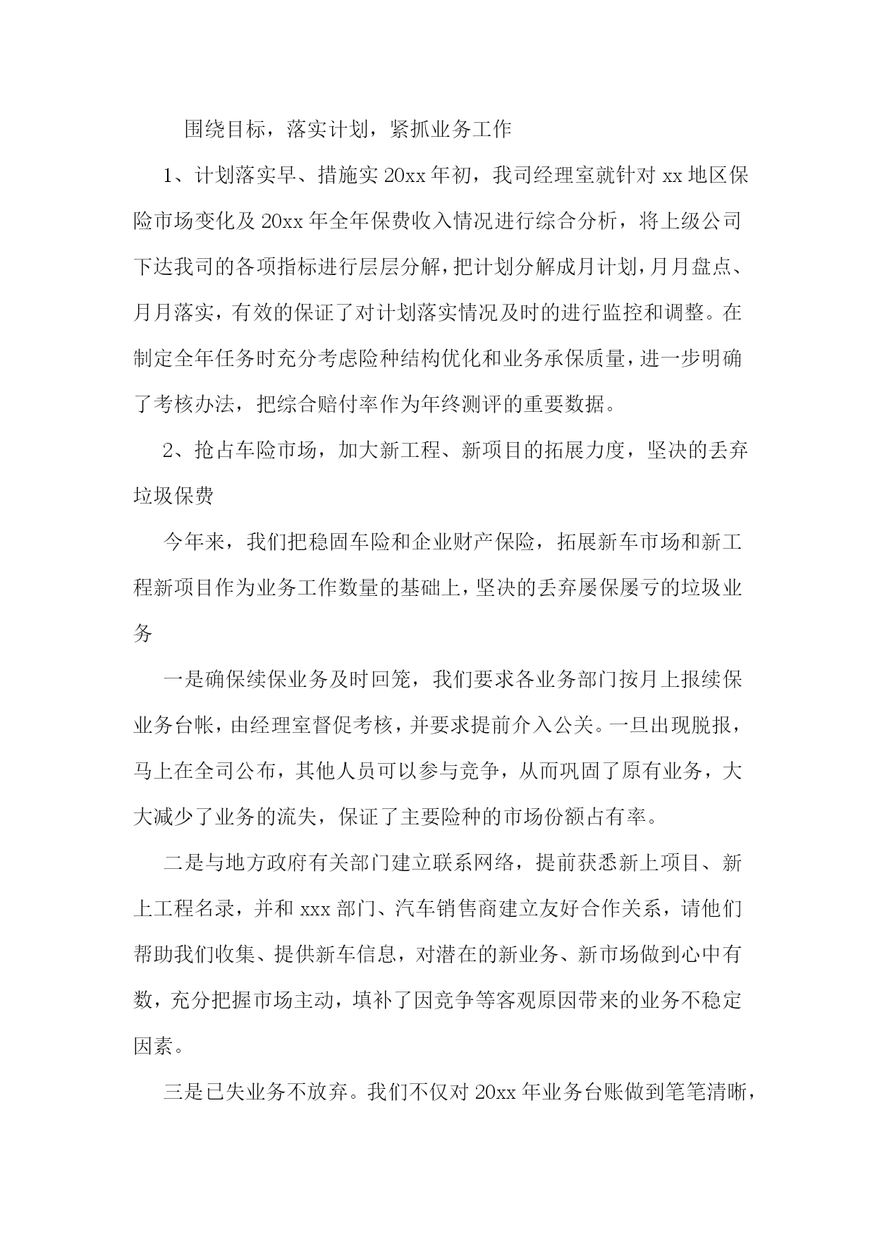 保险公司内勤个人总结保险公司内勤个人总结篇1我已在保险公司工作四个年头。在同事和领导的热情帮助下,经过四年的历练,已从当年的保险新手,成长为专业老练的公司保险的重要负责人。在岗位上,我能为客户提供很好的保险咨询服务,并且还能为公司外出招揽新业务,为公司的发展做出应有的贡献。在公司里,我遵纪守法,团结集体,与同事们共同完成领导和上级布置的工作任务。下面是我对工作情况的总结。一、不断学习,参加培训,使业务水平不断提高学无止境,虽然我对公司的各方各面都已很熟悉,但我仍不满足于现状,为了不断提高自己的业务水平,我积极参加上级公司和支公司、本部门组织的各种业务学习培训和考试考核,勤于学习,善于创造,不断加强自身业务素质的训练,不断提高业务操作技能和为客户服务的基本功,掌握了应有的专业业务技能和服务技巧,能够熟练办理各种业务,知晓本公司经营的各项业务产品并能有针对性地开展宣传和促销。二、提高思觉悟,在思想上政治上不断进步一直以来,我都保持着积极取的心态,积极参加上级公司和支公司、本部门组织的各种政治学习、主题教育、职业教育活动以及各项组织活动和文娱活动,没有无故缺席现象;能够坚持正确的政治方向,从各方面主动努力提高自身政治素养和思想道德水平,在思想上政治上都有所进步。三、不违规不违纪,一切按规章制度办事,一心一意工作,取提前完成公司各项任务我始终怀着一颗为人民服务,为公司谋利的心,无论在办理业务还是其它的工作中,都能严格执行上级公司和支公司的各项规章制度、内控规定和服务规定,坚持文明用语,不越权办事,不用权谋私,没有出现被客户投诉的行为以及其它违规违章行为。业余生活检点,不参与赌博、不良行为。在平时的工作中,我一直做到兢兢业业、勤勤恳恳地努力工作,上班早来晚走,立足岗位,默默奉献,积极完成支公司和本部门下达的各项工作任务。能够积极主支动关心本部门的各项营销工作和任务,积极营销电子银行业务和各种银行卡等及其它中介业务等。总之,保险事业已成为了我人生的一部分,带着执着和热情,我会一直走下去,鼓足干劲,履行自己的工作和岗位职责。在这半年以来,我努力按上级领导的要求,切实做好各方面工作,也取得了一定的成绩,并得到了领导的肯定,也得到了同事们的好评。在对取得成绩的同时,我也发现自己与最优秀的伙伴相比,还存在着一定的差距和不足。但,我有信心和决心在今后的工作中努力缩短与他们的差距,勇克服缺点和弥补不足,为进一步提高自身综合素质而努力。保险公司内勤个人总结篇2围绕目标,落实计划,紧抓业务工作1、计划落实早、措施实20xx年初,我司经理室就针对xx地区保险市场变化及20xx年全年保费收入情况进行综合分析,将上级公司下达我司的各项指标进行层层分解,把计划分解成月计划,月月盘点、月月落实,有效的保证了对计划落实情况及时的进行监控和调整。在制定全年任务时充分考虑险种结构优化和业务承保质量,进一步明确了考核办法,把综合赔付率作为年终测评的重要数据。2、抢占车险市场,加大新工程、新项目的拓展力度,坚决的丢弃垃圾保费今年来,我们把稳固车险和企业财产保险,拓展新车市场和新工程新项目作为业务工作数量的基础上,坚决的丢弃屡保屡亏的垃圾业务一是确保续保业务及时回笼,我们要求各业务部门按月上报续保业务台帐,由经理室督促考核,并要求提前介入公关。一旦出现脱报,马上在全司公布,其他人员可以参与竞争,从而巩固了原有业务,大大减少了业务的流失,保证了主要险种的市场份额占有率。二是与地方政府有关部门建立联系网络,提前获悉新上项目、新上工程名录,并和xxx部门、汽车销售商建立友好合作关系,请他们帮助我们收集、提供新车信息,对潜在的新业务、新市场做到心中有数,充分把握市场主动,填补了因竞争等客观原因带来的业务不稳定因素。三是已失业务不放弃。我们不仅对20xx年业务台账做到笔笔清晰,并要求业务内勤把20xx年展业过程中流失的业务列出明细,并分解到相关部门,要求加大公关力度,找出脱保原因,确属停产企业、转卖报废车辆的,由经办人提供确切证明;属竞争流失的,我们决不消极退出,而是主动进攻,上门听取意见和建议,改善服务手段,逐个突破,全面争取回流。四是大小齐抓,能保则保。因为企业改制、转产、资金等因素对企业财产保险形成了较大的冲击,加之竞争等因素,使的展业难度和展业成本大大增加。针对这些情况,我们充分动员,统一思想,上下形成合力,迎难而上。做到责任到人,对保费在5万元以上的实行分管经理介入,共同公关。3、在竞争中求生存,在竞争中促发展。xx地区现有10家(中国xx、中国xx、xxx产险、xxx寿险、xx产险、xx产险、xx寿险、xx产险、xx代理、xx代理)经营财产保险业务和短期健康险业务的保险公司、营销部、代理公司,另已发现1家公司(大地产险)在我县