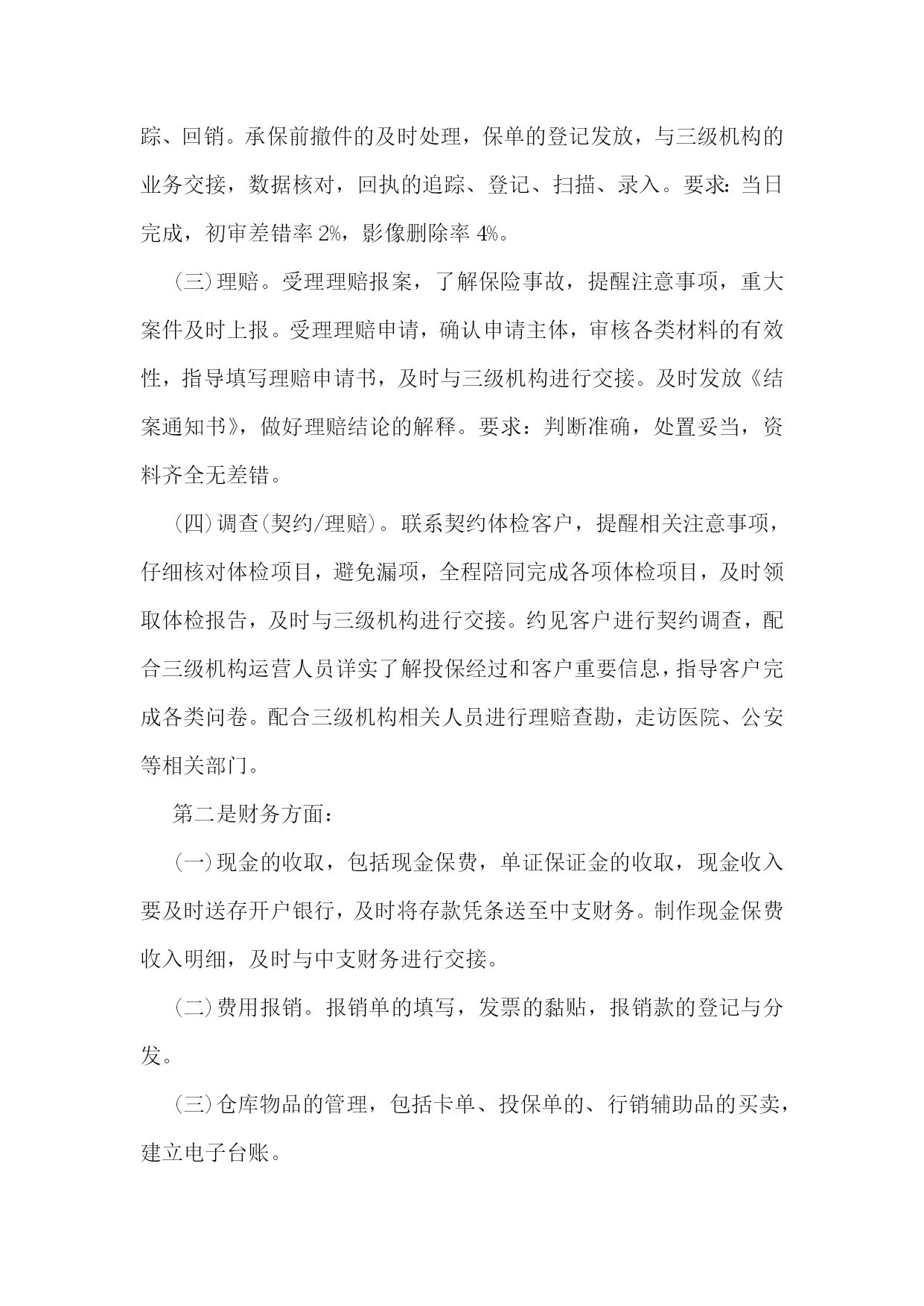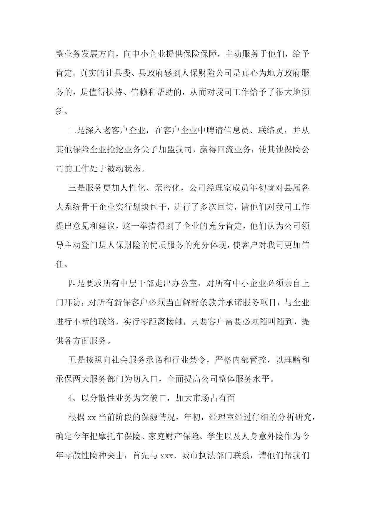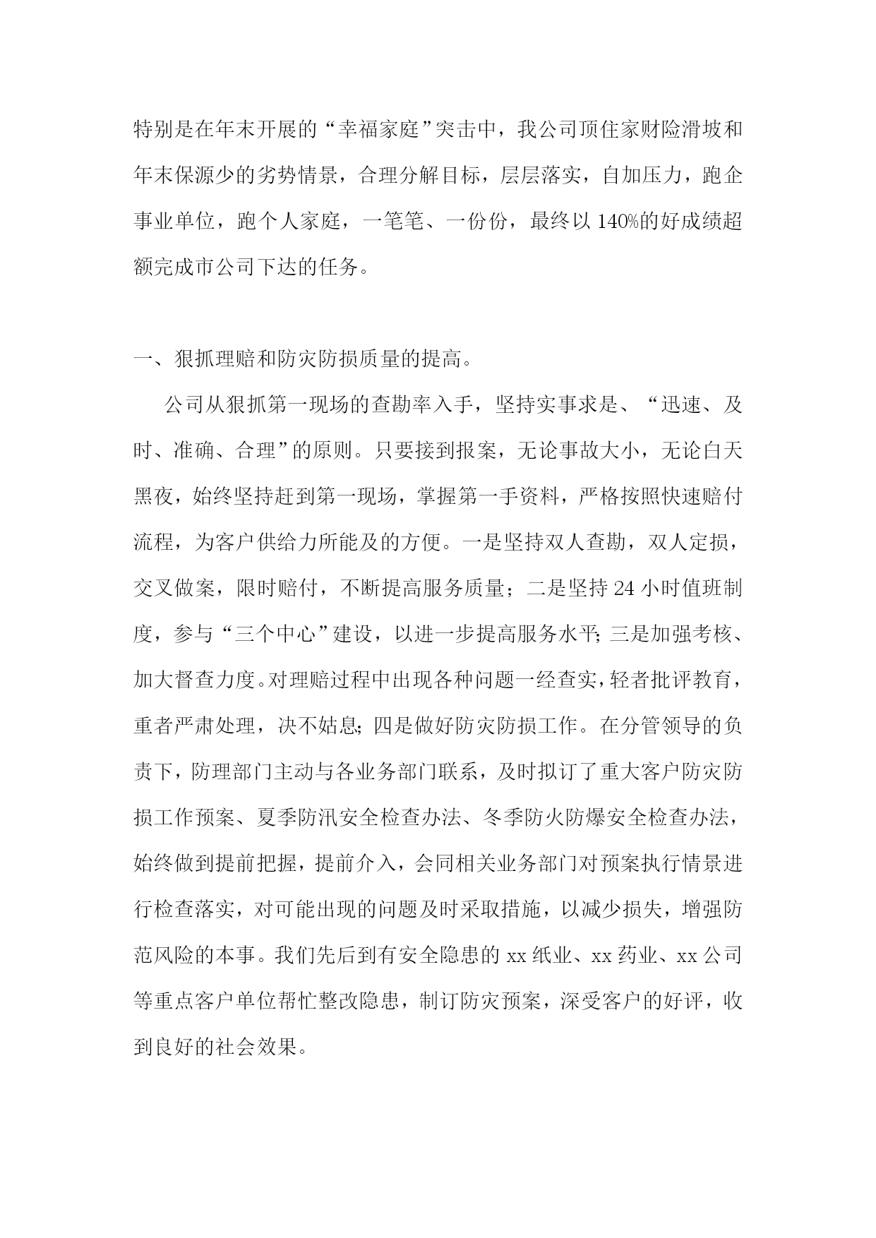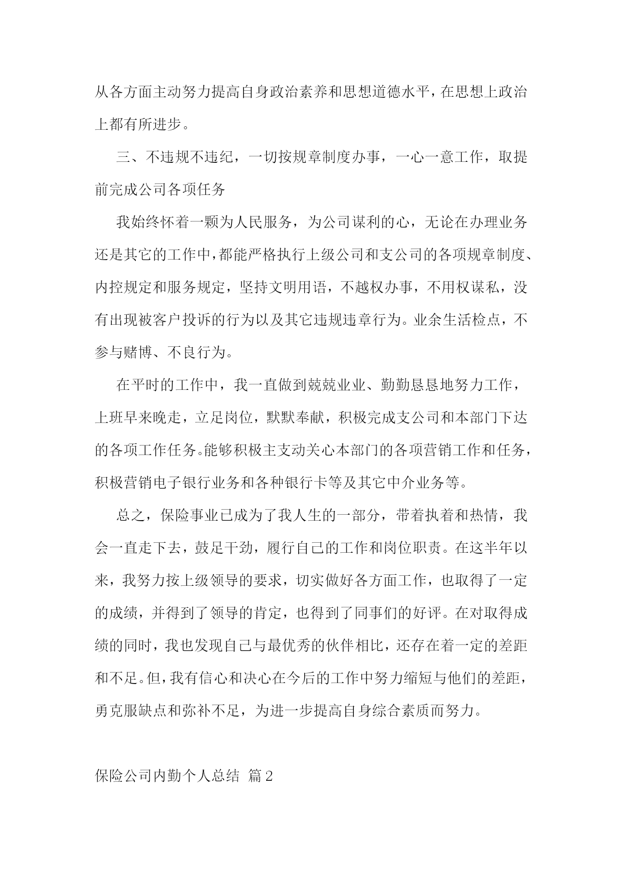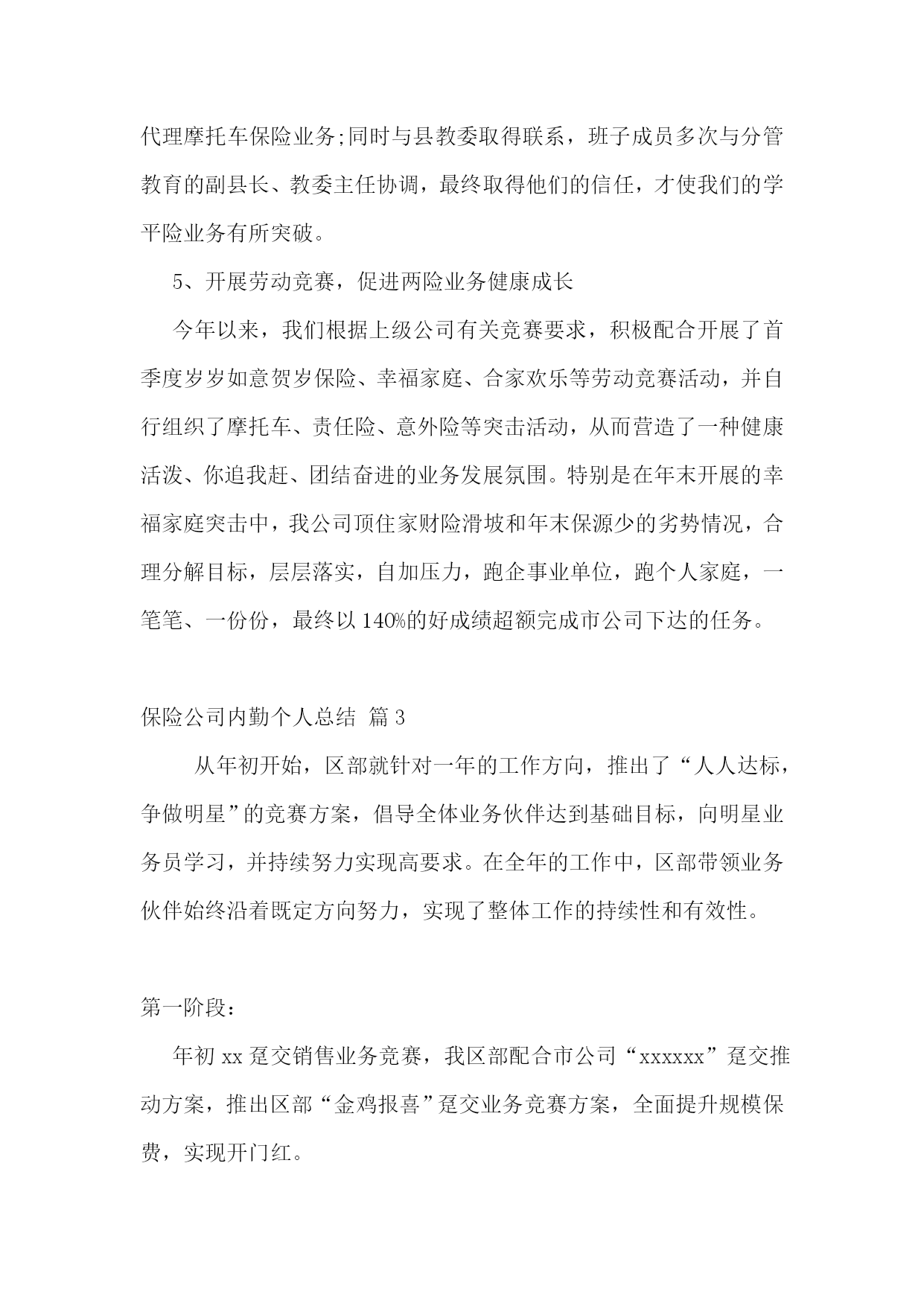 保险公司内勤个人总结保险公司内勤个人总结篇1我已在保险公司工作四个年头。在同事和领导的热情帮助下,经过四年的历练,已从当年的保险新手,成长为专业老练的公司保险的重要负责人。在岗位上,我能为客户提供很好的保险咨询服务,并且还能为公司外出招揽新业务,为公司的发展做出应有的贡献。在公司里,我遵纪守法,团结集体,与同事们共同完成领导和上级布置的工作任务。下面是我对工作情况的总结。一、不断学习,参加培训,使业务水平不断提高学无止境,虽然我对公司的各方各面都已很熟悉,但我仍不满足于现状,为了不断提高自己的业务水平,我积极参加上级公司和支公司、本部门组织的各种业务学习培训和考试考核,勤于学习,善于创造,不断加强自身业务素质的训练,不断提高业务操作技能和为客户服务的基本功,掌握了应有的专业业务技能和服务技巧,能够熟练办理各种业务,知晓本公司经营的各项业务产品并能有针对性地开展宣传和促销。二、提高思觉悟,在思想上政治上不断进步一直以来,我都保持着积极取的心态,积极参加上级公司和支公司、本部门组织的各种政治学习、主题教育、职业教育活动以及各项组织活动和文娱活动,没有无故缺席现象;能够坚持正确的政治方向,从各方面主动努力提高自身政治素养和思想道德水平,在思想上政治上都有所进步。三、不违规不违纪,一切按规章制度办事,一心一意工作,取提前完成公司各项任务我始终怀着一颗为人民服务,为公司谋利的心,无论在办理业务还是其它的工作中,都能严格执行上级公司和支公司的各项规章制度、内控规定和服务规定,坚持文明用语,不越权办事,不用权谋私,没有出现被客户投诉的行为以及其它违规违章行为。业余生活检点,不参与赌博、不良行为。在平时的工作中,我一直做到兢兢业业、勤勤恳恳地努力工作,上班早来晚走,立足岗位,默默奉献,积极完成支公司和本部门下达的各项工作任务。能够积极主支动关心本部门的各项营销工作和任务,积极营销电子银行业务和各种银行卡等及其它中介业务等。总之,保险事业已成为了我人生的一部分,带着执着和热情,我会一直走下去,鼓足干劲,履行自己的工作和岗位职责。在这半年以来,我努力按上级领导的要求,切实做好各方面工作,也取得了一定的成绩,并得到了领导的肯定,也得到了同事们的好评。在对取得成绩的同时,我也发现自己与最优秀的伙伴相比,还存在着一定的差距和不足。但,我有信心和决心在今后的工作中努力缩短与他们的差距,勇克服缺点和弥补不足,为进一步提高自身综合素质而努力。保险公司内勤个人总结篇2围绕目标,落实计划,紧抓业务工作1、计划落实早、措施实20xx年初,我司经理室就针对xx地区保险市场变化及20xx年全年保费收入情况进行综合分析,将上级公司下达我司的各项指标进行层层分解,把计划分解成月计划,月月盘点、月月落实,有效的保证了对计划落实情况及时的进行监控和调整。在制定全年任务时充分考虑险种结构优化和业务承保质量,进一步明确了考核办法,把综合赔付率作为年终测评的重要数据。2、抢占车险市场,加大新工程、新项目的拓展力度,坚决的丢弃垃圾保费今年来,我们把稳固车险和企业财产保险,拓展新车市场和新工程新项目作为业务工作数量的基础上,坚决的丢弃屡保屡亏的垃圾业务一是确保续保业务及时回笼,我们要求各业务部门按月上报续保业务台帐,由经理室督促考核,并要求提前介入公关。一旦出现脱报,马上在全司公布,其他人员可以参与竞争,从而巩固了原有业务,大大减少了业务的流失,保证了主要险种的市场份额占有率。二是与地方政府有关部门建立联系网络,提前获悉新上项目、新上工程名录,并和xxx部门、汽车销售商建立友好合作关系,请他们帮助我们收集、提供新车信息,对潜在的新业务、新市场做到心中有数,充分把握市场主动,填补了因竞争等客观原因带来的业务不稳定因素。三是已失业务不放弃。我们不仅对20xx年业务台账做到笔笔清晰,并要求业务内勤把20xx年展业过程中流失的业务列出明细,并分解到相关部门,要求加大公关力度,找出脱保原因,确属停产企业、转卖报废车辆的,由经办人提供确切证明;属竞争流失的,我们决不消极退出,而是主动进攻,上门听取意见和建议,改善服务手段,逐个突破,全面争取回流。四是大小齐抓,能保则保。因为企业改制、转产、资金等因素对企业财产保险形成了较大的冲击,加之竞争等因素,使的展业难度和展业成本大大增加。针对这些情况,我们充分动员,统一思想,上下形成合力,迎难而上。做到责任到人,对保费在5万元以上的实行分管经理介入,共同公关。3、在竞争中求生存,在竞争中促发展。xx地区现有10家(中国xx、中国xx、xxx产险、xxx寿险、xx产险、xx产险、xx寿险、xx产险、xx代理、xx代理)经营财产保险业务和短期健康险业务的保险公司、营销部、代理公司,另已发现1家公司(大地产险)在我县