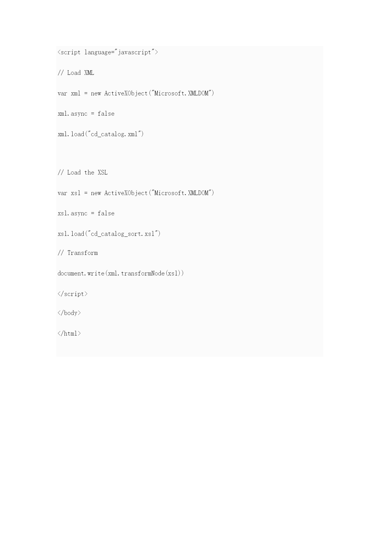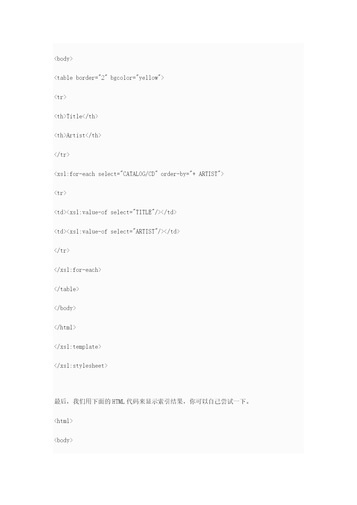 五.XSL的索引如果我需要将元素的显示按一定的顺序排列,应该如何建立XSL的索引呢?我们还是来看前面的例子,还是这段代码:<?xmlversion="1.0"encoding="ISO8859-1"?><CATALOG><CD><TITLE>EmpireBurlesque</TITLE><ARTIST>BobDylan</ARTIST><COUNTRY>USA</COUNTRY><COMPANY>Columbia</COMPANY><PRICE>10.90</PRICE><YEAR>1985</YEAR></CD>当XML文档被转换成HTML文件,索引应该同时建立。简单的办法就是给你的for-each元素增加一个order-by属性,就象这样:<xsl:for-eachselect="CATALOG/CD"order-by="+ARTIST">order-by属性带有一个"+"或者"-"的符号,用来定义索引的方式,是升序还是降序排列。符号后面的名字就是要索引的关键字。例如(cd_catalog_sort.xsl):<?xmlversion='1.0'?><xsl:stylesheetxmlns:xsl="http://www.w3.org/TR/WD-xsl"><xsl:templatematch="/"><html><body><tableborder="2"bgcolor="yellow"><tr><th>Title</th><th>Artist</th></tr><xsl:for-eachselect="CATALOG/CD"order-by="+ARTIST"><tr><td><xsl:value-ofselect="TITLE"/></td><td><xsl:value-ofselect="ARTIST"/></td></tr></xsl:for-each></table></body></html></xsl:template></xsl:stylesheet>最后,我们用下面的HTML代码来显示索引结果,你可以自己尝试一下。<html><body><scriptlanguage="javascript">//LoadXMLvarxml=newActiveXObject("Microsoft.XMLDOM")xml.async=falsexml.load("cd_catalog.xml")//LoadtheXSLvarxsl=newActiveXObject("Microsoft.XMLDOM")xsl.async=falsexsl.load("cd_catalog_sort.xsl")//Transformdocument.write(xml.transformNode(xsl))</script></body></html>