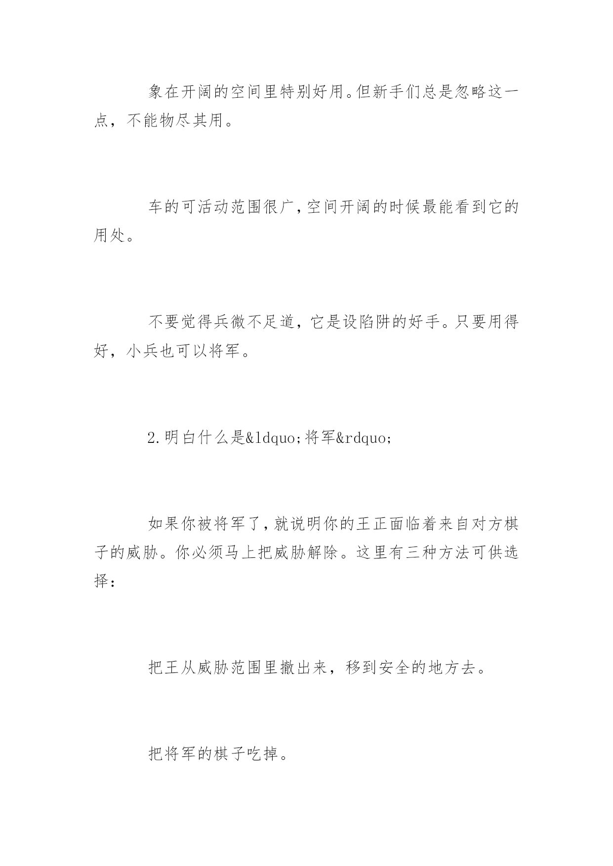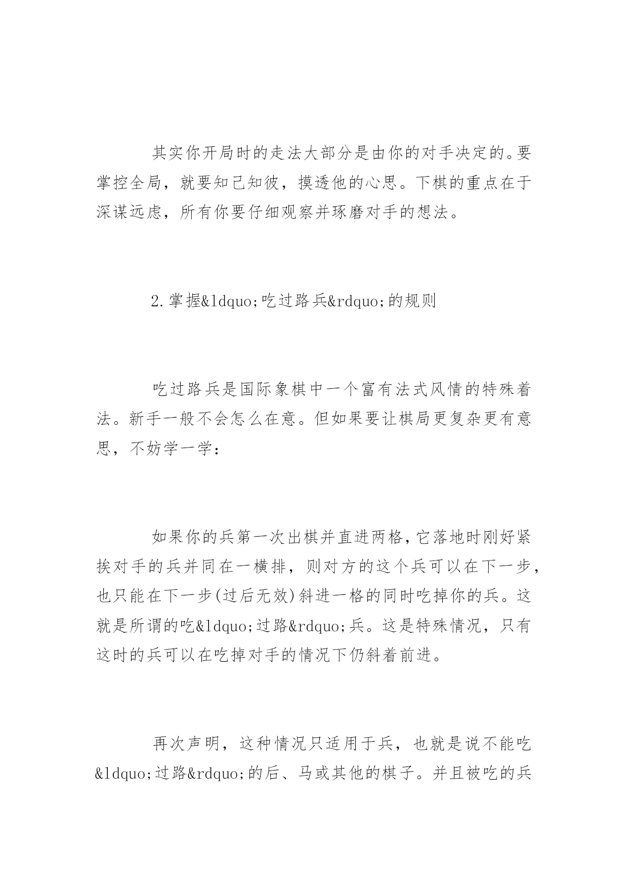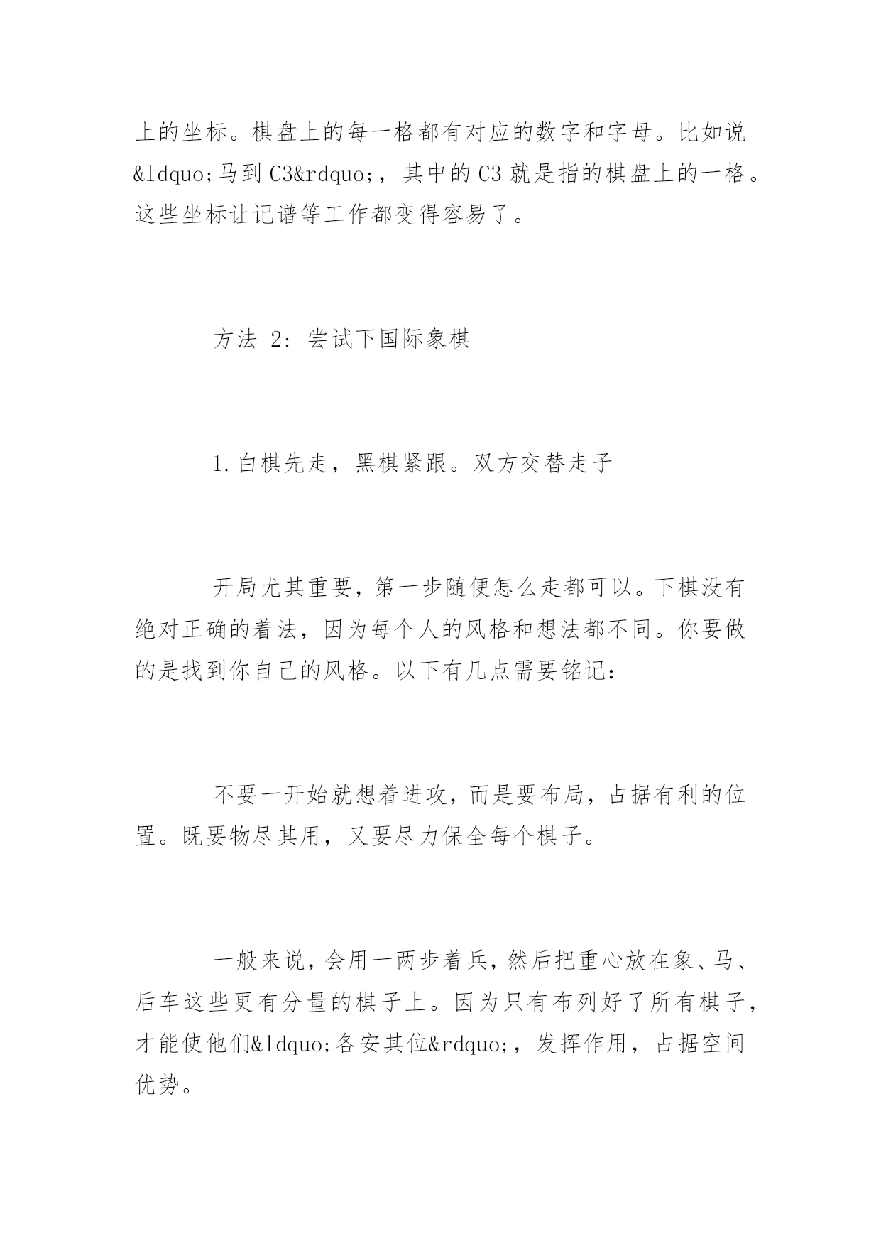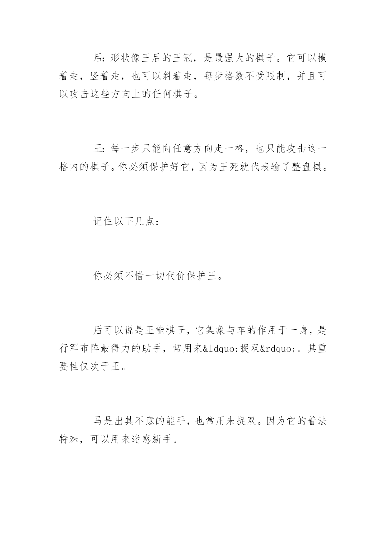 国际象棋入门教程「文字版」国际象棋入门教程「文字版」国际象棋可以说是最棒的棋盘游戏之一,它是战略战术和纯技术的完美融合。那么你们是不是想知道国际象棋入门教程呢?那么接下来小编来告诉你们吧,希望对你们有帮助。 国际象棋入门教程方法1:初步了解国际象棋1.学习棋子代表的意义和走子规则每种棋子的着法都不一样。下面就介绍一下各种棋子以及其各自的走法(有极少数的例外,将在后面介绍):兵:这是最基本的棋子(每方各有八个)。它的第一步可以向前走一格或两格,但之后的每步只能向前走一格。它是直走斜吃,也就是只能攻击它斜进一格内的对方棋子。并且不能后退。车:它的形状很像城堡的塔楼,可以斜着走也可以竖着走,每步的格数不受限制。并且可以攻击它行进道路上的棋子。马:它的形状就像一匹马,是着法最复杂的一个。它走的是“L"形,可以朝任意方向横着走两步,再竖着走一步;或者反过来横着走一步,再竖着走两步。只有它可以越过其他棋子行进,但它也只能攻击它落步的位置上的棋子。象:只能斜着走,每步格数不受限制,但不能越过其他棋子。它的英文名原意是主教,所以形状很像主教的帽子。后:形状像王后的王冠,是最强大的棋子。它可以横着走,竖着走,也可以斜着走,每步格数不受限制,并且可以攻击这些方向上的任何棋子。王:每一步只能向任意方向走一格,也只能攻击这一格内的棋子。你必须保护好它,因为王死就代表输了整盘棋。记住以下几点:你必须不惜一切代价保护王。后可以说是王能棋子,它集象与车的作用于一身,是行军布阵最得力的助手,常用来“捉双”。其重要性仅次于王。马是出其不意的能手,也常用来捉双。因为它的着法特殊,可以用来迷惑新手。象在开阔的空间里特别好用。但新手们总是忽略这一点,不能物尽其用。车的可活动范围很广,空间开阔的时候最能看到它的用处。不要觉得兵微不足道,它是设陷阱的好手。只要用得好,小兵也可以将军。2.明白什么是“将军”如果你被将军了,就说明你的王正面临着来自对方棋子的威胁。你必须马上把威胁解除。这里有三种方法可供选择:把王从威胁范围里撤出来,移到安全的地方去。把将军的棋子吃掉。用你的其他棋子把王给挡住。但这一招对马和兵(或贴身攻击的后、车、象)不管用。要是这三招都不管用,解不了王的围的话,你就算输了。游戏结束。3.要知道下国际象棋的目标是什么即抓住对方的王并保护好自己的王。你要尽可能地吃掉对方的棋子,也要尽可能地避免被吃。下棋是智慧和决策的博弈。虽然新手总是有许多遗漏的地方,但国际象棋的乐趣总是玩得越多才越懂得的。4.摆棋子现在你已经认识了所有的棋子,该学习怎么摆棋了。棋盘右下角的格子需是白色,所有的棋子要在双方面前各摆两行:把兵全都排在你面前的第二排,用它们在你和对手之间竖起一道保护墙。把车放在第一排的两角。然后把马放在车旁边,象放在马旁边。这时还剩两个格子,一个白色一个黑色,根据后的颜色来放(如白后放白格子,黑后放黑格子)。把王放在剩下的最后一个格子里,再检查看你的对手放得对不对。两边的王和后要相互对应。5.如果你真的想学好国际象棋,你可以了解一下棋盘上的坐标。棋盘上的每一格都有对应的数字和字母。比如说“马到C3”,其中的C3就是指的棋盘上的一格。这些坐标让记谱等工作都变得容易了。方法2:尝试下国际象棋1.白棋先走,黑棋紧跟。双方交替走子开局尤其重要,第一步随便怎么走都可以。下棋没有绝对正确的着法,因为每个人的风格和想法都不同。你要做的是找到你自己的风格。以下有几点需要铭记:不要一开始就想着进攻,而是要布局,占据有利的位置。既要物尽其用,又要尽力保全每个棋子。一般来说,会用一两步着兵,然后把重心放在象、马、后车这些更有分量的棋子上。因为只有布列好了所有棋子,才能使他们“各安其位”,发挥作用,占据空间优势。其实你开局时的走法大部分是由你的对手决定的。要掌控全局,就要知己知彼,摸透他的心思。下棋的重点在于深谋远虑,所有你要仔细观察并琢磨对手的想法。2.掌握“吃过路兵”的规则吃过路兵是国际象棋中一个富有法式风情的特殊着法。新手一般不会怎么在意。但如果要让棋局更复杂更有意思,不妨学一学:如果你的兵第一次出棋并直进两格,它落地时刚好紧挨对手的兵并同在一横排,则对方的这个兵可以在下一步,也只能在下一步(过后无效)斜进一格的同时吃掉你的兵。这就是所谓的吃“过路”兵。这是特殊情况,只有这时的兵可以在吃掉对手的情况下仍斜着前进。再次声明,这种情况只适用于兵,也就是说不能吃&ldquo