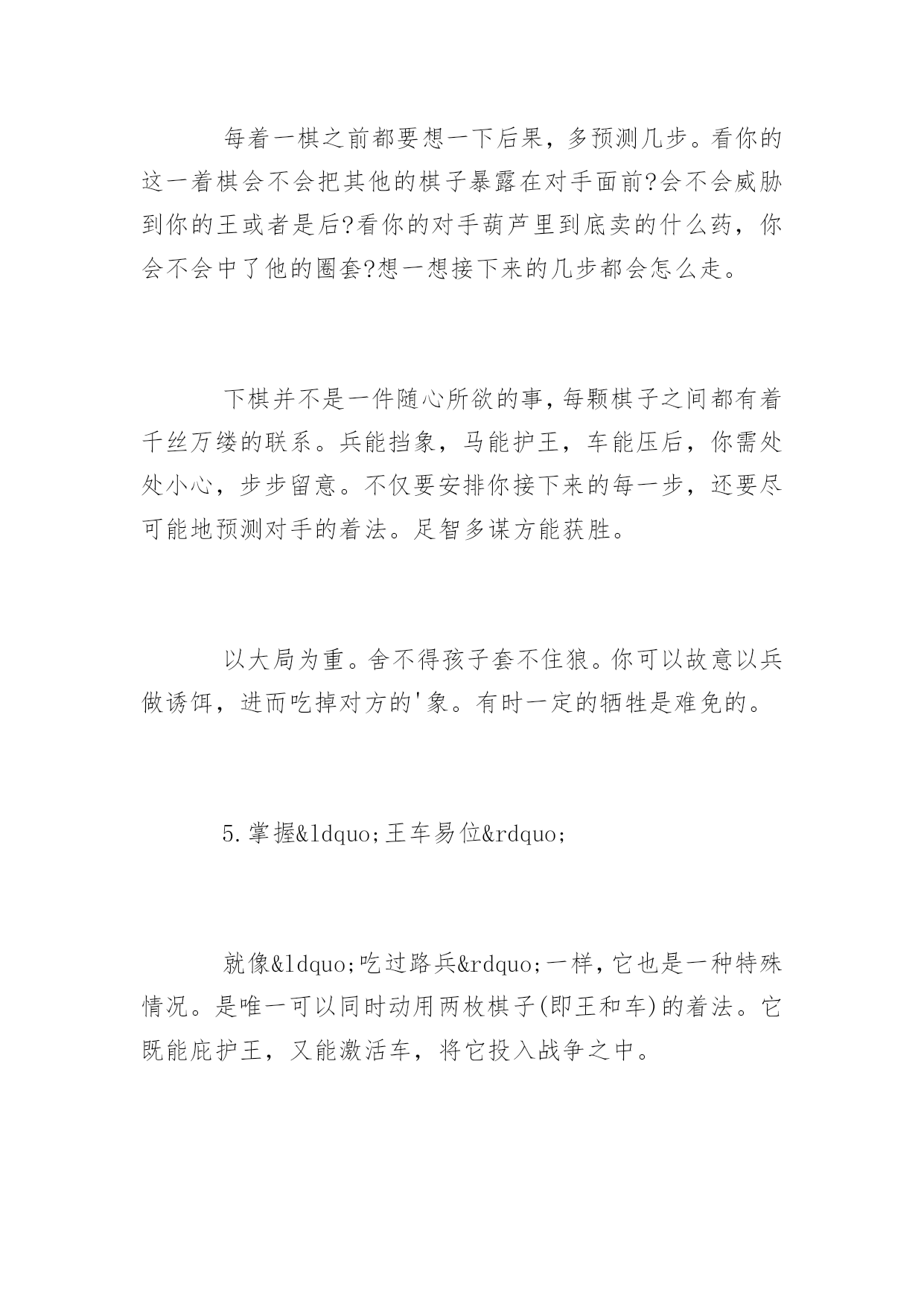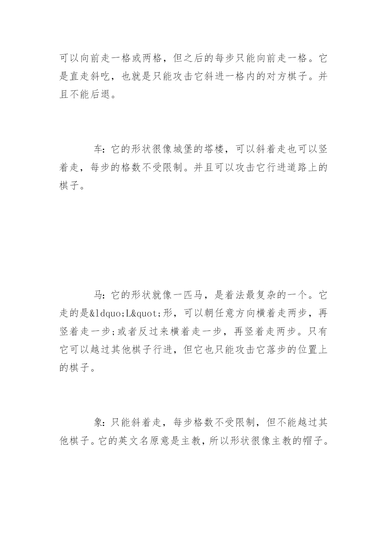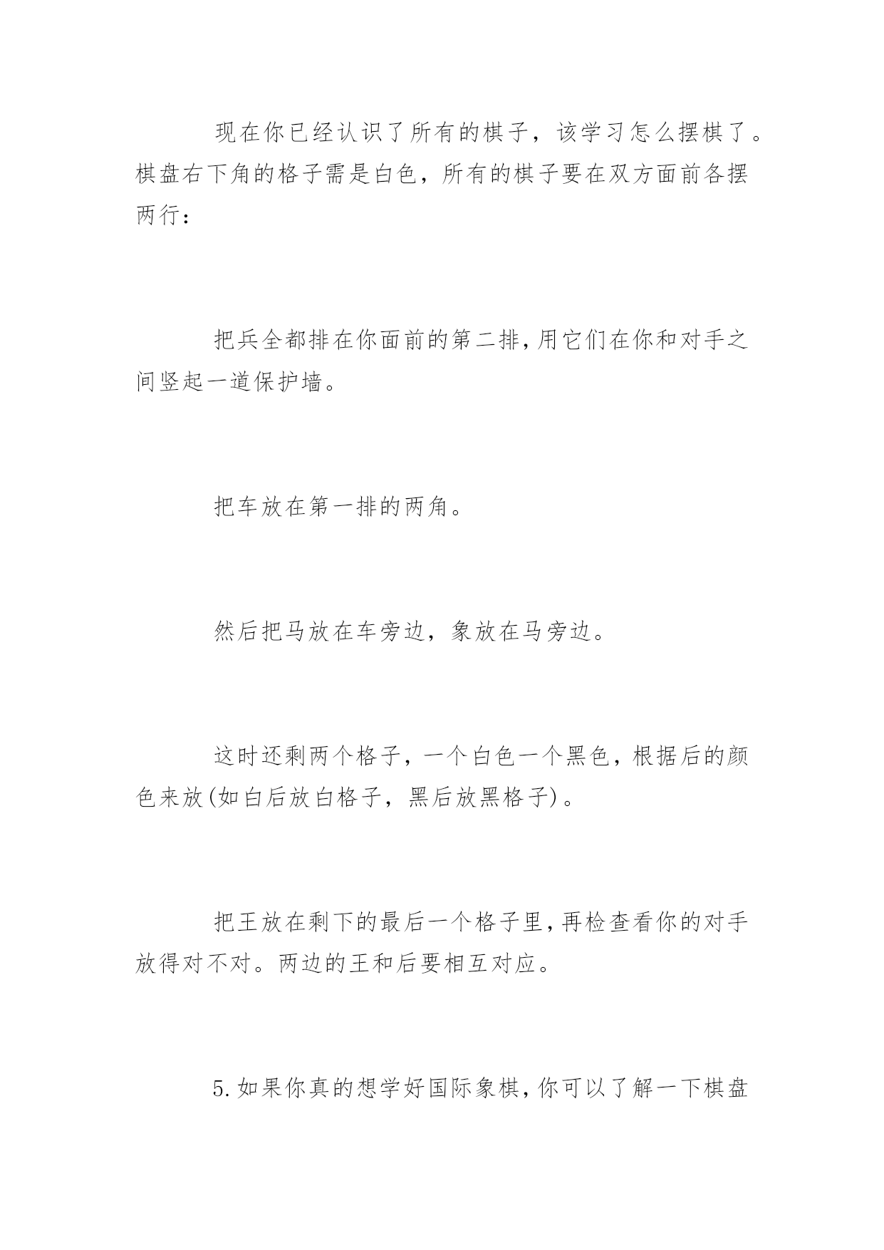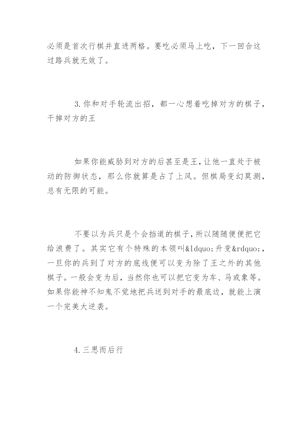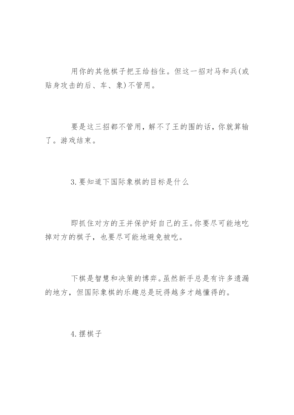 国际象棋入门教程「文字版」国际象棋入门教程「文字版」国际象棋可以说是最棒的棋盘游戏之一,它是战略战术和纯技术的完美融合。那么你们是不是想知道国际象棋入门教程呢?那么接下来小编来告诉你们吧,希望对你们有帮助。 国际象棋入门教程方法1:初步了解国际象棋1.学习棋子代表的意义和走子规则每种棋子的着法都不一样。下面就介绍一下各种棋子以及其各自的走法(有极少数的例外,将在后面介绍):兵:这是最基本的棋子(每方各有八个)。它的第一步可以向前走一格或两格,但之后的每步只能向前走一格。它是直走斜吃,也就是只能攻击它斜进一格内的对方棋子。并且不能后退。车:它的形状很像城堡的塔楼,可以斜着走也可以竖着走,每步的格数不受限制。并且可以攻击它行进道路上的棋子。马:它的形状就像一匹马,是着法最复杂的一个。它走的是“L"形,可以朝任意方向横着走两步,再竖着走一步;或者反过来横着走一步,再竖着走两步。只有它可以越过其他棋子行进,但它也只能攻击它落步的位置上的棋子。象:只能斜着走,每步格数不受限制,但不能越过其他棋子。它的英文名原意是主教,所以形状很像主教的帽子。后:形状像王后的王冠,是最强大的棋子。它可以横着走,竖着走,也可以斜着走,每步格数不受限制,并且可以攻击这些方向上的任何棋子。王:每一步只能向任意方向走一格,也只能攻击这一格内的棋子。你必须保护好它,因为王死就代表输了整盘棋。记住以下几点:你必须不惜一切代价保护王。后可以说是王能棋子,它集象与车的作用于一身,是行军布阵最得力的助手,常用来“捉双”。其重要性仅次于王。马是出其不意的能手,也常用来捉双。因为它的着法特殊,可以用来迷惑新手。象在开阔的空间里特别好用。但新手们总是忽略这一点,不能物尽其用。车的可活动范围很广,空间开阔的时候最能看到它的用处。不要觉得兵微不足道,它是设陷阱的好手。只要用得好,小兵也可以将军。2.明白什么是“将军”如果你被将军了,就说明你的王正面临着来自对方棋子的威胁。你必须马上把威胁解除。这里有三种方法可供选择:把王从威胁范围里撤出来,移到安全的地方去。把将军的棋子吃掉。用你的其他棋子把王给挡住。但这一招对马和兵(或贴身攻击的后、车、象)不管用。要是这三招都不管用,解不了王的围的话,你就算输了。游戏结束。3.要知道下国际象棋的目标是什么即抓住对方的王并保护好自己的王。你要尽可能地吃掉对方的棋子,也要尽可能地避免被吃。下棋是智慧和决策的博弈。虽然新手总是有许多遗漏的地方,但国际象棋的乐趣总是玩得越多才越懂得的。4.摆棋子现在你已经认识了所有的棋子,该学习怎么摆棋了。棋盘右下角的格子需是白色,所有的棋子要在双方面前各摆两行:把兵全都排在你面前的第二排,用它们在你和对手之间竖起一道保护墙。把车放在第一排的两角。然后把马放在车旁边,象放在马旁边。这时还剩两个格子,一个白色一个黑色,根据后的颜色来放(如白后放白格子,黑后放黑格子)。把王放在剩下的最后一个格子里,再检查看你的对手放得对不对。两边的王和后要相互对应。5.如果你真的想学好国际象棋,你可以了解一下棋盘上的坐标。棋盘上的每一格都有对应的数字和字母。比如说“马到C3”,其中的C3就是指的棋盘上的一格。这些坐标让记谱等工作都变得容易了。方法2:尝试下国际象棋1.白棋先走,黑棋紧跟。双方交替走子开局尤其重要,第一步随便怎么走都可以。下棋没有绝对正确的着法,因为每个人的风格和想法都不同。你要做的是找到你自己的风格。以下有几点需要铭记:不要一开始就想着进攻,而是要布局,占据有利的位置。既要物尽其用,又要尽力保全每个棋子。一般来说,会用一两步着兵,然后把重心放在象、马、后车这些更有分量的棋子上。因为只有布列好了所有棋子,才能使他们“各安其位”,发挥作用,占据空间优势。其实你开局时的走法大部分是由你的对手决定的。要掌控全局,就要知己知彼,摸透他的心思。下棋的重点在于深谋远虑,所有你要仔细观察并琢磨对手的想法。2.掌握“吃过路兵”的规则吃过路兵是国际象棋中一个富有法式风情的特殊着法。新手一般不会怎么在意。但如果要让棋局更复杂更有意思,不妨学一学:如果你的兵第一次出棋并直进两格,它落地时刚好紧挨对手的兵并同在一横排,则对方的这个兵可以在下一步,也只能在下一步(过后无效)斜进一格的同时吃掉你的兵。这就是所谓的吃“过路”兵。这是特殊情况,只有这时的兵可以在吃掉对手的情况下仍斜着前进。再次声明,这种情况只适用于兵,也就是说不能吃&ldquo