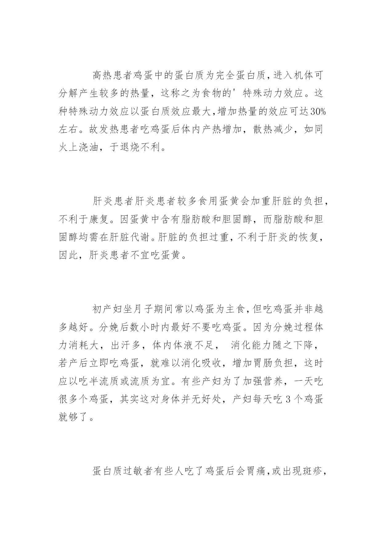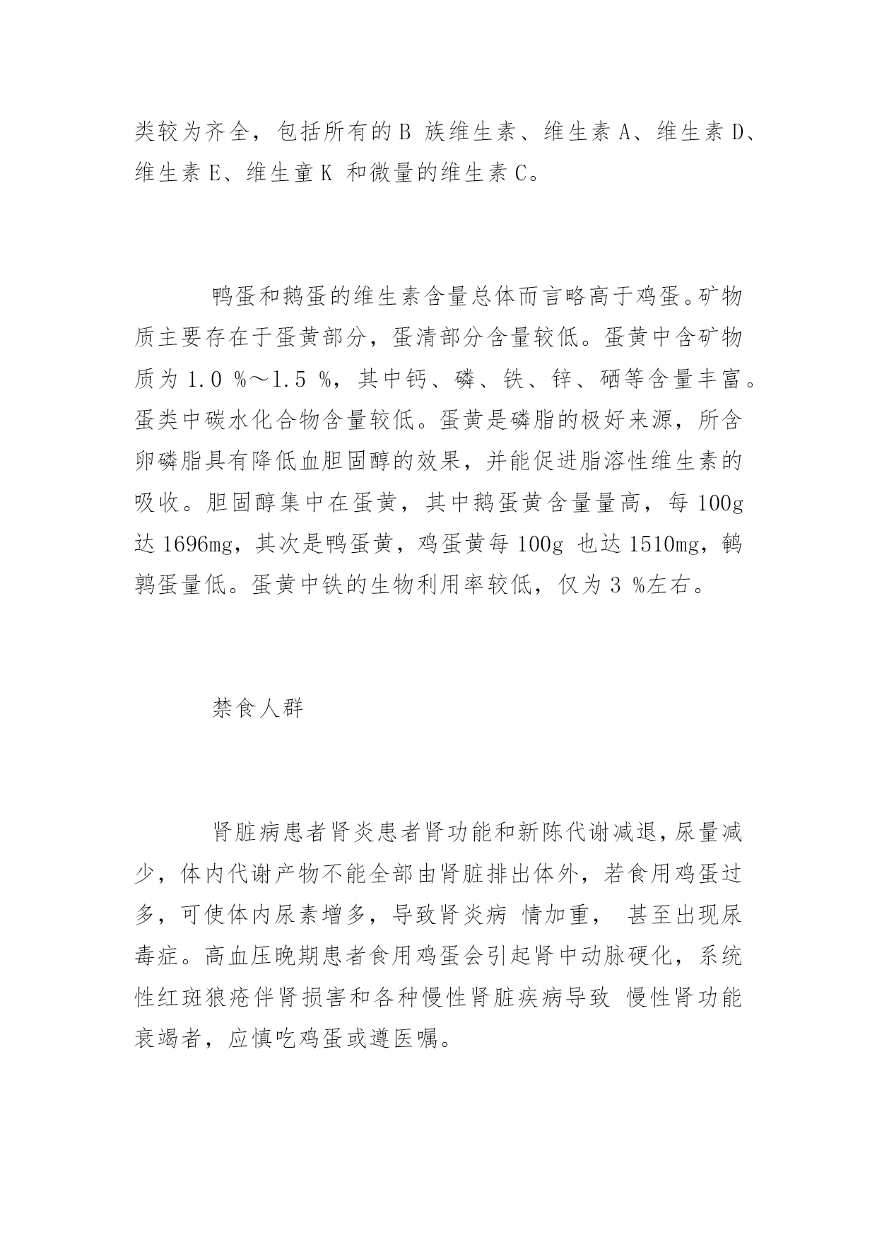 公共营养师知识:蛋及蛋制品的营养价值2017年公共营养师知识:蛋及蛋制品的营养价值导语:常见的蛋类有鸡、鸭、鹅和鹌鹑蛋等。其中产量最大,食用最普遍,食品加工工业中使用最广泛的是鸡蛋。我们一起来看看蛋类有哪些营养价值吧。蛋类包括鸡蛋、鸭蛋、鹅蛋、鹌鹑蛋、鸽蛋及其加工制成的咸蛋、松花蛋等。蛋类的营养素含量不仅丰富,而且质量也很好,是营养价值很高的食物。不同品种的蛋类,其营养成分大致相同。各种蛋类的蛋白质含量相似,全蛋为12%左右,蛋黄高于蛋清,加工成咸蛋或松花蛋后,无明显变化。蛋类蛋白质氨基酸组成与人体需要量为接近,营养价值很高,优于其他动物性蛋白。鸡蛋中脂肪含量约10%~l5%,98%的脂肪存在于蛋黄中,蛋清中含脂肪极少。蛋黄中的脂肪消化吸收率高。蛋黄中维生素含量十分丰富,且种类较为齐全,包括所有的B族维生素、维生素A、维生素D、维生素E、维生童K和微量的维生素C。鸭蛋和鹅蛋的维生素含量总体而言略高于鸡蛋。矿物质主要存在于蛋黄部分,蛋清部分含量较低。蛋黄中含矿物质为1.0%~l.5%,其中钙、磷、铁、锌、硒等含量丰富。蛋类中碳水化合物含量较低。蛋黄是磷脂的极好来源,所含卵磷脂具有降低血胆固醇的效果,并能促进脂溶性维生素的吸收。胆固醇集中在蛋黄,其中鹅蛋黄含量量高,每100g达1696mg,其次是鸭蛋黄,鸡蛋黄每100g也达1510mg,鹌鹑蛋量低。蛋黄中铁的生物利用率较低,仅为3%左右。禁食人群肾脏病患者肾炎患者肾功能和新陈代谢减退,尿量减少,体内代谢产物不能全部由肾脏排出体外,若食用鸡蛋过多,可使体内尿素增多,导致肾炎病情加重,甚至出现尿毒症。高血压晚期患者食用鸡蛋会引起肾中动脉硬化,系统性红斑狼疮伴肾损害和各种慢性肾脏疾病导致慢性肾功能衰竭者,应慎吃鸡蛋或遵医嘱。高热患者鸡蛋中的蛋白质为完全蛋白质,进入机体可分解产生较多的热量,这称之为食物的'特殊动力效应。这种特殊动力效应以蛋白质效应最大,增加热量的效应可达30%左右。故发热患者吃鸡蛋后体内产热增加,散热减少,如同火上浇油,于退烧不利。肝炎患者肝炎患者较多食用蛋黄会加重肝脏的负担,不利于康复。因蛋黄中含有脂肪酸和胆固醇,而脂肪酸和胆固醇均需在肝脏代谢。肝脏的负担过重,不利于肝炎的恢复,因此,肝炎患者不宜吃蛋黄。初产妇坐月子期间常以鸡蛋为主食,但吃鸡蛋并非越多越好。分娩后数小时内最好不要吃鸡蛋。因为分娩过程体力消耗大,出汗多,体内体液不足,消化能力随之下降,若产后立即吃鸡蛋,就难以消化吸收,增加胃肠负担,这时应以吃半流质或流质为宜。有些产妇为了加强营养,一天吃很多个鸡蛋,其实这对身体并无好处,产妇每天吃3个鸡蛋就够了。蛋白质过敏者有些人吃了鸡蛋后会胃痛,或出现斑疹,这是对鸡蛋过敏引起的。鸡蛋的蛋白质具有抗原性,与胃肠黏膜表面带有抗体的致敏肥大细胞作用,即可引起过敏反应,出现胃痛或腹痛、腹泻、斑疹等过敏症状。因此,此类人群不宜吃鸡蛋。