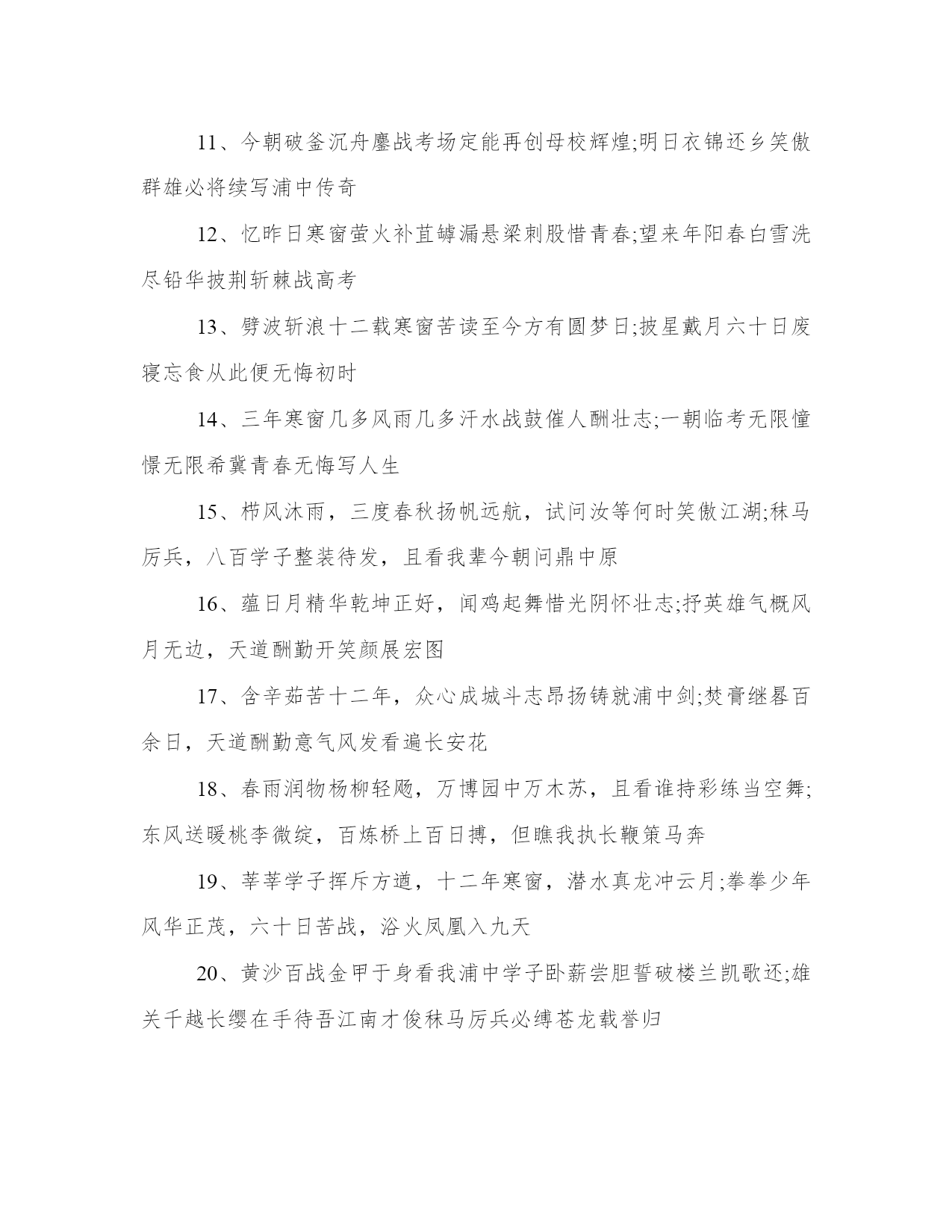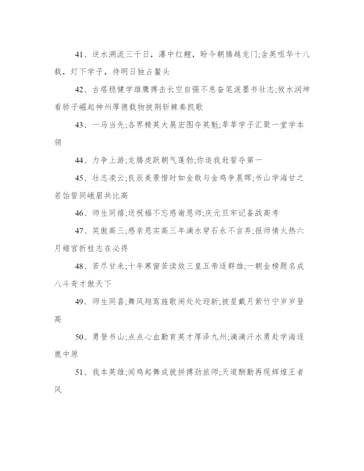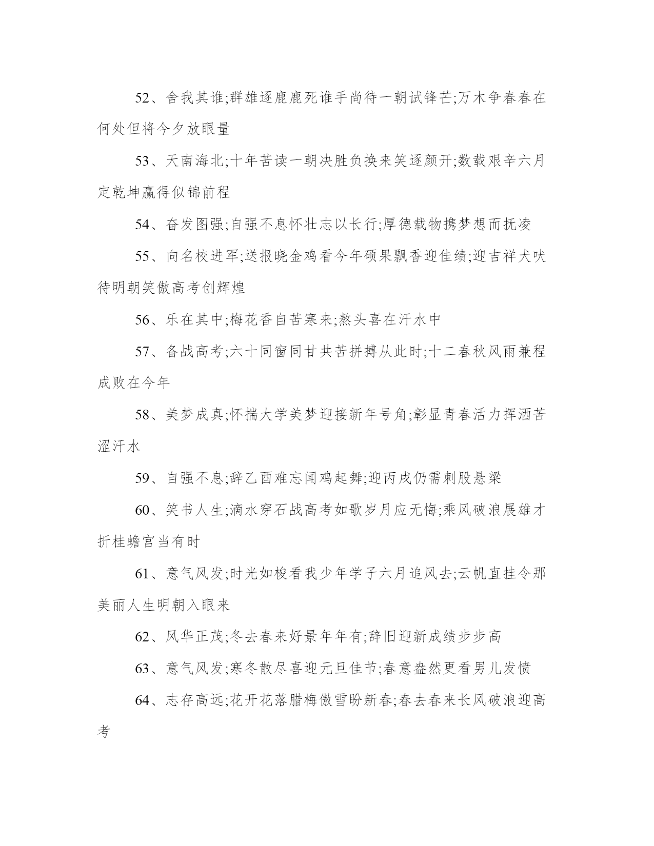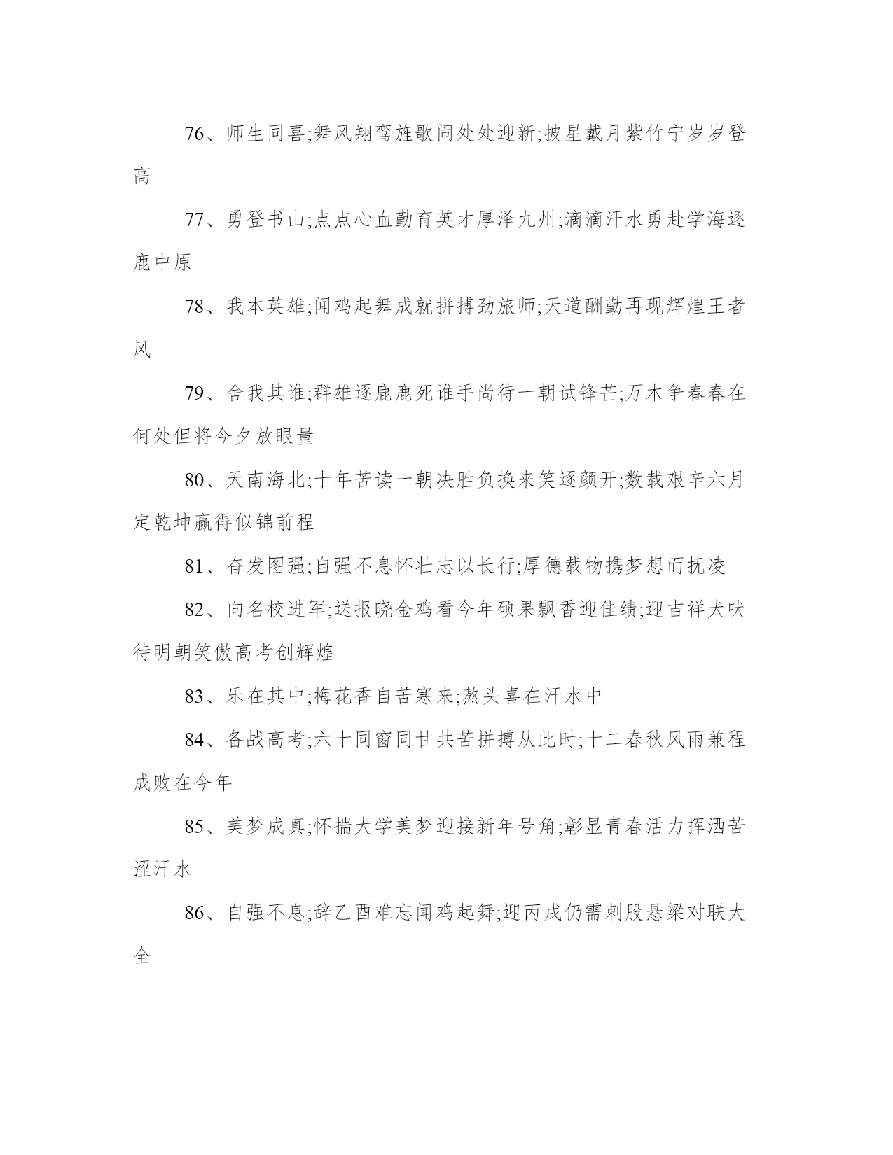 2017高考对联大全高考对联1、寒冬散尽喜迎元旦佳节;春意盎然更看男儿发愤2、花开花落腊梅傲雪盼新春;春去春来长风破浪迎高考3、辞旧迎新寒风阵阵催人逝;苦尽甘来捷报片片暖人心4、淡淡梅香傲雪凌寒携新岁祥瑞至;莘莘学子滴水穿石盼明朝捷报传5、十二年,读书万卷悬梁刺股终不悔;六十朝,花开满园腾蛟起凤尽开颜6、颓废者败自强者成寥廓霜天谁点江山;懒惰者去勤奋者来苍茫大地我主沉浮7、云深雾绕行难路三月往定是天朗日晶;山重水复寻正道百日过必然柳暗花明8、寒冬腊月傲骨白梅裁冰剪雪织锦绣前程;盛夏华年醉墨罗襟激文扬字书璀璨人生9、悬梁刺股五光十色欲九天揽月小试牛刀;秣马厉兵千难万险得万众瞩目独占鳌头10、披荆斩棘奋战题海熟知万源似成竹在胸;秣马厉兵统领书山细识千变如笔下有神11、今朝破釜沉舟鏖战考场定能再创母校辉煌;明日衣锦还乡笑傲群雄必将续写浦中传奇12、忆昨日寒窗萤火补苴罅漏悬梁刺股惜青春;望来年阳春白雪洗尽铅华披荆斩棘战高考13、劈波斩浪十二载寒窗苦读至今方有圆梦日;披星戴月六十日废寝忘食从此便无悔初时14、三年寒窗几多风雨几多汗水战鼓催人酬壮志;一朝临考无限憧憬无限希冀青春无悔写人生15、栉风沐雨,三度春秋扬帆远航,试问汝等何时笑傲江湖;秣马厉兵,八百学子整装待发,且看我辈今朝问鼎中原16、蕴日月精华乾坤正好,闻鸡起舞惜光阴怀壮志;抒英雄气概风月无边,天道酬勤开笑颜展宏图17、含辛茹苦十二年,众心成城斗志昂扬铸就浦中剑;焚膏继晷百余日,天道酬勤意气风发看遍长安花18、春雨润物杨柳轻飏,万博园中万木苏,且看谁持彩练当空舞;东风送暖桃李微绽,百炼桥上百日搏,但瞧我执长鞭策马奔19、莘莘学子挥斥方遒,十二年寒窗,潜水真龙冲云月;拳拳少年风华正茂,六十日苦战,浴火凤凰入九天20、黄沙百战金甲于身看我浦中学子卧薪尝胆誓破楼兰凯歌还;雄关千越长缨在手待吾江南才俊秣马厉兵必缚苍龙载誉归21、莫骄傲青葱校内初扬名,潜心钻研再创辉煌方显英雄本色;何惧怕黄金榜上暂遗贤,定神反思重整旗鼓待展我辈风流22、寒来暑往悠悠十二载云中熊虎将今朝乘风破浪去;朝去暮归铮铮三两天天上凤凰儿明日骑马踏花归23、承灵溪厚泽极目骋怀欲究天人际理,成就拼搏王者师;蒙丰安惠赐精思放胆以展卷帙才华,不忘点滴桃李恩24、望冬去春来屏气凝神百折不挠汇小流而成江海;看寒来暑往跋山涉水日夜兼程积跬步以致千里25、立品如岩上松必历千百载风霜方可柱明堂而成大厦;检身若璞中玉须磨数十番沙石乃堪琢圭璋而宝庙廊26、十二年摩顶放踵披荆斩棘只为踌躇满志谈笑去;一百天被褐怀玉乘风破浪终能锋芒毕露踏歌来27、笔走龙蛇作韩柳文章壮志凌云六月里独领风骚;胸藏经纬呈江南气象囊锥露颖浦中是尽现锋芒28、南湖舟上开天辟地炎黄子孙九十载励精图治铸伟业;灵溪岸边披荆斩棘浦中才俊十二年奋发图强书华章29、心随朗月,志同秋霜,跃龙门莫愧殷殷父母情;胸怀凌云,行职劲松,转乾坤不负堂堂七尺躯30、初日曈曈乘风破浪育宏志,葳蕤岁月应无悔;硕果累累磨杵成针闯雄关,馝馞前程当有时31、携一缕春风伴一窗明月仙华脚下苦读当有我;抱万种情思翔万里云天浦阳江畔风流总争先32、潇洒伟迹江东子弟有才俊曙光初照映礼文;飒爽英姿浦中儿女多奇志皓月长悬挑书灯33、万里阳光道山高路远水迢迢莫言行路几百里;绝壁孤仞峰云青雪皓风萧萧须知离天三尺高34、踏晨露而来气宇轩昂意气风发只为圆夕时梦想;枕明月而眠养精蓄锐厚积薄发愿能成明朝栋梁35、万木争春春满灵溪,且赏今夕挥毫落笔成锦绣;十年磨剑剑指四方,待看明朝扬鞭催马竞战场36、凌云健笔秘书郎,十年雨雪文赋三都才情终传万世;壮志雄心丰安俊,百日风云名扬四海毅力必动千秋37、十二寒暑仁爱为本惜时如金创造优秀欲与天比肩;一百朝夕镇定立身运笔似剑确保顺利将同海争锋38、寒窗苦读整十载必然功成名就乘风破万里浪;闻鸡起舞一百天会当绝顶登临展翅上九重天39、休道学习够艰辛苦读三年只为长剑破空露锋芒;莫言高考少成功奋斗百日定能金榜题名成豪杰40、养精蓄锐十年苦寒窗待一朝金榜题名添光增彩;厉兵秣马百日炼坚钢迎六月考场逐鹿吐气扬眉41、逆水溯流三千日,瀑中红鲤,盼今朝腾越龙门;含英咀华十八载,灯下学子,待明日独占鳌头42、古塔稳健学雄鹰搏击长空自强不息奋笔泼墨书壮志;攸水润坤看骄子崛起神州厚德载物披荆斩棘奏凯歌43、一马当先;各界精英大展宏图夺英魁;莘莘学子汇聚一堂学本领44、力争上游;龙腾虎跃朝气蓬勃;你追我赶誓夺第一45、壮志凌云;良辰美景惜时如金敢与金鸡争晨晖;书山学海甘之若饴誓同峨眉共比高46、师生同禧;送祝福不忘感谢恩师;庆元旦牢记备战高考47、笑傲高三;感亲恩实高三年滴水穿石永不言弃;报师情火热六月蟾宫折桂志在必得48