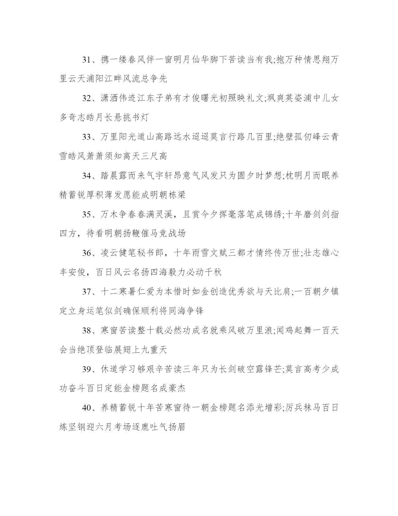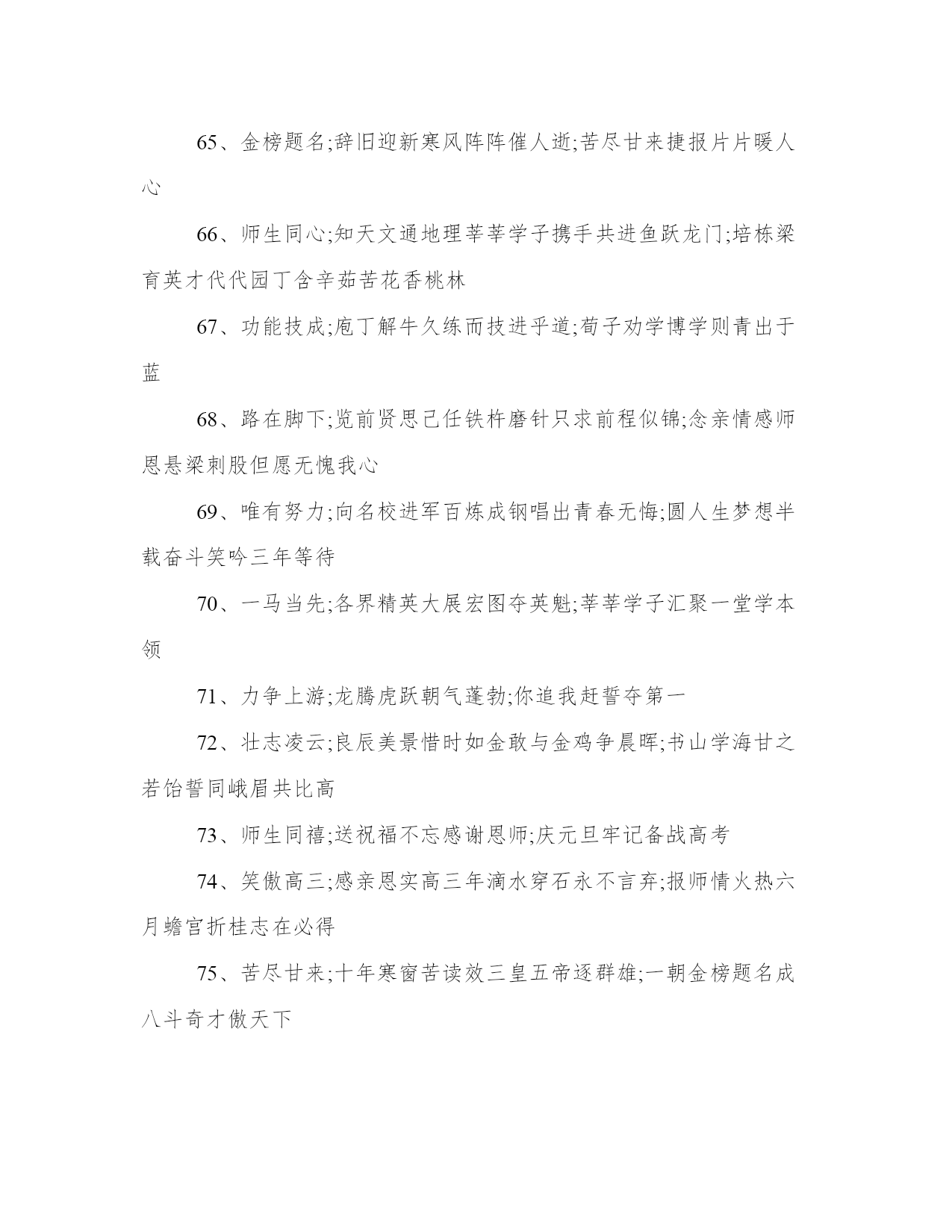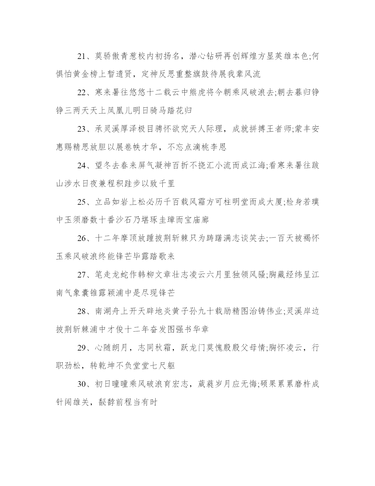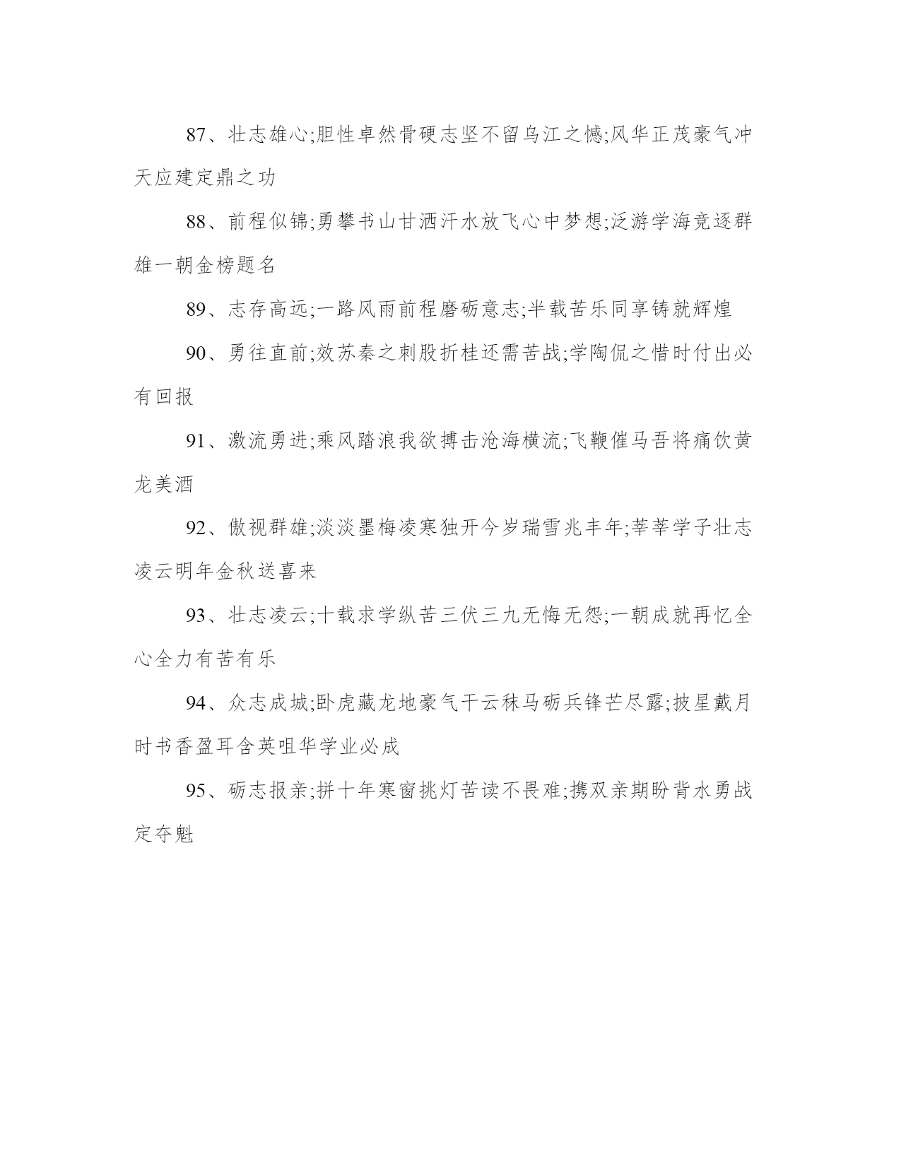 2017高考对联大全高考对联1、寒冬散尽喜迎元旦佳节;春意盎然更看男儿发愤2、花开花落腊梅傲雪盼新春;春去春来长风破浪迎高考3、辞旧迎新寒风阵阵催人逝;苦尽甘来捷报片片暖人心4、淡淡梅香傲雪凌寒携新岁祥瑞至;莘莘学子滴水穿石盼明朝捷报传5、十二年,读书万卷悬梁刺股终不悔;六十朝,花开满园腾蛟起凤尽开颜6、颓废者败自强者成寥廓霜天谁点江山;懒惰者去勤奋者来苍茫大地我主沉浮7、云深雾绕行难路三月往定是天朗日晶;山重水复寻正道百日过必然柳暗花明8、寒冬腊月傲骨白梅裁冰剪雪织锦绣前程;盛夏华年醉墨罗襟激文扬字书璀璨人生9、悬梁刺股五光十色欲九天揽月小试牛刀;秣马厉兵千难万险得万众瞩目独占鳌头10、披荆斩棘奋战题海熟知万源似成竹在胸;秣马厉兵统领书山细识千变如笔下有神11、今朝破釜沉舟鏖战考场定能再创母校辉煌;明日衣锦还乡笑傲群雄必将续写浦中传奇12、忆昨日寒窗萤火补苴罅漏悬梁刺股惜青春;望来年阳春白雪洗尽铅华披荆斩棘战高考13、劈波斩浪十二载寒窗苦读至今方有圆梦日;披星戴月六十日废寝忘食从此便无悔初时14、三年寒窗几多风雨几多汗水战鼓催人酬壮志;一朝临考无限憧憬无限希冀青春无悔写人生15、栉风沐雨,三度春秋扬帆远航,试问汝等何时笑傲江湖;秣马厉兵,八百学子整装待发,且看我辈今朝问鼎中原16、蕴日月精华乾坤正好,闻鸡起舞惜光阴怀壮志;抒英雄气概风月无边,天道酬勤开笑颜展宏图17、含辛茹苦十二年,众心成城斗志昂扬铸就浦中剑;焚膏继晷百余日,天道酬勤意气风发看遍长安花18、春雨润物杨柳轻飏,万博园中万木苏,且看谁持彩练当空舞;东风送暖桃李微绽,百炼桥上百日搏,但瞧我执长鞭策马奔19、莘莘学子挥斥方遒,十二年寒窗,潜水真龙冲云月;拳拳少年风华正茂,六十日苦战,浴火凤凰入九天20、黄沙百战金甲于身看我浦中学子卧薪尝胆誓破楼兰凯歌还;雄关千越长缨在手待吾江南才俊秣马厉兵必缚苍龙载誉归21、莫骄傲青葱校内初扬名,潜心钻研再创辉煌方显英雄本色;何惧怕黄金榜上暂遗贤,定神反思重整旗鼓待展我辈风流22、寒来暑往悠悠十二载云中熊虎将今朝乘风破浪去;朝去暮归铮铮三两天天上凤凰儿明日骑马踏花归23、承灵溪厚泽极目骋怀欲究天人际理,成就拼搏王者师;蒙丰安惠赐精思放胆以展卷帙才华,不忘点滴桃李恩24、望冬去春来屏气凝神百折不挠汇小流而成江海;看寒来暑往跋山涉水日夜兼程积跬步以致千里25、立品如岩上松必历千百载风霜方可柱明堂而成大厦;检身若璞中玉须磨数十番沙石乃堪琢圭璋而宝庙廊26、十二年摩顶放踵披荆斩棘只为踌躇满志谈笑去;一百天被褐怀玉乘风破浪终能锋芒毕露踏歌来27、笔走龙蛇作韩柳文章壮志凌云六月里独领风骚;胸藏经纬呈江南气象囊锥露颖浦中是尽现锋芒28、南湖舟上开天辟地炎黄子孙九十载励精图治铸伟业;灵溪岸边披荆斩棘浦中才俊十二年奋发图强书华章29、心随朗月,志同秋霜,跃龙门莫愧殷殷父母情;胸怀凌云,行职劲松,转乾坤不负堂堂七尺躯30、初日曈曈乘风破浪育宏志,葳蕤岁月应无悔;硕果累累磨杵成针闯雄关,馝馞前程当有时31、携一缕春风伴一窗明月仙华脚下苦读当有我;抱万种情思翔万里云天浦阳江畔风流总争先32、潇洒伟迹江东子弟有才俊曙光初照映礼文;飒爽英姿浦中儿女多奇志皓月长悬挑书灯33、万里阳光道山高路远水迢迢莫言行路几百里;绝壁孤仞峰云青雪皓风萧萧须知离天三尺高34、踏晨露而来气宇轩昂意气风发只为圆夕时梦想;枕明月而眠养精蓄锐厚积薄发愿能成明朝栋梁35、万木争春春满灵溪,且赏今夕挥毫落笔成锦绣;十年磨剑剑指四方,待看明朝扬鞭催马竞战场36、凌云健笔秘书郎,十年雨雪文赋三都才情终传万世;壮志雄心丰安俊,百日风云名扬四海毅力必动千秋37、十二寒暑仁爱为本惜时如金创造优秀欲与天比肩;一百朝夕镇定立身运笔似剑确保顺利将同海争锋38、寒窗苦读整十载必然功成名就乘风破万里浪;闻鸡起舞一百天会当绝顶登临展翅上九重天39、休道学习够艰辛苦读三年只为长剑破空露锋芒;莫言高考少成功奋斗百日定能金榜题名成豪杰40、养精蓄锐十年苦寒窗待一朝金榜题名添光增彩;厉兵秣马百日炼坚钢迎六月考场逐鹿吐气扬眉41、逆水溯流三千日,瀑中红鲤,盼今朝腾越龙门;含英咀华十八载,灯下学子,待明日独占鳌头42、古塔稳健学雄鹰搏击长空自强不息奋笔泼墨书壮志;攸水润坤看骄子崛起神州厚德载物披荆斩棘奏凯歌43、一马当先;各界精英大展宏图夺英魁;莘莘学子汇聚一堂学本领44、力争上游;龙腾虎跃朝气蓬勃;你追我赶誓夺第一45、壮志凌云;良辰美景惜时如金敢与金鸡争晨晖;书山学海甘之若饴誓同峨眉共比高46、师生同禧;送祝福不忘感谢恩师;庆元旦牢记备战高考47、笑傲高三;感亲恩实高三年滴水穿石永不言弃;报师情火热六月蟾宫折桂志在必得48