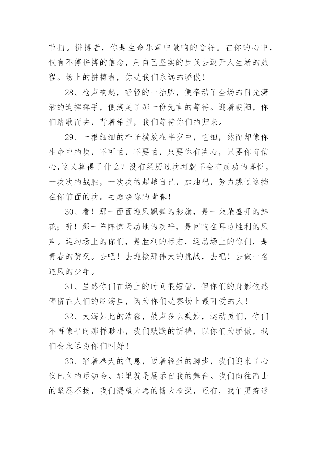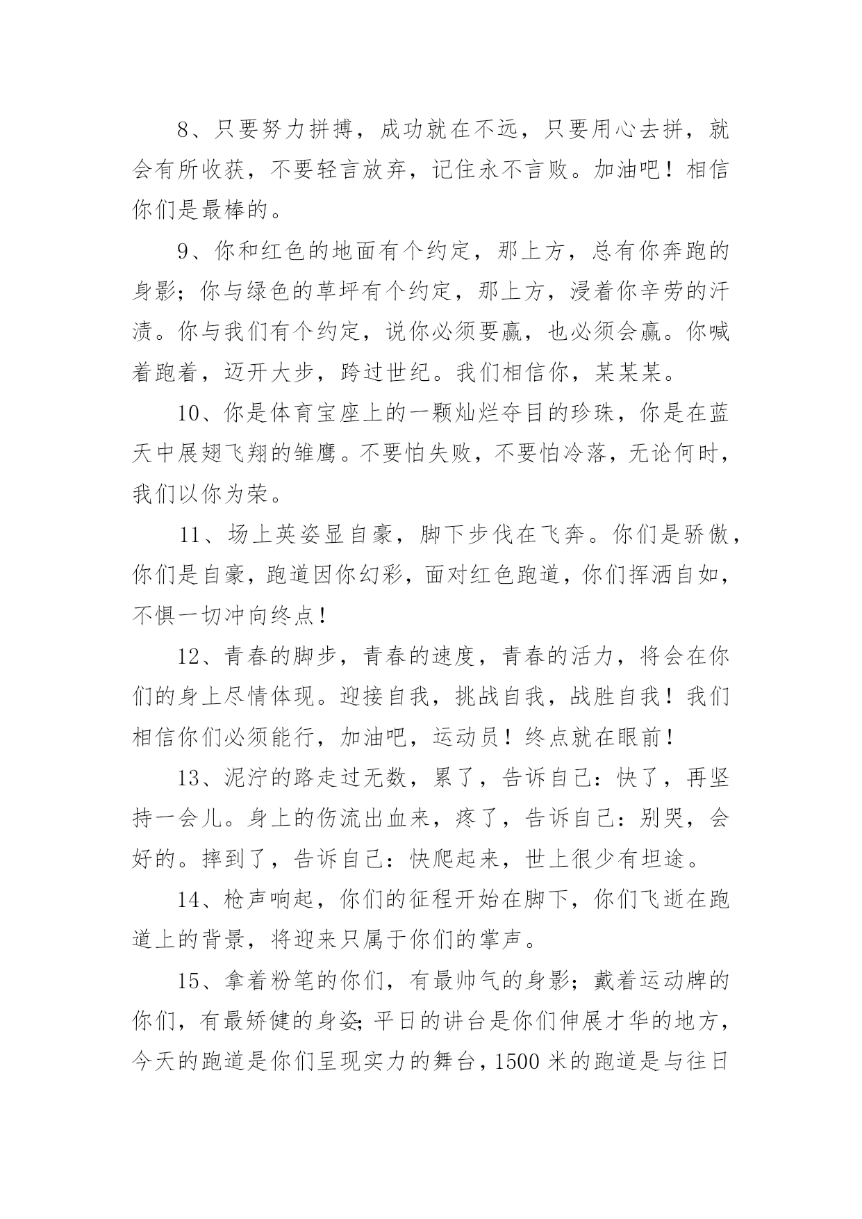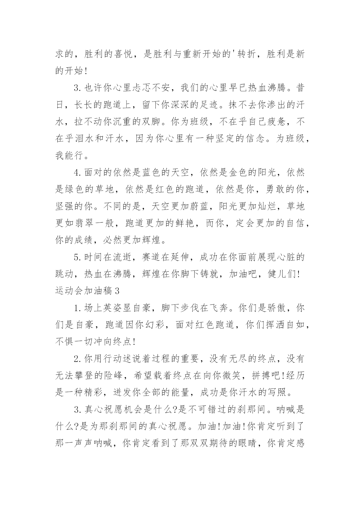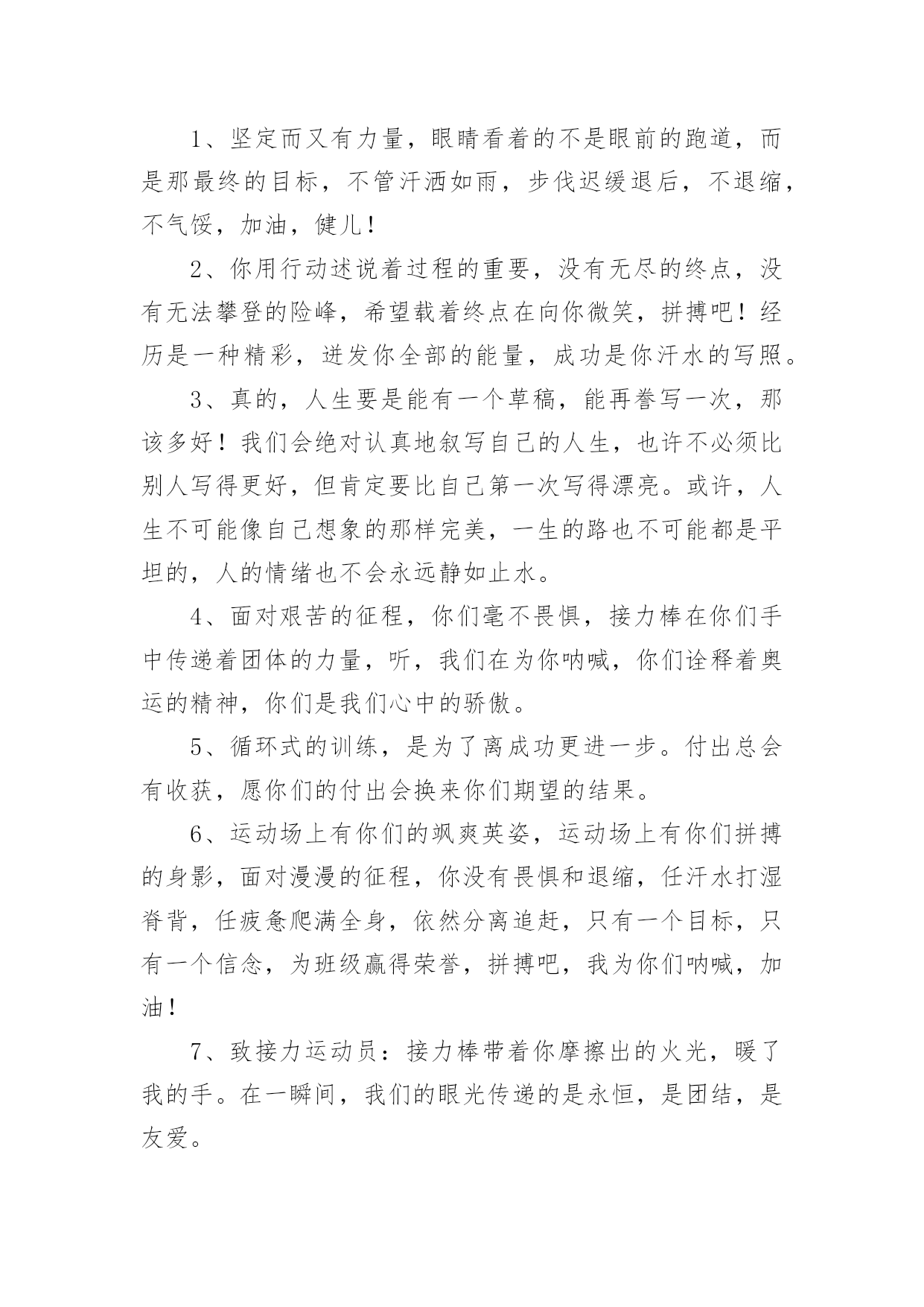 运动会加油稿(必备)运动会加油稿15篇在日常生活和工作中,很多情况下我们需要用到加油稿,加油稿可以激励对方更好地参加活动。怎么写加油稿才能避免踩雷呢?下面是小编为大家收集的运动会加油稿,仅供参考,希望能够帮助到大家。运动会加油稿1加油,加油,加油!希望你们能获得优异的结果,如何无论,我们都会支持你的.。看到你们努力的样子,我真得很感动。谢谢你们的坚持。我明白成功并不是每个运动员都能获得,看到赛后你们痛苦的表情,我真得很为难,不知应该鼓励你们还是安慰你们。成功的花终会绽放,不在此时便是彼时。运动会加油稿21.我们为你呐喊,力量给你信心给你,因为我们知道那一步步的前进十分勇敢。我们为你呐喊,虽然显得火热,但却希望你能加油。2.也许流星并不少见,但它燃烧的刹那,留给人间最美丽的回忆!也许笑脸并不少见,但胜利的喜悦,总会留给世界精彩的一瞬!是的,那些曾经美妙的东西只有短短的一瞬间,但那却把最辉煌的一刻留给人间。胜利,是每个人所追求的,胜利的喜悦,是胜利与重新开始的'转折,胜利是新的开始!3.也许你心里忐忑不安,我们的心里早已热血沸腾。昔日,长长的跑道上,留下你深深的足迹。抹不去你渗出的汗水,拉不动你沉重的双脚。你为班级,不在乎自己疲惫,不在乎泪水和汗水,因为你心里有一种坚定的信念。为班级,我能行。4.面对的依然是蓝色的天空,依然是金色的阳光,依然是绿色的草地,依然是红色的跑道,依然是你,勇敢的你,坚强的你。不同的是,天空更加蔚蓝,阳光更加灿烂,草地更如翡翠一般,跑道更加的鲜艳,而你,定会更加的自信,你的成绩,必然更加辉煌。5.时间在流逝,赛道在延伸,成功在你面前展现心脏的跳动,热血在沸腾,辉煌在你脚下铸就,加油吧,健儿们!运动会加油稿31.场上英姿显自豪,脚下步伐在飞奔。你们是骄傲,你们是自豪,跑道因你幻彩,面对红色跑道,你们挥洒自如,不惧一切冲向终点!2.你用行动述说着过程的重要,没有无尽的终点,没有无法攀登的险峰,希望载着终点在向你微笑,拼搏吧!经历是一种精彩,迸发你全部的能量,成功是你汗水的写照。3.真心祝愿机会是什么?是不可错过的刹那间。呐喊是什么?是为那刹那间的真心祝愿。加油!加油!你肯定听到了那一声声呐喊,你肯定看到了那双双期待的眼睛,你肯定感受到了那发自内心的祝愿!4.不为掌声的诠释,不为刻意的征服,只有辛勤的汗水化作追求的'脚步,心中坚定的信念,脚下沉稳的步伐,你用行动诉说着一个不变的真理,没有比脚更长的路,没有比人更高的山,希望在终点向你招手,努力吧!用你坚韧不拔的毅志,去迎接终点的鲜花与掌声,相信成功属于你。5.时间在流逝,赛道在延伸,成功在你面前展现心脏的跳动,热血在沸腾,辉煌在你脚下铸就。加油吧,健儿们!运动会加油稿4踏着激昂的乐点,你们展示自信的风采;迈着昂扬的步伐,你们彰显必胜的'气概绿茵场是你们的舞台,红跑道是你们的主场你们用意气风发的笑容向世界宣告胜利的归属,昔有男儿佩吴钩,关山夜取五十州,今有吾辈显身手,赛场驰骋拔头筹。运动会加油稿5期望是种子,就该有绿色的自信;期望是种子,就该有金色的梦想。不要躺在封闭的暖房,怕什么秋日薄薄的.风霜,既然已走上了运动场,心里就不要多想。跑道已洒满阳光,不要羞涩,不要紧张,听秋雁在空中为你歌唱,快去拾取片片金黄,充满信心,就有期望。力棒带着你摩擦出的火光,暖了我的手。在急讯中,我们眼光在煞那间传递的是永恒,是团结,是友爱,你的吼震撼了你我他,牵动着你我他的心弦,让我们共同演绎这扣人心弦的激情飞荡。让我们共同为集体,我们大家的心,供一份热,点一盏温馨暖人的灯,4×100迸发的是无穷的力量,温暖的是我们的家,演绎的是团结友爱。运动会加油稿61、坚定而又有力量,眼睛看着的不是眼前的跑道,而是那最终的目标,不管汗洒如雨,步伐迟缓退后,不退缩,不气馁,加油,健儿!2、你用行动述说着过程的重要,没有无尽的终点,没有无法攀登的险峰,希望载着终点在向你微笑,拼搏吧!经历是一种精彩,迸发你全部的能量,成功是你汗水的写照。3、真的,人生要是能有一个草稿,能再誊写一次,那该多好!我们会绝对认真地叙写自己的人生,也许不必须比别人写得更好,但肯定要比自己第一次写得漂亮。或许,人生不可能像自己想象的那样完美,一生的路也不可能都是平坦的,人的情绪也不会永远静如止水。4、面对艰苦的征程,你们毫不畏惧,接力棒在你们手中传递着团体的力量,听,我们在为你呐喊,你们诠释着奥运的精神,你们是我们心中的骄傲。5、循环式的训练,是为了离成功更进一步。付出总会有收获,愿你们的付出会换来你们期望的结果。6、运动场上有你们的飒爽英姿,运动场上有你们拼搏的身影,面对漫漫的征程,你没有畏惧和退缩,任汗水打湿脊背,任疲惫爬满全身,依然分离追赶,只有一个目标,只有一个信念,为班级赢得荣誉,拼搏吧,我为你们呐喊,加油!7、致