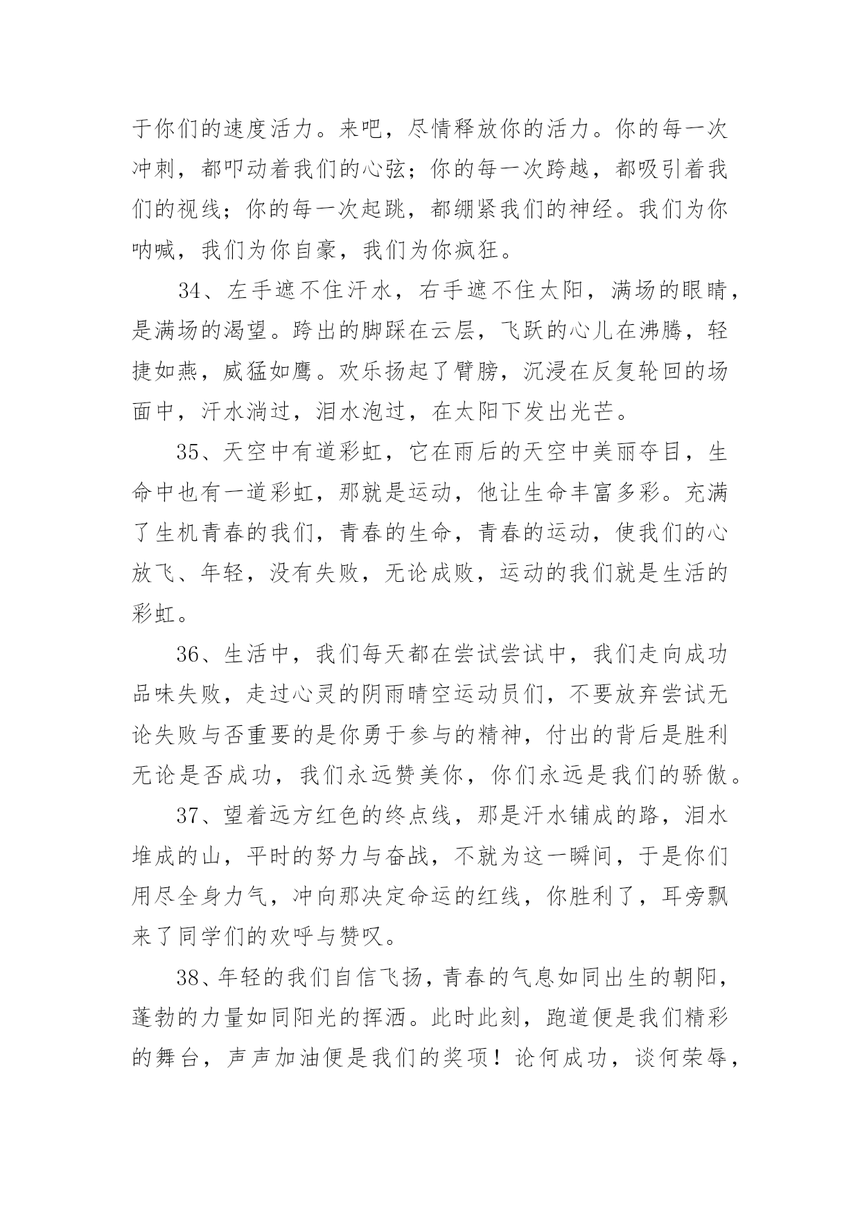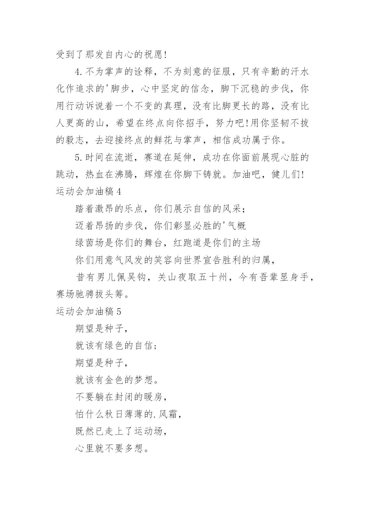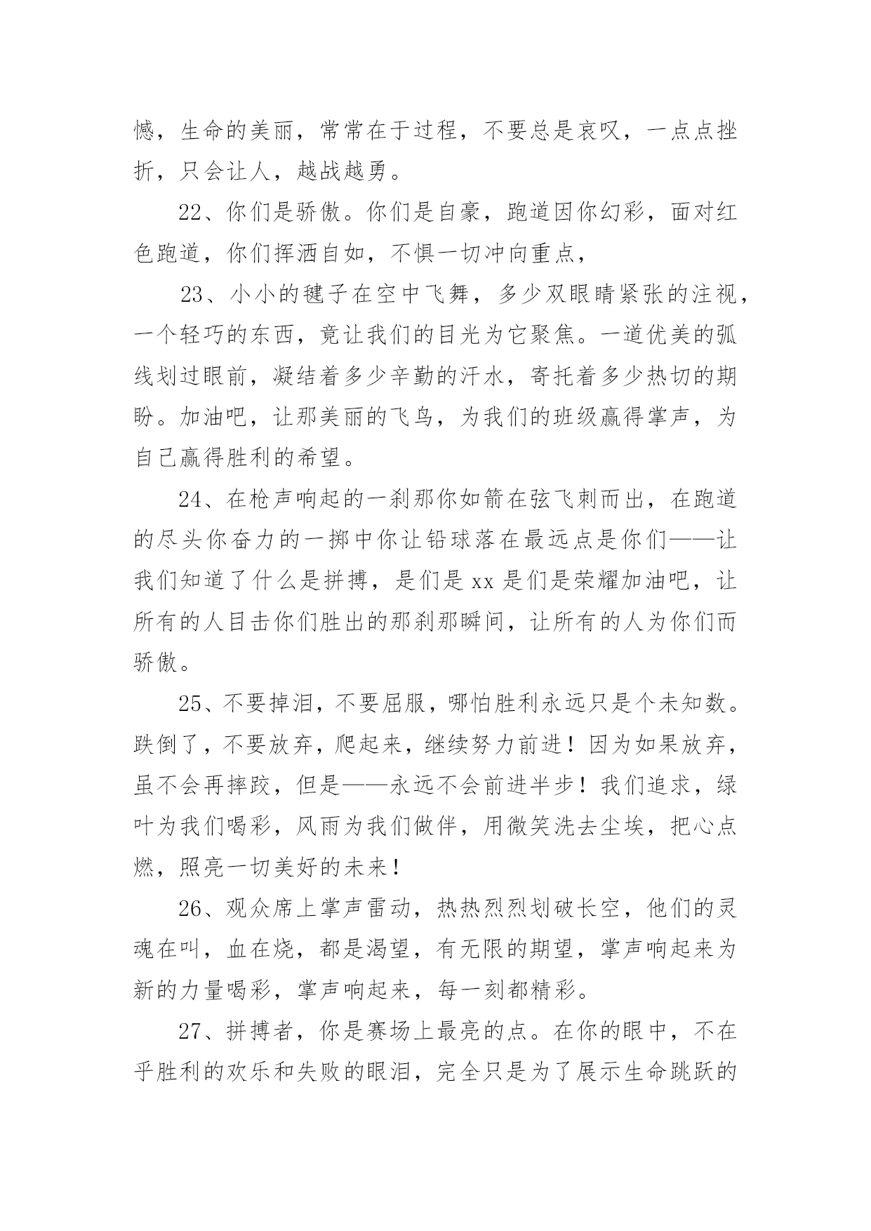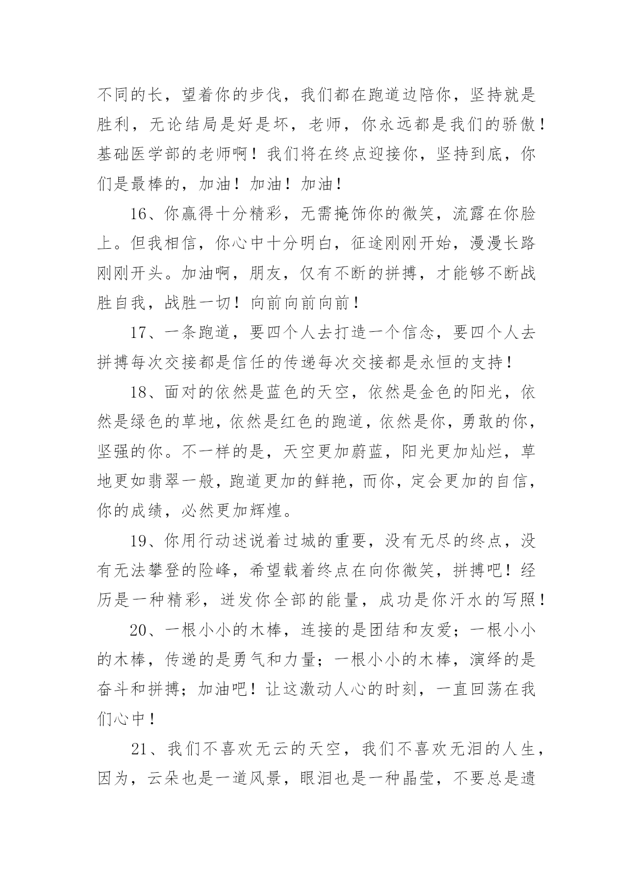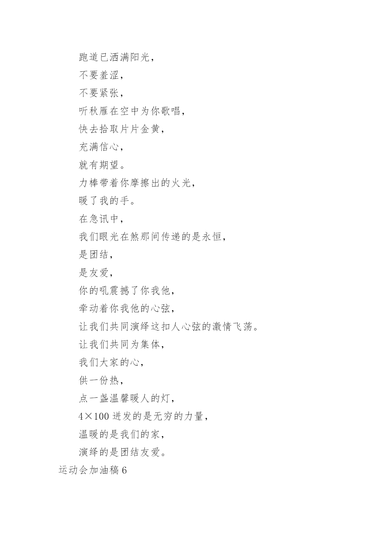 运动会加油稿(必备)运动会加油稿15篇在日常生活和工作中,很多情况下我们需要用到加油稿,加油稿可以激励对方更好地参加活动。怎么写加油稿才能避免踩雷呢?下面是小编为大家收集的运动会加油稿,仅供参考,希望能够帮助到大家。运动会加油稿1加油,加油,加油!希望你们能获得优异的结果,如何无论,我们都会支持你的.。看到你们努力的样子,我真得很感动。谢谢你们的坚持。我明白成功并不是每个运动员都能获得,看到赛后你们痛苦的表情,我真得很为难,不知应该鼓励你们还是安慰你们。成功的花终会绽放,不在此时便是彼时。运动会加油稿21.我们为你呐喊,力量给你信心给你,因为我们知道那一步步的前进十分勇敢。我们为你呐喊,虽然显得火热,但却希望你能加油。2.也许流星并不少见,但它燃烧的刹那,留给人间最美丽的回忆!也许笑脸并不少见,但胜利的喜悦,总会留给世界精彩的一瞬!是的,那些曾经美妙的东西只有短短的一瞬间,但那却把最辉煌的一刻留给人间。胜利,是每个人所追求的,胜利的喜悦,是胜利与重新开始的'转折,胜利是新的开始!3.也许你心里忐忑不安,我们的心里早已热血沸腾。昔日,长长的跑道上,留下你深深的足迹。抹不去你渗出的汗水,拉不动你沉重的双脚。你为班级,不在乎自己疲惫,不在乎泪水和汗水,因为你心里有一种坚定的信念。为班级,我能行。4.面对的依然是蓝色的天空,依然是金色的阳光,依然是绿色的草地,依然是红色的跑道,依然是你,勇敢的你,坚强的你。不同的是,天空更加蔚蓝,阳光更加灿烂,草地更如翡翠一般,跑道更加的鲜艳,而你,定会更加的自信,你的成绩,必然更加辉煌。5.时间在流逝,赛道在延伸,成功在你面前展现心脏的跳动,热血在沸腾,辉煌在你脚下铸就,加油吧,健儿们!运动会加油稿31.场上英姿显自豪,脚下步伐在飞奔。你们是骄傲,你们是自豪,跑道因你幻彩,面对红色跑道,你们挥洒自如,不惧一切冲向终点!2.你用行动述说着过程的重要,没有无尽的终点,没有无法攀登的险峰,希望载着终点在向你微笑,拼搏吧!经历是一种精彩,迸发你全部的能量,成功是你汗水的写照。3.真心祝愿机会是什么?是不可错过的刹那间。呐喊是什么?是为那刹那间的真心祝愿。加油!加油!你肯定听到了那一声声呐喊,你肯定看到了那双双期待的眼睛,你肯定感受到了那发自内心的祝愿!4.不为掌声的诠释,不为刻意的征服,只有辛勤的汗水化作追求的'脚步,心中坚定的信念,脚下沉稳的步伐,你用行动诉说着一个不变的真理,没有比脚更长的路,没有比人更高的山,希望在终点向你招手,努力吧!用你坚韧不拔的毅志,去迎接终点的鲜花与掌声,相信成功属于你。5.时间在流逝,赛道在延伸,成功在你面前展现心脏的跳动,热血在沸腾,辉煌在你脚下铸就。加油吧,健儿们!运动会加油稿4踏着激昂的乐点,你们展示自信的风采;迈着昂扬的步伐,你们彰显必胜的'气概绿茵场是你们的舞台,红跑道是你们的主场你们用意气风发的笑容向世界宣告胜利的归属,昔有男儿佩吴钩,关山夜取五十州,今有吾辈显身手,赛场驰骋拔头筹。运动会加油稿5期望是种子,就该有绿色的自信;期望是种子,就该有金色的梦想。不要躺在封闭的暖房,怕什么秋日薄薄的.风霜,既然已走上了运动场,心里就不要多想。跑道已洒满阳光,不要羞涩,不要紧张,听秋雁在空中为你歌唱,快去拾取片片金黄,充满信心,就有期望。力棒带着你摩擦出的火光,暖了我的手。在急讯中,我们眼光在煞那间传递的是永恒,是团结,是友爱,你的吼震撼了你我他,牵动着你我他的心弦,让我们共同演绎这扣人心弦的激情飞荡。让我们共同为集体,我们大家的心,供一份热,点一盏温馨暖人的灯,4×100迸发的是无穷的力量,温暖的是我们的家,演绎的是团结友爱。运动会加油稿61、坚定而又有力量,眼睛看着的不是眼前的跑道,而是那最终的目标,不管汗洒如雨,步伐迟缓退后,不退缩,不气馁,加油,健儿!2、你用行动述说着过程的重要,没有无尽的终点,没有无法攀登的险峰,希望载着终点在向你微笑,拼搏吧!经历是一种精彩,迸发你全部的能量,成功是你汗水的写照。3、真的,人生要是能有一个草稿,能再誊写一次,那该多好!我们会绝对认真地叙写自己的人生,也许不必须比别人写得更好,但肯定要比自己第一次写得漂亮。或许,人生不可能像自己想象的那样完美,一生的路也不可能都是平坦的,人的情绪也不会永远静如止水。4、面对艰苦的征程,你们毫不畏惧,接力棒在你们手中传递着团体的力量,听,我们在为你呐喊,你们诠释着奥运的精神,你们是我们心中的骄傲。5、循环式的训练,是为了离成功更进一步。付出总会有收获,愿你们的付出会换来你们期望的结果。6、运动场上有你们的飒爽英姿,运动场上有你们拼搏的身影,面对漫漫的征程,你没有畏惧和退缩,任汗水打湿脊背,任疲惫爬满全身,依然分离追赶,只有一个目标,只有一个信念,为班级赢得荣誉,拼搏吧,我为你们呐喊,加油!7、致