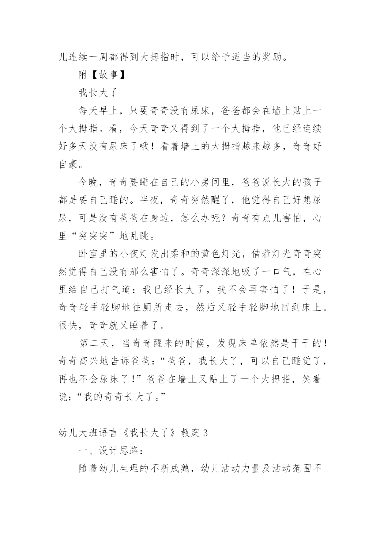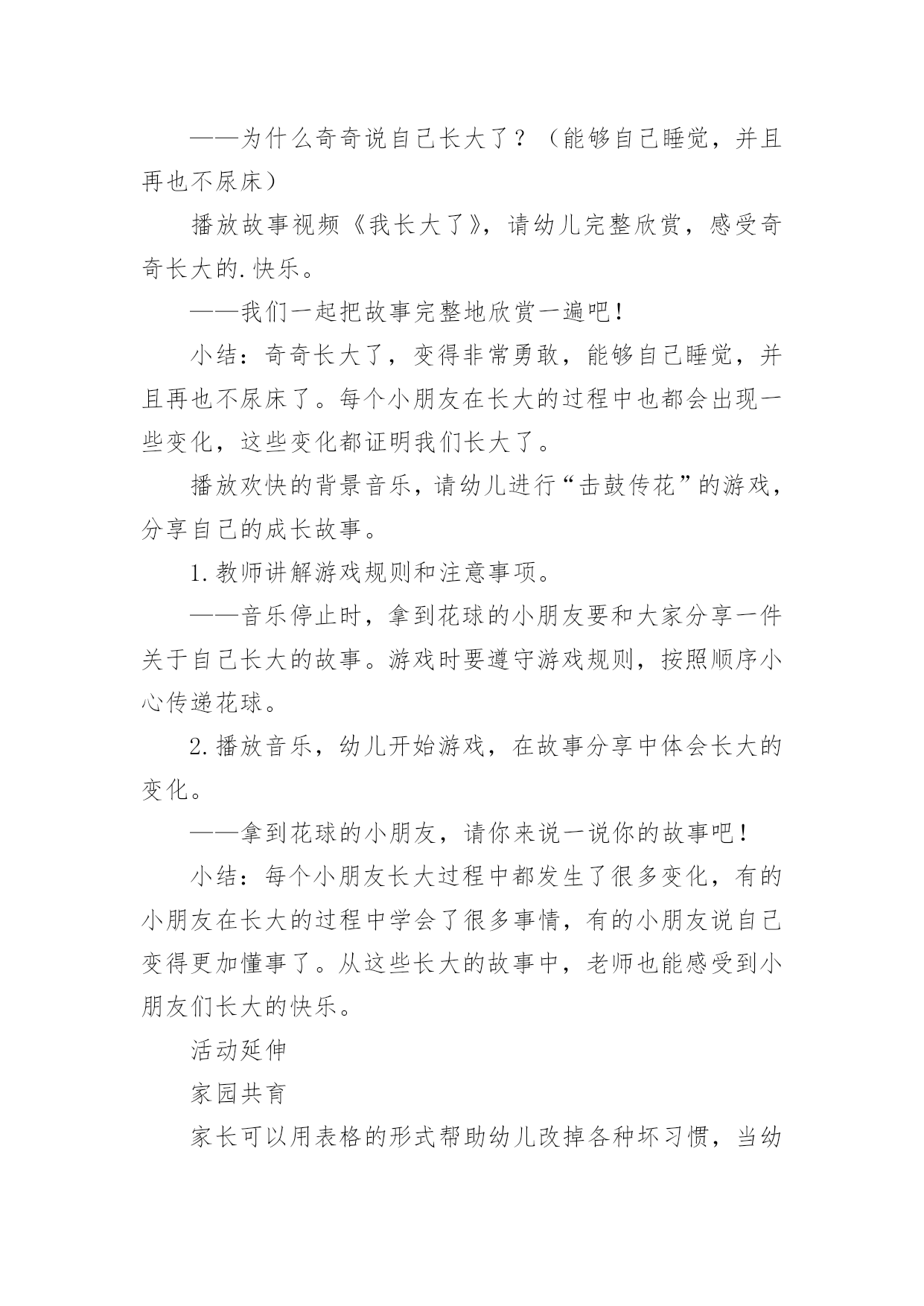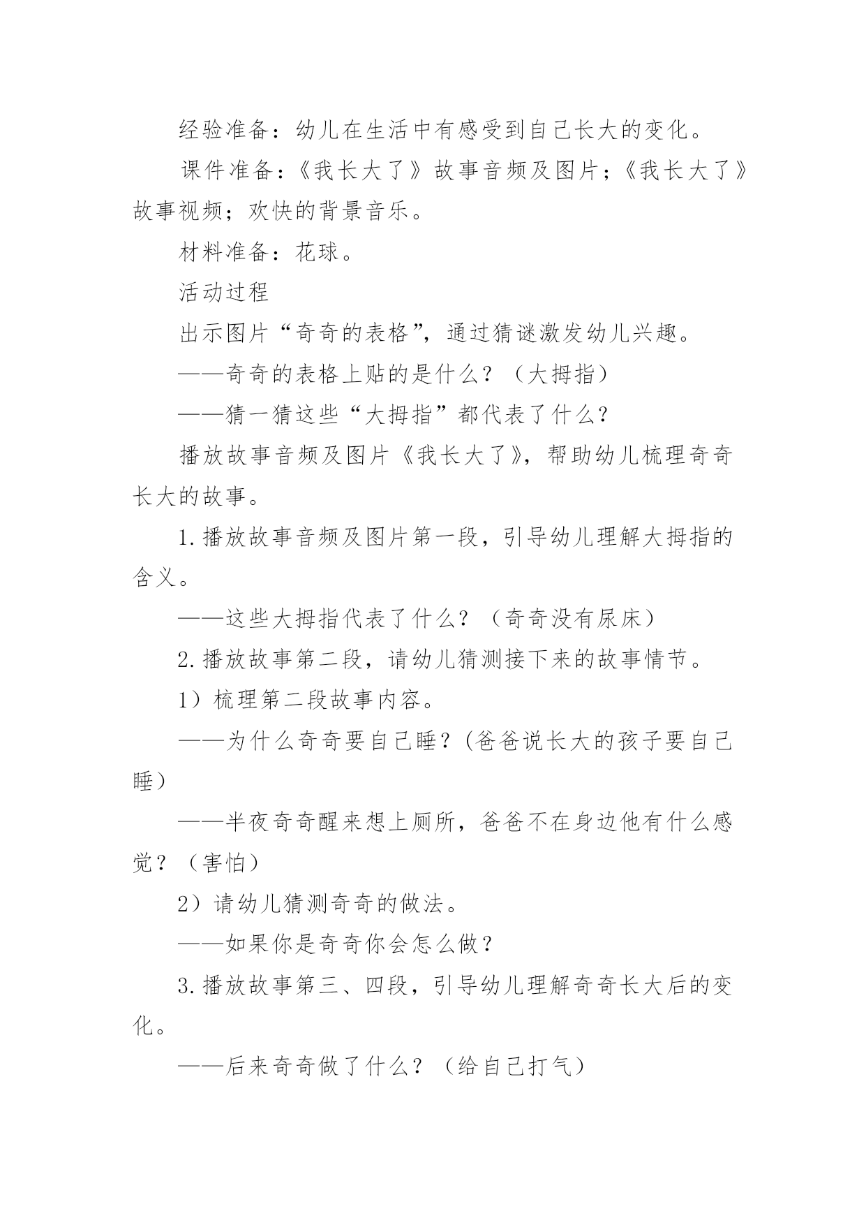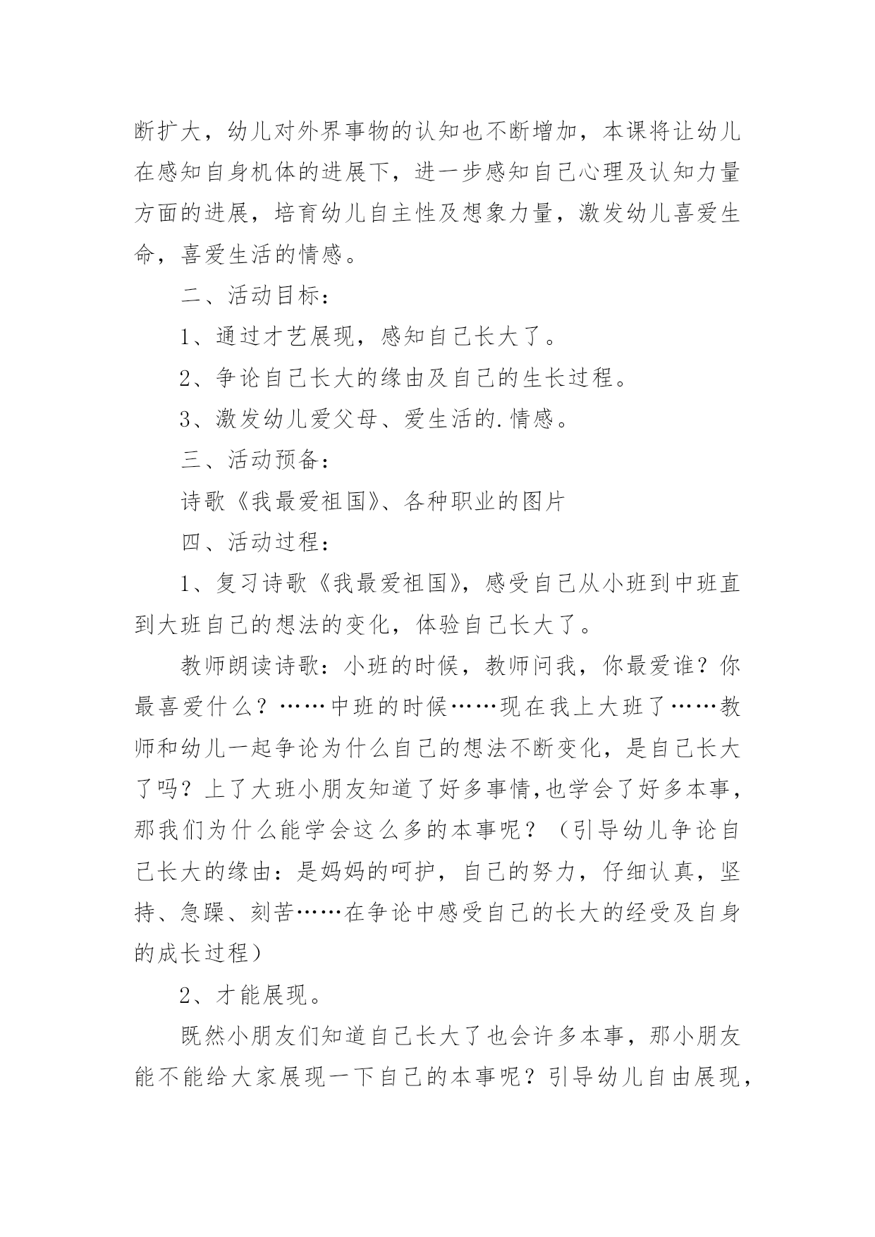 幼儿大班语言《我长大了》教案作为一名专为他人授业解惑的人民教师,可能需要进行教案编写工作,教案是教学活动的总的组织纲领和行动方案。优秀的教案都具备一些什么特点呢?以下是小编为大家整理的幼儿大班语言《我长大了》教案,欢迎阅读与收藏。幼儿大班语言《我长大了》教案1【活动目标】1、通过活动,知道自己长大了的意义。2、有初步的自信念,能够浓度大胆发言。3、情愿通过多种形式呈现自己。【活动预备】1、学问预备,知道自己的年龄,知道自己又长大了一岁了。2、物质预备:上一届大班幼儿的活动照片、录像、作品等,邀请已经毕业的幼儿三到四名。【根本教程】(一)导入活动请幼儿做自我介绍(介绍自己的名字和年龄)导入活动。(二)关键步骤1、教师请幼儿说出,现在和以前相比的变化是什么。2、鼓舞幼儿对邀请来的小朋友提出感兴趣的'问题。3、看上届大班小朋友的照片,录像。4、请已经毕业的幼儿为大家讲一讲自己以前的故事,并说说自己的变化,请幼儿随便提问。5、教师小结:鼓励幼儿也像他们一样自信,英勇。(三)完毕活动嬉戏:自我介绍。在户外,第一名幼儿快速跑到大家对面的最远处,大声说出自己的名字、“我是最棒的”、还可以说出一句想说的话或做一个喜爱的动作;跑回来拍下一名幼儿的手,嬉戏连续。【活动延长】1、区域活动自我展现区:幼儿可带来自己在家的保藏、制作、绘画等作品或幼儿在做有特色活动时的照片等。本区为幼儿搭建共性展现平台,帮忙幼儿增加自信,从而更加英勇、自信地面对每天新生活。2、其它活动家长应支持孩子做有益的事,赐予幼儿乐观的、确定的、宽松的空间。对于幼儿的提问,准时赐予乐观的答复和引导,从而使幼儿情愿,并敢于尝试和质疑未知的新事物。幼儿大班语言《我长大了》教案2活动目标理解故事情节,体会长大的快乐。乐于参加游戏,能讲述自己长大的故事。活动准备经验准备:幼儿在生活中有感受到自己长大的变化。课件准备:《我长大了》故事音频及图片;《我长大了》故事视频;欢快的背景音乐。材料准备:花球。活动过程出示图片“奇奇的表格”,通过猜谜激发幼儿兴趣。——奇奇的表格上贴的是什么?(大拇指)——猜一猜这些“大拇指”都代表了什么?播放故事音频及图片《我长大了》,帮助幼儿梳理奇奇长大的故事。1.播放故事音频及图片第一段,引导幼儿理解大拇指的含义。——这些大拇指代表了什么?(奇奇没有尿床)2.播放故事第二段,请幼儿猜测接下来的故事情节。1)梳理第二段故事内容。——为什么奇奇要自己睡?(爸爸说长大的孩子要自己睡)——半夜奇奇醒来想上厕所,爸爸不在身边他有什么感觉?(害怕)2)请幼儿猜测奇奇的做法。——如果你是奇奇你会怎么做?3.播放故事第三、四段,引导幼儿理解奇奇长大后的变化。——后来奇奇做了什么?(给自己打气)——为什么奇奇说自己长大了?(能够自己睡觉,并且再也不尿床)播放故事视频《我长大了》,请幼儿完整欣赏,感受奇奇长大的.快乐。——我们一起把故事完整地欣赏一遍吧!小结:奇奇长大了,变得非常勇敢,能够自己睡觉,并且再也不尿床了。每个小朋友在长大的过程中也都会出现一些变化,这些变化都证明我们长大了。播放欢快的背景音乐,请幼儿进行“击鼓传花”的游戏,分享自己的成长故事。1.教师讲解游戏规则和注意事项。——音乐停止时,拿到花球的小朋友要和大家分享一件关于自己长大的故事。游戏时要遵守游戏规则,按照顺序小心传递花球。2.播放音乐,幼儿开始游戏,在故事分享中体会长大的变化。——拿到花球的小朋友,请你来说一说你的故事吧!小结:每个小朋友长大过程中都发生了很多变化,有的小朋友在长大的过程中学会了很多事情,有的小朋友说自己变得更加懂事了。从这些长大的故事中,老师也能感受到小朋友们长大的快乐。活动延伸家园共育家长可以用表格的形式帮助幼儿改掉各种坏习惯,当幼儿连续一周都得到大拇指时,可以给予适当的奖励。附【故事】我长大了每天早上,只要奇奇没有尿床,爸爸都会在墙上贴上一个大拇指。看,今天奇奇又得到了一个大拇指,他已经连续好多天没有尿床了哦!看着墙上的大拇指越来越多,奇奇好自豪。今晚,奇奇要睡在自己的小房间里,爸爸说长大的孩子都是要自己睡的。半夜,奇奇突然醒了,他觉得自己好想尿尿,可是没有爸爸在身边,怎么办呢?奇奇有点儿害怕,心里“突突突”地乱跳。卧室里的小夜灯发出柔和的黄色灯光,借着灯光奇奇突然觉得自己没有那么害怕了。奇奇深深地吸了一口气,在心里给自己打气道:我已经长大了,我不会再害怕了!于是,奇奇轻手轻脚地往厕所走去,然后又轻手轻脚地回到床上。很快,奇奇就又睡着了。第二天,当奇奇醒来的时候,发现床单依然是干干的!奇奇高兴地告诉爸爸:“爸爸,我长大了,可以自己睡觉了,再也不会尿床了!”爸爸在墙上又贴上了一个大拇指,笑着说:“我的奇奇长大了。”幼儿大班语言《我长大了》教案3一、设计思路:随着幼儿生理的不断成熟,幼儿活动