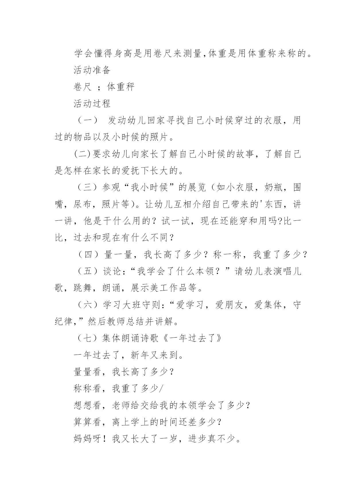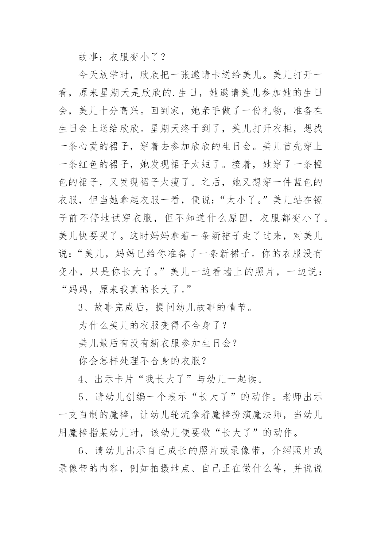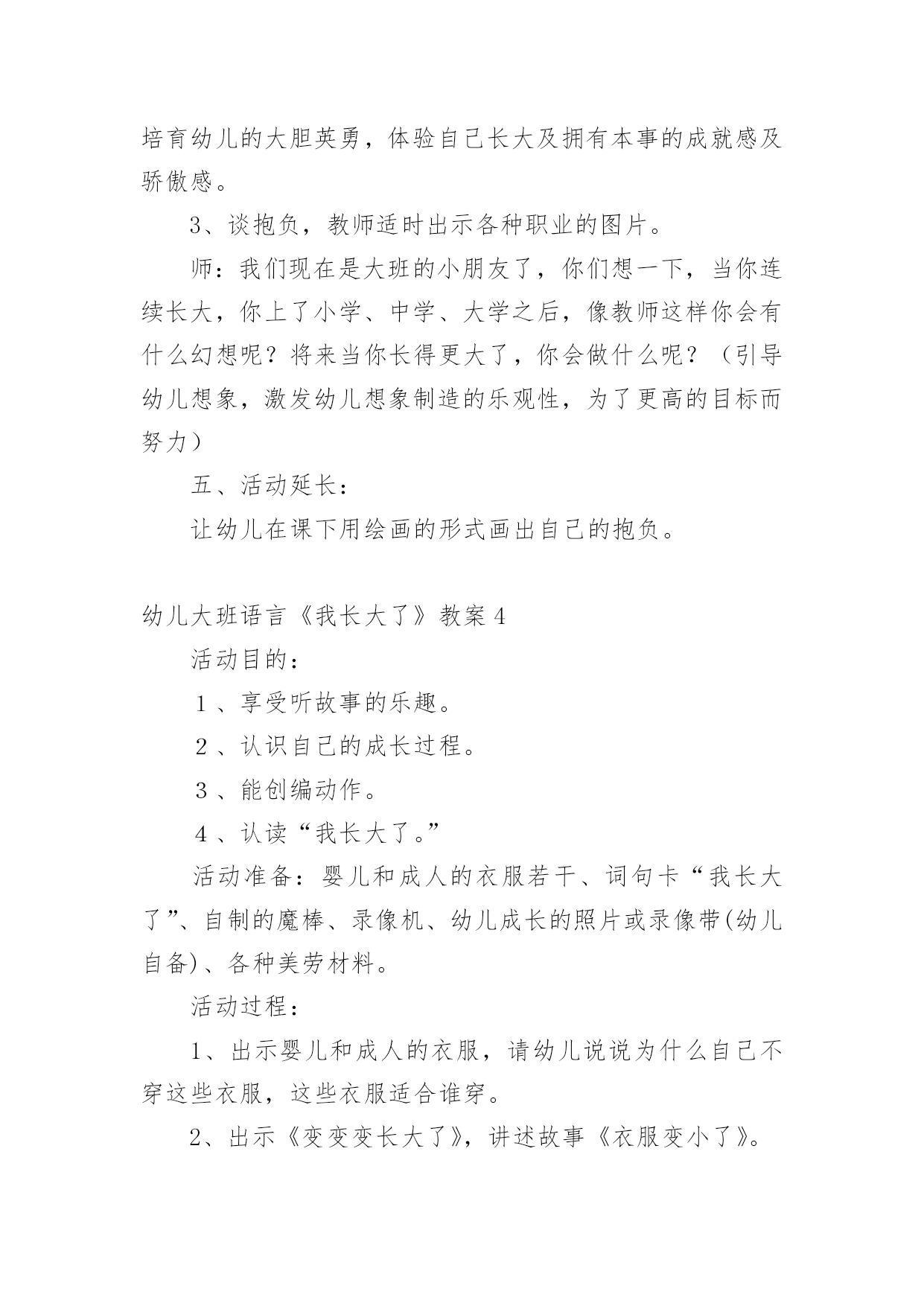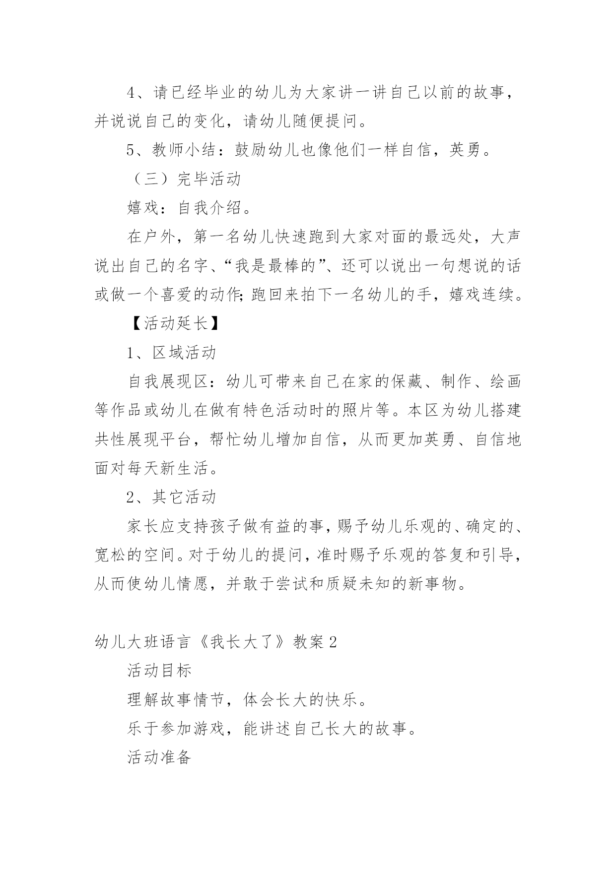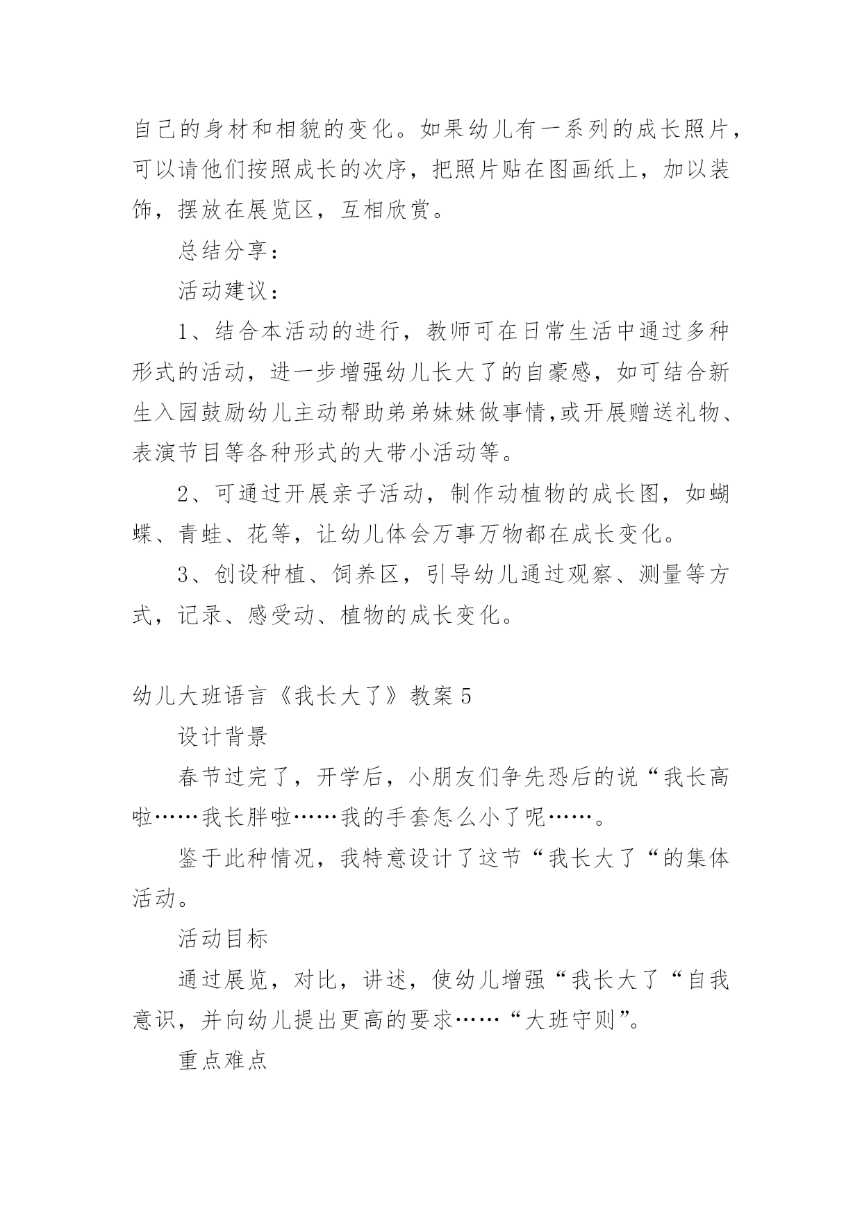 幼儿大班语言《我长大了》教案作为一名专为他人授业解惑的人民教师,可能需要进行教案编写工作,教案是教学活动的总的组织纲领和行动方案。优秀的教案都具备一些什么特点呢?以下是小编为大家整理的幼儿大班语言《我长大了》教案,欢迎阅读与收藏。幼儿大班语言《我长大了》教案1【活动目标】1、通过活动,知道自己长大了的意义。2、有初步的自信念,能够浓度大胆发言。3、情愿通过多种形式呈现自己。【活动预备】1、学问预备,知道自己的年龄,知道自己又长大了一岁了。2、物质预备:上一届大班幼儿的活动照片、录像、作品等,邀请已经毕业的幼儿三到四名。【根本教程】(一)导入活动请幼儿做自我介绍(介绍自己的名字和年龄)导入活动。(二)关键步骤1、教师请幼儿说出,现在和以前相比的变化是什么。2、鼓舞幼儿对邀请来的小朋友提出感兴趣的'问题。3、看上届大班小朋友的照片,录像。4、请已经毕业的幼儿为大家讲一讲自己以前的故事,并说说自己的变化,请幼儿随便提问。5、教师小结:鼓励幼儿也像他们一样自信,英勇。(三)完毕活动嬉戏:自我介绍。在户外,第一名幼儿快速跑到大家对面的最远处,大声说出自己的名字、“我是最棒的”、还可以说出一句想说的话或做一个喜爱的动作;跑回来拍下一名幼儿的手,嬉戏连续。【活动延长】1、区域活动自我展现区:幼儿可带来自己在家的保藏、制作、绘画等作品或幼儿在做有特色活动时的照片等。本区为幼儿搭建共性展现平台,帮忙幼儿增加自信,从而更加英勇、自信地面对每天新生活。2、其它活动家长应支持孩子做有益的事,赐予幼儿乐观的、确定的、宽松的空间。对于幼儿的提问,准时赐予乐观的答复和引导,从而使幼儿情愿,并敢于尝试和质疑未知的新事物。幼儿大班语言《我长大了》教案2活动目标理解故事情节,体会长大的快乐。乐于参加游戏,能讲述自己长大的故事。活动准备经验准备:幼儿在生活中有感受到自己长大的变化。课件准备:《我长大了》故事音频及图片;《我长大了》故事视频;欢快的背景音乐。材料准备:花球。活动过程出示图片“奇奇的表格”,通过猜谜激发幼儿兴趣。——奇奇的表格上贴的是什么?(大拇指)——猜一猜这些“大拇指”都代表了什么?播放故事音频及图片《我长大了》,帮助幼儿梳理奇奇长大的故事。1.播放故事音频及图片第一段,引导幼儿理解大拇指的含义。——这些大拇指代表了什么?(奇奇没有尿床)2.播放故事第二段,请幼儿猜测接下来的故事情节。1)梳理第二段故事内容。——为什么奇奇要自己睡?(爸爸说长大的孩子要自己睡)——半夜奇奇醒来想上厕所,爸爸不在身边他有什么感觉?(害怕)2)请幼儿猜测奇奇的做法。——如果你是奇奇你会怎么做?3.播放故事第三、四段,引导幼儿理解奇奇长大后的变化。——后来奇奇做了什么?(给自己打气)——为什么奇奇说自己长大了?(能够自己睡觉,并且再也不尿床)播放故事视频《我长大了》,请幼儿完整欣赏,感受奇奇长大的.快乐。——我们一起把故事完整地欣赏一遍吧!小结:奇奇长大了,变得非常勇敢,能够自己睡觉,并且再也不尿床了。每个小朋友在长大的过程中也都会出现一些变化,这些变化都证明我们长大了。播放欢快的背景音乐,请幼儿进行“击鼓传花”的游戏,分享自己的成长故事。1.教师讲解游戏规则和注意事项。——音乐停止时,拿到花球的小朋友要和大家分享一件关于自己长大的故事。游戏时要遵守游戏规则,按照顺序小心传递花球。2.播放音乐,幼儿开始游戏,在故事分享中体会长大的变化。——拿到花球的小朋友,请你来说一说你的故事吧!小结:每个小朋友长大过程中都发生了很多变化,有的小朋友在长大的过程中学会了很多事情,有的小朋友说自己变得更加懂事了。从这些长大的故事中,老师也能感受到小朋友们长大的快乐。活动延伸家园共育家长可以用表格的形式帮助幼儿改掉各种坏习惯,当幼儿连续一周都得到大拇指时,可以给予适当的奖励。附【故事】我长大了每天早上,只要奇奇没有尿床,爸爸都会在墙上贴上一个大拇指。看,今天奇奇又得到了一个大拇指,他已经连续好多天没有尿床了哦!看着墙上的大拇指越来越多,奇奇好自豪。今晚,奇奇要睡在自己的小房间里,爸爸说长大的孩子都是要自己睡的。半夜,奇奇突然醒了,他觉得自己好想尿尿,可是没有爸爸在身边,怎么办呢?奇奇有点儿害怕,心里“突突突”地乱跳。卧室里的小夜灯发出柔和的黄色灯光,借着灯光奇奇突然觉得自己没有那么害怕了。奇奇深深地吸了一口气,在心里给自己打气道:我已经长大了,我不会再害怕了!于是,奇奇轻手轻脚地往厕所走去,然后又轻手轻脚地回到床上。很快,奇奇就又睡着了。第二天,当奇奇醒来的时候,发现床单依然是干干的!奇奇高兴地告诉爸爸:“爸爸,我长大了,可以自己睡觉了,再也不会尿床了!”爸爸在墙上又贴上了一个大拇指,笑着说:“我的奇奇长大了。”幼儿大班语言《我长大了》教案3一、设计思路:随着幼儿生理的不断成熟,幼儿活动