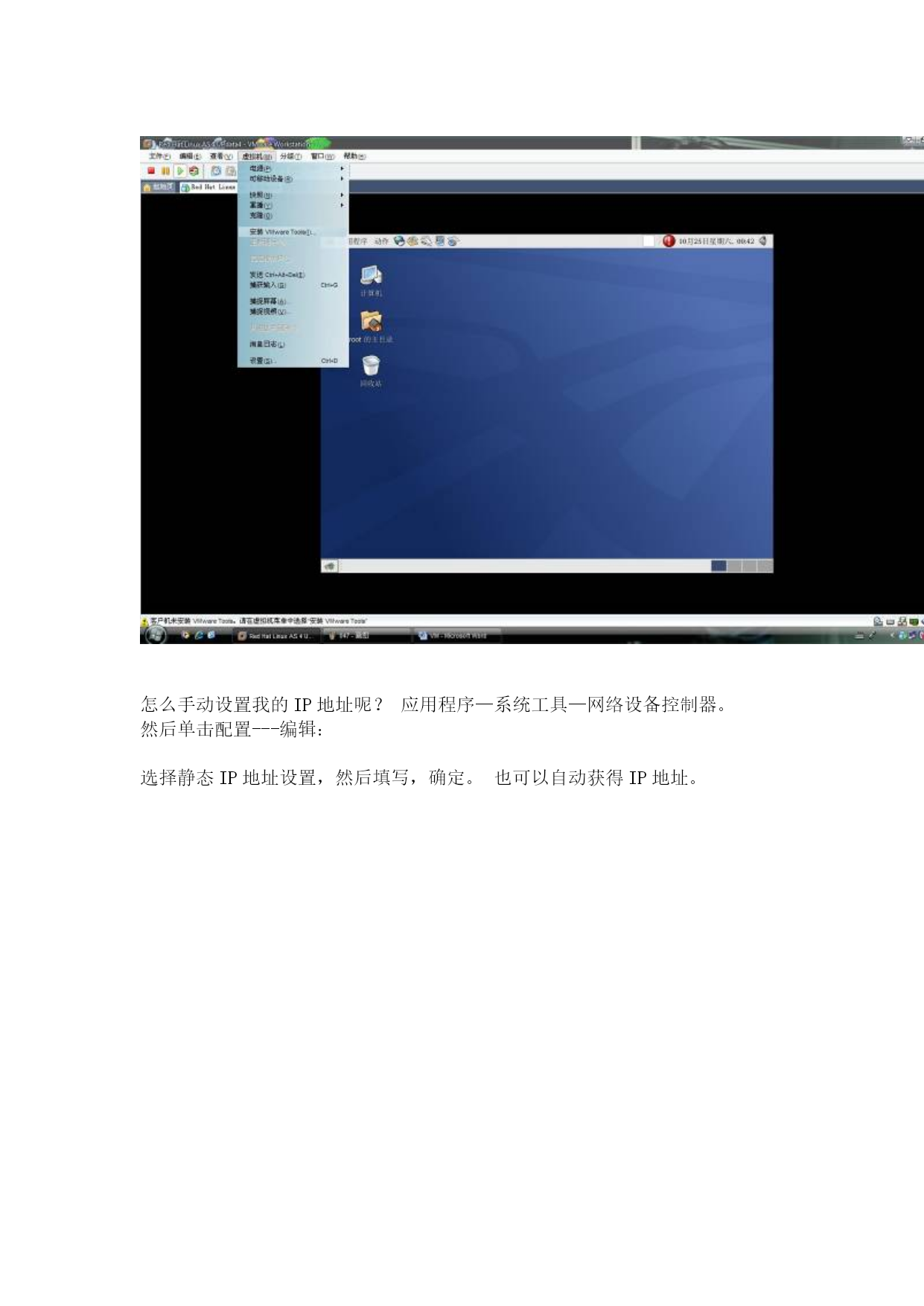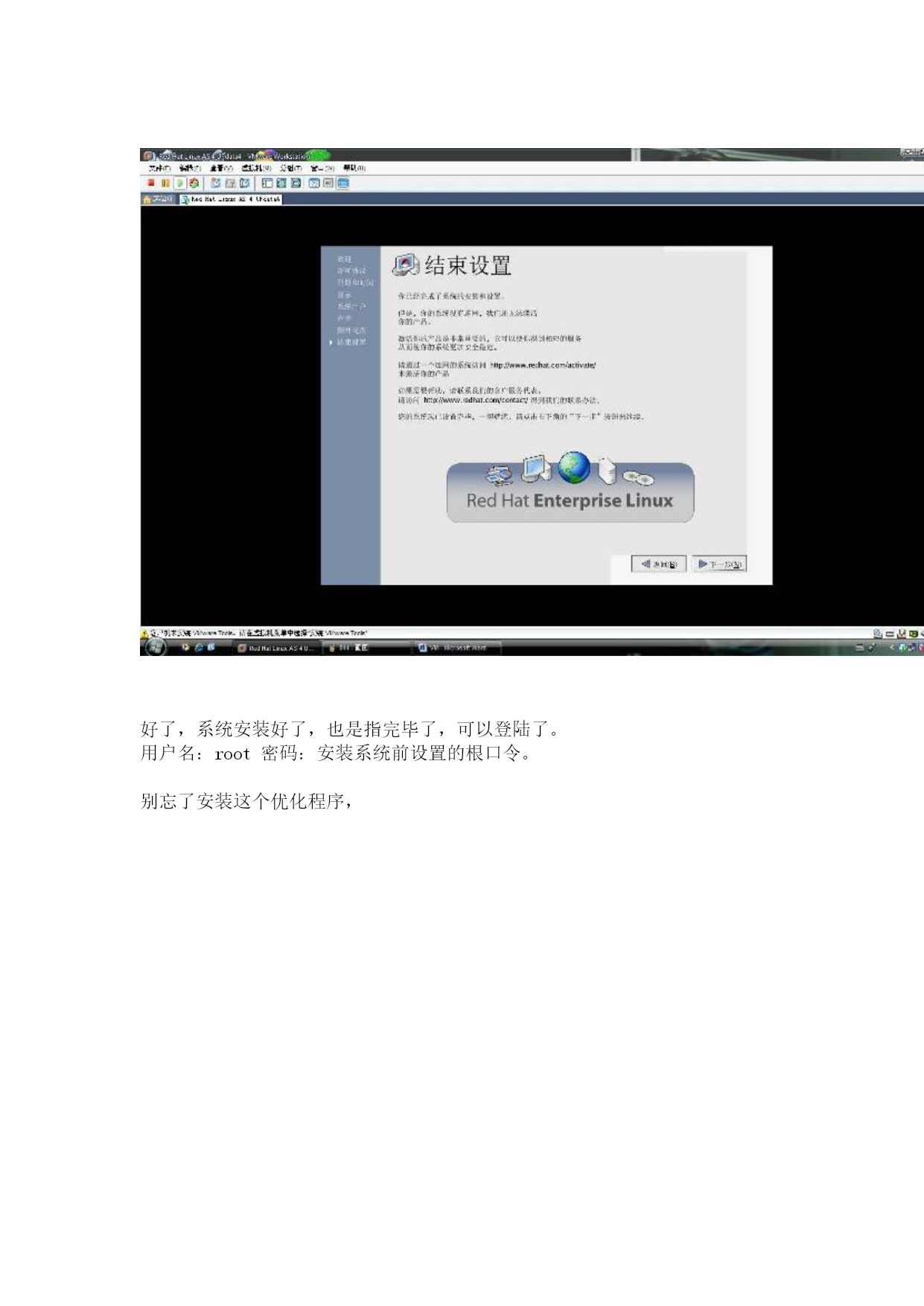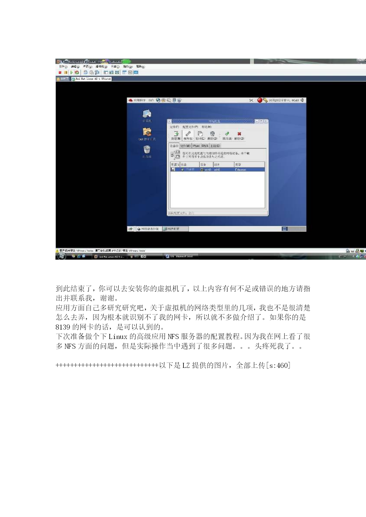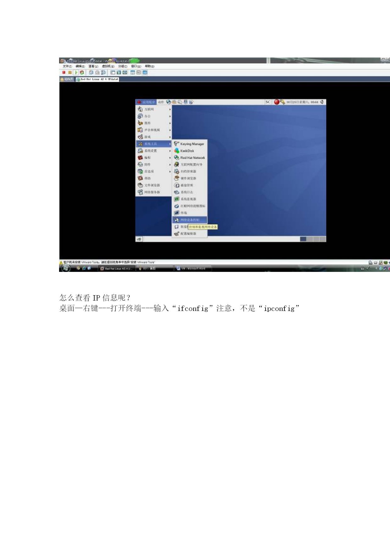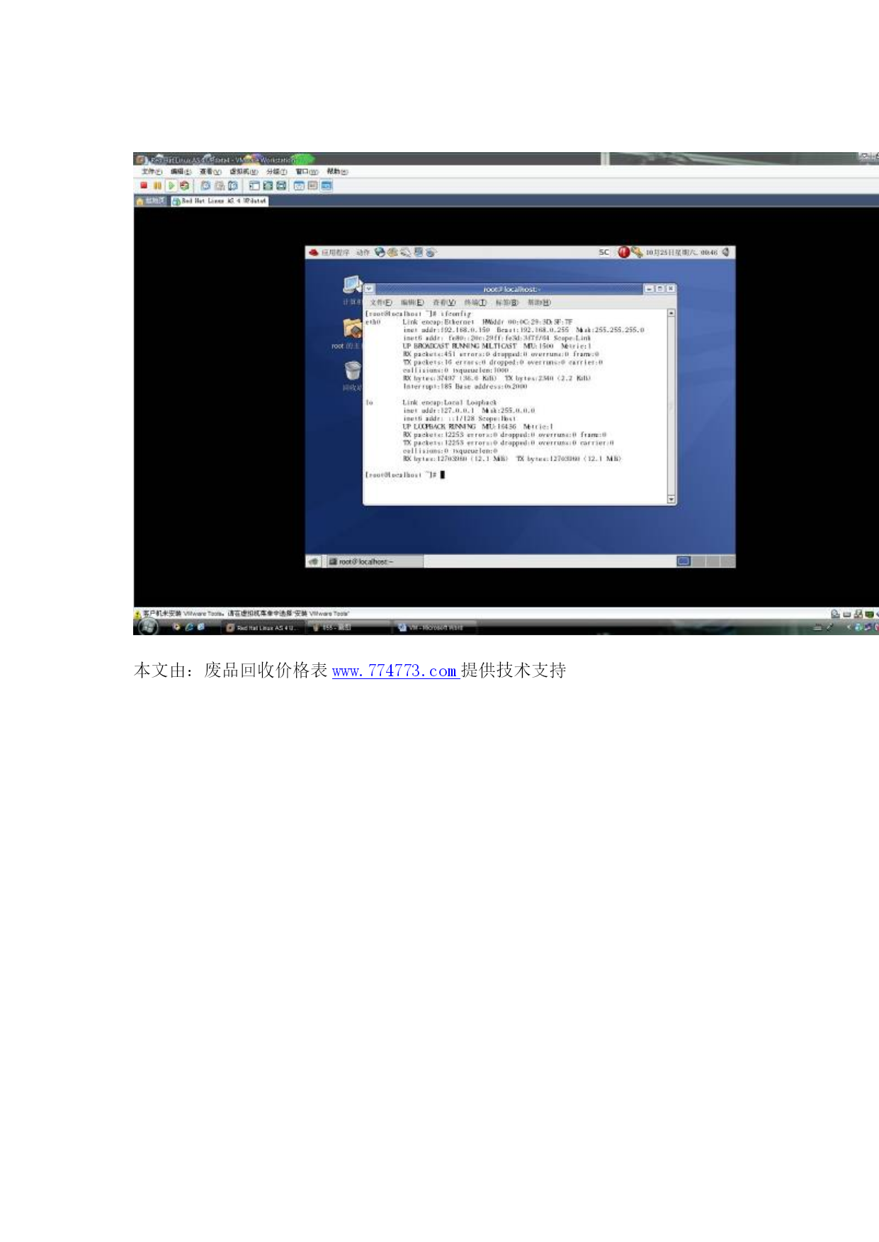 VM安装Linux的全程图解教程4本文由:xp系统下载HYPERLINK"http://www.tudoughost.com"www.tudoughost.com提供技术支持继续选择软件,如果你刚才没有安装自己喜欢的软件,这里还可以再安装。安装完毕后-结束设置!好了,系统安装好了,也是指完毕了,可以登陆了。用户名:root密码:安装系统前设置的根口令。别忘了安装这个优化程序,单击安装VMwareTools后,Linux桌面出现一个光驱,双击打开后有两个,根据你的系统选择,双击—继续安装就行了。怎么手动设置我的IP地址呢?应用程序—系统工具—网络设备控制器。然后单击配置---编辑:选择静态IP地址设置,然后填写,确定。也可以自动获得IP地址。然后再单击“激活”当状态里的“不活跃”变成“活跃”后就可以了。怎么查看IP信息呢?桌面—右键---打开终端---输入“ifconfig”注意,不是“ipconfig”到此结束了,你可以去安装你的虚拟机了,以上内容有何不足或错误的地方请指出并联系我,谢谢。应用方面自己多研究研究吧,关于虚拟机的网络类型里的几项,我也不是很清楚怎么去弄,因为根本就识别不了我的网卡,所以就不多做介绍了。如果你的是8139的网卡的话,是可以认到的。下次准备做个下Linux的高级应用NFS服务器的配置教程。因为我在网上看了很多NFS方面的问题,但是实际操作当中遇到了很多问题。。。头疼死我了。。++++++++++++++++++++++++++++以下是LZ提供的图片,全部上传[s:460]本文由:废品回收价格表HYPERLINK"http://www.774773.com"www.774773.com提供技术支持