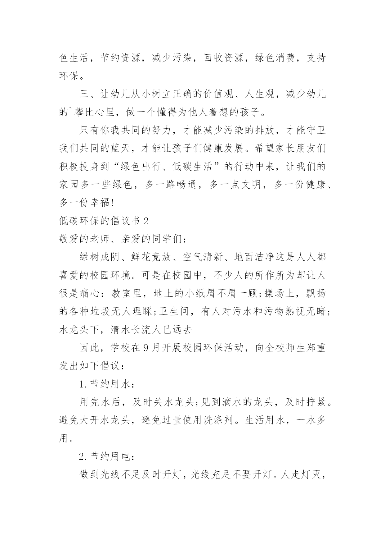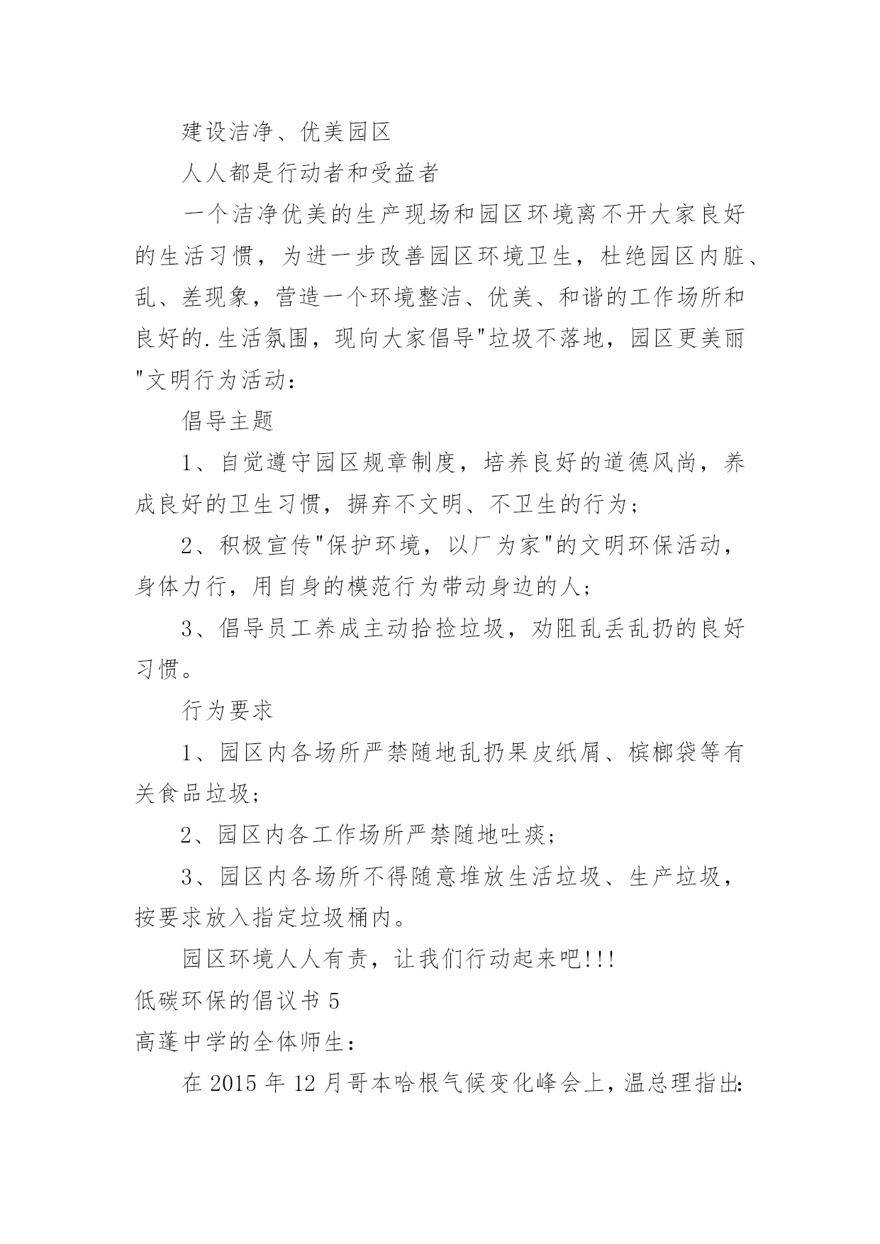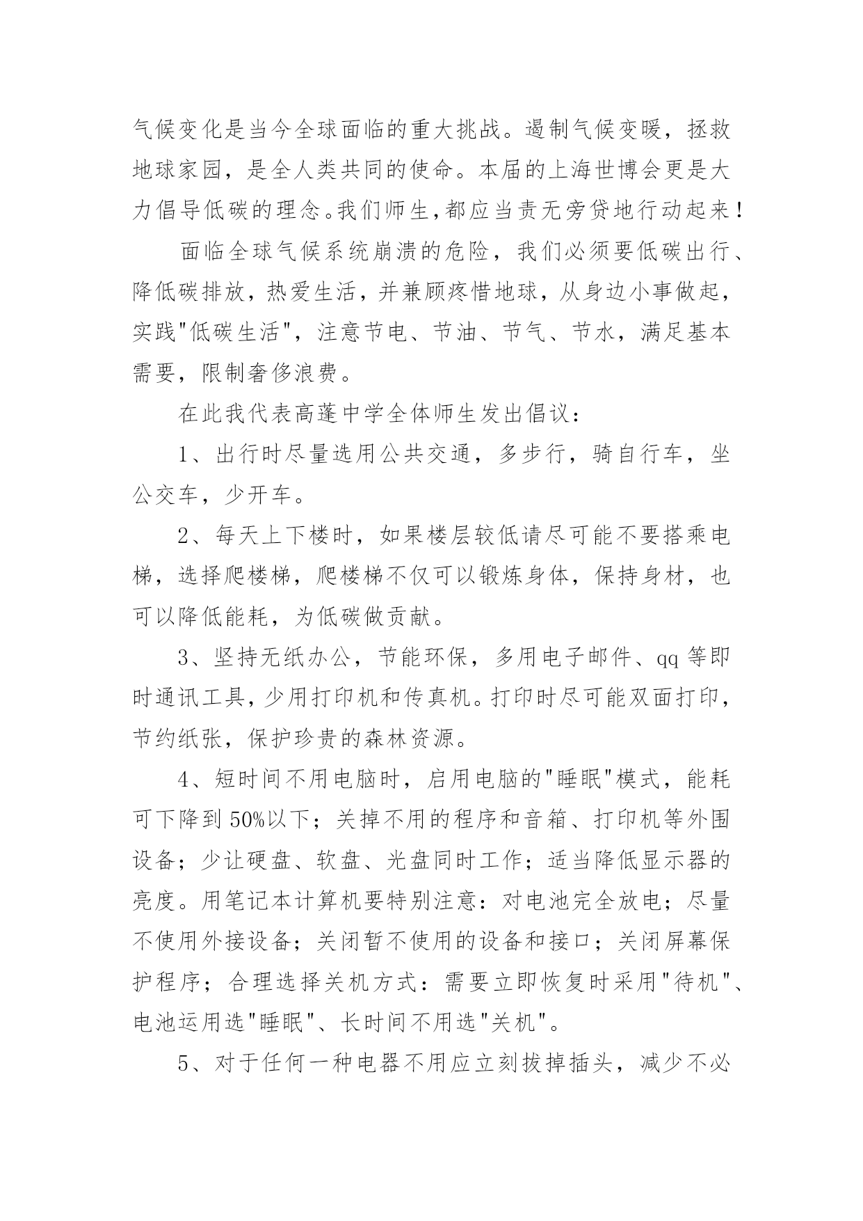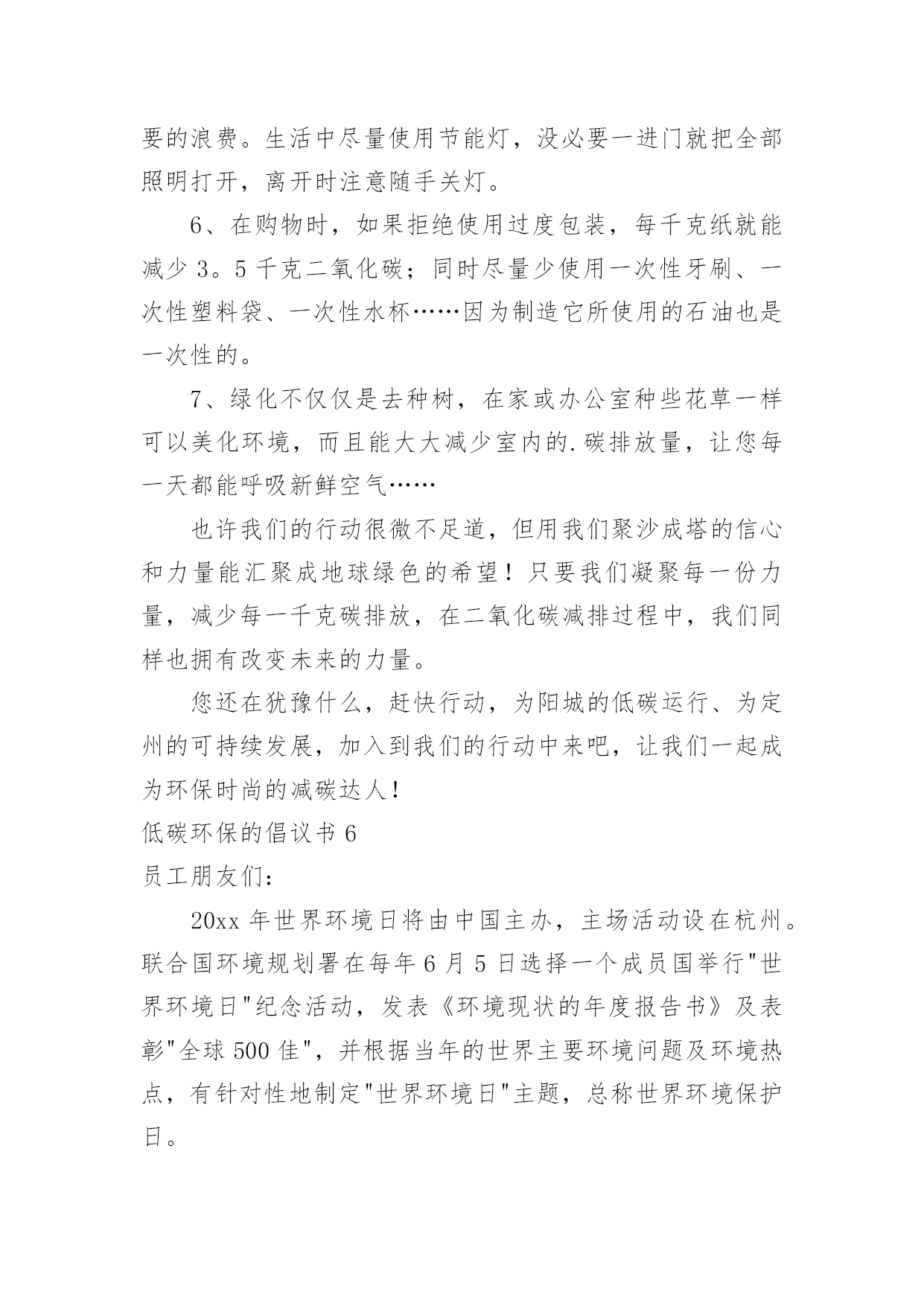 低碳环保的倡议书(荐)低碳环保的倡议书在现在社会,越来越多地方需要用到倡议书,倡议书是由某一组织或社团拟定、就某事向社会提出建议或提议社会成员共同去做某事的书面文章。相信写倡议书是一个让许多人都头痛的问题,以下是小编整理的低碳环保的倡议书,希望能够帮助到大家。低碳环保的倡议书1各位家长朋友:你们好!蔚蓝的天空,清新的空气,这是我们大家理想的生活环境。然而当我们城市里穿行的汽车越来越多,道路显得越来越狭窄时;当路上花费的时间越来越多,出行不再便捷时;当空气污染,蓝天白云难以再见时——我们要思考、改变我们的自身行为、重新考虑出行方式。现我园向家长朋友们发出如下倡议:一、争做绿色出行的先行者。我们倡议:“有车族”带头选择骑自行车或步行或公交车接送幼儿,缓解幼儿园门口的道路压力。如若实在不便也可将车辆停在百米之外的地方带幼儿步行一段距离,这其实对幼儿也是一种锻炼。同时也提醒开车接送幼儿的家长注意避让行人,注意安全。二、从我做起,从现在做起,从身边小事做起,提倡绿色生活,节约资源,减少污染,回收资源,绿色消费,支持环保。三、让幼儿从小树立正确的价值观、人生观,减少幼儿的`攀比心里,做一个懂得为他人着想的孩子。只有你我共同的努力,才能减少污染的排放,才能守卫我们共同的蓝天,才能让孩子们健康发展。希望家长朋友们积极投身到“绿色出行、低碳生活”的行动中来,让我们的家园多一些绿色,多一路畅通,多一点文明,多一份健康、多一份幸福!低碳环保的倡议书2敬爱的老师、亲爱的同学们:绿树成阴、鲜花竞放、空气清新、地面洁净这是人人都喜爱的校园环境。可是在校园中,不少人的所作所为却让人很是痛心:教室里,地上的小纸屑不屑一顾;操场上,飘扬的各种垃圾无人理睬;卫生间,有人对污水和污物熟视无睹;水龙头下,清水长流人已远去因此,学校在9月开展校园环保活动,向全校师生郑重发出如下倡议:1.节约用水:用完水后,及时关水龙头;见到滴水的龙头,及时拧紧。避免大开水龙头,避免过量使用洗涤剂。生活用水,一水多用。2.节约用电:做到光线不足及时开灯,光线充足不要开灯。人走灯灭,人离电关。避免白昼灯、长明灯的情况发生。电脑非工作期间及时关机,待机时请关掉显示器,减少电脑用电量。3.节约用纸:尽量少用餐巾纸,多用手绢和抹布。文件资料双面打印,字体适宜排版合理。学生本子写完别空太多。4.减少废物:提倡自带餐具、水杯,尽量不用一次性筷子、杯子。购物时自带袋子或篮子,袋子多次使用,避免用过就丢。5.生活节俭:不盲目攀比,不浪费粮食。培养良好的生活习惯,不超前消费,要合理消费、适度消费。6.爱惜物品:爱惜仪器设备和公物,使设备始终保持完好状态,尽量减少损坏维修。珍惜笔、书、本,充分发挥其利用价值。7.讲究卫生:垃圾只能丢到垃圾桶或垃圾堆。老师们、同学们,美丽的'环境需要我们共同营造,文明的习惯靠我们平时一点一滴地养成,资源的节约有赖于每个人的实际行动。只有我们心怀环保、行为环保,我们的未来,我们的后代,才能更加美好!低碳环保的倡议书3广大市民朋友们:蔚蓝的天空,清新的空气,打造宜居宜业北方人文山水城市,是我们全体新安人多年的追求和期盼。为进一步增强广大市民的环保忧患意识,倡导绿色、低碳环保的生活方式,营造良好的绿色低碳城市氛围,我们向广大市民发出"绿色低碳生活,从步行做起"倡议:一、积极参与低碳行动签名承诺活动。大力宣传低碳环保理念,宣传绿色生活方式,争当低碳绿色生活的.先锋。二、体验绿色低碳出行。倡议广大市民和单位职工步行、骑自行车、乘坐公共交通工具或拼车上下班,减少车辆使用,积极践行"135"出行方案(即1公里内步行,3公里内骑自行车,5公里内乘坐公共交通工具),以绿色低碳的出行方式支持节能减排。三、提倡绿色低碳办公模式。各党政机关、社会团体和厂矿企业职工在上班期间应多走步梯、不乘电梯;减少办公设备待机能耗,八小时之外彻底切断办公设备电源(在不影响工作和安全的情况下)。四、文明单位树立榜样。各文明单位职工要率先垂范,起到模范到头作用。阳春三月,百花盛开,在这美好的季节里,让我们一起行动起来,过低碳的生活,做绿色的市民,共同拥抱蓝天、绿树和白云,共同营造我们幸福美好的家园!此致敬礼新安县全国文明城市指挥部办公室20xx年3月26日低碳环保的倡议书4建设洁净、优美园区人人都是行动者和受益者一个洁净优美的生产现场和园区环境离不开大家良好的生活习惯,为进一步改善园区环境卫生,杜绝园区内脏、乱、差现象,营造一个环境整洁、优美、和谐的工作场所和良好的.生活氛围,现向大家倡导"垃圾不落地,园区更美丽"文明行为活动:倡导主题1、自觉遵守园区规章制度,培养良好的道德风尚,养成良好的卫生习惯,摒弃不文明、不卫生的行为;2、积极宣传"保护环境,以厂为家"的文明环保活动,身体力行,用自身的模范行为带动身边的人