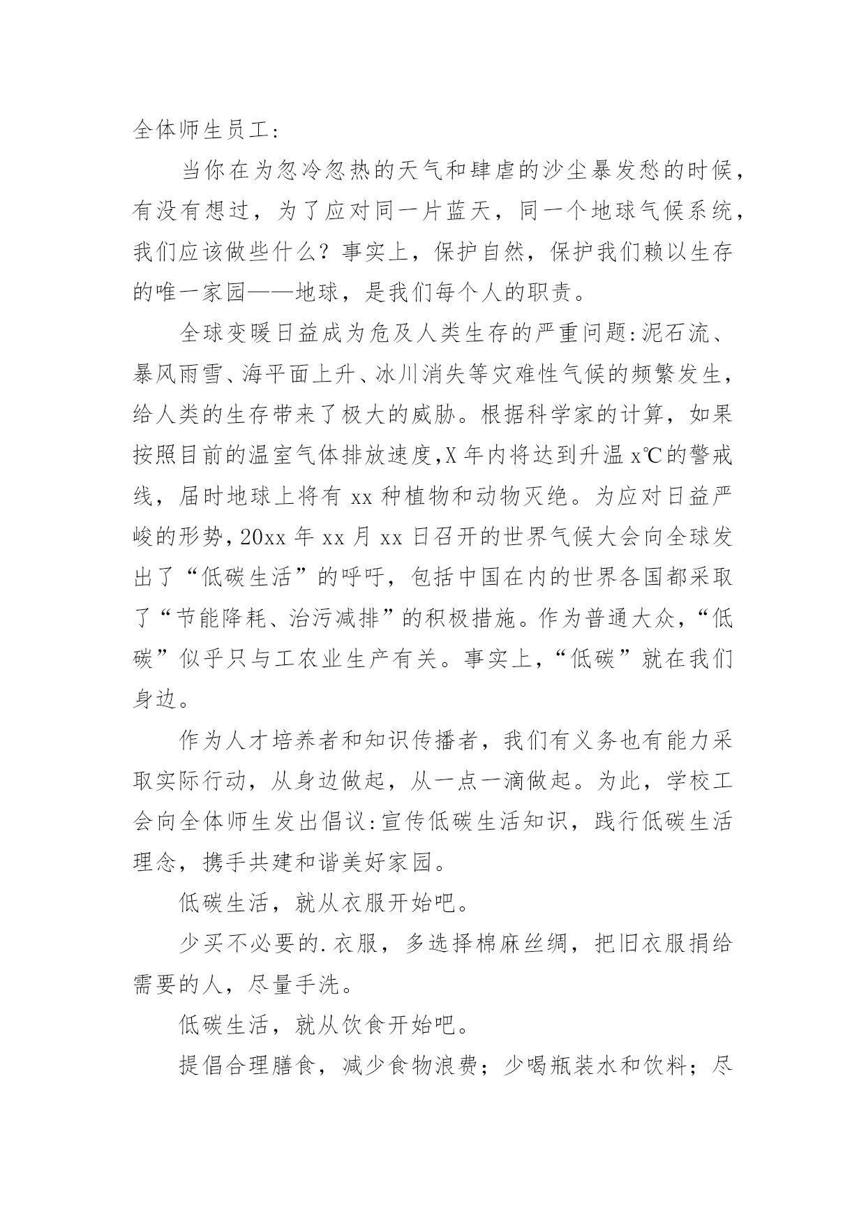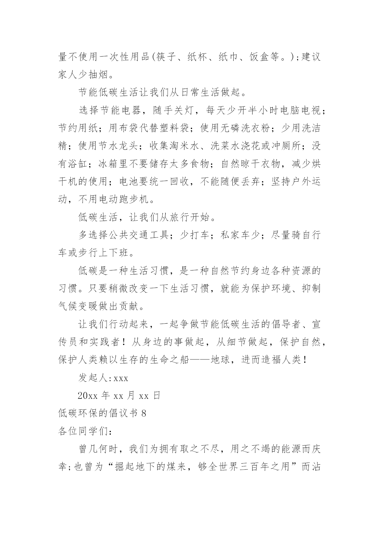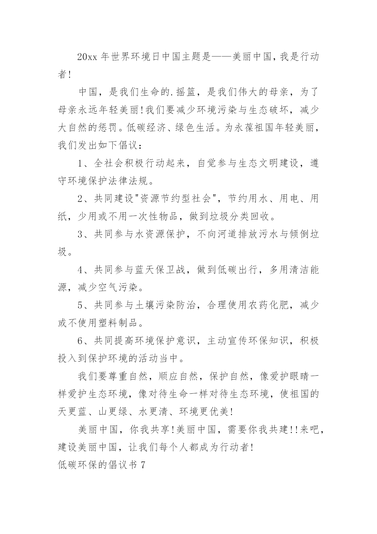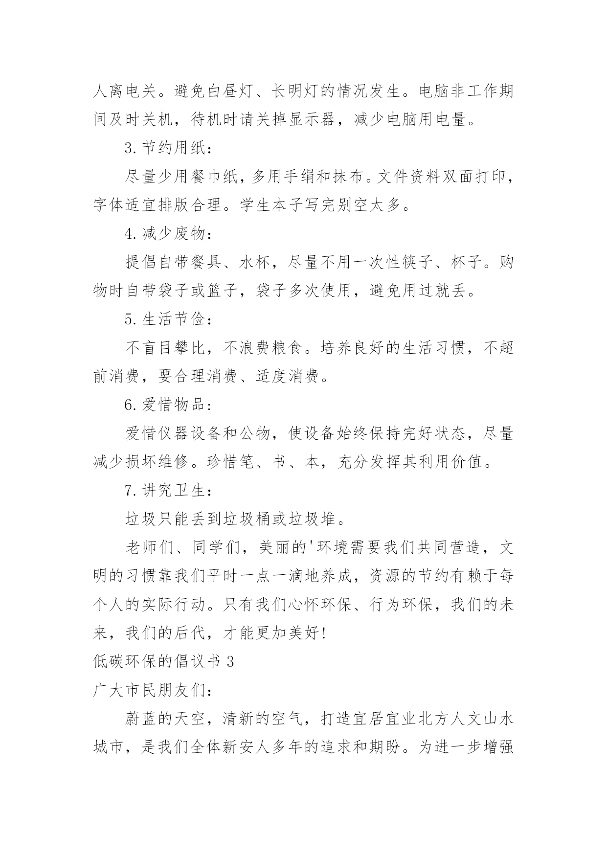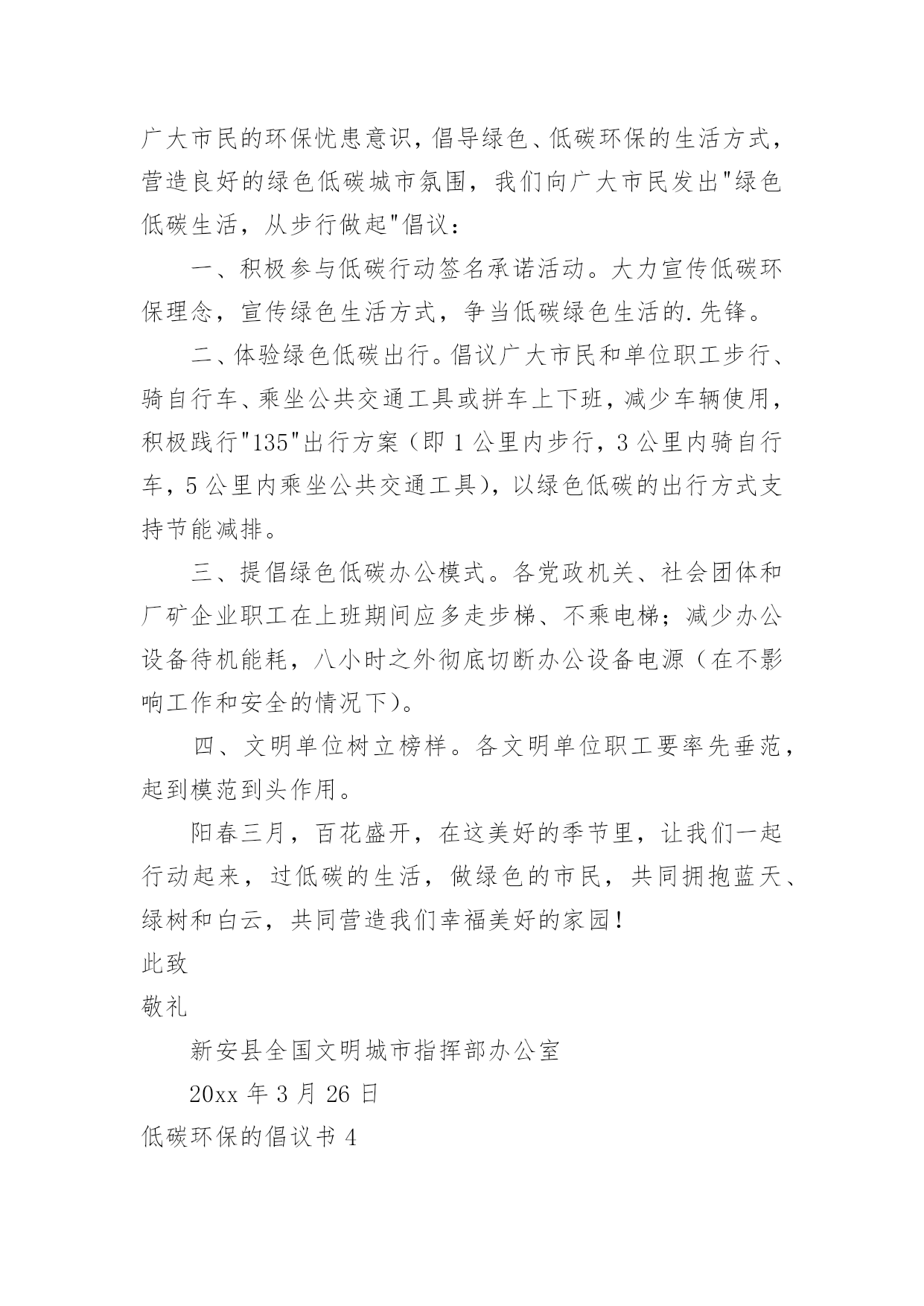 低碳环保的倡议书(荐)低碳环保的倡议书在现在社会,越来越多地方需要用到倡议书,倡议书是由某一组织或社团拟定、就某事向社会提出建议或提议社会成员共同去做某事的书面文章。相信写倡议书是一个让许多人都头痛的问题,以下是小编整理的低碳环保的倡议书,希望能够帮助到大家。低碳环保的倡议书1各位家长朋友:你们好!蔚蓝的天空,清新的空气,这是我们大家理想的生活环境。然而当我们城市里穿行的汽车越来越多,道路显得越来越狭窄时;当路上花费的时间越来越多,出行不再便捷时;当空气污染,蓝天白云难以再见时——我们要思考、改变我们的自身行为、重新考虑出行方式。现我园向家长朋友们发出如下倡议:一、争做绿色出行的先行者。我们倡议:“有车族”带头选择骑自行车或步行或公交车接送幼儿,缓解幼儿园门口的道路压力。如若实在不便也可将车辆停在百米之外的地方带幼儿步行一段距离,这其实对幼儿也是一种锻炼。同时也提醒开车接送幼儿的家长注意避让行人,注意安全。二、从我做起,从现在做起,从身边小事做起,提倡绿色生活,节约资源,减少污染,回收资源,绿色消费,支持环保。三、让幼儿从小树立正确的价值观、人生观,减少幼儿的`攀比心里,做一个懂得为他人着想的孩子。只有你我共同的努力,才能减少污染的排放,才能守卫我们共同的蓝天,才能让孩子们健康发展。希望家长朋友们积极投身到“绿色出行、低碳生活”的行动中来,让我们的家园多一些绿色,多一路畅通,多一点文明,多一份健康、多一份幸福!低碳环保的倡议书2敬爱的老师、亲爱的同学们:绿树成阴、鲜花竞放、空气清新、地面洁净这是人人都喜爱的校园环境。可是在校园中,不少人的所作所为却让人很是痛心:教室里,地上的小纸屑不屑一顾;操场上,飘扬的各种垃圾无人理睬;卫生间,有人对污水和污物熟视无睹;水龙头下,清水长流人已远去因此,学校在9月开展校园环保活动,向全校师生郑重发出如下倡议:1.节约用水:用完水后,及时关水龙头;见到滴水的龙头,及时拧紧。避免大开水龙头,避免过量使用洗涤剂。生活用水,一水多用。2.节约用电:做到光线不足及时开灯,光线充足不要开灯。人走灯灭,人离电关。避免白昼灯、长明灯的情况发生。电脑非工作期间及时关机,待机时请关掉显示器,减少电脑用电量。3.节约用纸:尽量少用餐巾纸,多用手绢和抹布。文件资料双面打印,字体适宜排版合理。学生本子写完别空太多。4.减少废物:提倡自带餐具、水杯,尽量不用一次性筷子、杯子。购物时自带袋子或篮子,袋子多次使用,避免用过就丢。5.生活节俭:不盲目攀比,不浪费粮食。培养良好的生活习惯,不超前消费,要合理消费、适度消费。6.爱惜物品:爱惜仪器设备和公物,使设备始终保持完好状态,尽量减少损坏维修。珍惜笔、书、本,充分发挥其利用价值。7.讲究卫生:垃圾只能丢到垃圾桶或垃圾堆。老师们、同学们,美丽的'环境需要我们共同营造,文明的习惯靠我们平时一点一滴地养成,资源的节约有赖于每个人的实际行动。只有我们心怀环保、行为环保,我们的未来,我们的后代,才能更加美好!低碳环保的倡议书3广大市民朋友们:蔚蓝的天空,清新的空气,打造宜居宜业北方人文山水城市,是我们全体新安人多年的追求和期盼。为进一步增强广大市民的环保忧患意识,倡导绿色、低碳环保的生活方式,营造良好的绿色低碳城市氛围,我们向广大市民发出"绿色低碳生活,从步行做起"倡议:一、积极参与低碳行动签名承诺活动。大力宣传低碳环保理念,宣传绿色生活方式,争当低碳绿色生活的.先锋。二、体验绿色低碳出行。倡议广大市民和单位职工步行、骑自行车、乘坐公共交通工具或拼车上下班,减少车辆使用,积极践行"135"出行方案(即1公里内步行,3公里内骑自行车,5公里内乘坐公共交通工具),以绿色低碳的出行方式支持节能减排。三、提倡绿色低碳办公模式。各党政机关、社会团体和厂矿企业职工在上班期间应多走步梯、不乘电梯;减少办公设备待机能耗,八小时之外彻底切断办公设备电源(在不影响工作和安全的情况下)。四、文明单位树立榜样。各文明单位职工要率先垂范,起到模范到头作用。阳春三月,百花盛开,在这美好的季节里,让我们一起行动起来,过低碳的生活,做绿色的市民,共同拥抱蓝天、绿树和白云,共同营造我们幸福美好的家园!此致敬礼新安县全国文明城市指挥部办公室20xx年3月26日低碳环保的倡议书4建设洁净、优美园区人人都是行动者和受益者一个洁净优美的生产现场和园区环境离不开大家良好的生活习惯,为进一步改善园区环境卫生,杜绝园区内脏、乱、差现象,营造一个环境整洁、优美、和谐的工作场所和良好的.生活氛围,现向大家倡导"垃圾不落地,园区更美丽"文明行为活动:倡导主题1、自觉遵守园区规章制度,培养良好的道德风尚,养成良好的卫生习惯,摒弃不文明、不卫生的行为;2、积极宣传"保护环境,以厂为家"的文明环保活动,身体力行,用自身的模范行为带动身边的人