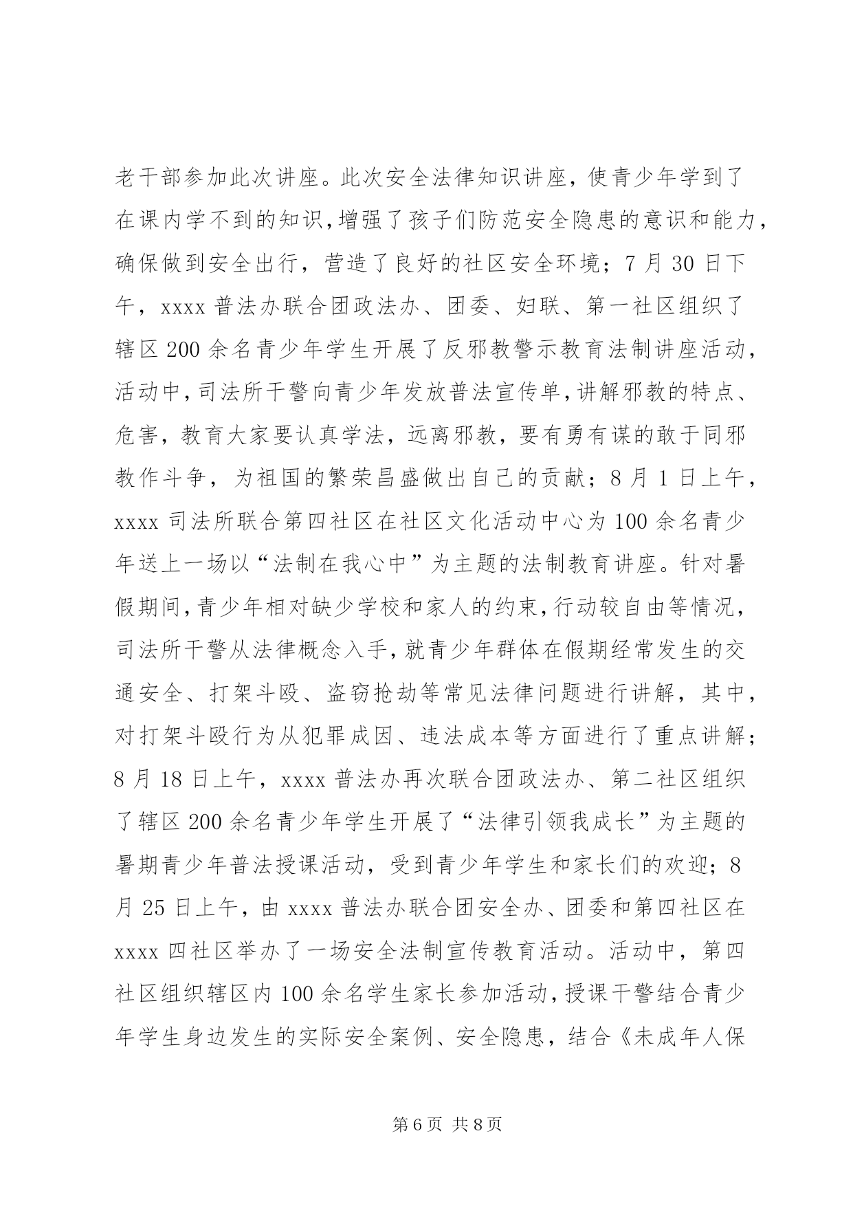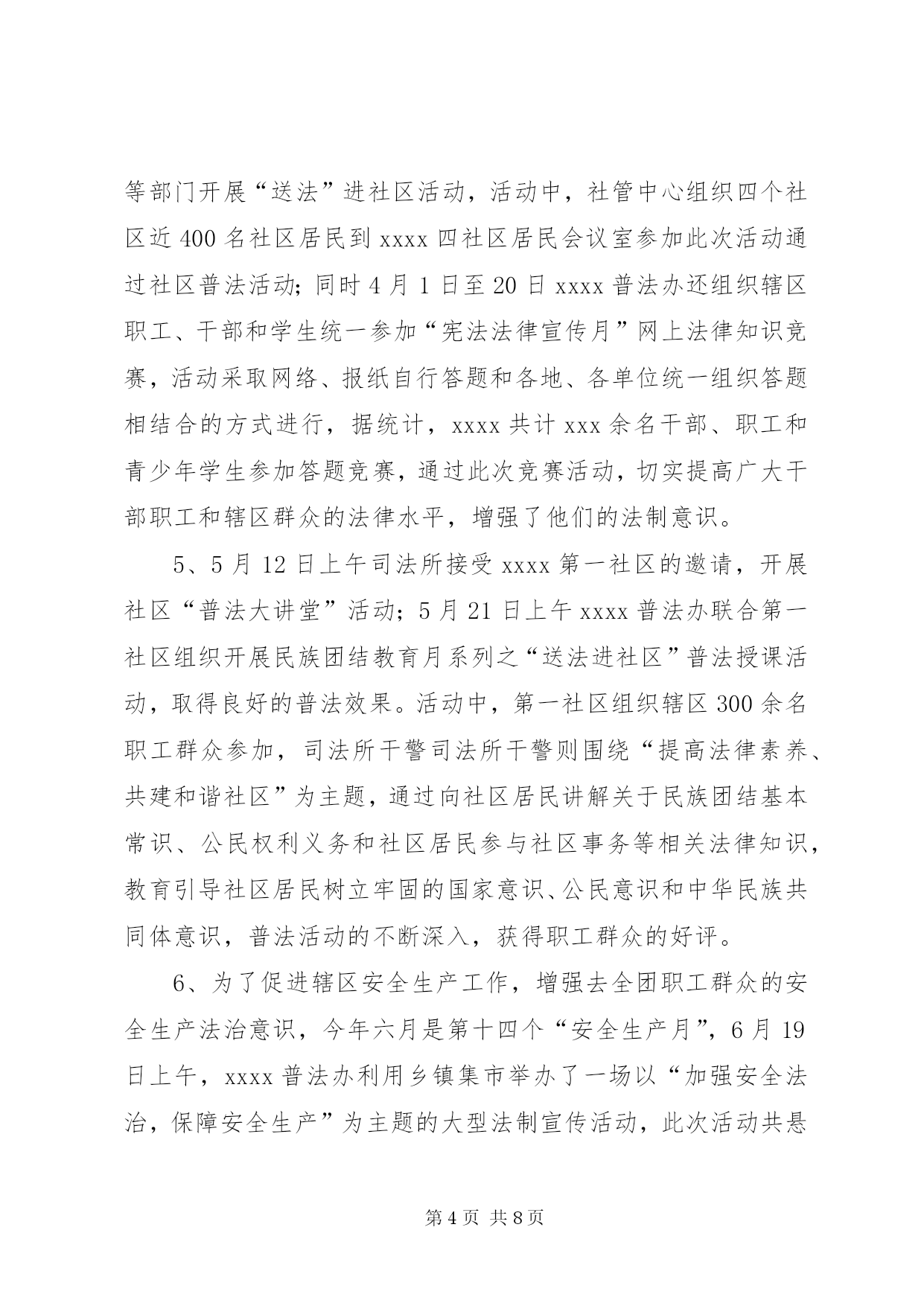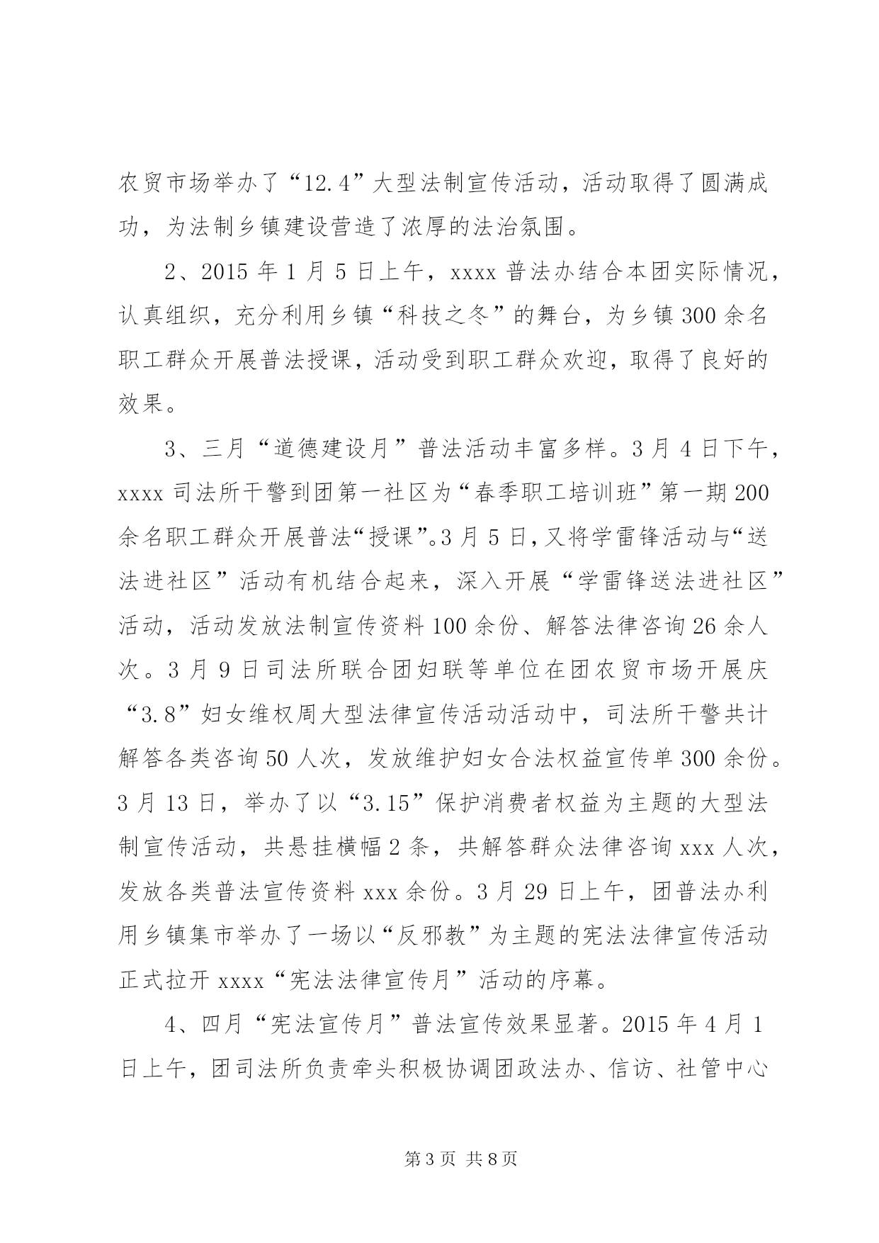 第PAGE\*Arabic\*MERGEFORMAT8页共NUMPAGES\*MERGEFORMAT8页XX年司法所普法工作总结2015年xxxx司法所普法依法治理工作总结2015年是推进“六五”普法规划验收之年。一年来,xxxx普法办坚持以科学发展观为指导,紧紧围绕中心、服务基层、服务科学发展,广泛开展法制宣教工作,大力推进“法律六进”活动,为构建平安乡镇,促进我团社会经济的发展营造了良好的法治环境。现将一年来的工作总结如下:一、认真筹划,切实抓好“六五”普法验收准备工作。年初及时制定并下发了《2015年全团普法依法治理工作要点》,今年是“六五”普法的验收年,团普法办紧紧围绕“六五”普法教育规划,紧扣“六五”普法考核验收标准,结合xxxx实际,积极组织开展“六五”普法教育活动,进一步深化“平安xxxx”、“法治xxxx”创建工作。在开展好上述各项普法活动基础上,普法办还对“六五”普法活动启动以来的各项普法工作台账进行梳理规整,同时司法所先后12次深入各作业点、社区、学校等基层单位督促各基层“六五”普法验收准备工作,2105年6月10日顺利完成了xx普法办对xxxx“六五”普法工作的验收。二、创新方式方法,积极推进各项法制宣传教育工作的开展。xxxx辖区普法对象有xxx人,其中干部xxx人,职工xxx人,(农业职工3600,非农职工2100,)中学生xxx人,小学生xxx人。离退休xxxx人,从业人员xxxx人。2015年,共开展大型法律宣传活动xx次,接受教育面人xxx余人次,举办干部普法培训班x次,培训人数xxx人次,分发普法宣传教材xxx份,普法经费支出金额xxx余元,xx个基层单位建立固定宣传专栏,宣传阵地的建立有力保证了普法活动的正常开展。今年来,我们共开展“法律进社区”、“法律进学校”以及“法律进单位”等法律六进活动xx场次,普法人数xxx人次,青少年普法教育7课时,普法对象达xxx人次。xxxx普法办充分利用各类宣传阵地、载体和平台,营造浓厚氛围。利用街道各类宣传阵地,每月宣传与群众生产生活密切相关的法律法规,宣传与维护社会稳定及促进社会公平正义密切相关的法律法规。结合“12.4”、“3.8”、“3.15”、“宪法法律宣传月”“安全生产月”等重要时间节点开展大型法律宣传主题教育活动,扩大法制宣传教育的覆盖面,在全团营造浓厚的法治氛围和法治文化。1、“12.4”普法活动色彩鲜明。2014年12月2日下午,xxxx小学组织学生xxx余人参加“法制教育”大会。12月8日上午,xxxx准时召集全团各级干部xxx余人参加了普法考试活动,推动干部职工学法、懂法、用法,当天下午xxxx第一社区组织200余人举办的社区法制讲堂正式开课了,司法所进行了普法授课,强化司法所在社区居民中的影响力;12月9日上午,xxxx在团农贸市场举办了“12.4”大型法制宣传活动,活动取得了圆满成功,为法制乡镇建设营造了浓厚的法治氛围。2、2015年1月5日上午,xxxx普法办结合本团实际情况,认真组织,充分利用乡镇“科技之冬”的舞台,为乡镇300余名职工群众开展普法授课,活动受到职工群众欢迎,取得了良好的效果。3、三月“道德建设月”普法活动丰富多样。3月4日下午,xxxx司法所干警到团第一社区为“春季职工培训班”第一期200余名职工群众开展普法“授课”。3月5日,又将学雷锋活动与“送法进社区”活动有机结合起来,深入开展“学雷锋送法进社区”活动,活动发放法制宣传资料100余份、解答法律咨询26余人次。3月9日司法所联合团妇联等单位在团农贸市场开展庆“3.8”妇女维权周大型法律宣传活动活动中,司法所干警共计解答各类咨询50人次,发放维护妇女合法权益宣传单300余份。3月13日,举办了以“3.15”保护消费者权益为主题的大型法制宣传活动,共悬挂横幅2条,共解答群众法律咨询xxx人次,发放各类普法宣传资料xxx余份。3月29日上午,团普法办利用乡镇集市举办了一场以“反邪教”为主题的宪法法律宣传活动正式拉开xxxx“宪法法律宣传月”活动的序幕。4、四月“宪法宣传月”普法宣传效果显著。2015年4月1日上午,团司法所负责牵头积极协调团政法办、信访、社管中心等部门开展“送法”进社区活动,活动中,社管中心组织四个社区近400名社区居民到xxxx四社区居民会议室参加此次活动通过社区普法活动;同时4月1日至20日xxxx普法办还组织辖区职工、干部和学生统一参加“宪法法律宣传月”网上法律知识竞赛,活动采取网络、报纸自行答题和各地、各单位统一组织答题相结合的方式进行,据统计,xxxx共计xxx余名干部、职工和青少年学生参加答题竞赛,通过此次竞赛活动,切实提高广大干部职工和辖区群众的法律水平,增强了他们的法制意识。5、5月12日上午司法所接受xx