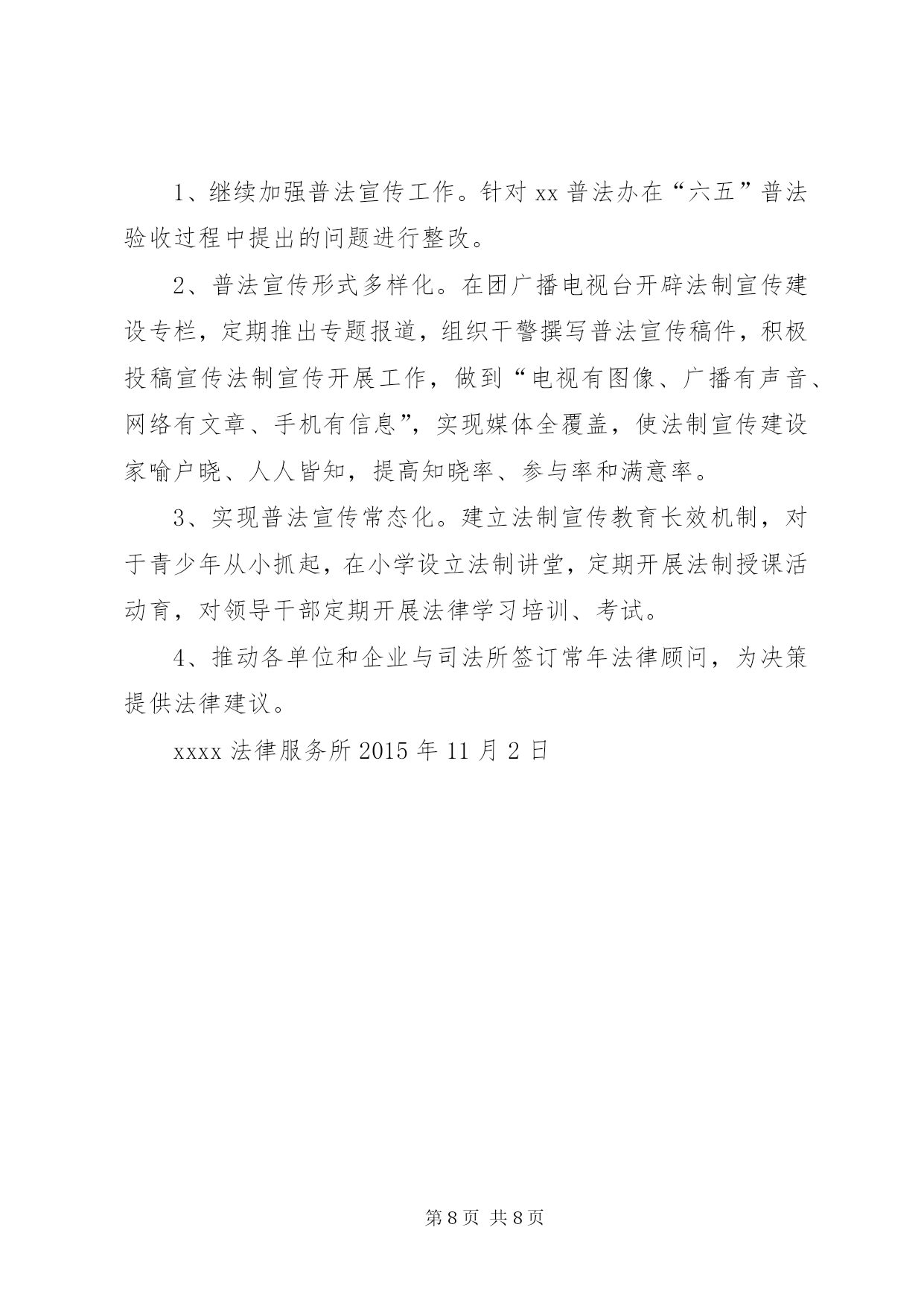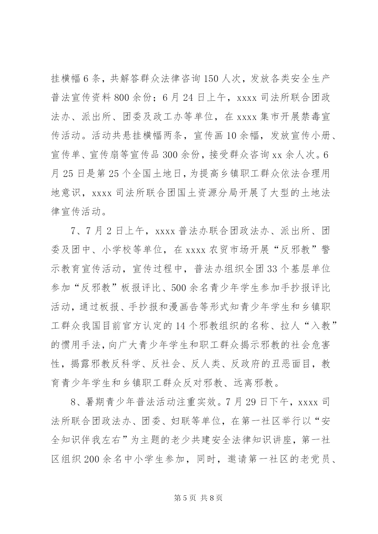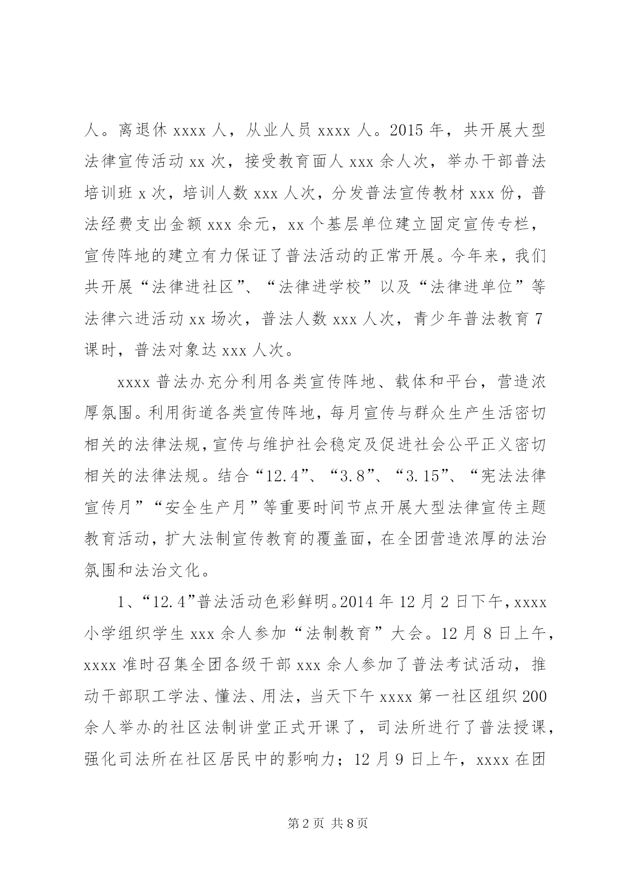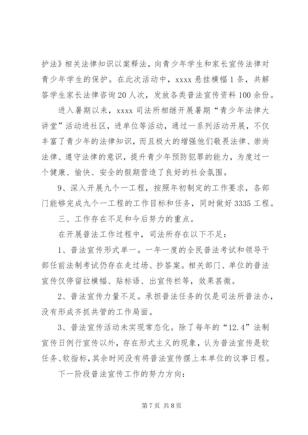 第PAGE\*Arabic\*MERGEFORMAT8页共NUMPAGES\*MERGEFORMAT8页XX年司法所普法工作总结2015年xxxx司法所普法依法治理工作总结2015年是推进“六五”普法规划验收之年。一年来,xxxx普法办坚持以科学发展观为指导,紧紧围绕中心、服务基层、服务科学发展,广泛开展法制宣教工作,大力推进“法律六进”活动,为构建平安乡镇,促进我团社会经济的发展营造了良好的法治环境。现将一年来的工作总结如下:一、认真筹划,切实抓好“六五”普法验收准备工作。年初及时制定并下发了《2015年全团普法依法治理工作要点》,今年是“六五”普法的验收年,团普法办紧紧围绕“六五”普法教育规划,紧扣“六五”普法考核验收标准,结合xxxx实际,积极组织开展“六五”普法教育活动,进一步深化“平安xxxx”、“法治xxxx”创建工作。在开展好上述各项普法活动基础上,普法办还对“六五”普法活动启动以来的各项普法工作台账进行梳理规整,同时司法所先后12次深入各作业点、社区、学校等基层单位督促各基层“六五”普法验收准备工作,2105年6月10日顺利完成了xx普法办对xxxx“六五”普法工作的验收。二、创新方式方法,积极推进各项法制宣传教育工作的开展。xxxx辖区普法对象有xxx人,其中干部xxx人,职工xxx人,(农业职工3600,非农职工2100,)中学生xxx人,小学生xxx人。离退休xxxx人,从业人员xxxx人。2015年,共开展大型法律宣传活动xx次,接受教育面人xxx余人次,举办干部普法培训班x次,培训人数xxx人次,分发普法宣传教材xxx份,普法经费支出金额xxx余元,xx个基层单位建立固定宣传专栏,宣传阵地的建立有力保证了普法活动的正常开展。今年来,我们共开展“法律进社区”、“法律进学校”以及“法律进单位”等法律六进活动xx场次,普法人数xxx人次,青少年普法教育7课时,普法对象达xxx人次。xxxx普法办充分利用各类宣传阵地、载体和平台,营造浓厚氛围。利用街道各类宣传阵地,每月宣传与群众生产生活密切相关的法律法规,宣传与维护社会稳定及促进社会公平正义密切相关的法律法规。结合“12.4”、“3.8”、“3.15”、“宪法法律宣传月”“安全生产月”等重要时间节点开展大型法律宣传主题教育活动,扩大法制宣传教育的覆盖面,在全团营造浓厚的法治氛围和法治文化。1、“12.4”普法活动色彩鲜明。2014年12月2日下午,xxxx小学组织学生xxx余人参加“法制教育”大会。12月8日上午,xxxx准时召集全团各级干部xxx余人参加了普法考试活动,推动干部职工学法、懂法、用法,当天下午xxxx第一社区组织200余人举办的社区法制讲堂正式开课了,司法所进行了普法授课,强化司法所在社区居民中的影响力;12月9日上午,xxxx在团农贸市场举办了“12.4”大型法制宣传活动,活动取得了圆满成功,为法制乡镇建设营造了浓厚的法治氛围。2、2015年1月5日上午,xxxx普法办结合本团实际情况,认真组织,充分利用乡镇“科技之冬”的舞台,为乡镇300余名职工群众开展普法授课,活动受到职工群众欢迎,取得了良好的效果。3、三月“道德建设月”普法活动丰富多样。3月4日下午,xxxx司法所干警到团第一社区为“春季职工培训班”第一期200余名职工群众开展普法“授课”。3月5日,又将学雷锋活动与“送法进社区”活动有机结合起来,深入开展“学雷锋送法进社区”活动,活动发放法制宣传资料100余份、解答法律咨询26余人次。3月9日司法所联合团妇联等单位在团农贸市场开展庆“3.8”妇女维权周大型法律宣传活动活动中,司法所干警共计解答各类咨询50人次,发放维护妇女合法权益宣传单300余份。3月13日,举办了以“3.15”保护消费者权益为主题的大型法制宣传活动,共悬挂横幅2条,共解答群众法律咨询xxx人次,发放各类普法宣传资料xxx余份。3月29日上午,团普法办利用乡镇集市举办了一场以“反邪教”为主题的宪法法律宣传活动正式拉开xxxx“宪法法律宣传月”活动的序幕。4、四月“宪法宣传月”普法宣传效果显著。2015年4月1日上午,团司法所负责牵头积极协调团政法办、信访、社管中心等部门开展“送法”进社区活动,活动中,社管中心组织四个社区近400名社区居民到xxxx四社区居民会议室参加此次活动通过社区普法活动;同时4月1日至20日xxxx普法办还组织辖区职工、干部和学生统一参加“宪法法律宣传月”网上法律知识竞赛,活动采取网络、报纸自行答题和各地、各单位统一组织答题相结合的方式进行,据统计,xxxx共计xxx余名干部、职工和青少年学生参加答题竞赛,通过此次竞赛活动,切实提高广大干部职工和辖区群众的法律水平,增强了他们的法制意识。5、5月12日上午司法所接受xx