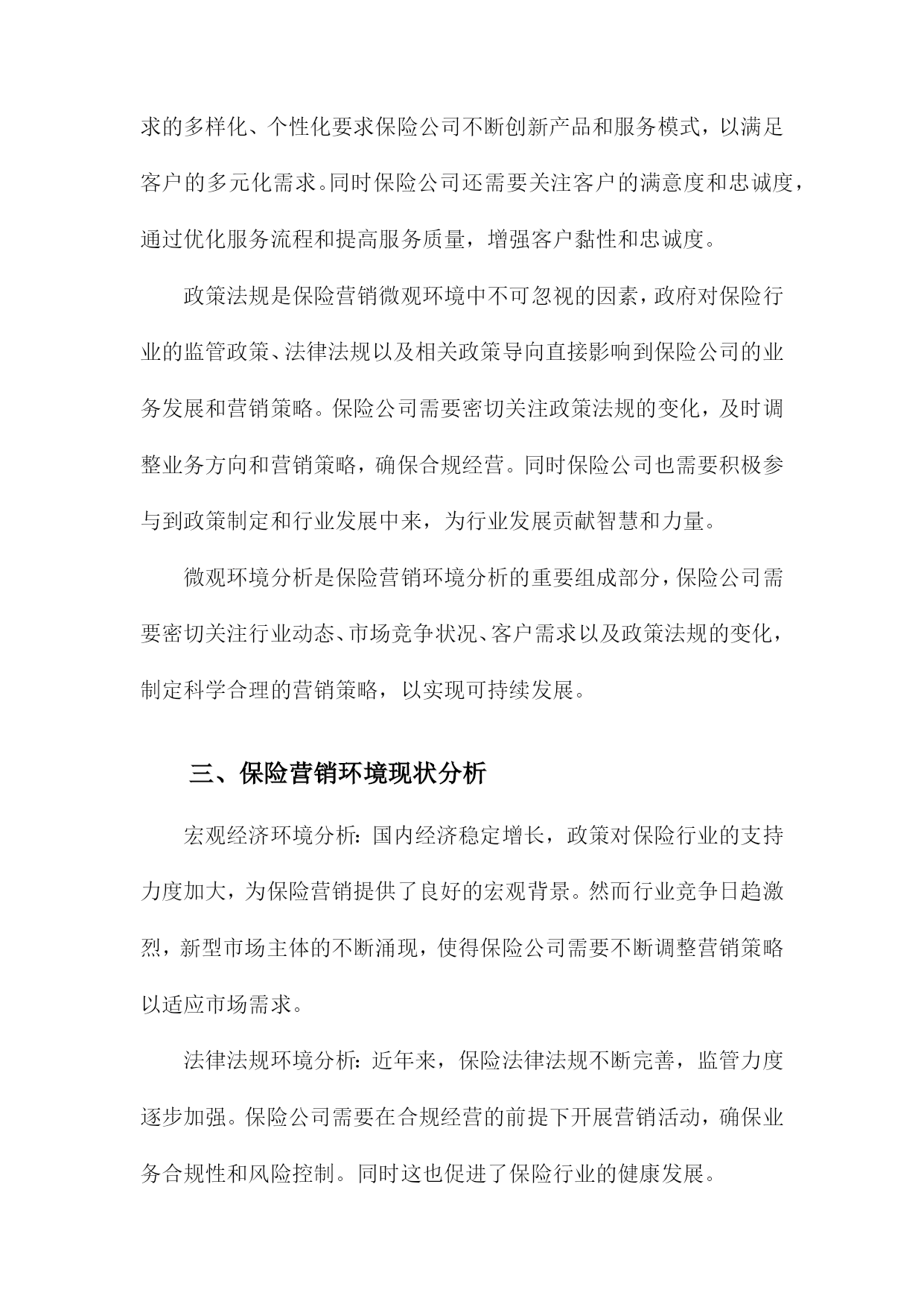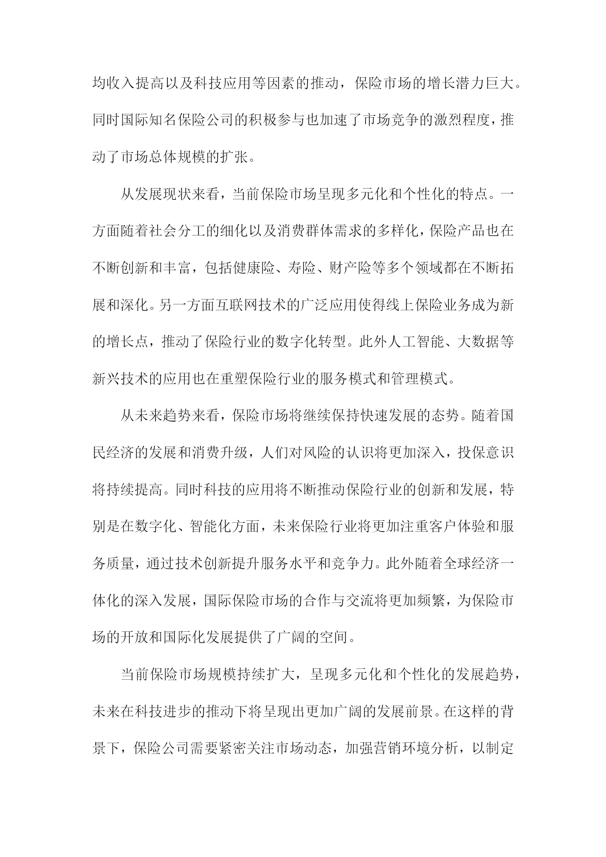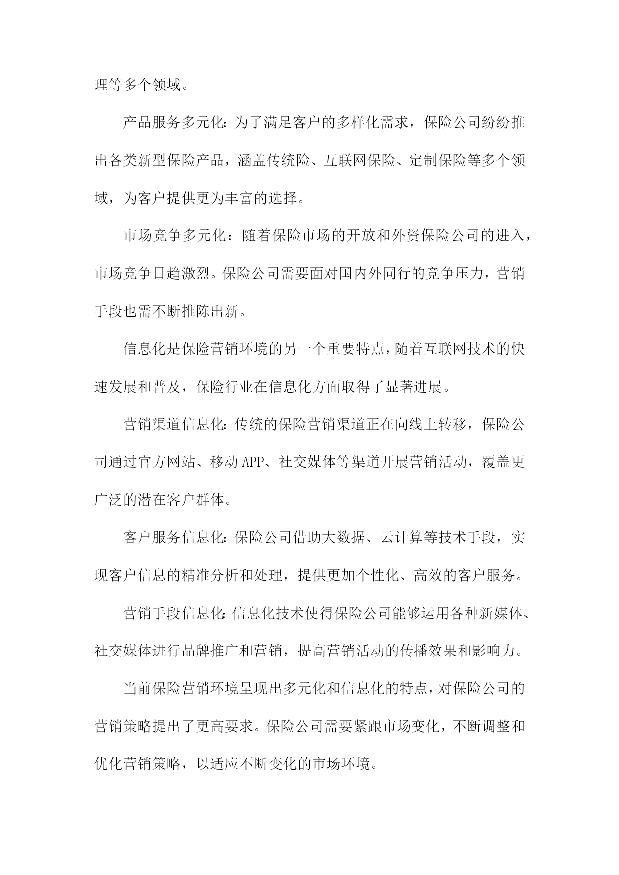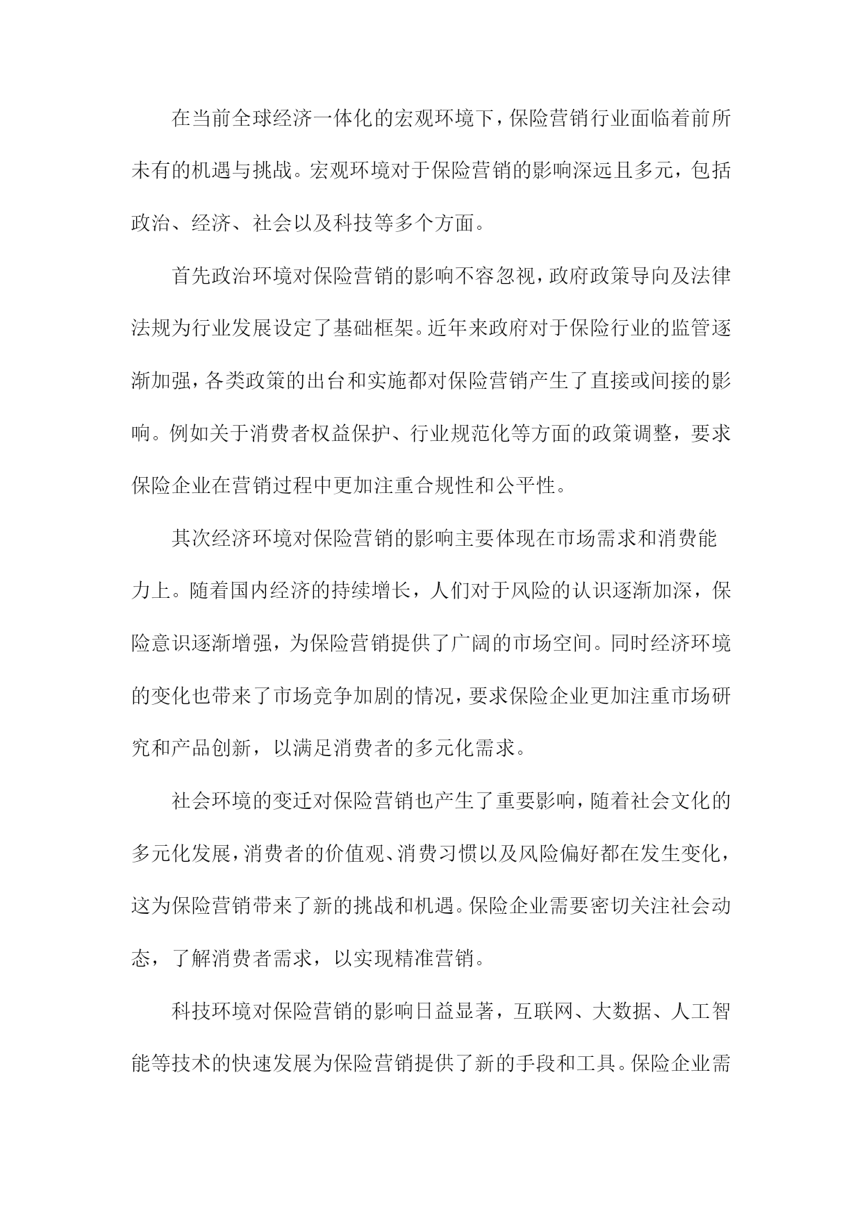 保险营销环境分析综述一、概要随着社会经济不断发展与变迁,保险行业在中国市场中的位置日益重要,与之相关的保险营销环境也在发生着深刻的变化。本篇文章旨在综合分析保险营销环境的现状及其发展趋势,探究其面临的挑战与机遇。通过对国内外保险市场的宏观环境、行业状况、竞争态势、政策法规、技术进步以及消费者需求等多方面的深入研究,文章将全面揭示当前保险营销环境的复杂性和多样性,以期为保险企业在激烈的市场竞争中寻找定位和发展方向提供有益的参考和启示。1.背景介绍:介绍当前保险市场的规模、发展现状及趋势随着全球经济的持续发展和社会进步,保险行业作为金融体系的重要组成部分,其重要性日益凸显。在当前经济形势下,保险市场的规模持续扩大,呈现出蓬勃的发展态势。保险市场的成熟与壮大不仅为国民经济贡献了巨大的增长动力,同时也为社会风险管理提供了强有力的支撑。从市场规模来看,近年来全球保险市场呈现稳步增长的态势。各类保险产品需求的增加以及投保意识的提高使得保险市场规模持续扩大。尤其是在新兴经济体和发展中国家,由于城市化进程加快、人均收入提高以及科技应用等因素的推动,保险市场的增长潜力巨大。同时国际知名保险公司的积极参与也加速了市场竞争的激烈程度,推动了市场总体规模的扩张。从发展现状来看,当前保险市场呈现多元化和个性化的特点。一方面随着社会分工的细化以及消费群体需求的多样化,保险产品也在不断创新和丰富,包括健康险、寿险、财产险等多个领域都在不断拓展和深化。另一方面互联网技术的广泛应用使得线上保险业务成为新的增长点,推动了保险行业的数字化转型。此外人工智能、大数据等新兴技术的应用也在重塑保险行业的服务模式和管理模式。从未来趋势来看,保险市场将继续保持快速发展的态势。随着国民经济的发展和消费升级,人们对风险的认识将更加深入,投保意识将持续提高。同时科技的应用将不断推动保险行业的创新和发展,特别是在数字化、智能化方面,未来保险行业将更加注重客户体验和服务质量,通过技术创新提升服务水平和竞争力。此外随着全球经济一体化的深入发展,国际保险市场的合作与交流将更加频繁,为保险市场的开放和国际化发展提供了广阔的空间。当前保险市场规模持续扩大,呈现多元化和个性化的发展趋势,未来在科技进步的推动下将呈现出更加广阔的发展前景。在这样的背景下,保险公司需要紧密关注市场动态,加强营销环境分析,以制定更加精准的市场策略。2.研究目的和意义:阐述分析保险营销环境的重要性,及其对保险公司发展的影响保险营销环境分析是一项深入研究保险行业发展的重要任务,具有深远的目的和意义。分析保险营销环境的重要性体现在多个层面,首先随着全球经济一体化的加速和市场竞争的日益激烈,保险市场的变化日新月异,营销环境对保险公司的生存和发展起到了决定性的影响。因此对保险营销环境的全面、深入、精准的分析,有助于保险公司把握市场脉动,洞悉行业趋势。其次研究保险营销环境是为了揭示营销环境对保险公司发展的具体影响机制。保险营销环境涵盖了宏观经济、社会文化、政策法律、技术进步、消费者需求等多方面因素,这些环境因素的变化直接影响保险公司的产品和服务策略、市场竞争态势以及企业经营绩效。通过深入分析这些环境因素,可以指导保险公司制定适应市场变化的营销策略,优化资源配置,提高市场竞争力。此外对保险营销环境的研究还有助于推动保险行业的创新与发展。环境的变化为行业带来了新的机遇与挑战,只有充分认识和适应这些变化,保险公司才能在激烈的市场竞争中立足。因此本研究的意义在于为保险公司提供决策参考,促进保险行业的持续健康发展。分析保险营销环境不仅有助于保险公司把握市场机遇、应对市场挑战,而且对于推动保险行业的创新与发展具有重大的理论和现实意义。本研究旨在深入探讨保险营销环境的内在规律,为保险公司的战略决策和业务发展提供科学的依据和支撑。二、保险营销环境的构成宏观环境:这是影响保险行业整体发展的环境因素,包括政治法律环境、经济环境、社会文化环境以及科技环境。例如国家的保险政策、法律法规对保险营销有直接的制约作用;经济形势的变动,如利率、通胀等。也影响了保险营销手段和方式的变化。微观环境:主要是指对保险企业市场营销活动产生直接影响的环境因素,包括保险行业内部环境、竞争对手环境、供应商环境、内部组织结构环境等。市场环境:市场环境是保险营销最直接的环境,包括保险市场供需状况、市场细分情况、消费者行为等。制定更有效的营销策略。保险营销环境的构成复杂多样,既有宏观环境也有微观环境,既有市场环境也有行业环境。保险企业需要不断地适应和应对环境的变化,才能在激烈的市场竞争中立于不败之地。1.宏观环境分析在当前全球经济一体化的宏观环境下,保险营销行业面临着前所未有的机遇与挑战。宏观环境对于保险营销的影响深远且多元,包括政治、经济、