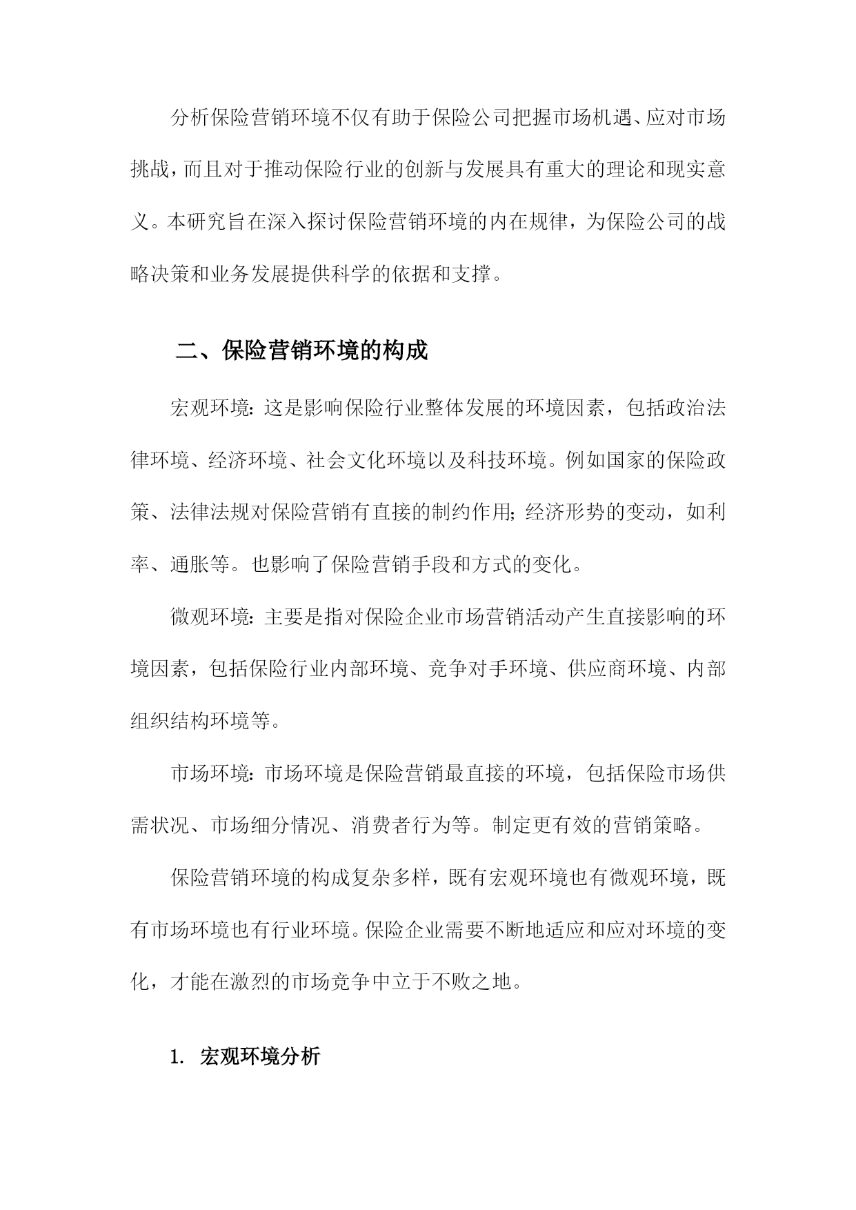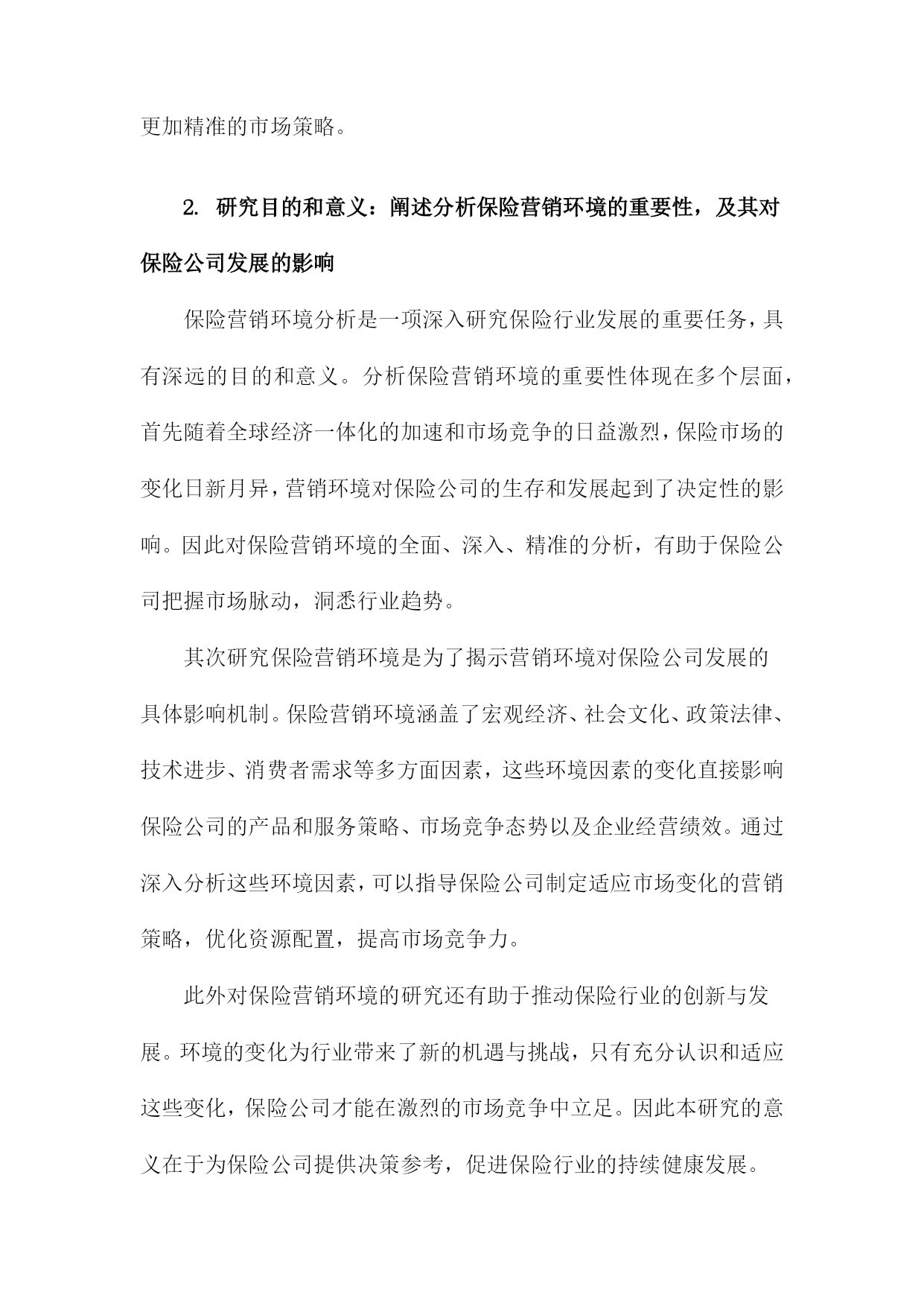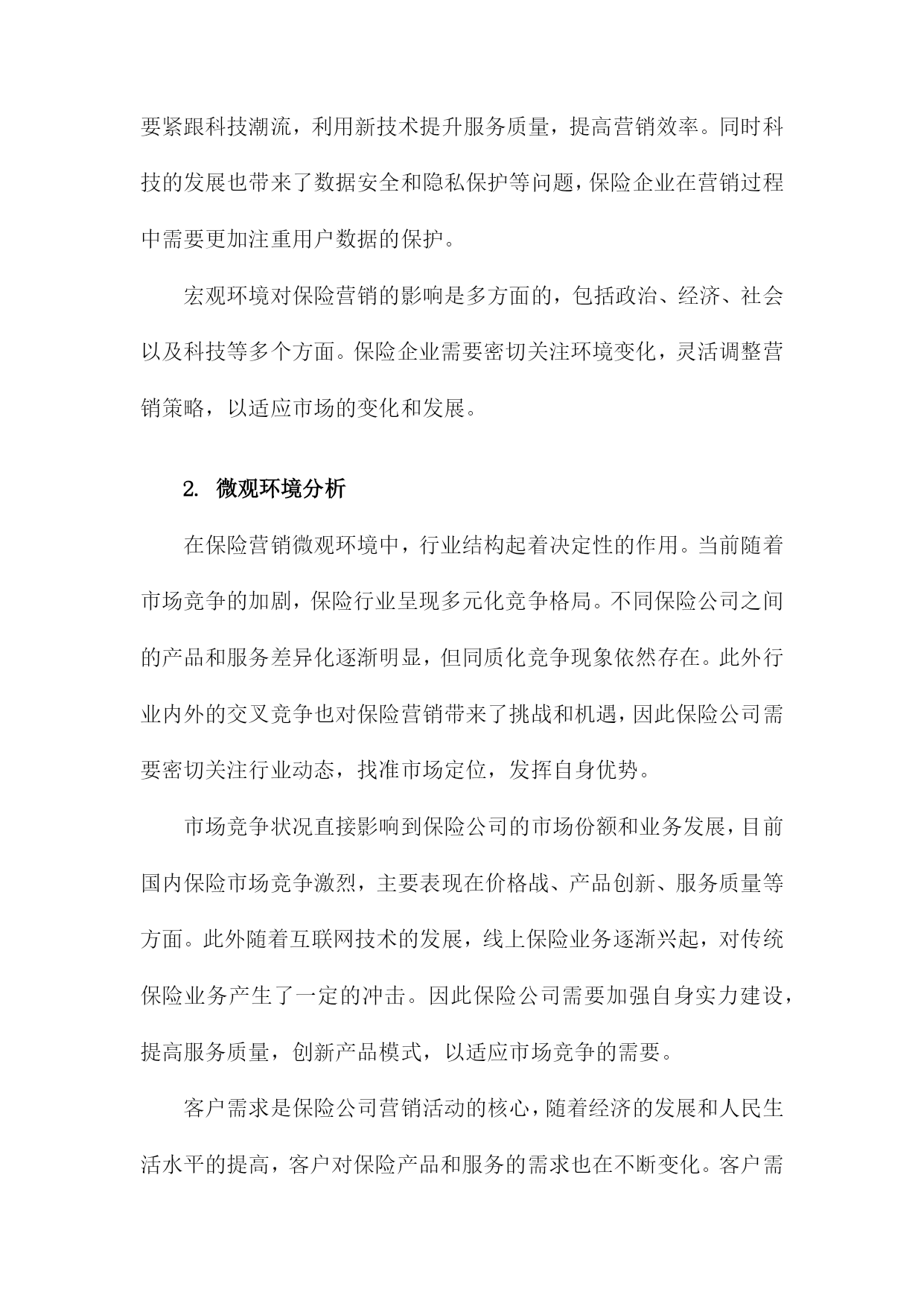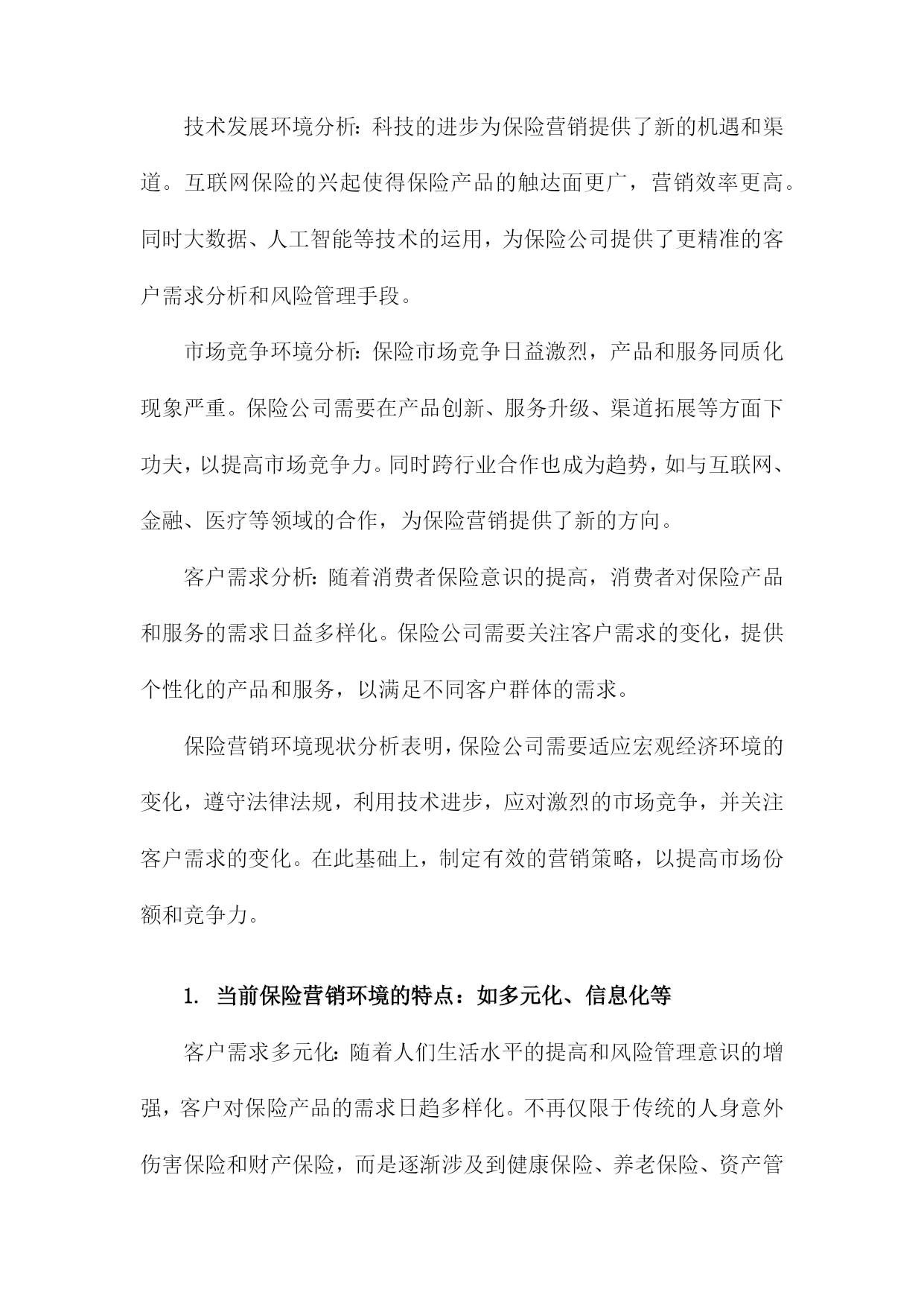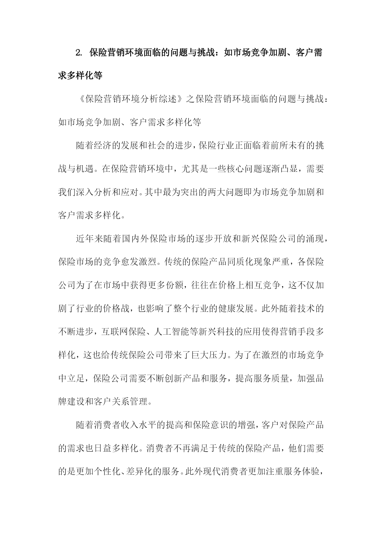 保险营销环境分析综述一、概要随着社会经济不断发展与变迁,保险行业在中国市场中的位置日益重要,与之相关的保险营销环境也在发生着深刻的变化。本篇文章旨在综合分析保险营销环境的现状及其发展趋势,探究其面临的挑战与机遇。通过对国内外保险市场的宏观环境、行业状况、竞争态势、政策法规、技术进步以及消费者需求等多方面的深入研究,文章将全面揭示当前保险营销环境的复杂性和多样性,以期为保险企业在激烈的市场竞争中寻找定位和发展方向提供有益的参考和启示。1.背景介绍:介绍当前保险市场的规模、发展现状及趋势随着全球经济的持续发展和社会进步,保险行业作为金融体系的重要组成部分,其重要性日益凸显。在当前经济形势下,保险市场的规模持续扩大,呈现出蓬勃的发展态势。保险市场的成熟与壮大不仅为国民经济贡献了巨大的增长动力,同时也为社会风险管理提供了强有力的支撑。从市场规模来看,近年来全球保险市场呈现稳步增长的态势。各类保险产品需求的增加以及投保意识的提高使得保险市场规模持续扩大。尤其是在新兴经济体和发展中国家,由于城市化进程加快、人均收入提高以及科技应用等因素的推动,保险市场的增长潜力巨大。同时国际知名保险公司的积极参与也加速了市场竞争的激烈程度,推动了市场总体规模的扩张。从发展现状来看,当前保险市场呈现多元化和个性化的特点。一方面随着社会分工的细化以及消费群体需求的多样化,保险产品也在不断创新和丰富,包括健康险、寿险、财产险等多个领域都在不断拓展和深化。另一方面互联网技术的广泛应用使得线上保险业务成为新的增长点,推动了保险行业的数字化转型。此外人工智能、大数据等新兴技术的应用也在重塑保险行业的服务模式和管理模式。从未来趋势来看,保险市场将继续保持快速发展的态势。随着国民经济的发展和消费升级,人们对风险的认识将更加深入,投保意识将持续提高。同时科技的应用将不断推动保险行业的创新和发展,特别是在数字化、智能化方面,未来保险行业将更加注重客户体验和服务质量,通过技术创新提升服务水平和竞争力。此外随着全球经济一体化的深入发展,国际保险市场的合作与交流将更加频繁,为保险市场的开放和国际化发展提供了广阔的空间。当前保险市场规模持续扩大,呈现多元化和个性化的发展趋势,未来在科技进步的推动下将呈现出更加广阔的发展前景。在这样的背景下,保险公司需要紧密关注市场动态,加强营销环境分析,以制定更加精准的市场策略。2.研究目的和意义:阐述分析保险营销环境的重要性,及其对保险公司发展的影响保险营销环境分析是一项深入研究保险行业发展的重要任务,具有深远的目的和意义。分析保险营销环境的重要性体现在多个层面,首先随着全球经济一体化的加速和市场竞争的日益激烈,保险市场的变化日新月异,营销环境对保险公司的生存和发展起到了决定性的影响。因此对保险营销环境的全面、深入、精准的分析,有助于保险公司把握市场脉动,洞悉行业趋势。其次研究保险营销环境是为了揭示营销环境对保险公司发展的具体影响机制。保险营销环境涵盖了宏观经济、社会文化、政策法律、技术进步、消费者需求等多方面因素,这些环境因素的变化直接影响保险公司的产品和服务策略、市场竞争态势以及企业经营绩效。通过深入分析这些环境因素,可以指导保险公司制定适应市场变化的营销策略,优化资源配置,提高市场竞争力。此外对保险营销环境的研究还有助于推动保险行业的创新与发展。环境的变化为行业带来了新的机遇与挑战,只有充分认识和适应这些变化,保险公司才能在激烈的市场竞争中立足。因此本研究的意义在于为保险公司提供决策参考,促进保险行业的持续健康发展。分析保险营销环境不仅有助于保险公司把握市场机遇、应对市场挑战,而且对于推动保险行业的创新与发展具有重大的理论和现实意义。本研究旨在深入探讨保险营销环境的内在规律,为保险公司的战略决策和业务发展提供科学的依据和支撑。二、保险营销环境的构成宏观环境:这是影响保险行业整体发展的环境因素,包括政治法律环境、经济环境、社会文化环境以及科技环境。例如国家的保险政策、法律法规对保险营销有直接的制约作用;经济形势的变动,如利率、通胀等。也影响了保险营销手段和方式的变化。微观环境:主要是指对保险企业市场营销活动产生直接影响的环境因素,包括保险行业内部环境、竞争对手环境、供应商环境、内部组织结构环境等。市场环境:市场环境是保险营销最直接的环境,包括保险市场供需状况、市场细分情况、消费者行为等。制定更有效的营销策略。保险营销环境的构成复杂多样,既有宏观环境也有微观环境,既有市场环境也有行业环境。保险企业需要不断地适应和应对环境的变化,才能在激烈的市场竞争中立于不败之地。1.宏观环境分析在当前全球经济一体化的宏观环境下,保险营销行业面临着前所未有的机遇与挑战。宏观环境对于保险营销的影响深远且多元,包括政治、经济、