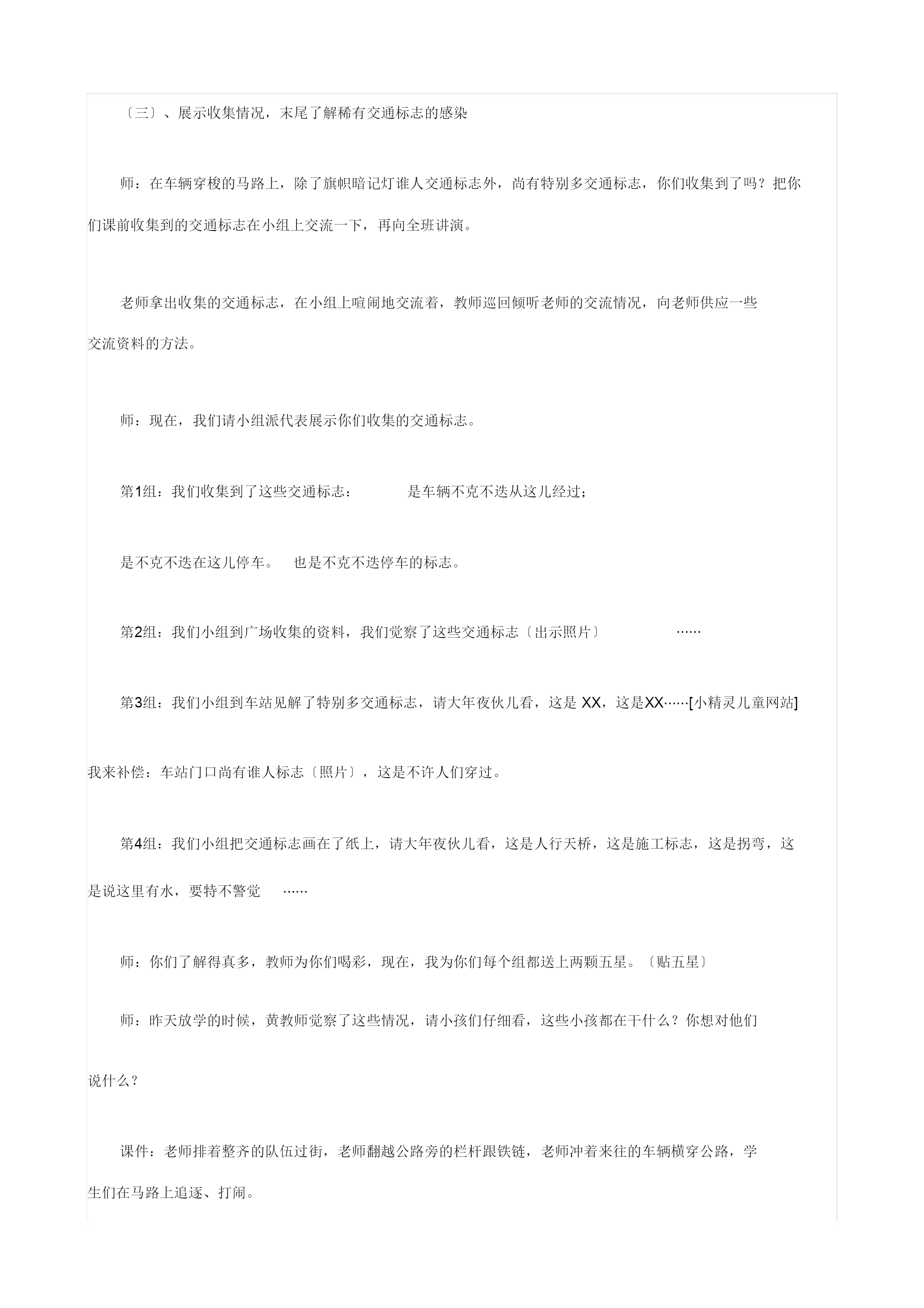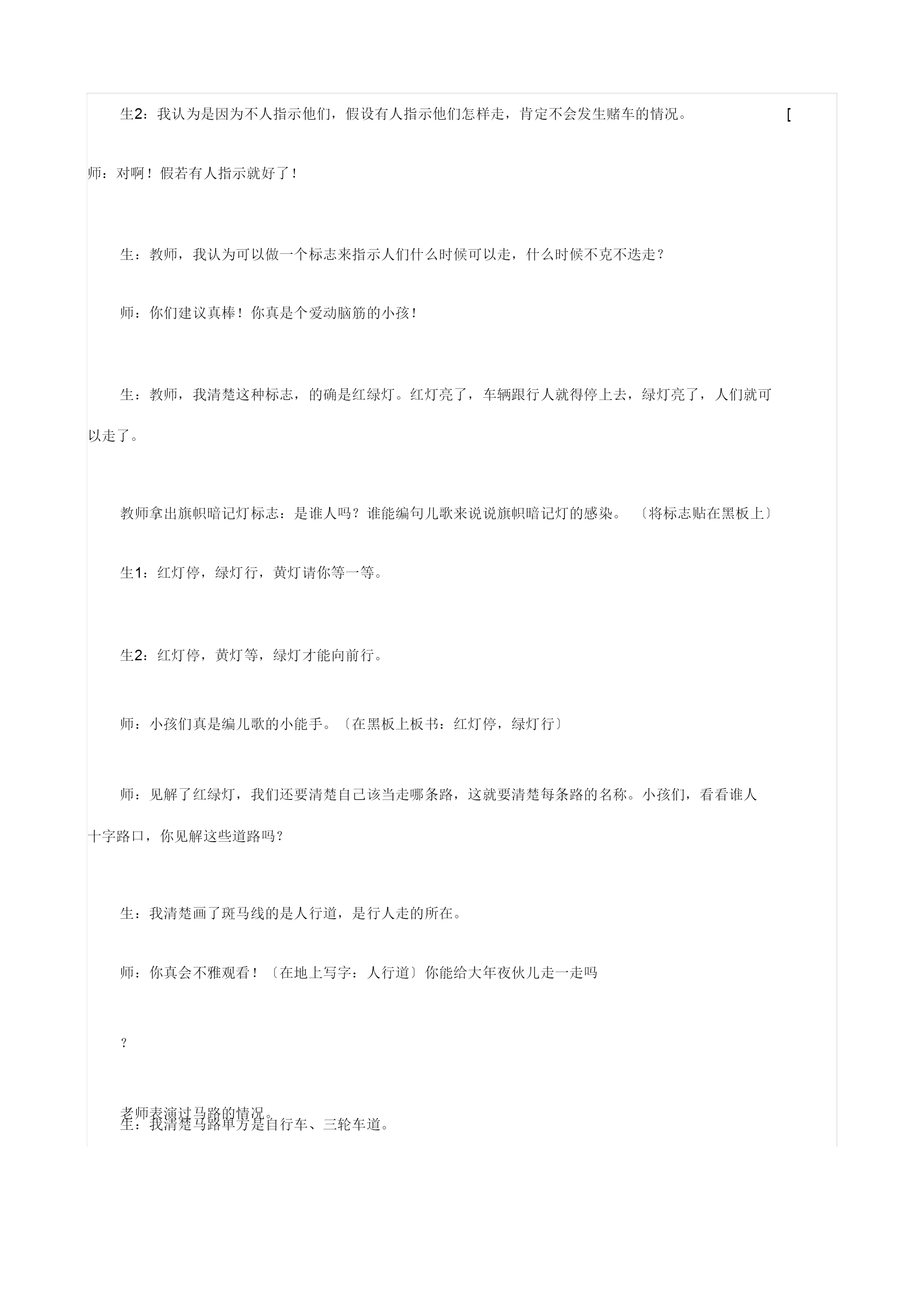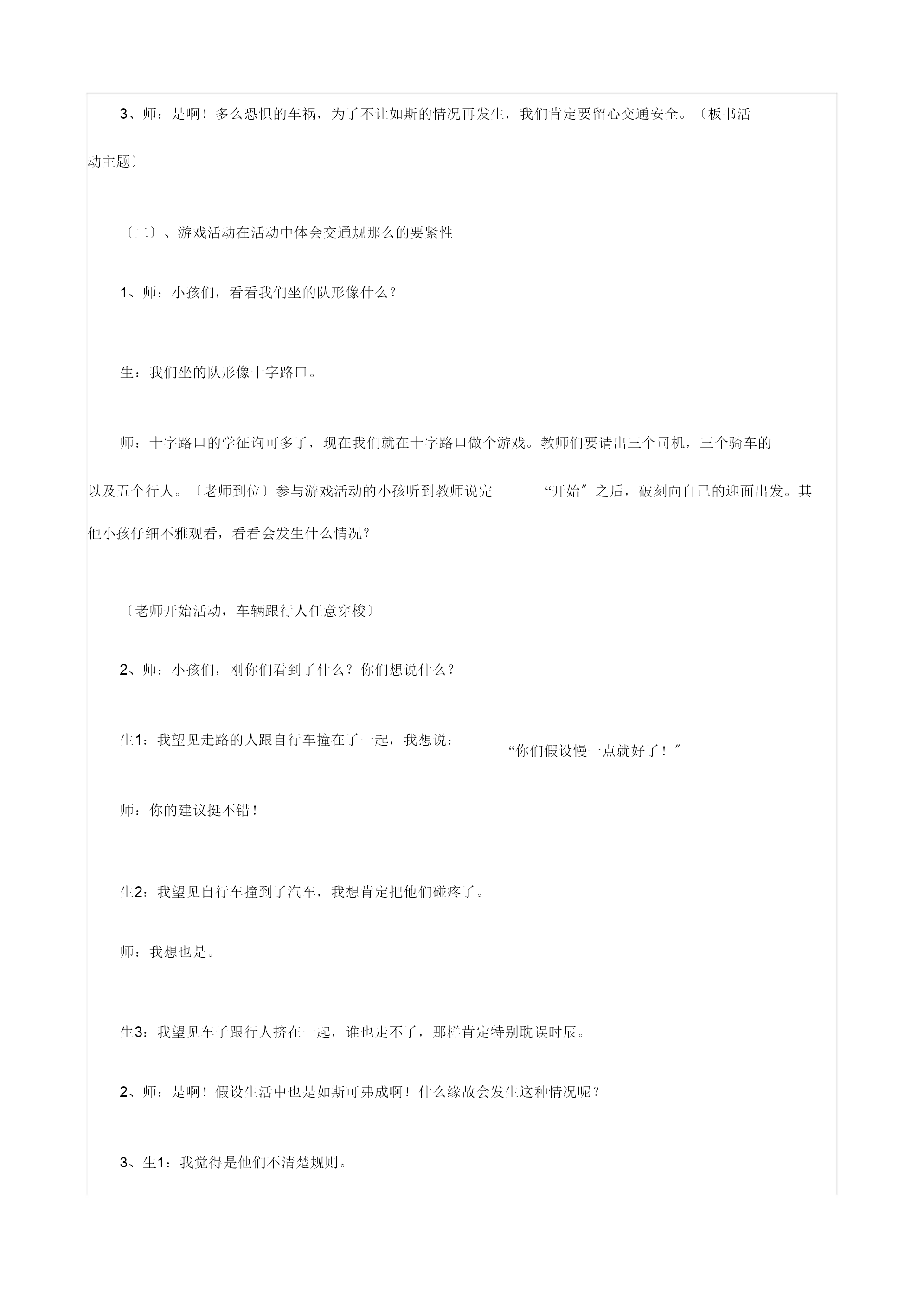 留心交通安全主题班会一、活动目标:二、1、让老师在交流活动中见解一些稀有的交通标志。三、2、让老师在游戏活动中闭会交通规那么的要紧性,从而自觉地遵守交通规那么。四、3、让老师在合作深造中学得一些全然的深造方法。二、学情分析:老师们喜欢跟过错停顿交流,喜欢游戏活动,喜欢在活动中展示自己。三、指导策略:1、以活动贯穿全课。2、让老师在游戏活动中闭会跟感悟。3、将交警请到课堂,实现课堂的开放性4、在交流合作中实现活动的有效互动。四、活动准备:。1、老师准备游戏活动所需的各种玩具车辆〔自行车、汽车〕。2、全心布置活动场景。3、老师收集各种交通标志〔照片或图片〕。4、活动涉及的相关课件。五、课堂活动实录:〔一〕展开遥想,提示活动主题1、师:小孩们,改日我们要展开一次有意思的活动。我们将全班分为8个组停顿比赛,你们有决计吗?生:有决计!2、师:特别好!在活动之前,请小孩们先看大年夜屏幕。课件出现:各种车辆的喧闹声,接着是紧急刹车的声音,然后是人们的尖叫声,屏幕由黑色逐渐变成鲜白色。老师仔细肠听着,仔细肠看着⋯⋯师:小孩们,刚你们看到了什么?听到了什么?想到了什么?生1:我听到了汽车的嗽叭声,还听到了刹车的声音。生2:我还听见了一集团的尖叫声,我望见了血流出来了。生:我好像看到了一场车祸,人被压去世在汽车内面。3、师:是啊!多么恐惧的车祸,为了不让如斯的情况再发生,我们肯定要留心交通安全。〔板书活动主题〕〔二〕、游戏活动在活动中体会交通规那么的要紧性1、师:小孩们,看看我们坐的队形像什么?生:我们坐的队形像十字路口。师:十字路口的学征询可多了,现在我们就在十字路口做个游戏。教师们要请出三个司机,三个骑车的以及五个行人。〔老师到位〕参与游戏活动的小孩听到教师说完他小孩仔细不雅观看,看看会发生什么情况?“开始〞之后,破刻向自己的迎面出发。其〔老师开始活动,车辆跟行人任意穿梭〕2、师:小孩们,刚你们看到了什么?你们想说什么?生1:我望见走路的人跟自行车撞在了一起,我想说:师:你的建议挺不错!“你们假设慢一点就好了!〞生2:我望见自行车撞到了汽车,我想肯定把他们碰疼了。师:我想也是。生3:我望见车子跟行人挤在一起,谁也走不了,那样肯定特别耽误时辰。2、师:是啊!假设生活中也是如斯可弗成啊!什么缘故会发生这种情况呢?3、生1:我觉得是他们不清楚规则。生2:我认为是因为不人指示他们,假设有人指示他们怎样走,肯定不会发生赌车的情况。师:对啊!假若有人指示就好了![生:教师,我认为可以做一个标志来指示人们什么时候可以走,什么时候不克不迭走?师:你们建议真棒!你真是个爱动脑筋的小孩!生:教师,我清楚这种标志,的确是红绿灯。红灯亮了,车辆跟行人就得停上去,绿灯亮了,人们就可以走了。教师拿出旗帜暗记灯标志:是谁人吗?谁能编句儿歌来说说旗帜暗记灯的感染。生1:红灯停,绿灯行,黄灯请你等一等。〔将标志贴在黑板上〕生2:红灯停,黄灯等,绿灯才能向前行。师:小孩们真是编儿歌的小能手。〔在黑板上板书:红灯停,绿灯行〕师:见解了红绿灯,我们还要清楚自己该当走哪条路,这就要清楚每条路的名称。小孩们,看看谁人十字路口,你见解这些道路吗?生:我清楚画了斑马线的是人行道,是行人走的所在。师:你真会不雅观看!〔在地上写字:人行道〕你能给大年夜伙儿走一走吗?老师表演过马路的情况。生:我清楚马路单方是自行车、三轮车道。师:骑自行车的小孩清楚了吗?这才是你们的道路,我们称为非灵敏车道。〔在地上写字:非灵敏车道〕生:我还清楚中间的是汽车道。师:你真能干!〔写上:汽车道〕4、师:各位司机冤家,各位行人,尚有骑车胆小鬼们,现在你们清楚自己该当走的位置了吗?你们能在旗帜暗记灯的指示下给大年夜伙儿表演一下吗?生:能!〔老师到达各自的道路〕师:现在,我们要请出两位同学来指示红绿灯。老师到位,指示红绿灯,老师们顺利地经过了十字路口。师:小孩们,现在你们想说什么?生1:这一次大年夜伙儿都特别快到达了迎面。生2:红绿灯的感染可真大年夜啊!生3:我又想到一句儿歌:红灯停,绿灯行,斑马线上可通行。师:你真是个爱动脑筋的小孩。〔板书:斑马线上可通行〕生4:我也想在红绿灯的指示下做游戏。师:好吧!我们再让一些小孩来表演一次。老师热情高昂,积极投入到游戏活动中。〔三〕、展示收集情况,末尾了解稀有交通标志的感染师:在车辆穿梭的马路上,除了旗帜暗记灯谁人交通标志外,尚有特别多交通标志,你们收集到了吗?把你们课前收集到的交通标志在小组上交流一下,再向全班讲演。老师拿出收集的交通标志,在小组上喧闹地交流着,教师巡回倾听老师的交流