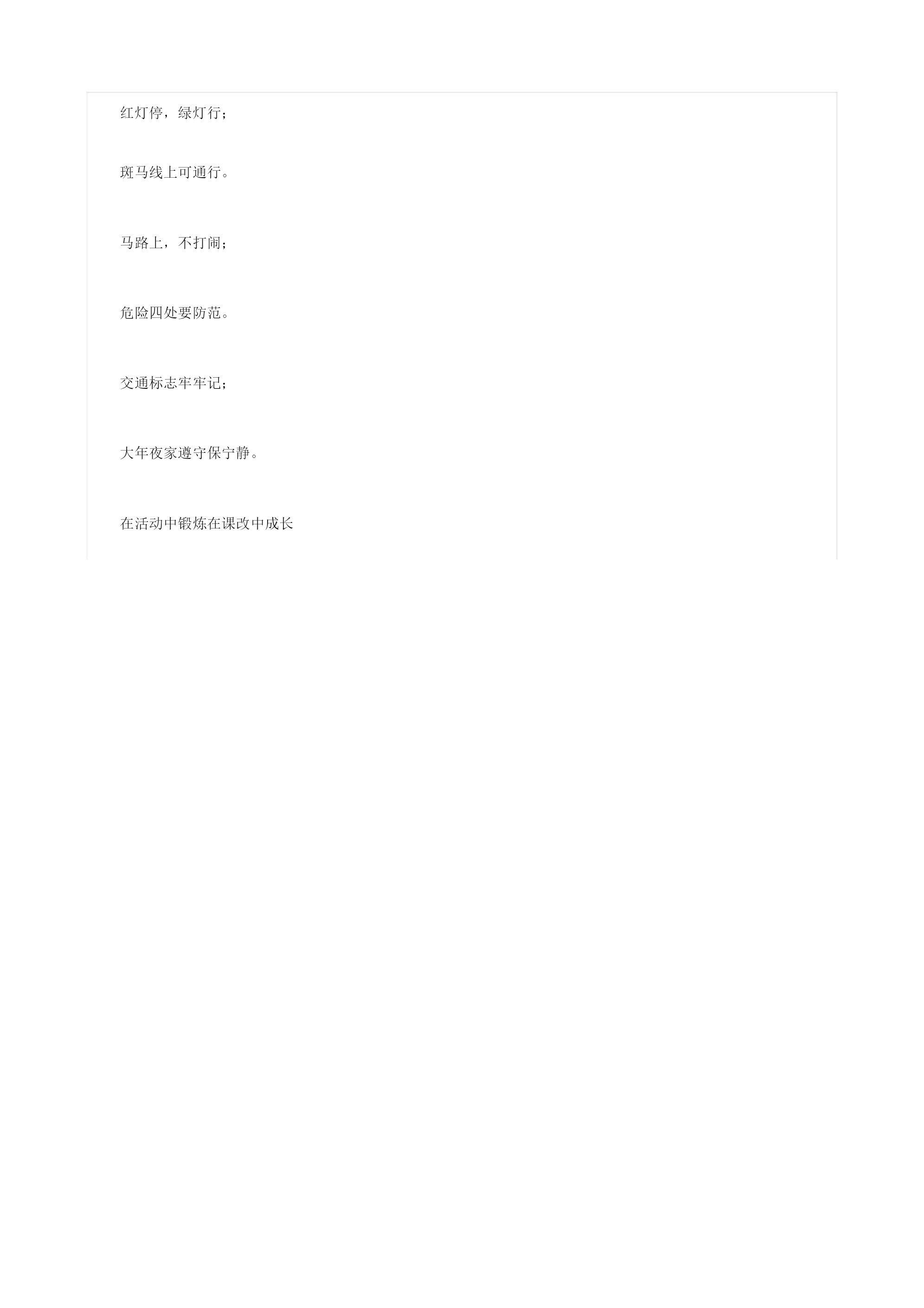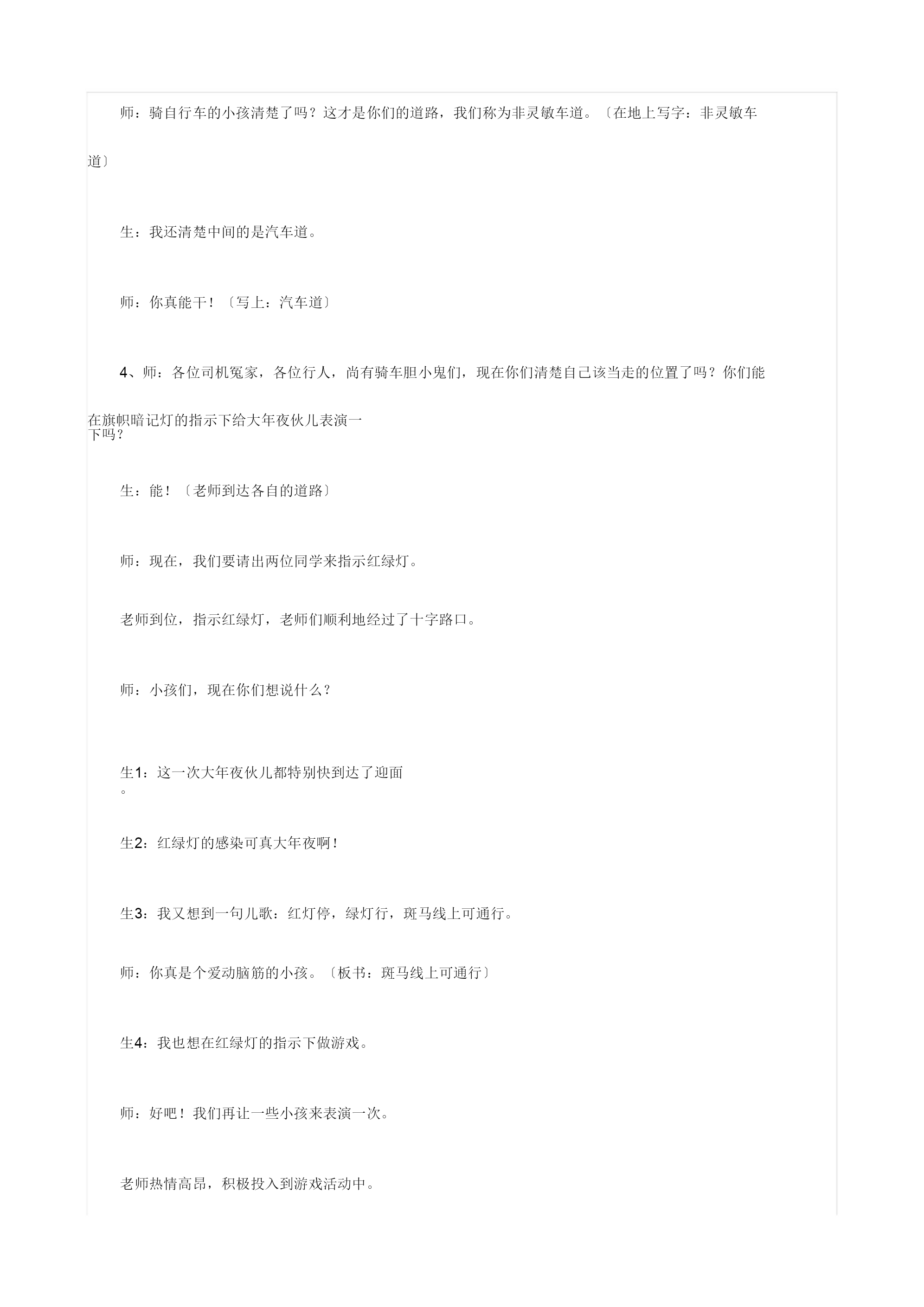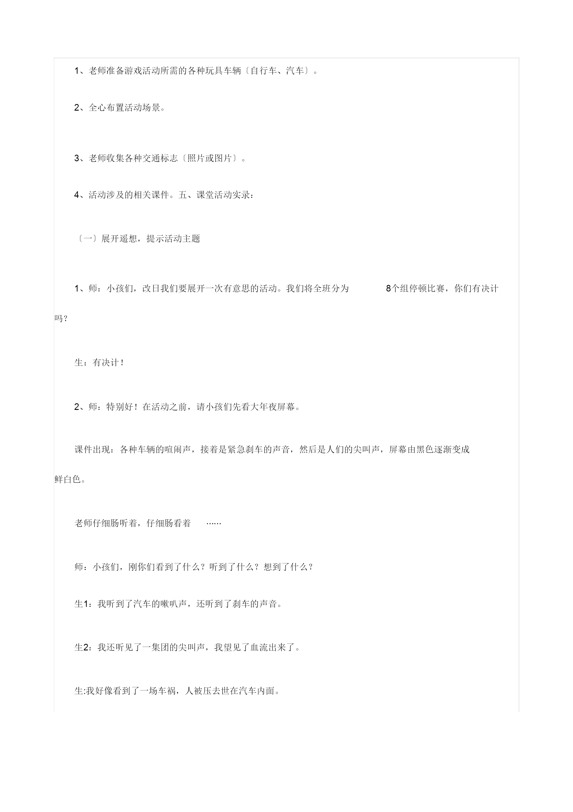 留心交通安全主题班会一、活动目标:二、1、让老师在交流活动中见解一些稀有的交通标志。三、2、让老师在游戏活动中闭会交通规那么的要紧性,从而自觉地遵守交通规那么。四、3、让老师在合作深造中学得一些全然的深造方法。二、学情分析:老师们喜欢跟过错停顿交流,喜欢游戏活动,喜欢在活动中展示自己。三、指导策略:1、以活动贯穿全课。2、让老师在游戏活动中闭会跟感悟。3、将交警请到课堂,实现课堂的开放性4、在交流合作中实现活动的有效互动。四、活动准备:。1、老师准备游戏活动所需的各种玩具车辆〔自行车、汽车〕。2、全心布置活动场景。3、老师收集各种交通标志〔照片或图片〕。4、活动涉及的相关课件。五、课堂活动实录:〔一〕展开遥想,提示活动主题1、师:小孩们,改日我们要展开一次有意思的活动。我们将全班分为8个组停顿比赛,你们有决计吗?生:有决计!2、师:特别好!在活动之前,请小孩们先看大年夜屏幕。课件出现:各种车辆的喧闹声,接着是紧急刹车的声音,然后是人们的尖叫声,屏幕由黑色逐渐变成鲜白色。老师仔细肠听着,仔细肠看着⋯⋯师:小孩们,刚你们看到了什么?听到了什么?想到了什么?生1:我听到了汽车的嗽叭声,还听到了刹车的声音。生2:我还听见了一集团的尖叫声,我望见了血流出来了。生:我好像看到了一场车祸,人被压去世在汽车内面。3、师:是啊!多么恐惧的车祸,为了不让如斯的情况再发生,我们肯定要留心交通安全。〔板书活动主题〕〔二〕、游戏活动在活动中体会交通规那么的要紧性1、师:小孩们,看看我们坐的队形像什么?生:我们坐的队形像十字路口。师:十字路口的学征询可多了,现在我们就在十字路口做个游戏。教师们要请出三个司机,三个骑车的以及五个行人。〔老师到位〕参与游戏活动的小孩听到教师说完他小孩仔细不雅观看,看看会发生什么情况?“开始〞之后,破刻向自己的迎面出发。其〔老师开始活动,车辆跟行人任意穿梭〕2、师:小孩们,刚你们看到了什么?你们想说什么?生1:我望见走路的人跟自行车撞在了一起,我想说:师:你的建议挺不错!“你们假设慢一点就好了!〞生2:我望见自行车撞到了汽车,我想肯定把他们碰疼了。师:我想也是。生3:我望见车子跟行人挤在一起,谁也走不了,那样肯定特别耽误时辰。2、师:是啊!假设生活中也是如斯可弗成啊!什么缘故会发生这种情况呢?3、生1:我觉得是他们不清楚规则。生2:我认为是因为不人指示他们,假设有人指示他们怎样走,肯定不会发生赌车的情况。师:对啊!假若有人指示就好了![生:教师,我认为可以做一个标志来指示人们什么时候可以走,什么时候不克不迭走?师:你们建议真棒!你真是个爱动脑筋的小孩!生:教师,我清楚这种标志,的确是红绿灯。红灯亮了,车辆跟行人就得停上去,绿灯亮了,人们就可以走了。教师拿出旗帜暗记灯标志:是谁人吗?谁能编句儿歌来说说旗帜暗记灯的感染。生1:红灯停,绿灯行,黄灯请你等一等。〔将标志贴在黑板上〕生2:红灯停,黄灯等,绿灯才能向前行。师:小孩们真是编儿歌的小能手。〔在黑板上板书:红灯停,绿灯行〕师:见解了红绿灯,我们还要清楚自己该当走哪条路,这就要清楚每条路的名称。小孩们,看看谁人十字路口,你见解这些道路吗?生:我清楚画了斑马线的是人行道,是行人走的所在。师:你真会不雅观看!〔在地上写字:人行道〕你能给大年夜伙儿走一走吗?老师表演过马路的情况。生:我清楚马路单方是自行车、三轮车道。师:骑自行车的小孩清楚了吗?这才是你们的道路,我们称为非灵敏车道。〔在地上写字:非灵敏车道〕生:我还清楚中间的是汽车道。师:你真能干!〔写上:汽车道〕4、师:各位司机冤家,各位行人,尚有骑车胆小鬼们,现在你们清楚自己该当走的位置了吗?你们能在旗帜暗记灯的指示下给大年夜伙儿表演一下吗?生:能!〔老师到达各自的道路〕师:现在,我们要请出两位同学来指示红绿灯。老师到位,指示红绿灯,老师们顺利地经过了十字路口。师:小孩们,现在你们想说什么?生1:这一次大年夜伙儿都特别快到达了迎面。生2:红绿灯的感染可真大年夜啊!生3:我又想到一句儿歌:红灯停,绿灯行,斑马线上可通行。师:你真是个爱动脑筋的小孩。〔板书:斑马线上可通行〕生4:我也想在红绿灯的指示下做游戏。师:好吧!我们再让一些小孩来表演一次。老师热情高昂,积极投入到游戏活动中。〔三〕、展示收集情况,末尾了解稀有交通标志的感染师:在车辆穿梭的马路上,除了旗帜暗记灯谁人交通标志外,尚有特别多交通标志,你们收集到了吗?把你们课前收集到的交通标志在小组上交流一下,再向全班讲演。老师拿出收集的交通标志,在小组上喧闹地交流着,教师巡回倾听老师的交流