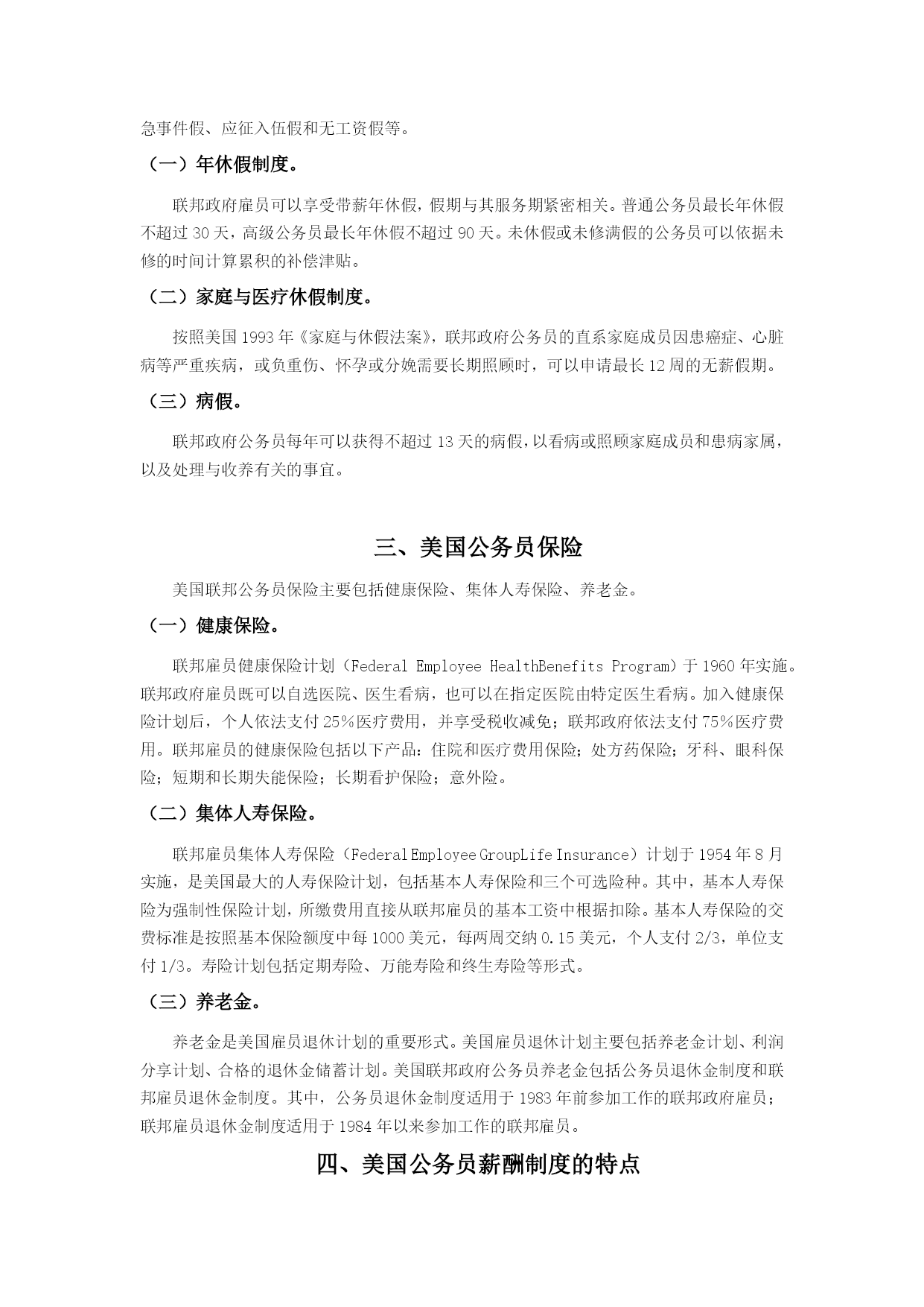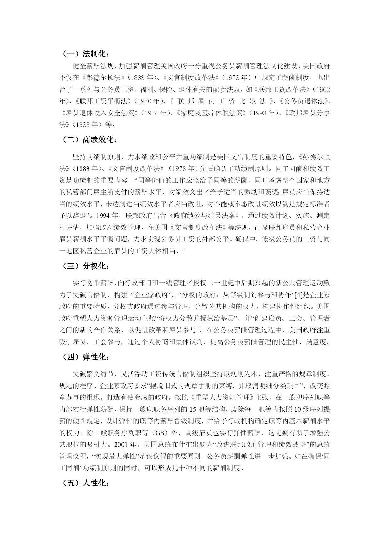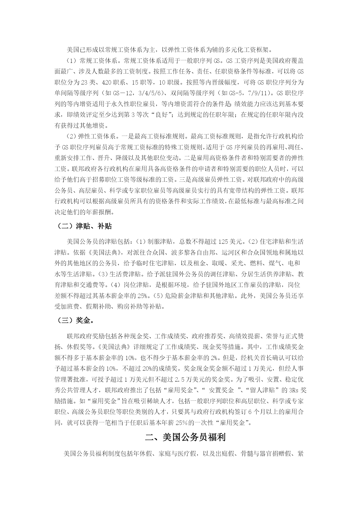 美国公务员薪酬制度及其启示最新文档(可以直接使用,可编辑最新文档,欢迎下载)美国公务员薪酬制度及对中国的启示陈恒(浙江海洋学院石化与能源工程学院A10储运班)【摘要】按照《中华人民共和国公务员法》,公务员,是指依法履行公职、纳入国家行政编制、由国家财政负担工资福利的工作人员。本文基于美国公务员分类管理,阐述了包含工资、福利、保险在内的美国公务员薪酬基本框架。结合美国公务员薪酬的特点,以及我国公共部门薪酬制度现状,本文提出了我国公务员薪酬制度改革的对策和建议。【关键词】美国;公务员;薪酬;职位;绩效前言获得薪酬,是公务员享有的法定权利。薪酬主要包括工资、福利、保险等。作为公务员制度的重要组成部分,美国公务员薪酬制度不仅体现了公共部门人力资源管理特色,也吸收了企业人力资源薪酬管理的先进成果。当前,我国正致力于理顺收入分配关系,构建具有稳定性、灵活性、竞争性的公务员薪酬制度尤为重要。有必要结合我国国情,学习和借鉴美国公务员薪酬制度的合理成分,推动我国公务员薪酬制度变革。美国公务员薪酬制度结构分类管理是公务员薪酬制度的前提和基础。1923年,美国国会颁发《联邦政府职位分类法》,并确立了同工同酬的薪酬原则。1949年,美国国会修订《联邦政府职位分类法》,将公务员职位归纳为:一般职位序列(GS),共分为18职等;二是技艺保管序列(GPS),共10职等。此外,按照雇用期限,可将政府雇员分为永久雇员、临时雇员;按照工作方式,可将政府雇员分为全职雇员和非全职雇员。一、美国公务员工资目前,美国联邦政府共有30多个工资系统。公务员工资包括法定工资制度和其他工资制度。(1)法定工资制度,适用于白领雇员,包括GS工资序列;外交人员工资序列;退伍军人健康管理人员工资序列。(2)其他工资制度,主要包括:适用于高级公务员的工资序ES、SES的联邦工资序列FWS;行政法规决定的工资序列AD。20世纪中后期,随着重塑人力资源管理运动的开展,美国公务员工资制度不断变革。美国是联邦制国家,联邦务员的工资由专门的联邦工资账户支付,而各州、县、市公务员的工资,则由本级政府财政负担。(一)基本工资美国已形成以常规工资体系为主,以弹性工资体系为辅的多元化工资框架。(1)常规工资体系。常规工资体系适用于一般职序列GS。GS工资序列是美国政府覆盖面最广、涉及人数最多的工资制度。按照工作任务、责任、任职资格条件等标准,可以将GS职位分为23类、420职系、15职等,10职级。按照等内晋级幅度,可将GS职位序列分为单间隔等级序列(如GS-12,3/4/5/6)、双间隔等级序列(如GS-5,7/9/11)。GS职位序列的等内增资适用于永久性职位雇员,等内增资需符合的条件是:绩效能力应该达到基本要求,即绩效评定至少达到第3等次“良好”;达到规定的任职年限;在规定的任职年限内没有获得过其他增资。(2)弹性工资体系。一是最高工资标准规则。最高工资标准规则,是指允许行政机构给予GS职位序列雇员高于常规工资标准的特殊工资规则,适用于GS序列雇员的再雇用、凋任、重新安排工作、晋升、降级以及其他职位变动。二是雇用高资格条件者和特别需要者的弹性工资。联邦政府各行政机构在雇用具备高资格条件的申请者和特别需要的职位人员时,可以给予他们高于招募职位工资等级标准的工资。三是高级雇员弹性工资。对联邦政府中的高级公务员、高层雇员、科学或专家职位雇员等高级雇员实行的具有宽带结构的弹性工资。联邦行政机构可以根据高级雇员所具有的资格条件和实际工作绩效,在最低标准与最高标准之间决定他们的年薪报酬。(二)津贴、补贴美国公务员的津贴包括:(1)制服津贴,总数不得超过125美元。(2)住宅津贴和生活津贴。依据《美国法典》,对派往合众国、波多黎各自由邦、运河区和合众国领地和属地以外的其他地区的公务员,给予临时住宅津贴,以及租金、取暖、采光、燃料、煤气、电和水等生活津贴。(3)生活费津贴。给予派驻国外公务员的调任津贴、分居生活供养津贴、教育津贴和交通费等。(4)岗位津贴,是根据环境,给予驻国外地区工作雇员的津贴,岗位差额不得超过其基本薪金率的25%。(5)危险薪金津贴和其他津贴。此外,美国公务员还享受加班费、假期补助、购房补助等补贴。(三)奖金。联邦政府奖励包括各种现金奖、工作成绩奖、政府推荐奖、高绩效提薪、荣誉与正式赞扬、休假奖等。《美国法典》详细规定了工作成绩奖、现金奖等措施。其中,工作成绩奖金额不得多于基本薪金率的10%,也不得少于基本薪金率的2%。但是,经机关首长确认可以给予超过基本薪金的10%,不超过20%的成绩奖。奖金现金奖金额不超过1万美元,但经人事管理署批准,可授予超过1万美元但不超过2.5万美元的奖金奖。为了吸引、安置、稳定优秀公共管理人才,联