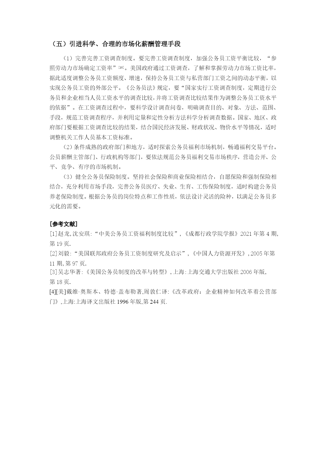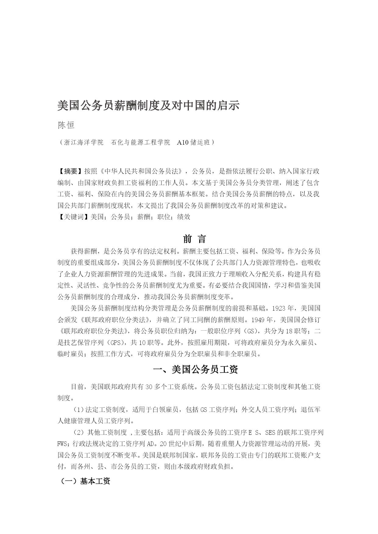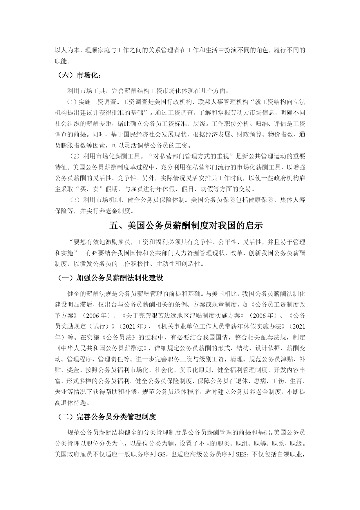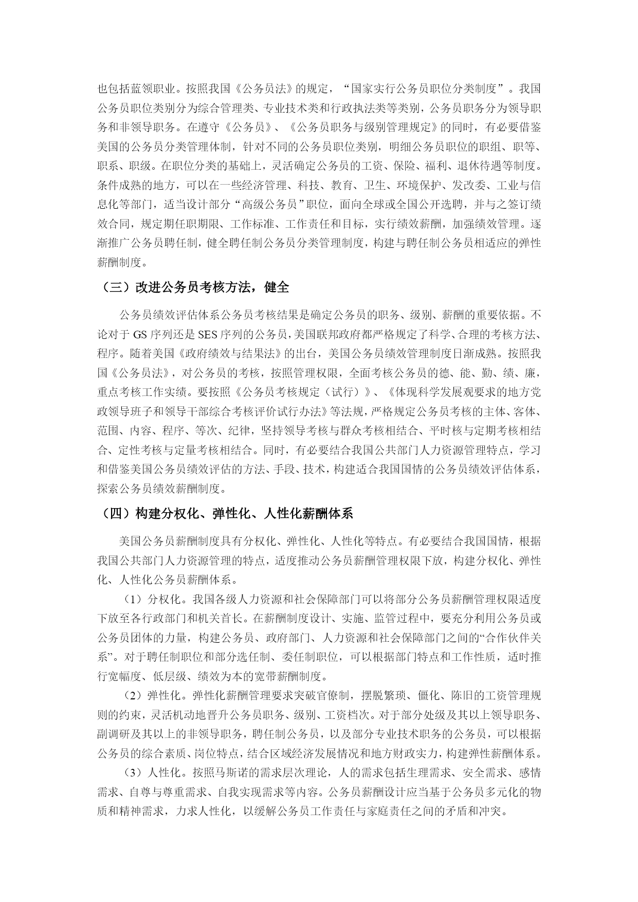 美国公务员薪酬制度及其启示最新文档(可以直接使用,可编辑最新文档,欢迎下载)美国公务员薪酬制度及对中国的启示陈恒(浙江海洋学院石化与能源工程学院A10储运班)【摘要】按照《中华人民共和国公务员法》,公务员,是指依法履行公职、纳入国家行政编制、由国家财政负担工资福利的工作人员。本文基于美国公务员分类管理,阐述了包含工资、福利、保险在内的美国公务员薪酬基本框架。结合美国公务员薪酬的特点,以及我国公共部门薪酬制度现状,本文提出了我国公务员薪酬制度改革的对策和建议。【关键词】美国;公务员;薪酬;职位;绩效前言获得薪酬,是公务员享有的法定权利。薪酬主要包括工资、福利、保险等。作为公务员制度的重要组成部分,美国公务员薪酬制度不仅体现了公共部门人力资源管理特色,也吸收了企业人力资源薪酬管理的先进成果。当前,我国正致力于理顺收入分配关系,构建具有稳定性、灵活性、竞争性的公务员薪酬制度尤为重要。有必要结合我国国情,学习和借鉴美国公务员薪酬制度的合理成分,推动我国公务员薪酬制度变革。美国公务员薪酬制度结构分类管理是公务员薪酬制度的前提和基础。1923年,美国国会颁发《联邦政府职位分类法》,并确立了同工同酬的薪酬原则。1949年,美国国会修订《联邦政府职位分类法》,将公务员职位归纳为:一般职位序列(GS),共分为18职等;二是技艺保管序列(GPS),共10职等。此外,按照雇用期限,可将政府雇员分为永久雇员、临时雇员;按照工作方式,可将政府雇员分为全职雇员和非全职雇员。一、美国公务员工资目前,美国联邦政府共有30多个工资系统。公务员工资包括法定工资制度和其他工资制度。(1)法定工资制度,适用于白领雇员,包括GS工资序列;外交人员工资序列;退伍军人健康管理人员工资序列。(2)其他工资制度,主要包括:适用于高级公务员的工资序ES、SES的联邦工资序列FWS;行政法规决定的工资序列AD。20世纪中后期,随着重塑人力资源管理运动的开展,美国公务员工资制度不断变革。美国是联邦制国家,联邦务员的工资由专门的联邦工资账户支付,而各州、县、市公务员的工资,则由本级政府财政负担。(一)基本工资美国已形成以常规工资体系为主,以弹性工资体系为辅的多元化工资框架。(1)常规工资体系。常规工资体系适用于一般职序列GS。GS工资序列是美国政府覆盖面最广、涉及人数最多的工资制度。按照工作任务、责任、任职资格条件等标准,可以将GS职位分为23类、420职系、15职等,10职级。按照等内晋级幅度,可将GS职位序列分为单间隔等级序列(如GS-12,3/4/5/6)、双间隔等级序列(如GS-5,7/9/11)。GS职位序列的等内增资适用于永久性职位雇员,等内增资需符合的条件是:绩效能力应该达到基本要求,即绩效评定至少达到第3等次“良好”;达到规定的任职年限;在规定的任职年限内没有获得过其他增资。(2)弹性工资体系。一是最高工资标准规则。最高工资标准规则,是指允许行政机构给予GS职位序列雇员高于常规工资标准的特殊工资规则,适用于GS序列雇员的再雇用、凋任、重新安排工作、晋升、降级以及其他职位变动。二是雇用高资格条件者和特别需要者的弹性工资。联邦政府各行政机构在雇用具备高资格条件的申请者和特别需要的职位人员时,可以给予他们高于招募职位工资等级标准的工资。三是高级雇员弹性工资。对联邦政府中的高级公务员、高层雇员、科学或专家职位雇员等高级雇员实行的具有宽带结构的弹性工资。联邦行政机构可以根据高级雇员所具有的资格条件和实际工作绩效,在最低标准与最高标准之间决定他们的年薪报酬。(二)津贴、补贴美国公务员的津贴包括:(1)制服津贴,总数不得超过125美元。(2)住宅津贴和生活津贴。依据《美国法典》,对派往合众国、波多黎各自由邦、运河区和合众国领地和属地以外的其他地区的公务员,给予临时住宅津贴,以及租金、取暖、采光、燃料、煤气、电和水等生活津贴。(3)生活费津贴。给予派驻国外公务员的调任津贴、分居生活供养津贴、教育津贴和交通费等。(4)岗位津贴,是根据环境,给予驻国外地区工作雇员的津贴,岗位差额不得超过其基本薪金率的25%。(5)危险薪金津贴和其他津贴。此外,美国公务员还享受加班费、假期补助、购房补助等补贴。(三)奖金。联邦政府奖励包括各种现金奖、工作成绩奖、政府推荐奖、高绩效提薪、荣誉与正式赞扬、休假奖等。《美国法典》详细规定了工作成绩奖、现金奖等措施。其中,工作成绩奖金额不得多于基本薪金率的10%,也不得少于基本薪金率的2%。但是,经机关首长确认可以给予超过基本薪金的10%,不超过20%的成绩奖。奖金现金奖金额不超过1万美元,但经人事管理署批准,可授予超过1万美元但不超过2.5万美元的奖金奖。为了吸引、安置、稳定优秀公共管理人才,联