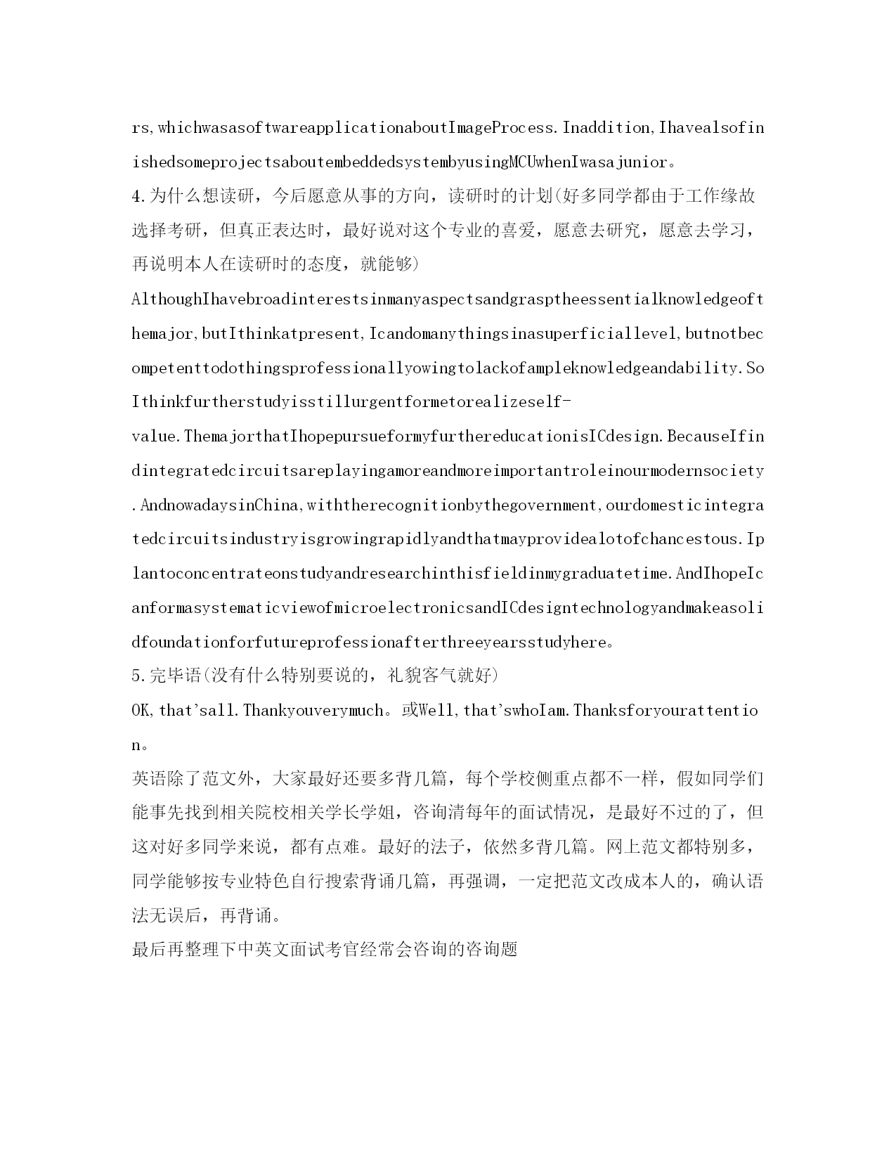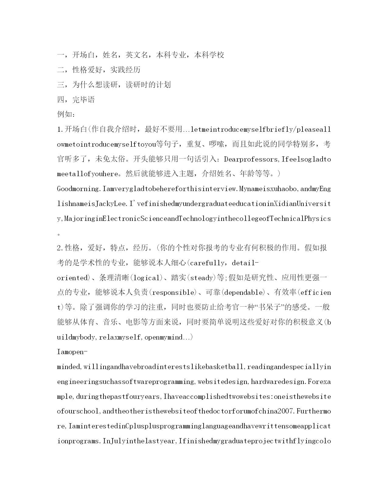研究生复试英语自我介绍参考范本研究生入学考试分为初试和复试两个环节,而面试是各高校复试必不可少的环节,也是关于考生能否顺利通过研究生考试最重要的一个环节。在复试面试当中,导师最爱咨询的咨询题之一确实是让学生做一个自我介绍。面试中的自我介绍,能够让考官观察到报名表简历等书面材料以外的内容,如你对本人的描绘与概括才能,你对本人的综合评价以及你的精神风貌等。自我介绍是学生给导师的第一印象,导师提咨询这块时特别灵敏,没有一个详细的标准。导师在现场会咨询到特别多咨询题,比方说你的个人经历,成功经历,失败经历,个人梦想,读研的计划等等。关于个人的信息一定要预备好,一定不要临时去想,由于临时想特别难组织语言,也特别难想得完满。首先同学们要留意的是,第一,落落大方,不要太过紧张,不要太敏感。第二,说话的时候语言简约,口齿清晰。态度要保持自然、友善、亲切、随和。第三充满决心,要敢于正视对方的双眼,显得胸中有数,沉着不迫。心理素养不够硬的同学,建议本人多对镜练习,这个依然能够有改良的,只要提早多多练习,到时就不会特别害怕。下面开场介绍英文部分,事实上英文部分和中文部分主题一样,简单说明确实是把汉语翻译过来就能够。但有几点要留意:1英文毕竟不是我们的母语,不要刻意求华美,省的一上场紧张全不记得了,简单自然最好。2也不要太过于滚瓜烂熟,有背稿之嫌3切记不要太长,太长容易出错。三分钟以内就能够。语速不要太快,正常语速就能够,讲太快容易把本人搞紧张的。4,心理上一定不要轻视英语面试。研究生复试的英语部分一般是由学校的公共英语或研究生公共英语教研室来考核。好点的学校,那些参与面试的导师几乎都是海龟,在国外呆了多年,他们是能够用一口流利的英语做学术报告的。假如你进去上来一口标准流利的英语,瞬间镇住各位教师。相信我,成功就在眼前了。同样,英语部分也是一样分清条理,抓住重点。一,开场白,姓名,英文名,本科专业,本科学校二,性格爱好,实践经历三,为什么想读研,读研时的计划四,完毕语例如:1.开场白(作自我介绍时,最好不要用…letmeintroducemyselfbriefly/pleaseallowmetointroducemyselftoyou等句子,重复、啰嗦,而且如此说的同学特别多,考官听多了,未免太俗。开头能够只用一句话引入:Dearprofessors,Ifeelsogladtomeetallofyouhere。然后就能够进入主题,介绍姓名、年龄等等。)Goodmorning.Iamverygladtobehereforthisinterview.Mynameisxuhaobo,andmyEnglishnameisJackyLee.I'vefinishedmyundergraduateeducationinXidianUniversity,MajoringinElectronicScienceandTechnologyinthecollegeofTechnicalPhysics。2.性格,爱好,特点,经历。(你的个性对你报考的专业有何积极的作用。假如报考的是学术性的专业,能够说本人细心(carefully,detail-oriented)、条理清晰(logical)、踏实(steady)等;假如是研究性、应用性更强一点的专业,能够说本人负责(responsible)、可靠(dependable)、有效率(efficient)等。除了强调你的学习的注重,同时也要防止给考官一种“书呆子”的感受。一般能够从体育、音乐、电影等方面来说,同时要简单说明这些爱好对你的积极意义(buildmybody,relaxmyself,openmymind…)Iamopen-minded,willingandhavebroadinterestslikebasketball,readingandespeciallyinengineeringsuchassoftwareprogramming,websitedesign,hardwaredesign.Forexample,duringthepastfouryears,Ihaveaccomplishedtwowebsites:oneisthewebsiteofourschool,andtheotheristhewebsiteofthedoctorforumofchina2007.Furthermore,IaminterestedinCplusplusprogramminglanguageandhavewrittensomeapplicationprograms.InJulyinthelastyear,Ifinishedmygraduateprojectwithflyingcolors,which