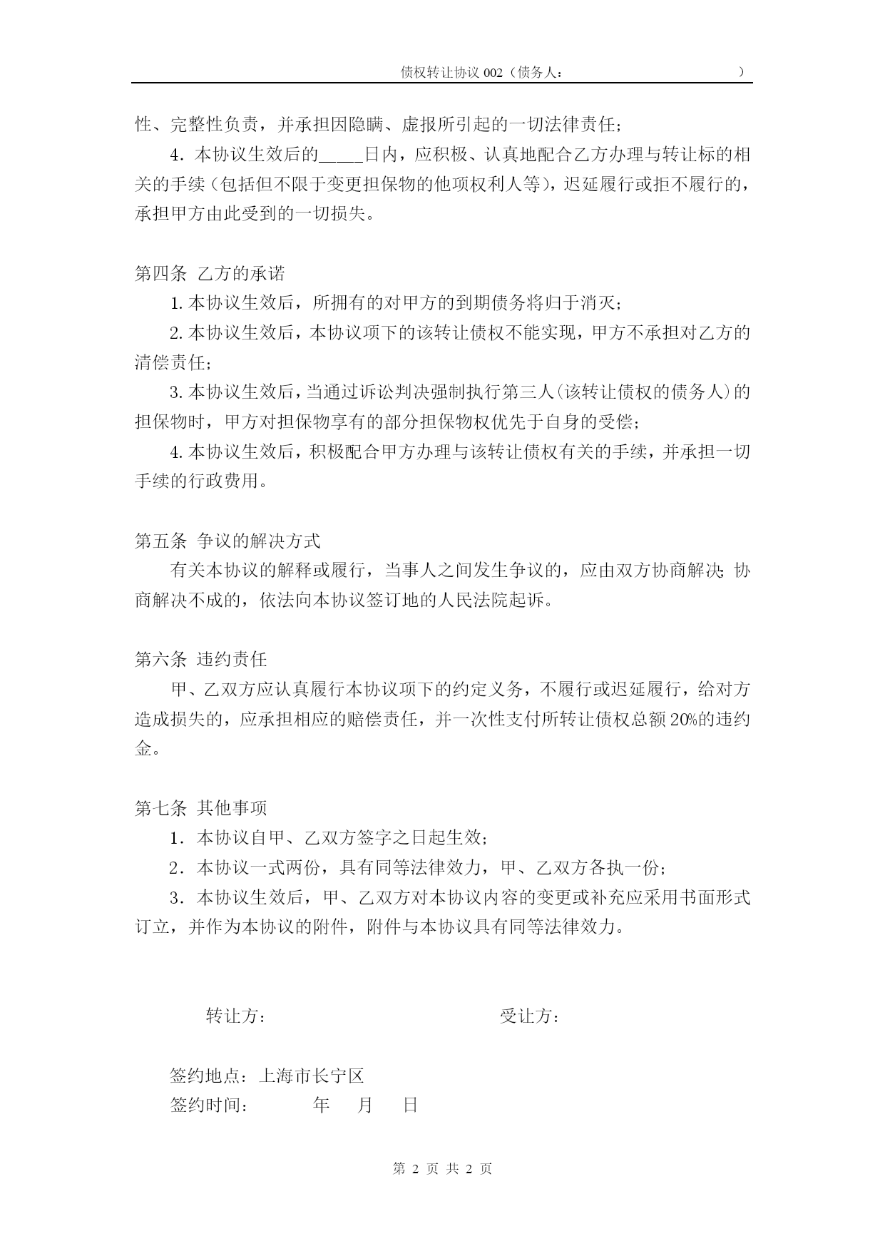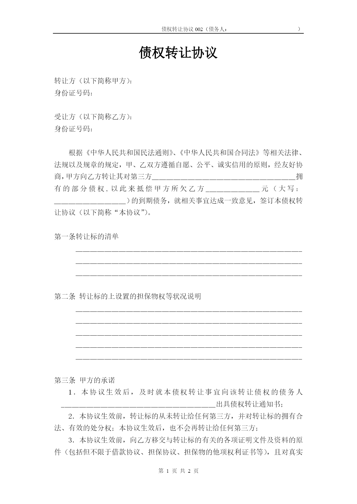 债权转让协议002(债务人:)第PAGE2页共NUMPAGES2页债权转让协议转让方(以下简称甲方):身份证号码:受让方(以下简称乙方):身份证号码:根据《中华人民共和国民法通则》、《中华人民共和国合同法》等相关法律、法规以及规章的规定,甲、乙双方遵循自愿、公平、诚实信用的原则,经友好协商,甲方向乙方转让其对第三方________________________________________拥有的部分债权,以此来抵偿甲方所欠乙方_______________元(大写:____________________)的到期债务,就相关事宜达成一致意见,签订本债权转让协议(以下简称“本协议”)。转让标的清单_____________________________________________________________________________________________________________________________________________________________________________________________第二条转让标的上设置的担保物权等状况说明___________________________________________________________________________________________________________________________________________________________________________________________________________________________________________________________________________________________________________________________第三条甲方的承诺1.本协议生效后,及时就本债权转让事宜向该转让债权的债务人___________________________________________出具债权转让通知书;2.本协议生效前,转让标的从未转让给任何第三方,并对转让标的拥有合法、有效的处分权;本协议生效后,也不会再转让给任何第三方;3.本协议生效前,向乙方移交与转让标的有关的各项证明文件及资料的原件(包括但不限于借款协议、担保协议、担保物的他项权利证书等),且对真实性、完整性负责,并承担因隐瞒、虚报所引起的一切法律责任;4.本协议生效后的_____日内,应积极、认真地配合乙方办理与转让标的相关的手续(包括但不限于变更担保物的他项权利人等),迟延履行或拒不履行的,承担甲方由此受到的一切损失。第四条乙方的承诺1.本协议生效后,所拥有的对甲方的到期债务将归于消灭;2.本协议生效后,本协议项下的该转让债权不能实现,甲方不承担对乙方的清偿责任;3.本协议生效后,当通过诉讼判决强制执行第三人(该转让债权的债务人)的担保物时,甲方对担保物享有的部分担保物权优先于自身的受偿;4.本协议生效后,积极配合甲方办理与该转让债权有关的手续,并承担一切手续的行政费用。第五条争议的解决方式有关本协议的解释或履行,当事人之间发生争议的,应由双方协商解决;协商解决不成的,依法向本协议签订地的人民法院起诉。第六条违约责任甲、乙双方应认真履行本协议项下的约定义务,不履行或迟延履行,给对方造成损失的,应承担相应的赔偿责任,并一次性支付所转让债权总额20%的违约金。第七条其他事项1.本协议自甲、乙双方签字之日起生效;2.本协议一式两份,具有同等法律效力,甲、乙双方各执一份;3.本协议生效后,甲、乙双方对本协议内容的变更或补充应采用书面形式订立,并作为本协议的附件,附件与本协议具有同等法律效力。转让方:受让方:签约地点:上海市长宁区签约时间:年月日