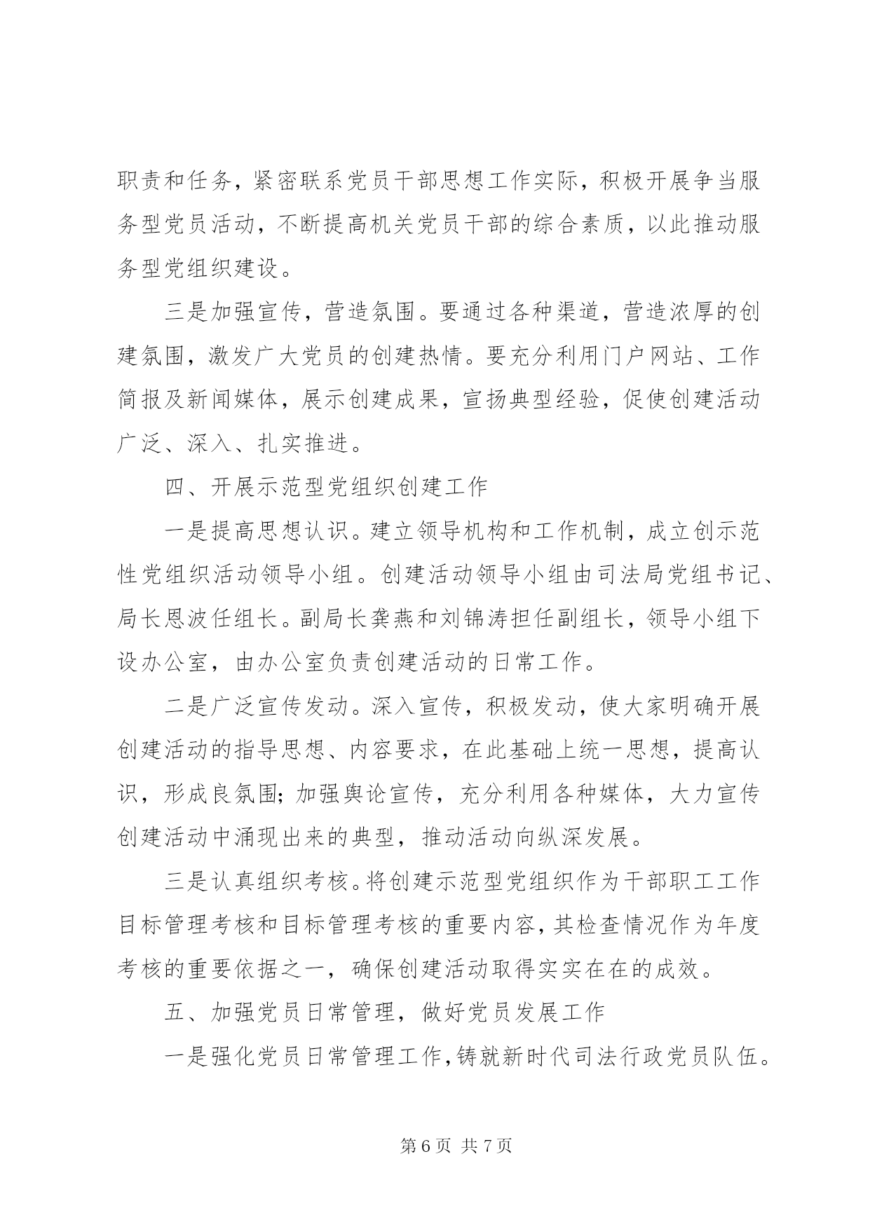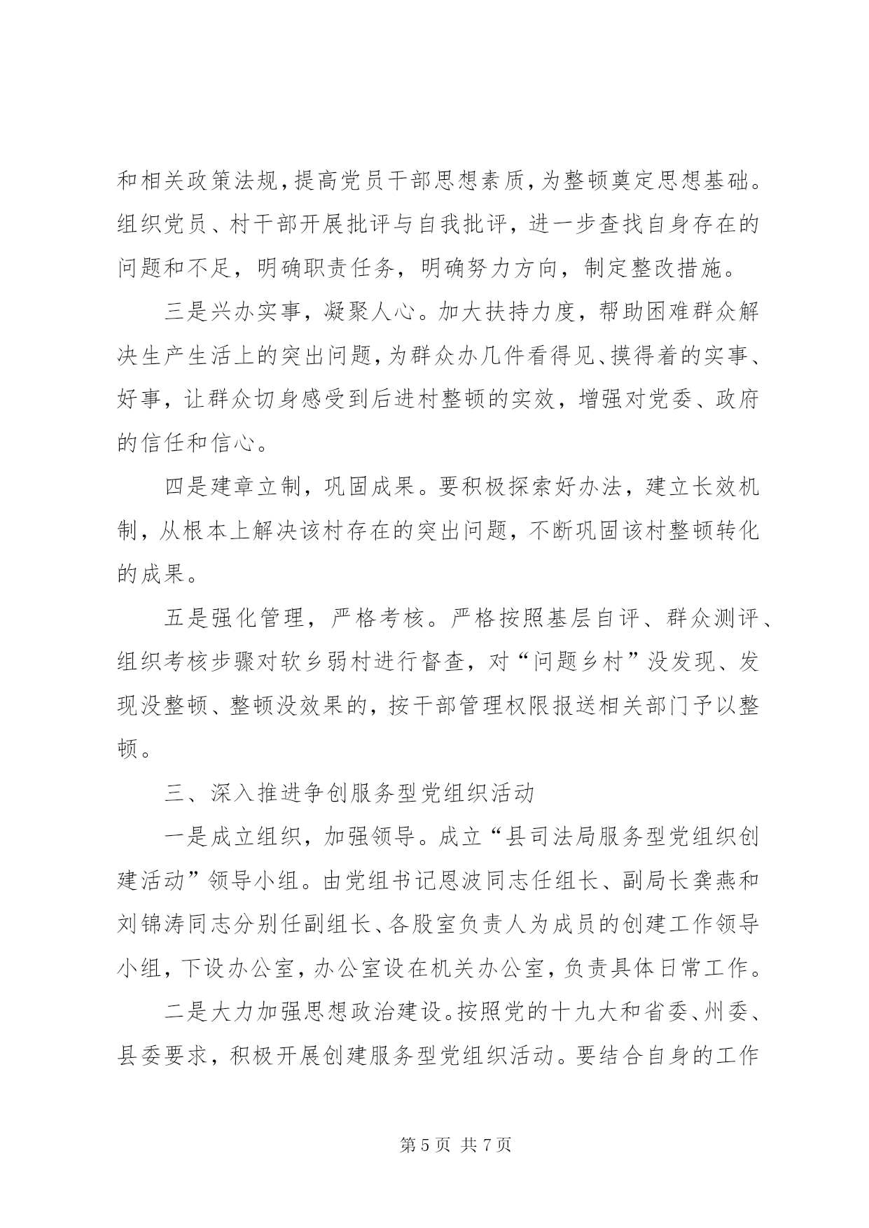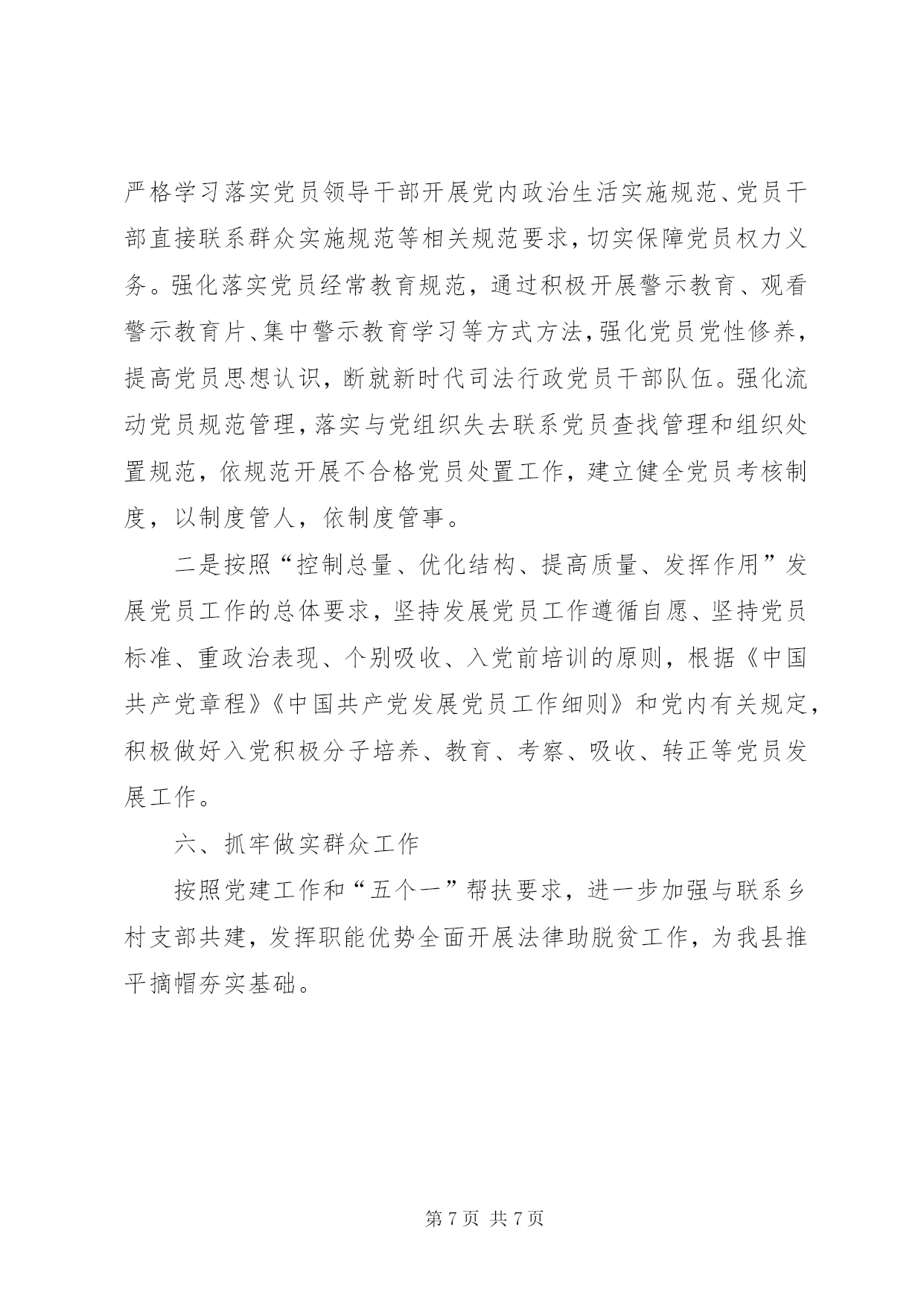 第PAGE\*Arabic\*MERGEFORMAT7页共NUMPAGES\*MERGEFORMAT7页XX年司法局党建工作计划为全面发挥我局党组的统筹引领作用,进一步巩固党的基层政权组织建设,加强局党支部、党员队伍建设。贯彻落实党的十九大和十九届二中、三中全会精神,按照县委相关文件要求,结合我局工作实际,特制定县司法局2018年党建工作计划如下。一、强化学习,践行“两学一做”,巩固基层政权建设常态化、制度化开展“两学一做”,强化学习,坚持以新党章为学习主要内容,积极学习党内法规,深入贯彻学习党的十九大和十九届二中、三中全会精神,贯彻习近平总书记重要讲话以及习近平总书记来川视察重要讲话精神,坚持党领导一切,充分发挥党组的引领和先锋模范作用,进一步提升我局党建工作,促进司法行政各项业务工作的上档升级。我局将按照党组织建设标准体系抓牢做实,使我局党建工作呈现新气象、新形象。(一)严格落实“三会一课”,积极践行“两学一做”。一是提高认识,贯彻学习。广大基层党员干部应当要树立正确的意识,提高对“三会一课”制度及“两学一做”活动的重要地位和作用的认识。强化对党的十九会议精神、十九届二中、三中全会精神及中央、省、州、县列次重要会议精神的学习,强化对党内法规的学习,严格落实党风廉政建设,强化党和国家政策法规的学习,不断提高党支部、党员队伍依法履职的能力水平。二是加强领导,健全制度。保障“三会一课”和“两学一做”的有效的坚持和落实,建立贯彻“三会一课”制度长效机制。加强对新形势下“三会一课”职能作用、活动方式、组织管理等进行专题调研,不断完善“三会一课”制度,积极开展“两学一做”活动,以适应基层党建的新形势、新要求。三是严格管理,增强素质。积极开展“两学一做”,加强日常管理,强化党员素质是不断提高“三会一课”质量的关键点,同时,党支部书记的素质决定着“三会一课”质量。要把增强基层党务干部素质作为重点工程来抓。要加强基层党建日常管理,严格落实支部书记例会制度、支部成员工作档案制度,用制度管人,凭制度管事,逐步实现党建工作规范化、制度化。四是立足实际,努力创新。坚持制度化、常态化开展“两学一做”活动,不断创新学习形式是提高“三会一课”质量的突破点。要积极抓住当前工作存在的主要问题和工作中心,将“三会一课”有效地与本单位中心工作紧密结合起来,相互渗透、相互促进,使党建工作取得良好效果。(二)认真开展党员承诺践诺、党员民主评议、党员设岗定责党员党性定期分析等工作。一是所有党员都要根据自己的岗位职责,结合自身实际,本着服务员工、方便他人、化解矛盾的原则,开展承诺践诺,努力做到“为他人服务,让群众满意”。调研定诺、党支部审诺、公开示诺、党员践诺。对党员承诺践诺情况要建立台账,对完成不及时的要督导落实,对完成难度大的要积极创造条件,给予必要的帮助和扶持。同时,每半年进行一次党员践诺情况通报,表扬先进,督促后进。二是开展党员民主评议,要以《党章》规定为依据,紧密结合在各项工作发挥先进作用情况进行评议,具体内容包括:(一)带头学习方面。是否自觉加强政治理论学习;是否自觉参加党组织的各项学习教育活动;是否勤奋学习法律法规等各方面的知识及技能,不断提高自身素质和能力。(二)争创佳绩方面。各项工作中,是否具有强烈的事业心和责任感,立足岗位干在前、关键时刻冲在前、创先争优赶在前;是否积极履行“公开承诺”中提出的承诺事项。(三)服务群众方面。是否密切联系群众,关心群众疾苦,诚心诚意为群众办实事、做好事、解难事,自觉维护职工群众利益;是否带头强化服务意识和执行意识,在提高服务水平和执行力上作表率。(四)遵纪守法方面。是否严格遵守党章,遵纪守法,做到依法行政、干事干净,自觉抵制不正之风,勇于同违法违纪和不良行为作斗争。(五)廉洁自律和作风方面。是否执行《中国共产党党员领导干部廉洁从政若干准则》和廉洁自律的各项规定,严格要求自己;是否坚持求真务实,牢记“两个务必”;是否带头遵守职业道德、社会公德和家庭美德等道德规范,在精神文明建设中发挥表率作用。党员干部特别是党员领导干部,要把廉政勤政,密切联系群众,严守法纪,提高领导水平等作为评议的重要内容。三是按照“以岗定责、责任到人”的原则,对所承担的工作任务进行细化量化,并明确每项任务的责任领导、责任科室和完成时限,并按照各自岗位职责认真抓好落实。要把考评结果作为民主评议党员和评先评优的重要依据,对发挥作用好、群众公认的党员可授予“党员先锋岗”、“优秀共产党员”等荣誉称号;对年轻、有培养前途的优秀无职党员优先列为后备干部进行培养;对履行职责较差的党员,要在党员大会上做出解释和说明,党支部要责令其限期整改。要通过评岗,有效调动党员参与设岗定责的积极性,进一步增强党员责任意识和先进性意识,全面提升党员队伍的整体素