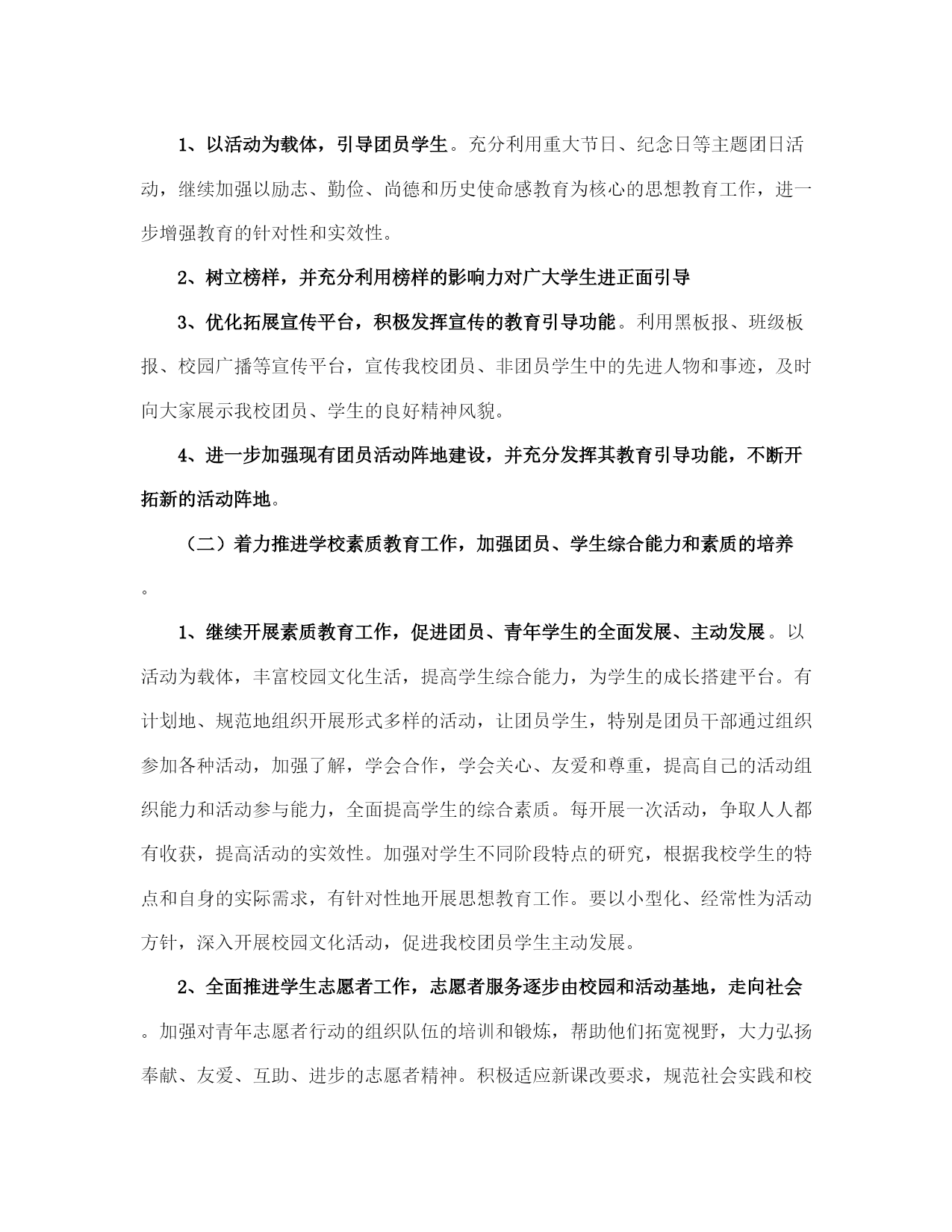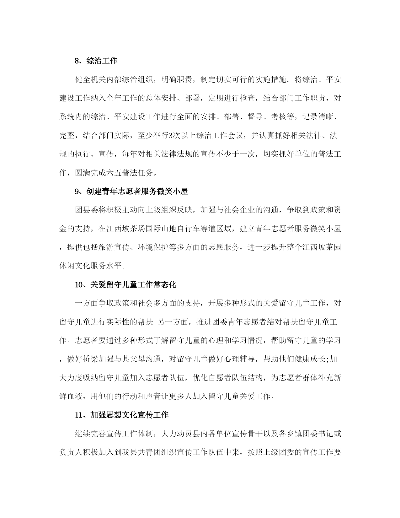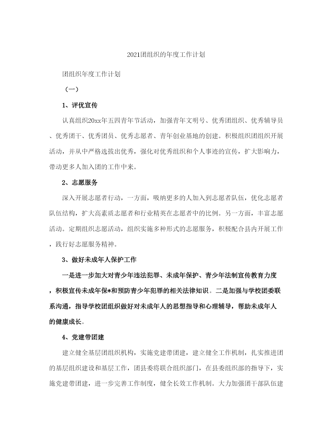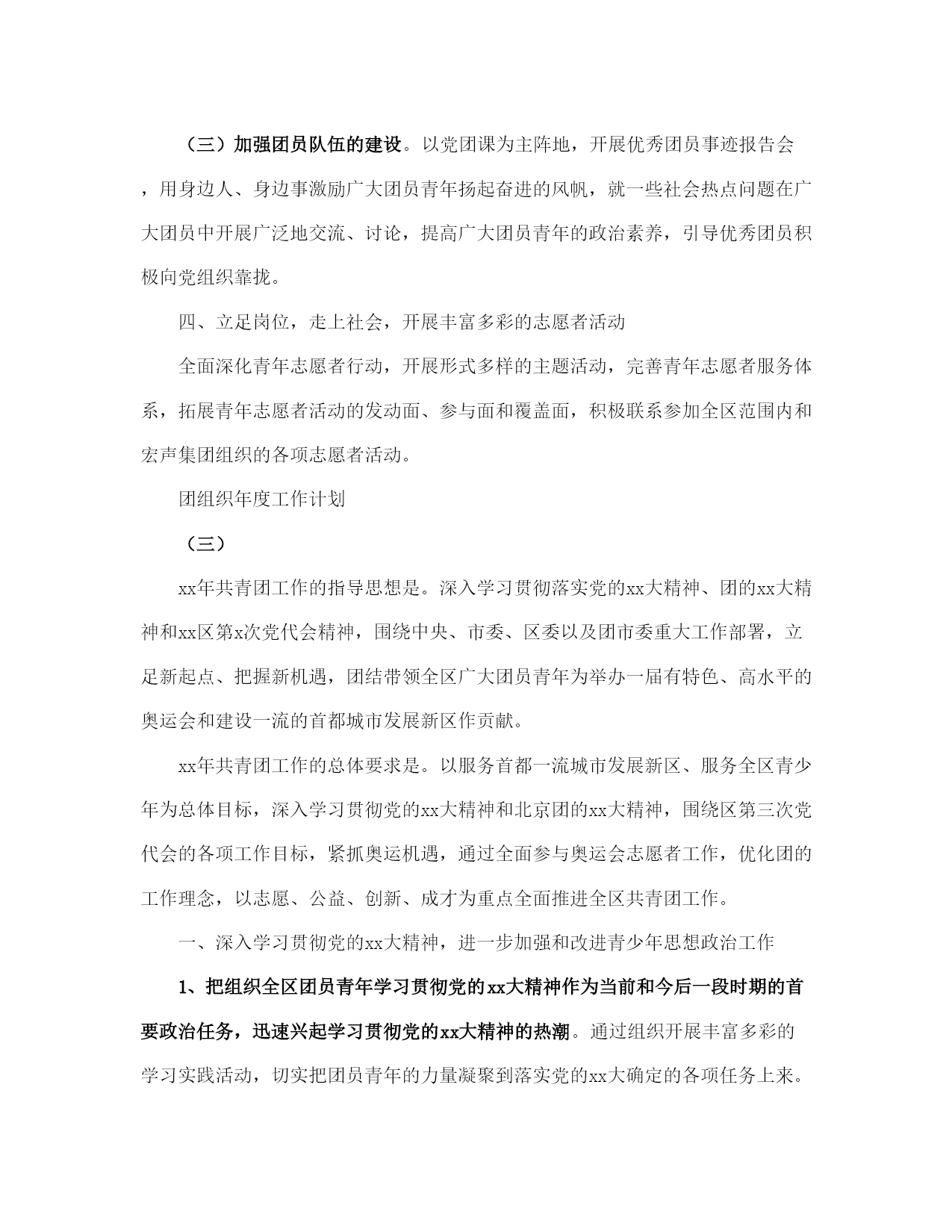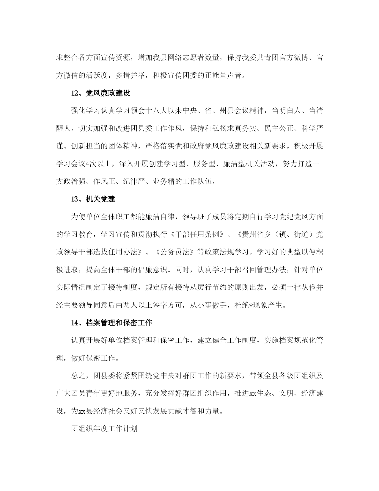 团组织的度工作计划(完整版)文档资料可直接使用,可编辑,欢迎下载2021团组织的年度工作计划团组织年度工作计划(一)1、评优宣传认真组织20xx年五四青年节活动,加强青年文明号、优秀团组织、优秀辅导员、优秀团干、优秀团员、优秀志愿者、青年创业基地的创建。积极组织团组织开展活动,并从中严格选拔出优秀,强化对优秀组织和个人事迹的宣传,扩大影响力,带动更多人加入团的工作中来。2、志愿服务深入开展志愿者行动,一方面,吸纳更多的人加入到志愿者队伍,优化志愿者队伍结构,扩大高素质志愿者和行业精英在志愿者中的比例。另一方面,丰富志愿活动。定期组织志愿活动,组织实施多种形式的志愿服务,积极配合县内开展工作,践行好志愿服务精神。3、做好未成年人保护工作一是进一步加大对青少年违法犯罪、未成年保护、青少年法制宣传教育力度,积极宣传未成年保*和预防青少年犯罪的相关法律知识。二是加强与学校团委联系沟通,指导学校团组织做好对未成年人的思想指导和心理辅导,帮助未成年人的健康成长。4、党建带团建建立健全基层团组织机构,实施党建带团建,建立健全工作机制,扎实推进团的基层组织建设和基层工作,团县委将联合组织部门,在县委组织部的指导下,实施党建带团建,进一步完善工作制度,健全长效工作机制。大力加强团干部队伍建设,以开展基层团干部培训为契机,推进基层团组织建设,增强团组织的凝聚力和战斗力,将团的基层组织建设和基层工作落到实处。加强团的信息宣传工作,完善健全团属网站建设和信息交流、报送机制,扩大团的社会宣传影响力。5、西部计划志愿者管理积极向上级部门争取到更多的西部计划志愿者到xx县服务。同时,团县委要加强对志愿者的管理,从各方面关心帮助他们。积极引导志愿者改变就业观念,争取相关部门支持,鼓励西部计划志愿者参加相关公务员或企事业单位招考,帮助他们在基层就业,根据相关文件精神,及时将志愿者生活补贴发放到位,为他们安心、舒心工作创造条件。6、希望工程做好希望工程,认真实施公平、公正、公开的原则,做好摸底调查,资助贫品学兼优学生,保障他们能安心顺利实现大学梦。力争取社会各界的支持和上级团委的帮助,预计资助xx县75名大学生,计50万元。7、推进青年就业创业行动一是做好大学生村官、西部计划志愿者及创业大学生的扶持、服务工作。在现有的政策基础上整合资源,建立健全工作机制,为创业大学生尽可能的提供服务。二是加强与金融部门的合作,做好青年创业贷款项目跟踪服务工作。三是联合相关部门在我县乡镇团组织中,开展以政策知识普及、素质培训、职业技能培训等为主要内容的青年现代化素质培训工程,努力开辟提高我县青年农民素质的新渠道,大力宣传开展农村淘宝,带动农村经济致富。四是结合工作实际创建农村青年创业典型事例宣传。通过各种渠道加强农村创业青年先进典型事例的宣传,营造青年自主创业氛围。8、综治工作健全机关内部综治组织,明确职责,制定切实可行的实施措施。将综治、平安建设工作纳入全年工作的总体安排、部署,定期进行检查,结合部门工作职责,对系统内的综治、平安建设工作进行全面的安排、部署、督导、考核等,记录清晰、完整,结合部门实际,至少举行3次以上综治工作会议,并认真抓好相关法律、法规的执行、宣传,每年对相关法律法规的宣传不少于一次,切实抓好单位的普法工作,圆满完成六五普法任务。9、创建青年志愿者服务微笑小屋团县委将积极主动向上级组织反映,加强与社会企业的沟通,争取到政策和资金的支持,在江西坡茶场国际山地自行车赛道区域,建立青年志愿者服务微笑小屋,提供包括旅游宣传、环境保护等多方面的志愿服务,进一步提升整个江西坡茶园休闲文化服务水平。10、关爱留守儿童工作常态化一方面争取政策和社会多方面的支持,开展多种形式的关爱留守儿童工作,对留守儿童进行实际性的帮扶;另一方面,推进团委青年志愿者结对帮扶留守儿童工作。志愿者要通过多种形式了解留守儿童的心理和学习情况,帮助留守儿童的学习,做好桥梁加强与其父母沟通,对留守儿童做好心理辅导,帮助他们健康成长;加大力度吸纳留守儿童加入志愿者队伍,优化自愿者队伍结构,为志愿者群体补充新鲜血液,用他们的行动和声音让更多人加入留守儿童关爱工作。11、加强思想文化宣传工作继续完善宣传工作体制,大力动员县内各单位宣传骨干以及各乡镇团委书记或负责人积极加入到我县共青团组织宣传工作队伍中来,按照上级团委的宣传工作要求整合各方面宣传资源,增加我县网络志愿者数量,保持我委共青团官方微博、官方微信的活跃度,多措并举,积极宣传团委的正能量声音。12、党风廉政建设强化学习认真学习领会十八大以来中央、省、州县会议精神,当明白人、当清醒人。切实加强和改进团县委工作作风,保持和弘扬求真务实、民主公正、科学严谨、创新担当的团体精神,严格落实党和政府党风廉政