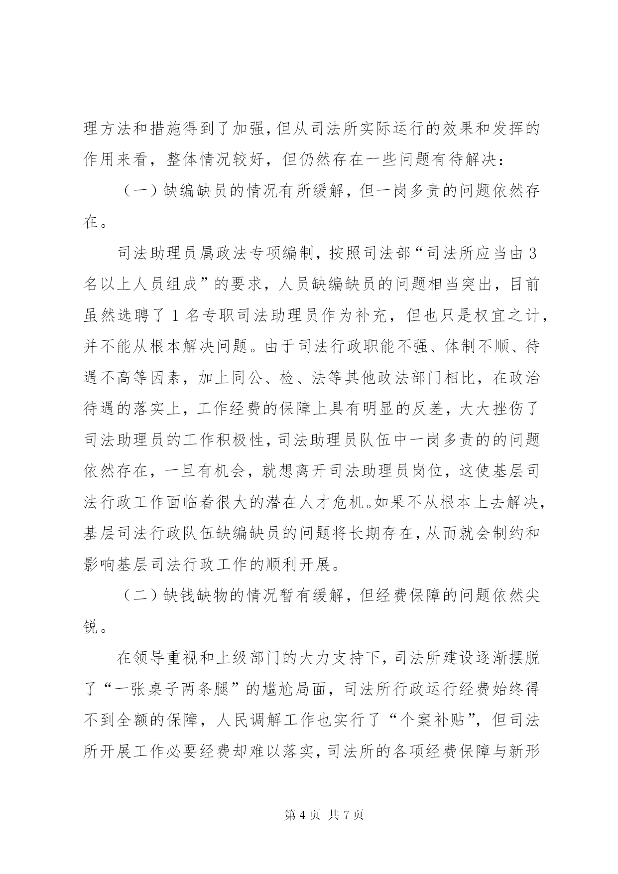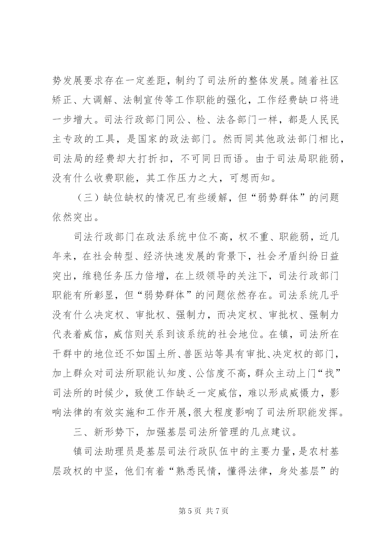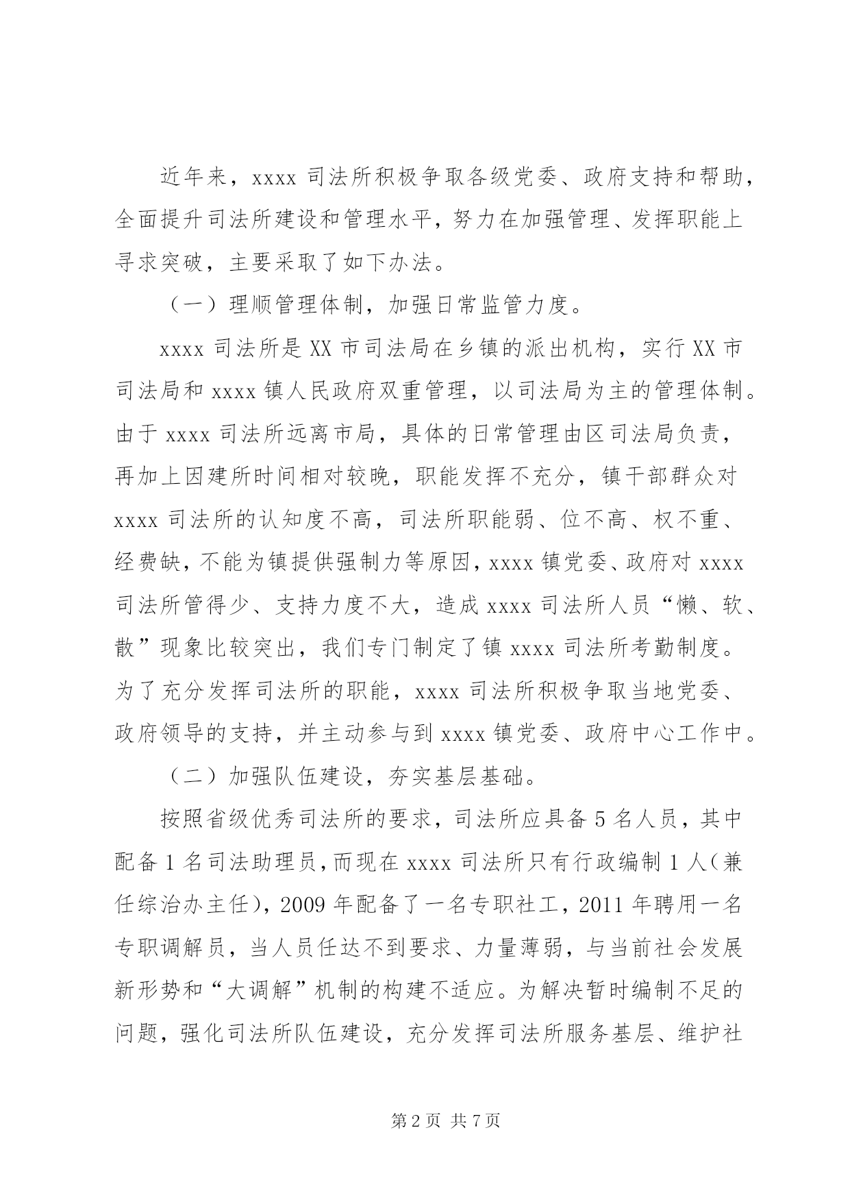 第PAGE\*Arabic\*MERGEFORMAT7页共NUMPAGES\*MERGEFORMAT7页基层司法所建设经验交流材料司法所,在基层政法机构体系中是基层政法组织机构之一,它与公安派出所、法庭共同构成我国乡镇(街道)一级的政法体系,成为中国基层司法运行机制中不可缺少的重要组成部分。在基层社会管理综合治理机构体系中,司法所是司法行政系统参与基层综合治理工作的重要成员单位,处在化解人民内部矛盾、预防和减少犯罪的第一线。近年来,xxxx司法所紧紧围绕镇党委、政府的工作大局,认真履行职责,为维护基层社会稳定,促进基层民主法制建设,促进经济发展和社会全面进步作出了积极贡献,已成为社会管理综合治理工作中不可缺少的主要力量。在各级党委和政府的重视和关心下,我所建设得到了前所未有的重视和加强,职能作用得到了进一步发挥。与此同时,如何进一步加强司法所的管理,切实发挥司法所在维护稳定、社会管理中的职能作用,是基层工作中面临的一个重大而现实的课题。为此,如何加强基层司法所建设提出几点思考。一、xxxx司法所现状和主要管理方法xxxx司法所是xxxx省优秀司法所,现有办公面积220平方米并统一设立了办公室、调解室、接待室,配备了电脑、打印机、扫描仪、复印机、办公桌椅、文件柜、档案柜等办公设施,司法所外观标识、门牌、工作人员桌牌胸牌、各项制度公示上墙、各类文书制式规格统一。近年来,xxxx司法所积极争取各级党委、政府支持和帮助,全面提升司法所建设和管理水平,努力在加强管理、发挥职能上寻求突破,主要采取了如下办法。(一)理顺管理体制,加强日常监管力度。xxxx司法所是XX市司法局在乡镇的派出机构,实行XX市司法局和xxxx镇人民政府双重管理,以司法局为主的管理体制。由于xxxx司法所远离市局,具体的日常管理由区司法局负责,再加上因建所时间相对较晚,职能发挥不充分,镇干部群众对xxxx司法所的认知度不高,司法所职能弱、位不高、权不重、经费缺,不能为镇提供强制力等原因,xxxx镇党委、政府对xxxx司法所管得少、支持力度不大,造成xxxx司法所人员“懒、软、散”现象比较突出,我们专门制定了镇xxxx司法所考勤制度。为了充分发挥司法所的职能,xxxx司法所积极争取当地党委、政府领导的支持,并主动参与到xxxx镇党委、政府中心工作中。(二)加强队伍建设,夯实基层基础。按照省级优秀司法所的要求,司法所应具备5名人员,其中配备1名司法助理员,而现在xxxx司法所只有行政编制1人(兼任综治办主任),2009年配备了一名专职社工,2011年聘用一名专职调解员,当人员任达不到要求、力量薄弱,与当前社会发展新形势和“大调解”机制的构建不适应。为解决暂时编制不足的问题,强化司法所队伍建设,充分发挥司法所服务基层、维护社会和谐稳定的职能,加强队伍建设成为基层司法所的首要问题。(三)强化经费保障,确保工作运行。基层司法所在编工作人员的工资由xxxx区财政支付外,xxxx司法所的日常办公经费基本上靠xxxx镇财政解决,这种局面使xxxx司法所“直不起腰”,因工作经费有求于人,造成实际从事的事务必然被镇其他部门牵制,不得不承担很多与司法行政工作无关的事务,xxxx所的工作在政府的安排下,本末倒置,司法行政本职工作倒成了“副业”。为扭转这种不利局面,必须解决好“有钱办事”的困难,确保司法所工作的正常运转。(四)加大督查力度,严格目标考核。为主动适应司法行政工作面临的新形势,以工作目标考评标准为牵引,加强对司法所业务工作的指导能力,加大督查力度,促进司法所各项工作扎实有序推进,在原有的检查考核标准的基础上,进一步细化和量化工作目标和考核标准,对司法所承担的人民调解、社区矫正、帮教安置、法制宣传、依法治理、法律服务、档案管理等工作分别进行量化考核,根据半年和年终考核检查情况,对司法所业务工作进行表彰奖励或通报批评。以活跃业务开展发挥基层司法行政职能作用,强力提升司法所业务工作质量。二、当前基层司法所管理中凸显的几个问题通过近些年的努力,xxxx所建设虽然取得了一些成绩,管理方法和措施得到了加强,但从司法所实际运行的效果和发挥的作用来看,整体情况较好,但仍然存在一些问题有待解决:(一)缺编缺员的情况有所缓解,但一岗多责的问题依然存在。司法助理员属政法专项编制,按照司法部“司法所应当由3名以上人员组成”的要求,人员缺编缺员的问题相当突出,目前虽然选聘了1名专职司法助理员作为补充,但也只是权宜之计,并不能从根本解决问题。由于司法行政职能不强、体制不顺、待遇不高等因素,加上同公、检、法等其他政法部门相比,在政治待遇的落实上,工作经费的保障上具有明显的反差,大大挫伤了司法助理员的工作积极性,司法助理员队伍中一岗多责的的问题依然存在,一旦有机会,就想离开司法助理员岗