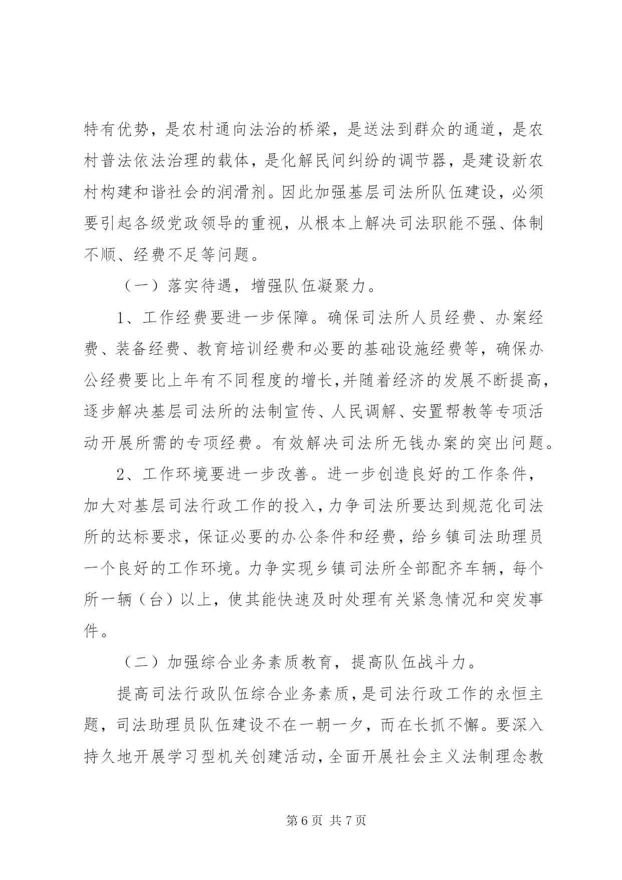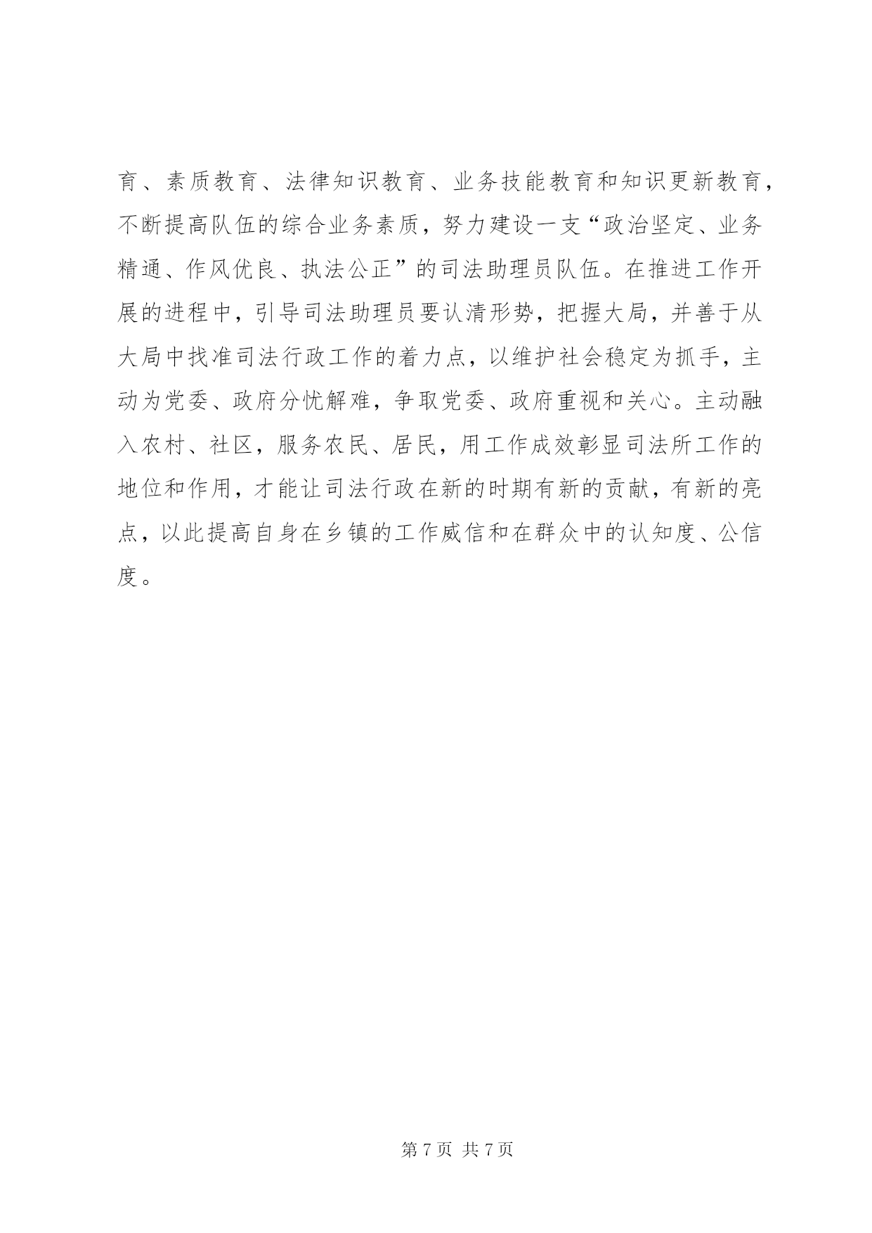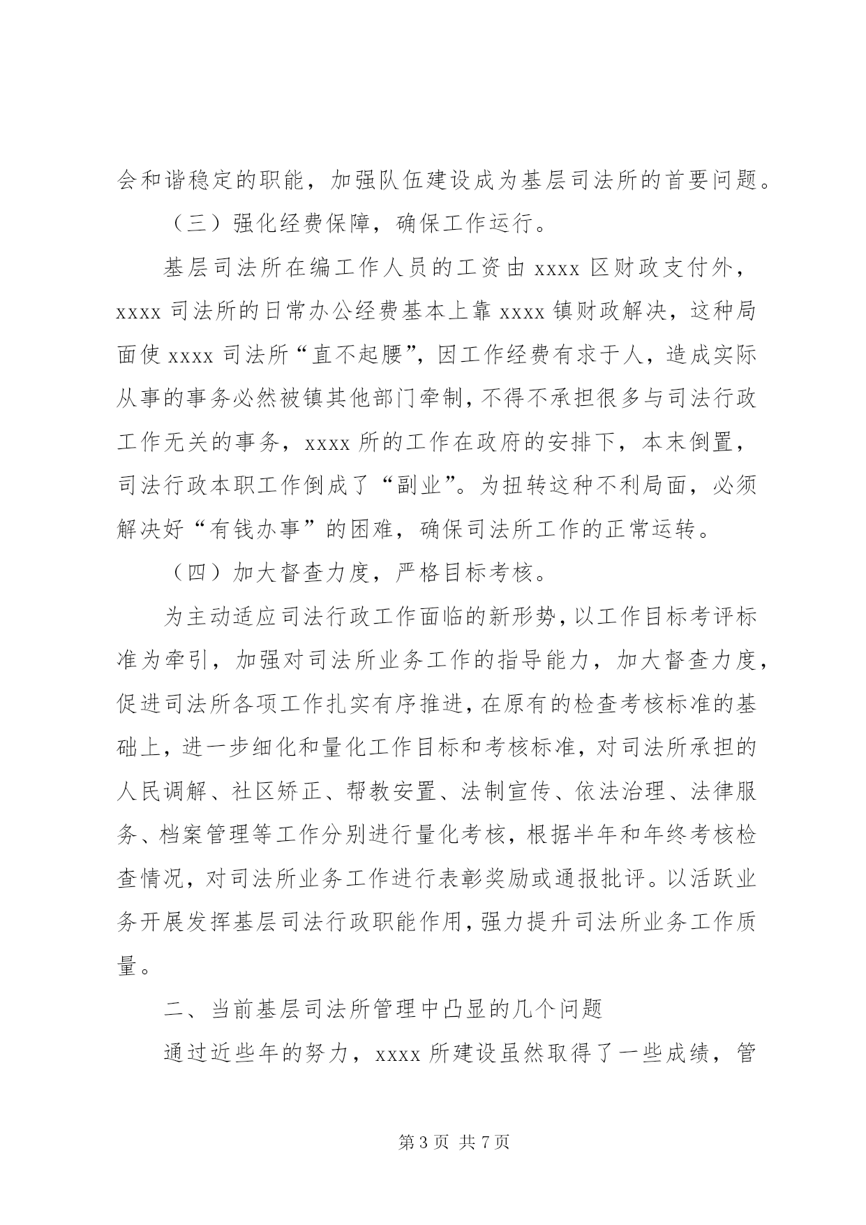 第PAGE\*Arabic\*MERGEFORMAT7页共NUMPAGES\*MERGEFORMAT7页基层司法所建设经验交流材料司法所,在基层政法机构体系中是基层政法组织机构之一,它与公安派出所、法庭共同构成我国乡镇(街道)一级的政法体系,成为中国基层司法运行机制中不可缺少的重要组成部分。在基层社会管理综合治理机构体系中,司法所是司法行政系统参与基层综合治理工作的重要成员单位,处在化解人民内部矛盾、预防和减少犯罪的第一线。近年来,xxxx司法所紧紧围绕镇党委、政府的工作大局,认真履行职责,为维护基层社会稳定,促进基层民主法制建设,促进经济发展和社会全面进步作出了积极贡献,已成为社会管理综合治理工作中不可缺少的主要力量。在各级党委和政府的重视和关心下,我所建设得到了前所未有的重视和加强,职能作用得到了进一步发挥。与此同时,如何进一步加强司法所的管理,切实发挥司法所在维护稳定、社会管理中的职能作用,是基层工作中面临的一个重大而现实的课题。为此,如何加强基层司法所建设提出几点思考。一、xxxx司法所现状和主要管理方法xxxx司法所是xxxx省优秀司法所,现有办公面积220平方米并统一设立了办公室、调解室、接待室,配备了电脑、打印机、扫描仪、复印机、办公桌椅、文件柜、档案柜等办公设施,司法所外观标识、门牌、工作人员桌牌胸牌、各项制度公示上墙、各类文书制式规格统一。近年来,xxxx司法所积极争取各级党委、政府支持和帮助,全面提升司法所建设和管理水平,努力在加强管理、发挥职能上寻求突破,主要采取了如下办法。(一)理顺管理体制,加强日常监管力度。xxxx司法所是XX市司法局在乡镇的派出机构,实行XX市司法局和xxxx镇人民政府双重管理,以司法局为主的管理体制。由于xxxx司法所远离市局,具体的日常管理由区司法局负责,再加上因建所时间相对较晚,职能发挥不充分,镇干部群众对xxxx司法所的认知度不高,司法所职能弱、位不高、权不重、经费缺,不能为镇提供强制力等原因,xxxx镇党委、政府对xxxx司法所管得少、支持力度不大,造成xxxx司法所人员“懒、软、散”现象比较突出,我们专门制定了镇xxxx司法所考勤制度。为了充分发挥司法所的职能,xxxx司法所积极争取当地党委、政府领导的支持,并主动参与到xxxx镇党委、政府中心工作中。(二)加强队伍建设,夯实基层基础。按照省级优秀司法所的要求,司法所应具备5名人员,其中配备1名司法助理员,而现在xxxx司法所只有行政编制1人(兼任综治办主任),2009年配备了一名专职社工,2011年聘用一名专职调解员,当人员任达不到要求、力量薄弱,与当前社会发展新形势和“大调解”机制的构建不适应。为解决暂时编制不足的问题,强化司法所队伍建设,充分发挥司法所服务基层、维护社会和谐稳定的职能,加强队伍建设成为基层司法所的首要问题。(三)强化经费保障,确保工作运行。基层司法所在编工作人员的工资由xxxx区财政支付外,xxxx司法所的日常办公经费基本上靠xxxx镇财政解决,这种局面使xxxx司法所“直不起腰”,因工作经费有求于人,造成实际从事的事务必然被镇其他部门牵制,不得不承担很多与司法行政工作无关的事务,xxxx所的工作在政府的安排下,本末倒置,司法行政本职工作倒成了“副业”。为扭转这种不利局面,必须解决好“有钱办事”的困难,确保司法所工作的正常运转。(四)加大督查力度,严格目标考核。为主动适应司法行政工作面临的新形势,以工作目标考评标准为牵引,加强对司法所业务工作的指导能力,加大督查力度,促进司法所各项工作扎实有序推进,在原有的检查考核标准的基础上,进一步细化和量化工作目标和考核标准,对司法所承担的人民调解、社区矫正、帮教安置、法制宣传、依法治理、法律服务、档案管理等工作分别进行量化考核,根据半年和年终考核检查情况,对司法所业务工作进行表彰奖励或通报批评。以活跃业务开展发挥基层司法行政职能作用,强力提升司法所业务工作质量。二、当前基层司法所管理中凸显的几个问题通过近些年的努力,xxxx所建设虽然取得了一些成绩,管理方法和措施得到了加强,但从司法所实际运行的效果和发挥的作用来看,整体情况较好,但仍然存在一些问题有待解决:(一)缺编缺员的情况有所缓解,但一岗多责的问题依然存在。司法助理员属政法专项编制,按照司法部“司法所应当由3名以上人员组成”的要求,人员缺编缺员的问题相当突出,目前虽然选聘了1名专职司法助理员作为补充,但也只是权宜之计,并不能从根本解决问题。由于司法行政职能不强、体制不顺、待遇不高等因素,加上同公、检、法等其他政法部门相比,在政治待遇的落实上,工作经费的保障上具有明显的反差,大大挫伤了司法助理员的工作积极性,司法助理员队伍中一岗多责的的问题依然存在,一旦有机会,就想离开司法助理员岗