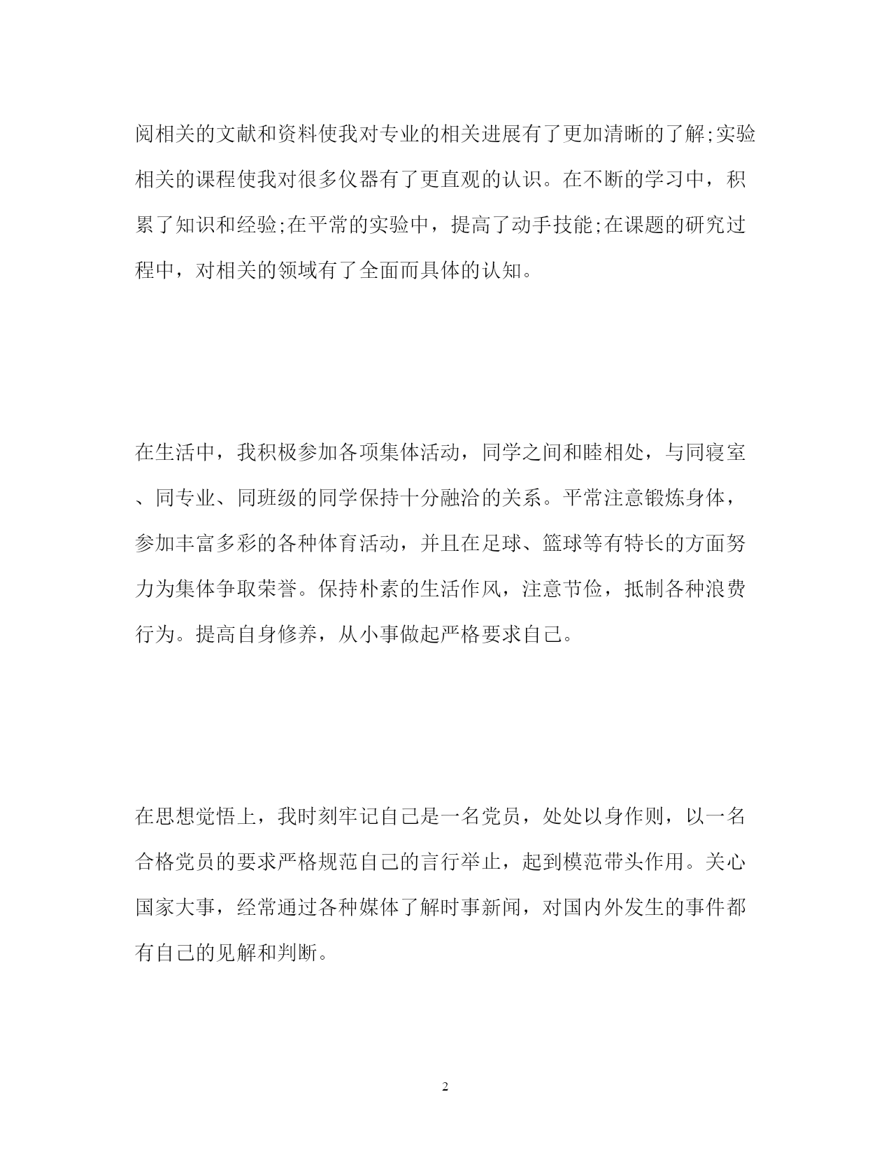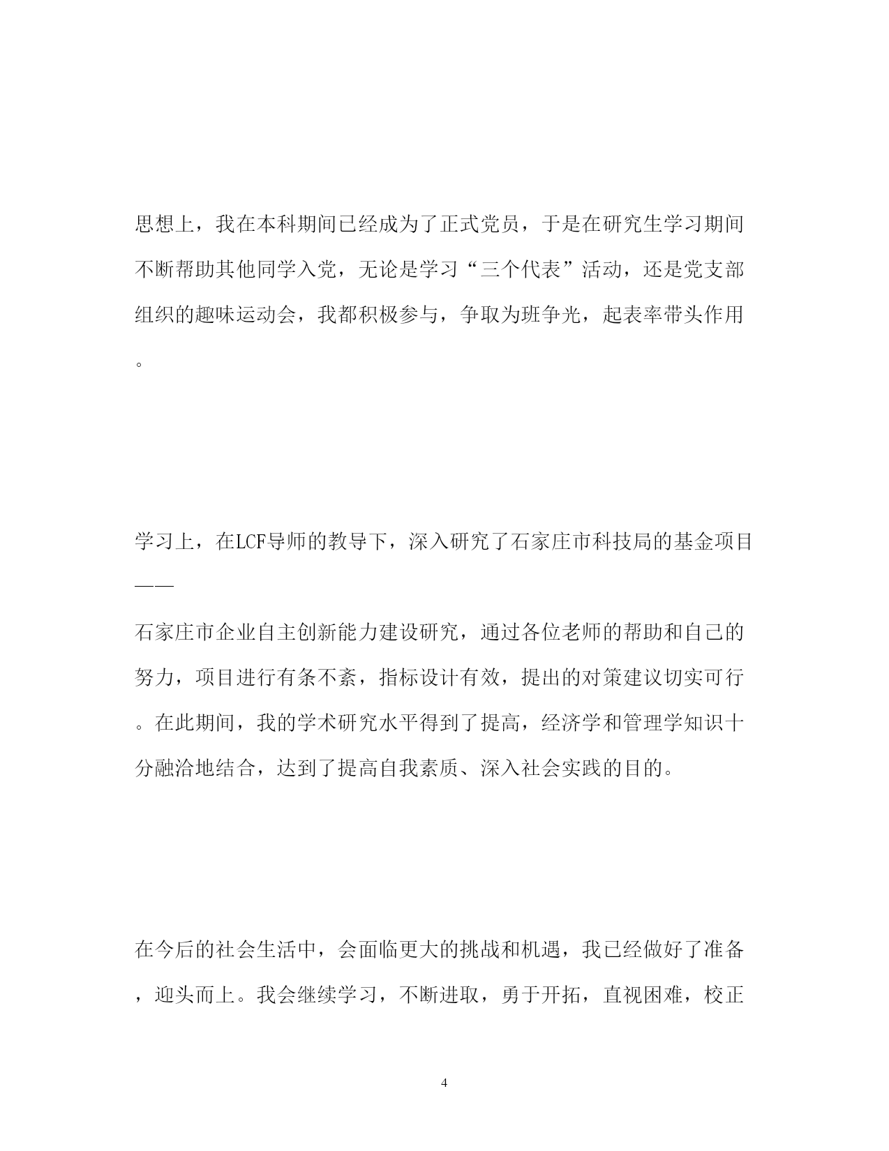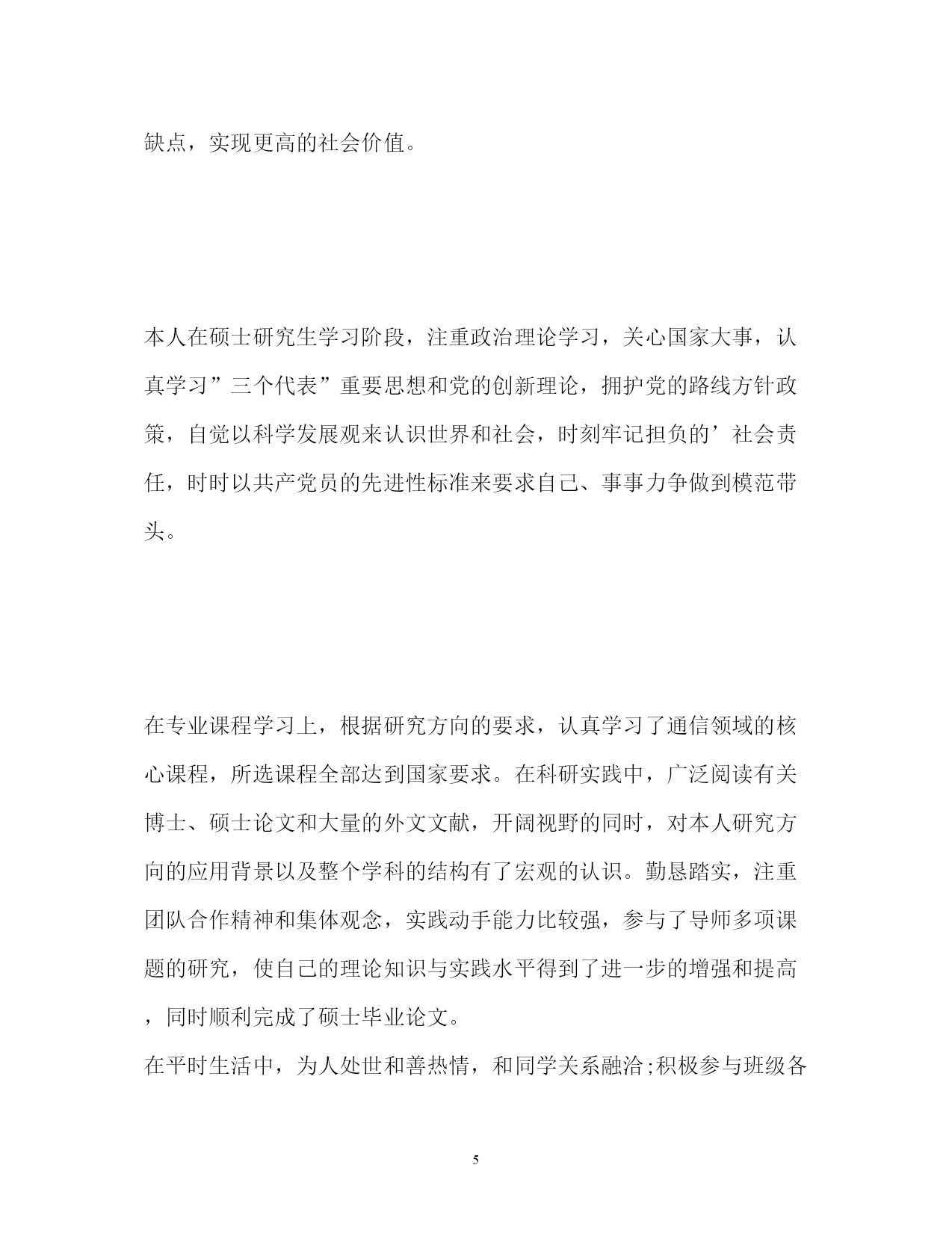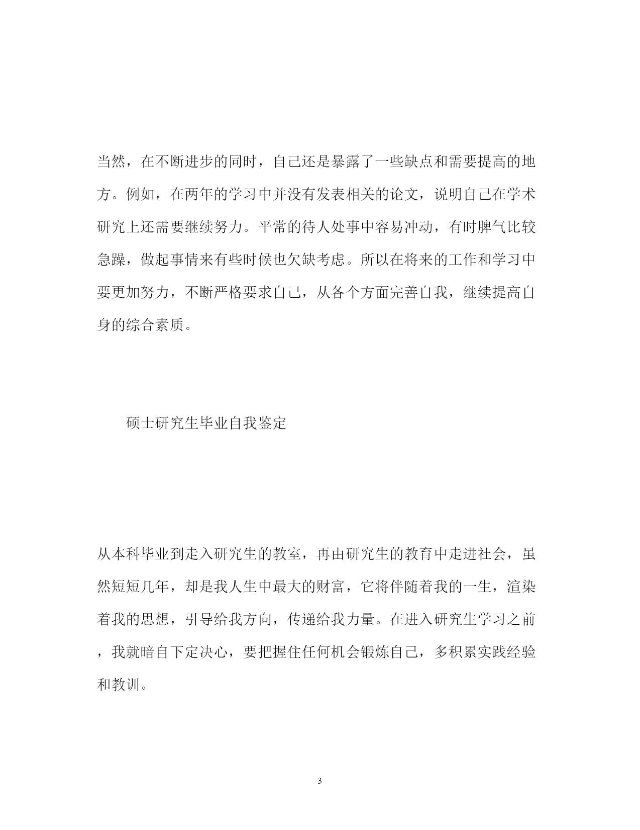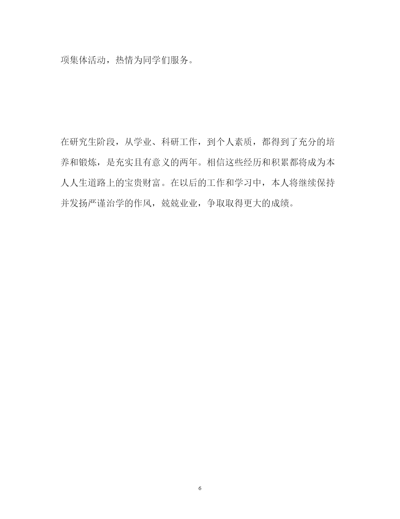 此资料由网络收集而来,如有侵权请告知上传者立即删除。资料共分享,我们负责传递知识。PAGEPAGE6硕士研究生毕业自我鉴定()硕士研究生毕业自我鉴定(两篇)硕士研究生毕业自我鉴定两年的硕士研究生学习已经接近尾声,马上就要从学校走向社会了。回顾这两年来,通过自己不断的努力,在工作、学习、生活等各方面都有所提高。这两年的研究生学习,使我不但开阔了思路,增长了见识,更重要的是在学习和实践中锻炼了自己的实际操作和解决问题的能力。自身整体素质的提高使我受益匪浅。在学习上,文化课的学习使我对本专业有了更深刻、更准确的认识;查阅相关的文献和资料使我对专业的相关进展有了更加清晰的了解;实验相关的课程使我对很多仪器有了更直观的认识。在不断的学习中,积累了知识和经验;在平常的实验中,提高了动手技能;在课题的研究过程中,对相关的领域有了全面而具体的认知。在生活中,我积极参加各项集体活动,同学之间和睦相处,与同寝室、同专业、同班级的同学保持十分融洽的关系。平常注意锻炼身体,参加丰富多彩的各种体育活动,并且在足球、篮球等有特长的方面努力为集体争取荣誉。保持朴素的生活作风,注意节俭,抵制各种浪费行为。提高自身修养,从小事做起严格要求自己。在思想觉悟上,我时刻牢记自己是一名党员,处处以身作则,以一名合格党员的要求严格规范自己的言行举止,起到模范带头作用。关心国家大事,经常通过各种媒体了解时事新闻,对国内外发生的事件都有自己的见解和判断。当然,在不断进步的同时,自己还是暴露了一些缺点和需要提高的地方。例如,在两年的学习中并没有发表相关的论文,说明自己在学术研究上还需要继续努力。平常的待人处事中容易冲动,有时脾气比较急躁,做起事情来有些时候也欠缺考虑。所以在将来的工作和学习中要更加努力,不断严格要求自己,从各个方面完善自我,继续提高自身的综合素质。硕士研究生毕业自我鉴定从本科毕业到走入研究生的教室,再由研究生的教育中走进社会,虽然短短几年,却是我人生中最大的财富,它将伴随着我的一生,渲染着我的思想,引导给我方向,传递给我力量。在进入研究生学习之前,我就暗自下定决心,要把握住任何机会锻炼自己,多积累实践经验和教训。思想上,我在本科期间已经成为了正式党员,于是在研究生学习期间不断帮助其他同学入党,无论是学习“三个代表”活动,还是党支部组织的趣味运动会,我都积极参与,争取为班争光,起表率带头作用。学习上,在LCF导师的教导下,深入研究了石家庄市科技局的基金项目——石家庄市企业自主创新能力建设研究,通过各位老师的帮助和自己的努力,项目进行有条不紊,指标设计有效,提出的对策建议切实可行。在此期间,我的学术研究水平得到了提高,经济学和管理学知识十分融洽地结合,达到了提高自我素质、深入社会实践的目的。在今后的社会生活中,会面临更大的挑战和机遇,我已经做好了准备,迎头而上。我会继续学习,不断进取,勇于开拓,直视困难,校正缺点,实现更高的社会价值。本人在硕士研究生学习阶段,注重政治理论学习,关心国家大事,认真学习”三个代表”重要思想和党的创新理论,拥护党的路线方针政策,自觉以科学发展观来认识世界和社会,时刻牢记担负的’社会责任,时时以共产党员的先进性标准来要求自己、事事力争做到模范带头。在专业课程学习上,根据研究方向的要求,认真学习了通信领域的核心课程,所选课程全部达到国家要求。在科研实践中,广泛阅读有关博士、硕士论文和大量的外文文献,开阔视野的同时,对本人研究方向的应用背景以及整个学科的结构有了宏观的认识。勤恳踏实,注重团队合作精神和集体观念,实践动手能力比较强,参与了导师多项课题的研究,使自己的理论知识与实践水平得到了进一步的增强和提高,同时顺利完成了硕士毕业论文。在平时生活中,为人处世和善热情,和同学关系融洽;积极参与班级各项集体活动,热情为同学们服务。在研究生阶段,从学业、科研工作,到个人素质,都得到了充分的培养和锻炼,是充实且有意义的两年。相信这些经历和积累都将成为本人人生道路上的宝贵财富。在以后的工作和学习中,本人将继续保持并发扬严谨治学的作风,兢兢业业,争取取得更大的成绩。