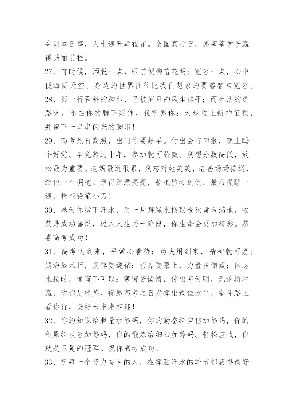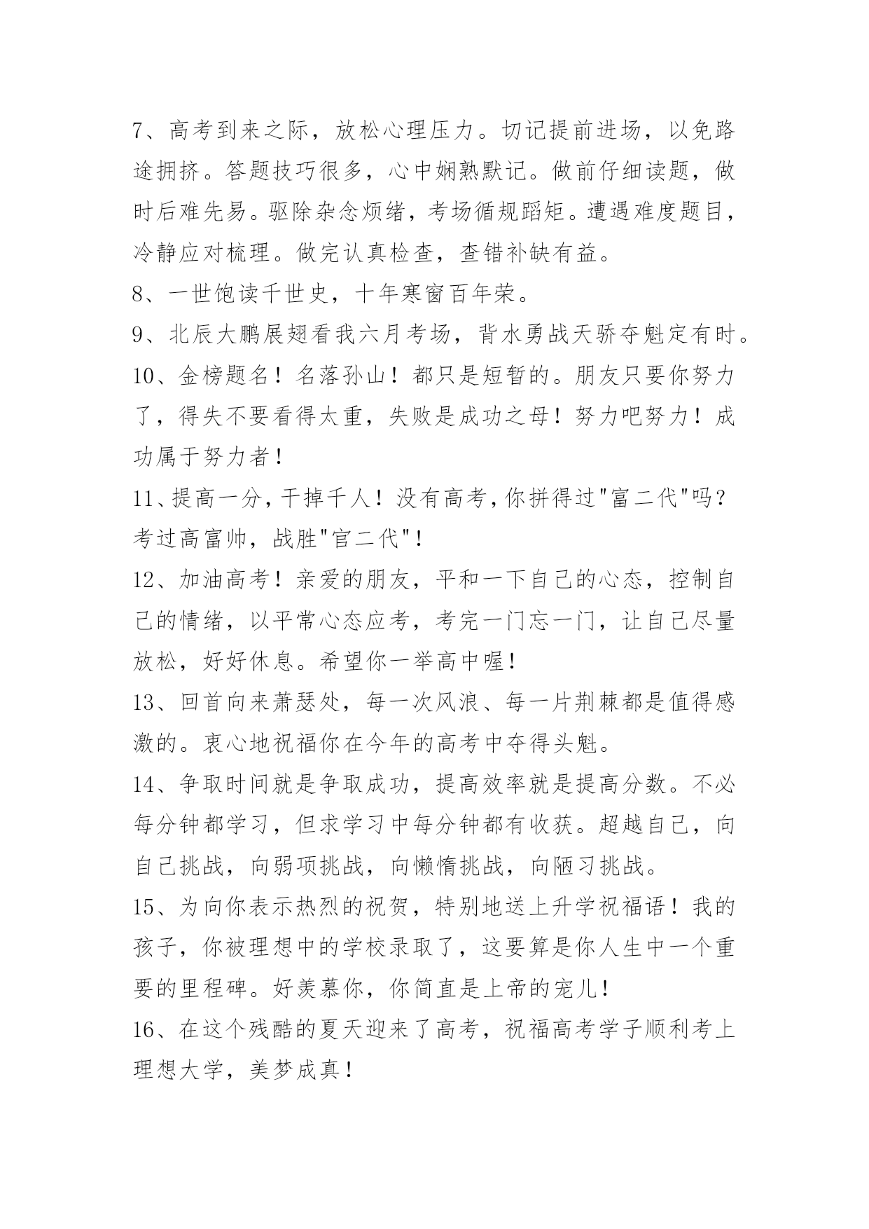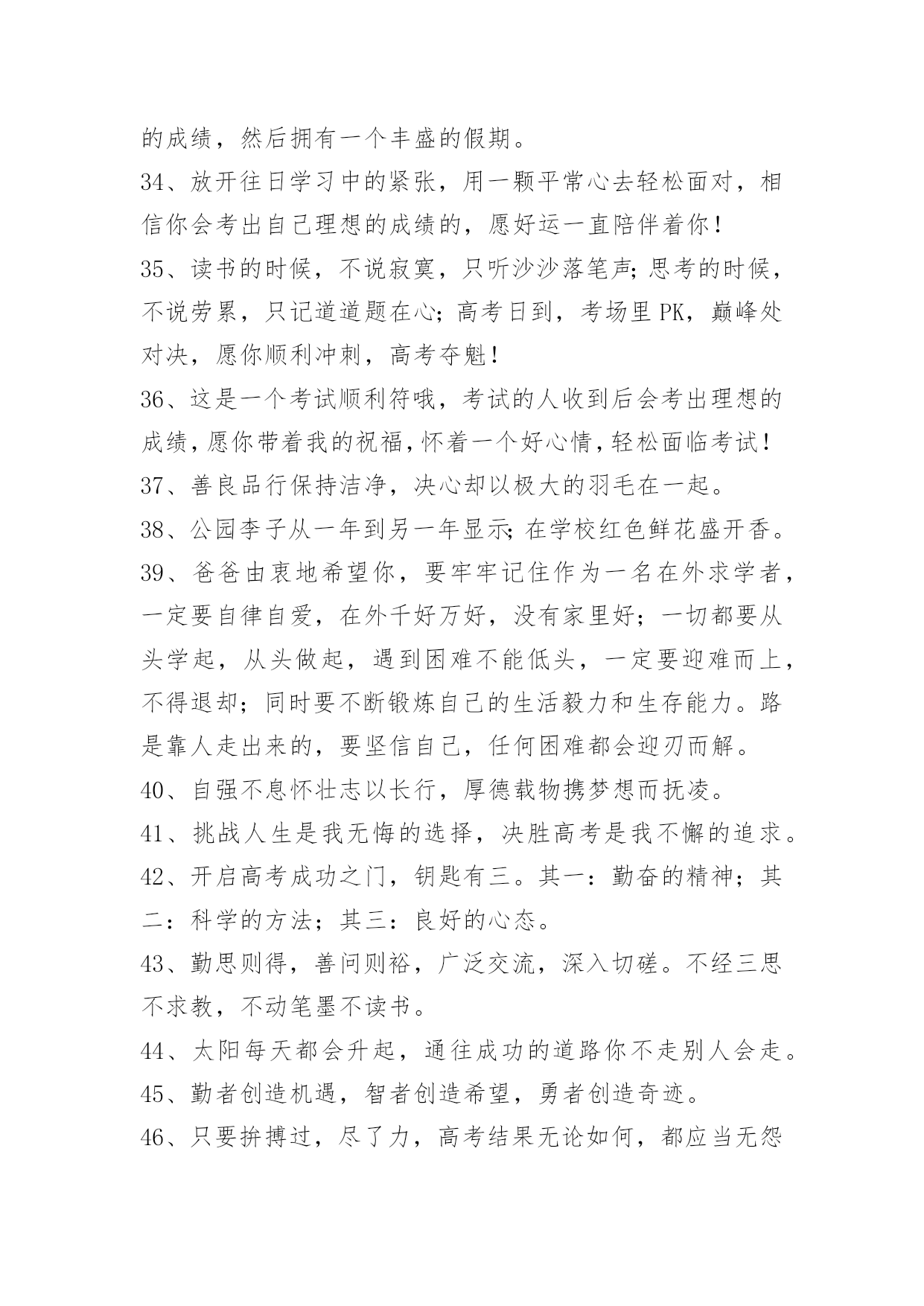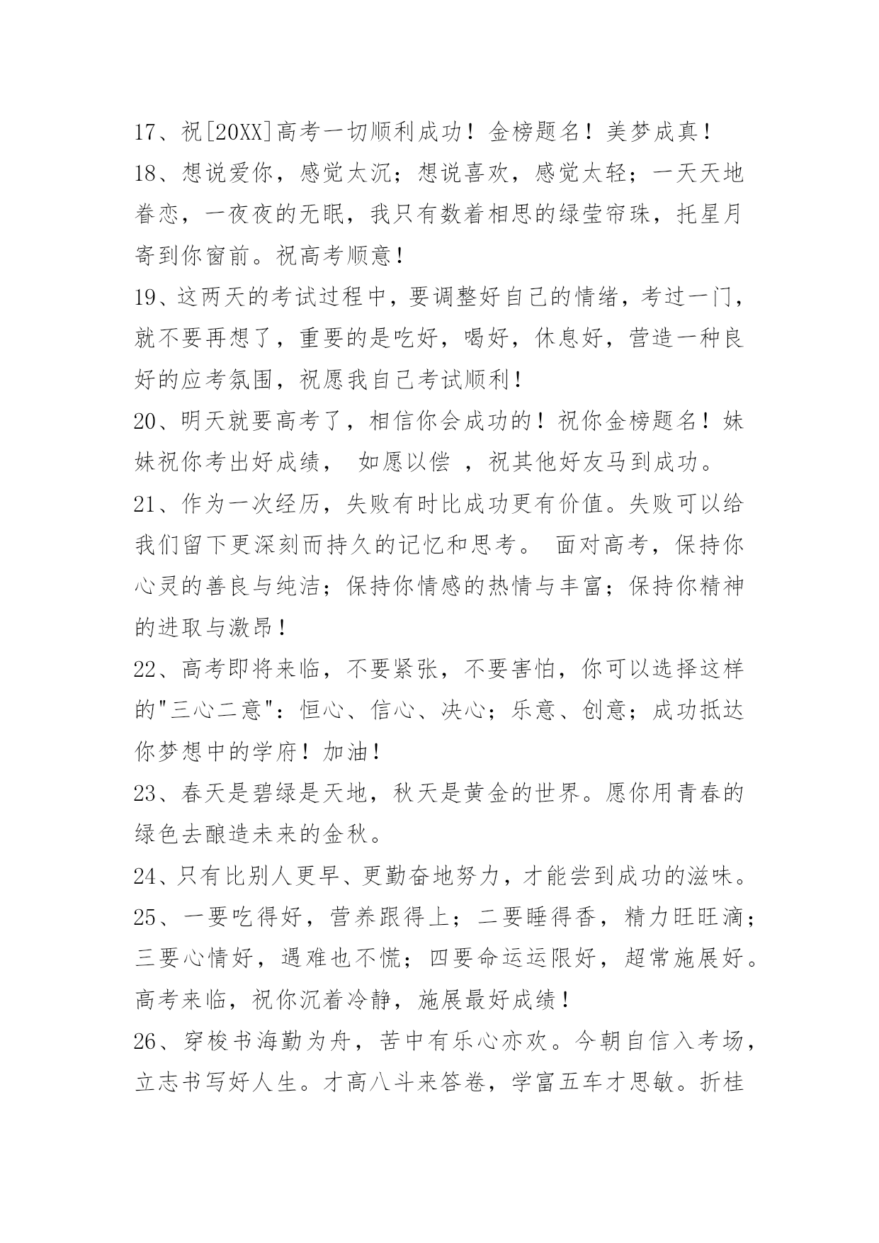 经典高考顺利祝福寄语经典高考顺利祝福寄语大全(精选100句)蜂飞蝶舞绕花枝,捷报传来甜如蜜。笑逐颜开告亲友,合家欢畅享不够。举杯畅饮庆题名,实现幻想笑盈盈。开辟人生新航线,执着进取书绚烂。愿你出路无限美好。本文是小编特意为各位读者整理的高考顺利祝福寄语,欢迎大家分享。1、自信是走向成功的第一步,缺乏信心是失败的主要原因。2、点燃希望的火焰,鼓起梦想的风帆,敲响拚搏的鼓点,迎接必经的挑战,收获喜悦的灿烂!祝你高考顺利,马到成功。3、当你收到这条短信的时候,"胜利的大门"正在向你徐徐开启,欢迎你"王者归来"。祝福你"金榜题名",大展宏图!4、高考又来临,心态要放稳,寒窗苦读难,胜利在眼前,六月天气热,成功手中握,今年的高考,你一定是最棒的,加油!5、举着高考的旗帜,吹着冲锋的号角,淹没痛苦与汗水,终于迎来这一天,装着满腹的ABC,带着执着的梦想,轻松进入考场,收获带着耀眼光环的人生!准备就绪,最后冲刺!6、迈向明天美好的生活,我坚信,你们付出了汗水,经受了考验,理想中大学殿堂的大门就一定会为你们而敞开,让你们继续艰辛却快乐的求学之路!7、高考到来之际,放松心理压力。切记提前进场,以免路途拥挤。答题技巧很多,心中娴熟默记。做前仔细读题,做时后难先易。驱除杂念烦绪,考场循规蹈矩。遭遇难度题目,冷静应对梳理。做完认真检查,查错补缺有益。8、一世饱读千世史,十年寒窗百年荣。9、北辰大鹏展翅看我六月考场,背水勇战天骄夺魁定有时。10、金榜题名!名落孙山!都只是短暂的。朋友只要你努力了,得失不要看得太重,失败是成功之母!努力吧努力!成功属于努力者!11、提高一分,干掉千人!没有高考,你拼得过"富二代"吗?考过高富帅,战胜"官二代"!12、加油高考!亲爱的朋友,平和一下自己的心态,控制自己的情绪,以平常心态应考,考完一门忘一门,让自己尽量放松,好好休息。希望你一举高中喔!13、回首向来萧瑟处,每一次风浪、每一片荆棘都是值得感激的。衷心地祝福你在今年的高考中夺得头魁。14、争取时间就是争取成功,提高效率就是提高分数。不必每分钟都学习,但求学习中每分钟都有收获。超越自己,向自己挑战,向弱项挑战,向懒惰挑战,向陋习挑战。15、为向你表示热烈的祝贺,特别地送上升学祝福语!我的孩子,你被理想中的学校录取了,这要算是你人生中一个重要的里程碑。好羡慕你,你简直是上帝的宠儿!16、在这个残酷的夏天迎来了高考,祝福高考学子顺利考上理想大学,美梦成真!17、祝[20XX]高考一切顺利成功!金榜题名!美梦成真!18、想说爱你,感觉太沉;想说喜欢,感觉太轻;一天天地眷恋,一夜夜的无眠,我只有数着相思的绿莹帘珠,托星月寄到你窗前。祝高考顺意!19、这两天的考试过程中,要调整好自己的情绪,考过一门,就不要再想了,重要的是吃好,喝好,休息好,营造一种良好的应考氛围,祝愿我自己考试顺利!20、明天就要高考了,相信你会成功的!祝你金榜题名!妹妹祝你考出好成绩,如愿以偿,祝其他好友马到成功。21、作为一次经历,失败有时比成功更有价值。失败可以给我们留下更深刻而持久的记忆和思考。面对高考,保持你心灵的善良与纯洁;保持你情感的热情与丰富;保持你精神的进取与激昂!22、高考即将来临,不要紧张,不要害怕,你可以选择这样的"三心二意":恒心、信心、决心;乐意、创意;成功抵达你梦想中的学府!加油!23、春天是碧绿是天地,秋天是黄金的世界。愿你用青春的绿色去酿造未来的金秋。24、只有比别人更早、更勤奋地努力,才能尝到成功的滋味。25、一要吃得好,营养跟得上;二要睡得香,精力旺旺滴;三要心情好,遇难也不慌;四要命运运限好,超常施展好。高考来临,祝你沉着冷静,施展最好成绩!26、穿梭书海勤为舟,苦中有乐心亦欢。今朝自信入考场,立志书写好人生。才高八斗来答卷,学富五车才思敏。折桂夺魁本日事,人生遍开幸福花。全国高考日,愿莘莘学子赢得美丽前程。27、有时候,洒脱一点,眼前便柳暗花明;宽容一点,心中便海阔天空。身边的世界往往比我们想象的要睿智与宽容。28、第一行歪斜的脚印,已被岁月的风尘抹平;而生活的道路呀,还在你的脚下延伸。我祝愿你:大步迈上新的征程,并留下一串串闪光的脚印!29、高考烈日高照,出门你要趁早。付出会有回报,晚上睡个好觉。毕竟熬过十年,参加就可骄傲。别想分数高低,放松最为重要。老妈最近很累,别忘对她笑笑,老爸场场接送,给他一个拥抱。穿得漂漂亮亮,誓把监考迷倒。最后提醒一遍,检查铅笔小刀!30、春天你撒下汗水,用一片碧绿来换取金秋黄金满地,收获是成功喜悦,迈入人生另一阶段,你生命会更加精彩。恭喜高考成功!31、高考快到来,平常心看待;功夫用到家,精神就可嘉;题海战术拒,规律要遵循;营养要跟上,力量多储藏;休息来按时,通宵不可取;寒窗苦读情,付出苍天明,无论输和赢,你都是精英。祝愿高考之