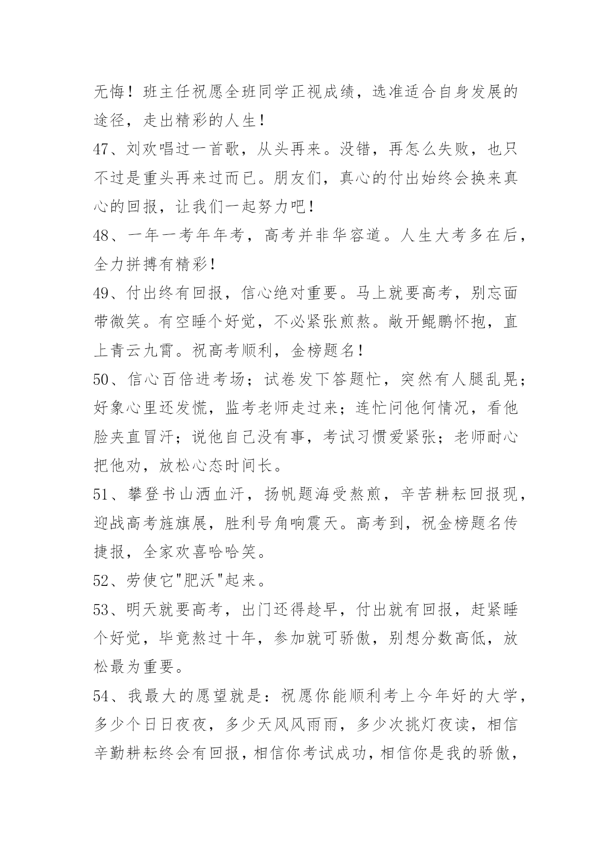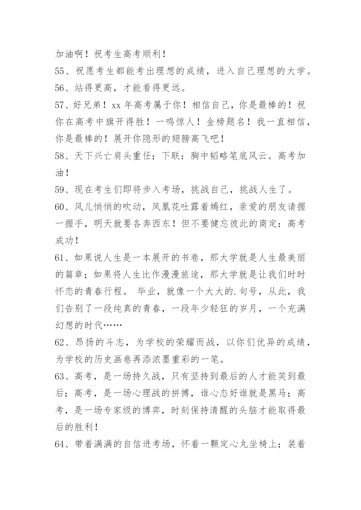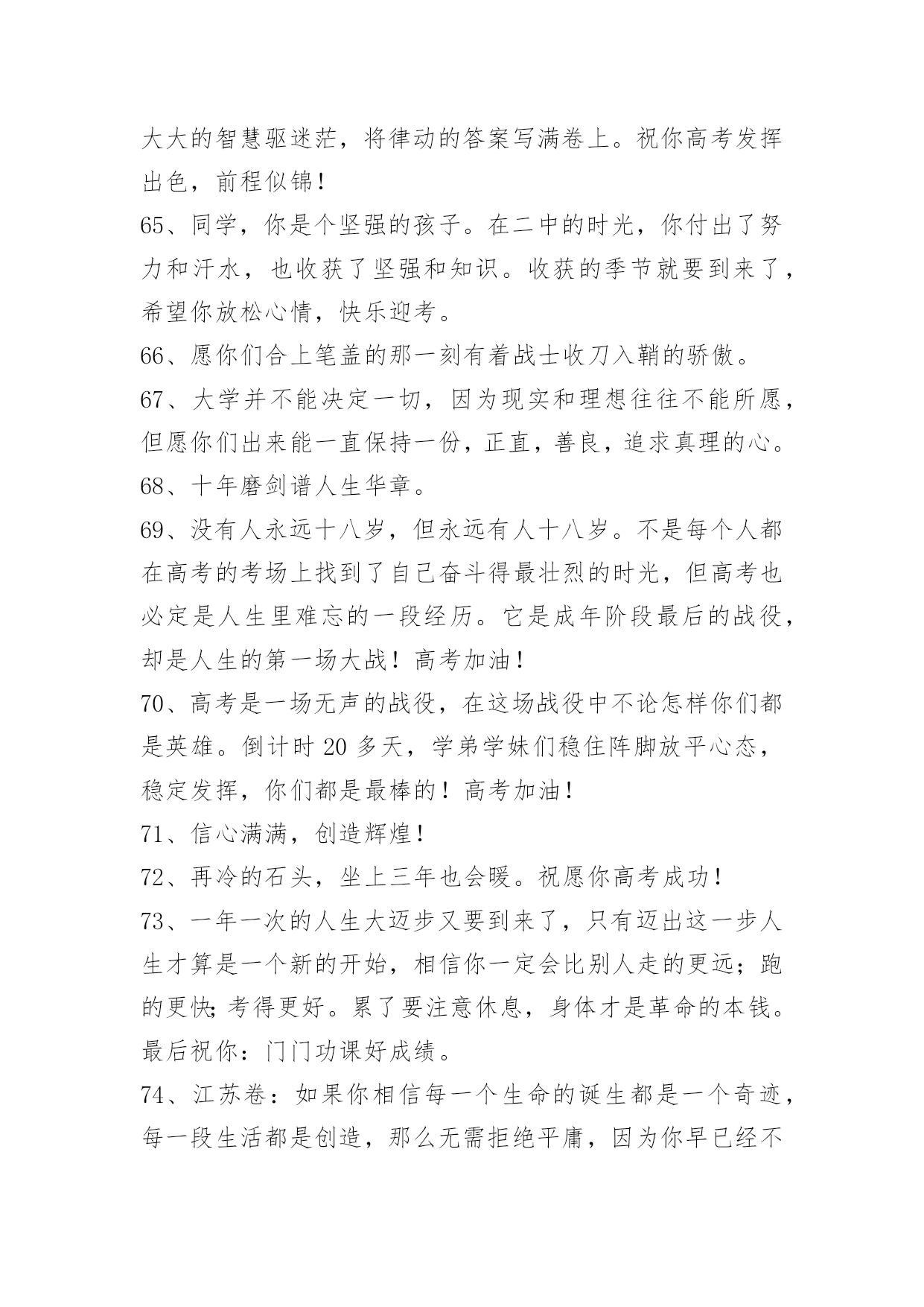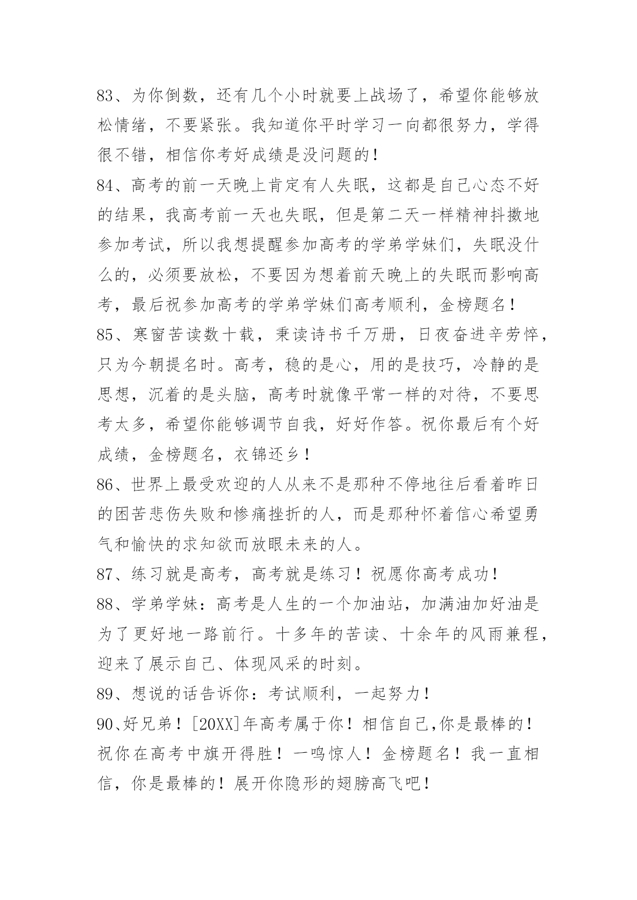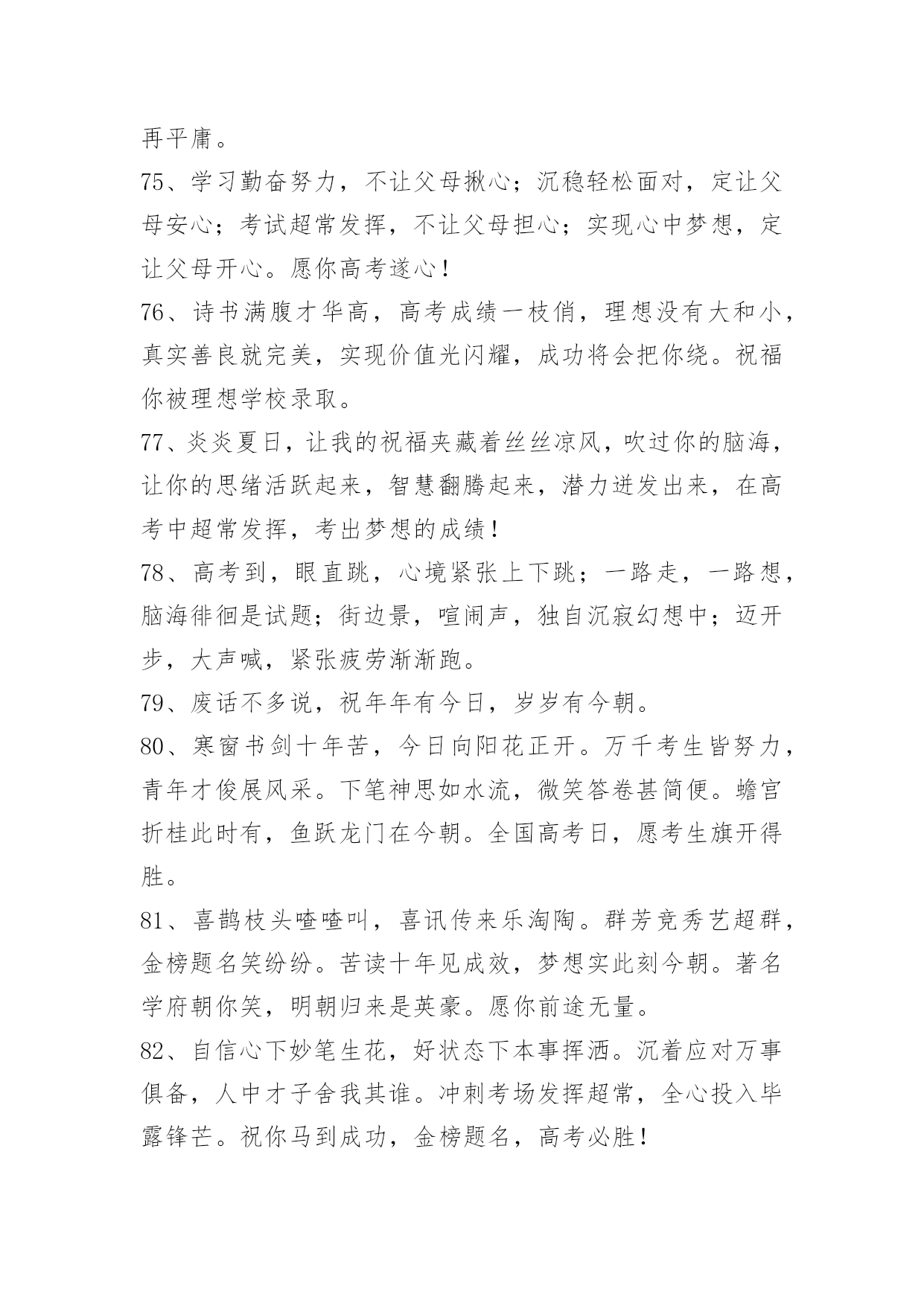 经典高考顺利祝福寄语经典高考顺利祝福寄语大全(精选100句)蜂飞蝶舞绕花枝,捷报传来甜如蜜。笑逐颜开告亲友,合家欢畅享不够。举杯畅饮庆题名,实现幻想笑盈盈。开辟人生新航线,执着进取书绚烂。愿你出路无限美好。本文是小编特意为各位读者整理的高考顺利祝福寄语,欢迎大家分享。1、自信是走向成功的第一步,缺乏信心是失败的主要原因。2、点燃希望的火焰,鼓起梦想的风帆,敲响拚搏的鼓点,迎接必经的挑战,收获喜悦的灿烂!祝你高考顺利,马到成功。3、当你收到这条短信的时候,"胜利的大门"正在向你徐徐开启,欢迎你"王者归来"。祝福你"金榜题名",大展宏图!4、高考又来临,心态要放稳,寒窗苦读难,胜利在眼前,六月天气热,成功手中握,今年的高考,你一定是最棒的,加油!5、举着高考的旗帜,吹着冲锋的号角,淹没痛苦与汗水,终于迎来这一天,装着满腹的ABC,带着执着的梦想,轻松进入考场,收获带着耀眼光环的人生!准备就绪,最后冲刺!6、迈向明天美好的生活,我坚信,你们付出了汗水,经受了考验,理想中大学殿堂的大门就一定会为你们而敞开,让你们继续艰辛却快乐的求学之路!7、高考到来之际,放松心理压力。切记提前进场,以免路途拥挤。答题技巧很多,心中娴熟默记。做前仔细读题,做时后难先易。驱除杂念烦绪,考场循规蹈矩。遭遇难度题目,冷静应对梳理。做完认真检查,查错补缺有益。8、一世饱读千世史,十年寒窗百年荣。9、北辰大鹏展翅看我六月考场,背水勇战天骄夺魁定有时。10、金榜题名!名落孙山!都只是短暂的。朋友只要你努力了,得失不要看得太重,失败是成功之母!努力吧努力!成功属于努力者!11、提高一分,干掉千人!没有高考,你拼得过"富二代"吗?考过高富帅,战胜"官二代"!12、加油高考!亲爱的朋友,平和一下自己的心态,控制自己的情绪,以平常心态应考,考完一门忘一门,让自己尽量放松,好好休息。希望你一举高中喔!13、回首向来萧瑟处,每一次风浪、每一片荆棘都是值得感激的。衷心地祝福你在今年的高考中夺得头魁。14、争取时间就是争取成功,提高效率就是提高分数。不必每分钟都学习,但求学习中每分钟都有收获。超越自己,向自己挑战,向弱项挑战,向懒惰挑战,向陋习挑战。15、为向你表示热烈的祝贺,特别地送上升学祝福语!我的孩子,你被理想中的学校录取了,这要算是你人生中一个重要的里程碑。好羡慕你,你简直是上帝的宠儿!16、在这个残酷的夏天迎来了高考,祝福高考学子顺利考上理想大学,美梦成真!17、祝[20XX]高考一切顺利成功!金榜题名!美梦成真!18、想说爱你,感觉太沉;想说喜欢,感觉太轻;一天天地眷恋,一夜夜的无眠,我只有数着相思的绿莹帘珠,托星月寄到你窗前。祝高考顺意!19、这两天的考试过程中,要调整好自己的情绪,考过一门,就不要再想了,重要的是吃好,喝好,休息好,营造一种良好的应考氛围,祝愿我自己考试顺利!20、明天就要高考了,相信你会成功的!祝你金榜题名!妹妹祝你考出好成绩,如愿以偿,祝其他好友马到成功。21、作为一次经历,失败有时比成功更有价值。失败可以给我们留下更深刻而持久的记忆和思考。面对高考,保持你心灵的善良与纯洁;保持你情感的热情与丰富;保持你精神的进取与激昂!22、高考即将来临,不要紧张,不要害怕,你可以选择这样的"三心二意":恒心、信心、决心;乐意、创意;成功抵达你梦想中的学府!加油!23、春天是碧绿是天地,秋天是黄金的世界。愿你用青春的绿色去酿造未来的金秋。24、只有比别人更早、更勤奋地努力,才能尝到成功的滋味。25、一要吃得好,营养跟得上;二要睡得香,精力旺旺滴;三要心情好,遇难也不慌;四要命运运限好,超常施展好。高考来临,祝你沉着冷静,施展最好成绩!26、穿梭书海勤为舟,苦中有乐心亦欢。今朝自信入考场,立志书写好人生。才高八斗来答卷,学富五车才思敏。折桂夺魁本日事,人生遍开幸福花。全国高考日,愿莘莘学子赢得美丽前程。27、有时候,洒脱一点,眼前便柳暗花明;宽容一点,心中便海阔天空。身边的世界往往比我们想象的要睿智与宽容。28、第一行歪斜的脚印,已被岁月的风尘抹平;而生活的道路呀,还在你的脚下延伸。我祝愿你:大步迈上新的征程,并留下一串串闪光的脚印!29、高考烈日高照,出门你要趁早。付出会有回报,晚上睡个好觉。毕竟熬过十年,参加就可骄傲。别想分数高低,放松最为重要。老妈最近很累,别忘对她笑笑,老爸场场接送,给他一个拥抱。穿得漂漂亮亮,誓把监考迷倒。最后提醒一遍,检查铅笔小刀!30、春天你撒下汗水,用一片碧绿来换取金秋黄金满地,收获是成功喜悦,迈入人生另一阶段,你生命会更加精彩。恭喜高考成功!31、高考快到来,平常心看待;功夫用到家,精神就可嘉;题海战术拒,规律要遵循;营养要跟上,力量多储藏;休息来按时,通宵不可取;寒窗苦读情,付出苍天明,无论输和赢,你都是精英。祝愿高考之