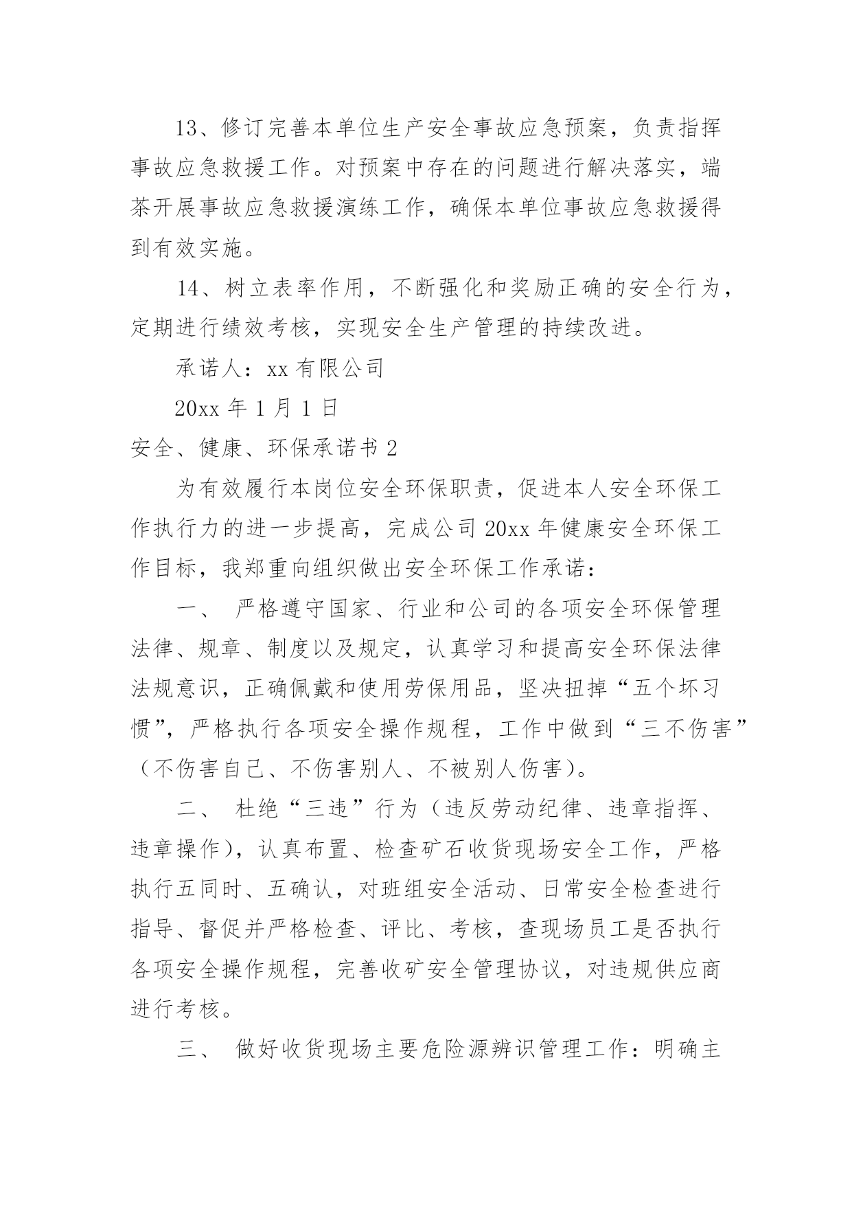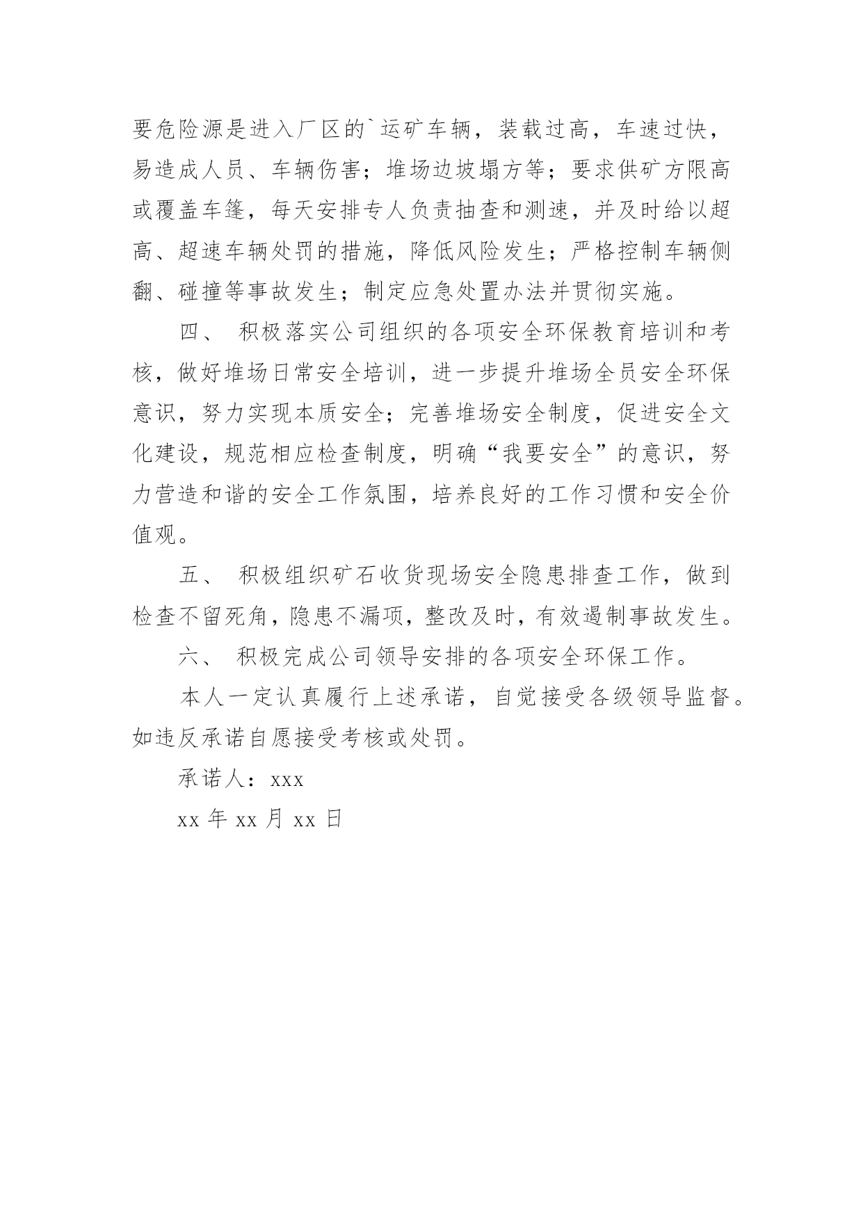 安全、健康、环保承诺书安全、健康、环保承诺书随着社会一步步向前发展,承诺书的使用频率越来越高,承诺书是承诺人对要约完全的、单纯的同意,并以书面的形式表示。相信很多朋友都对写承诺书感到非常苦恼吧,以下是小编精心整理的安全、健康、环保承诺书,欢迎大家分享。安全、健康、环保承诺书1为保障人民群众的身体健康、生命安全和财产安全,防止和减少生产安全事故发生,现郑重承诺,在工作中严格履行以下职责和义务:1、切实树立“安全第一、预防为主、综合治理”的思想,对本单位安全事务负有义不容辞的主体责任,建立健全安全生产管理机构,落实全员安全生产责任制。2、确保国家安全生产方针、政策、国家(行业)安全生产法律法规及标准在本单位内得到认真贯彻执行和落实。3、不断建立健全本单位安全生产规则制度和操作规程,鼓励相关内部外部人员积极参与到与安全生产标准化建设不断改进的过程中。4、以预防为主,开展防御管理、防控管理、风险管理和隐患治理,组织、督促本单位开展安全生产大检查,落实重大事故隐患的整改措施。5、保证本单位安全生产必要投入的有效实施,不断采用性技术对生产装置进行维护改造,提高生产装置的安全性,改善劳动生产条件,最大限度的不发生事故、不损害员工及他人健康。6、按国家安全设施“三同时”的规定,确保新、改、扩建项目使用的'设备及设施符合国家安全相关法规、标准要求,不使用国家明令禁止、淘汰的危及生产安全的工艺、设备。7、不断提高自己安全生产技能和管理能力,不违章指挥,不违章操作,监督检查对安全生产各项规章制度执行情况,及时纠正失职和违章行为。8、保障员工安全教育培训、安全生产竞赛活动有效开展,定期组织安全生产工作会议,分析安全生产动态,及时解决安全生产中存在的问题。9、保障按时按量发放不低于国家或行业标准的劳动防护用品给员工,并在本单位内得到规范使用。10、加强对全体员工的培训,增强职业安全健康意识,保持员工健康,要求特殊作业人员定时体检。11、牢固树立环保优先工作,自觉承担社会道义和责任,遵守环保法律法规,到定点合法清洗处进行关系清洗,不偷排漏排废弃物。12、在发生安全事故时,按照公司和上级对于的应急方案,认真组织事故应急救援,对事故进行调查处理,并及时向上级报告。13、修订完善本单位生产安全事故应急预案,负责指挥事故应急救援工作。对预案中存在的问题进行解决落实,端茶开展事故应急救援演练工作,确保本单位事故应急救援得到有效实施。14、树立表率作用,不断强化和奖励正确的安全行为,定期进行绩效考核,实现安全生产管理的持续改进。承诺人:xx有限公司20xx年1月1日安全、健康、环保承诺书2为有效履行本岗位安全环保职责,促进本人安全环保工作执行力的进一步提高,完成公司20xx年健康安全环保工作目标,我郑重向组织做出安全环保工作承诺:一、严格遵守国家、行业和公司的各项安全环保管理法律、规章、制度以及规定,认真学习和提高安全环保法律法规意识,正确佩戴和使用劳保用品,坚决扭掉“五个坏习惯”,严格执行各项安全操作规程,工作中做到“三不伤害”(不伤害自己、不伤害别人、不被别人伤害)。二、杜绝“三违”行为(违反劳动纪律、违章指挥、违章操作),认真布置、检查矿石收货现场安全工作,严格执行五同时、五确认,对班组安全活动、日常安全检查进行指导、督促并严格检查、评比、考核,查现场员工是否执行各项安全操作规程,完善收矿安全管理协议,对违规供应商进行考核。三、做好收货现场主要危险源辨识管理工作:明确主要危险源是进入厂区的`运矿车辆,装载过高,车速过快,易造成人员、车辆伤害;堆场边坡塌方等;要求供矿方限高或覆盖车篷,每天安排专人负责抽查和测速,并及时给以超高、超速车辆处罚的措施,降低风险发生;严格控制车辆侧翻、碰撞等事故发生;制定应急处置办法并贯彻实施。四、积极落实公司组织的各项安全环保教育培训和考核,做好堆场日常安全培训,进一步提升堆场全员安全环保意识,努力实现本质安全;完善堆场安全制度,促进安全文化建设,规范相应检查制度,明确“我要安全”的意识,努力营造和谐的安全工作氛围,培养良好的工作习惯和安全价值观。五、积极组织矿石收货现场安全隐患排查工作,做到检查不留死角,隐患不漏项,整改及时,有效遏制事故发生。六、积极完成公司领导安排的各项安全环保工作。本人一定认真履行上述承诺,自觉接受各级领导监督。如违反承诺自愿接受考核或处罚。承诺人:xxxxx年xx月xx日