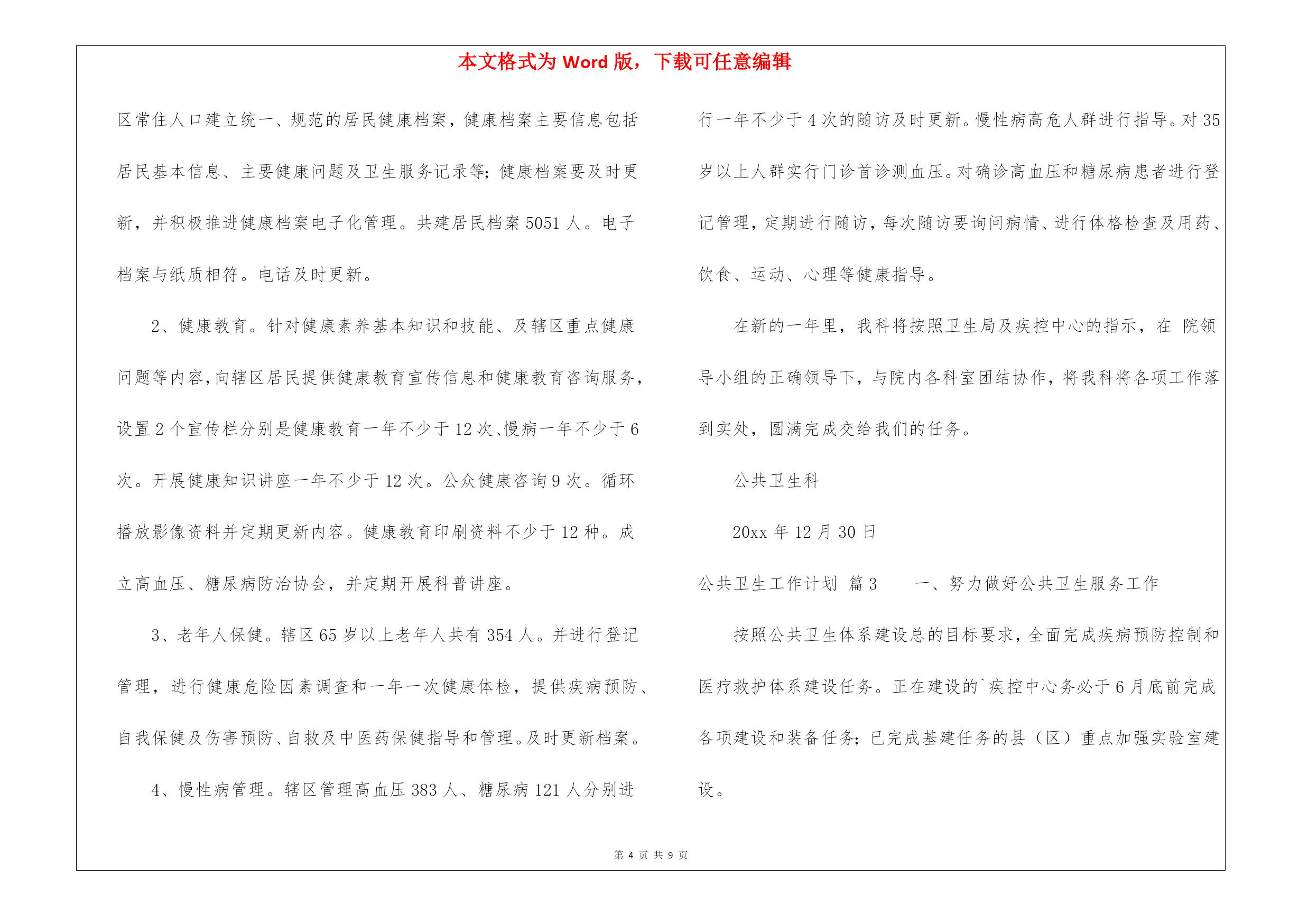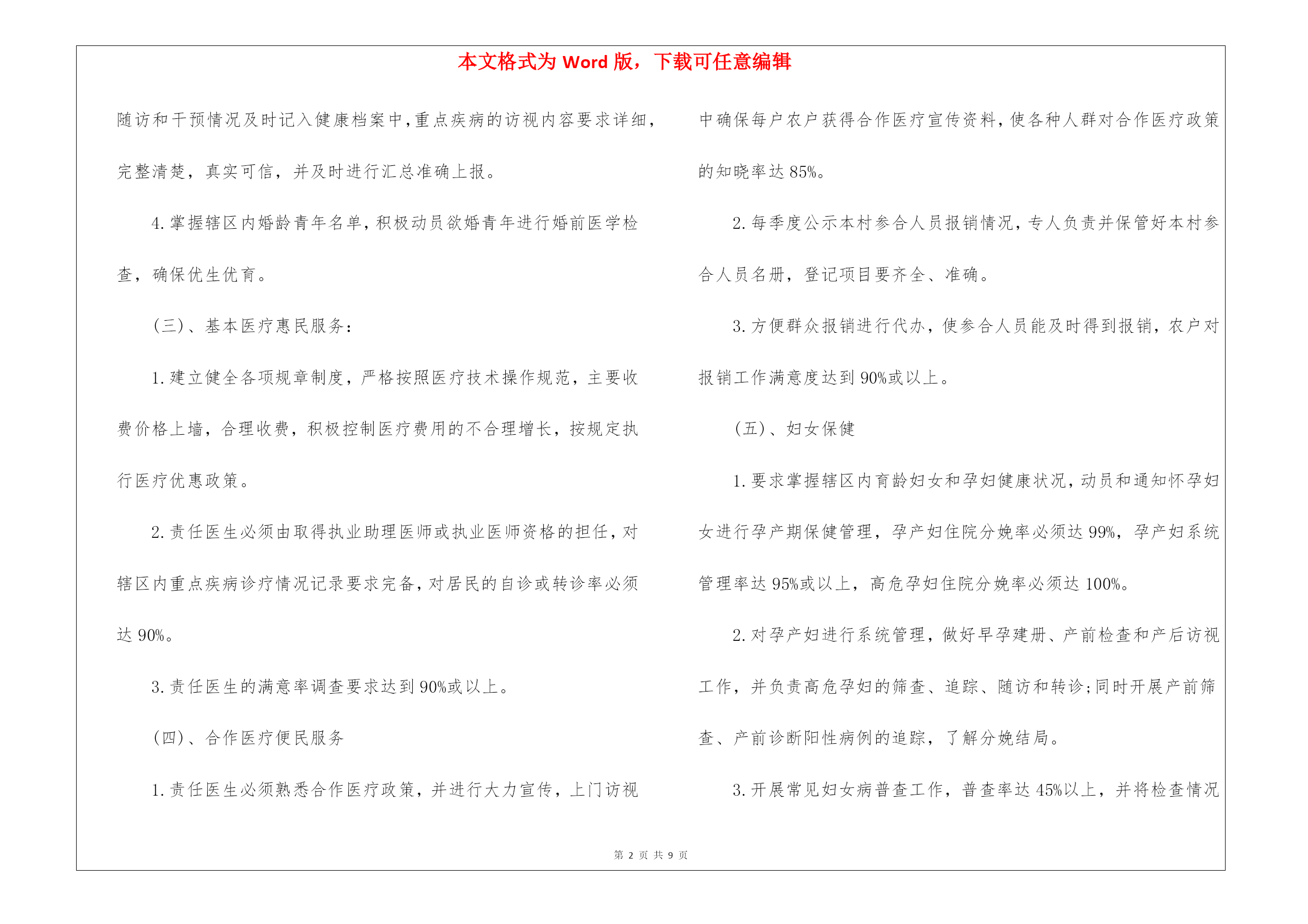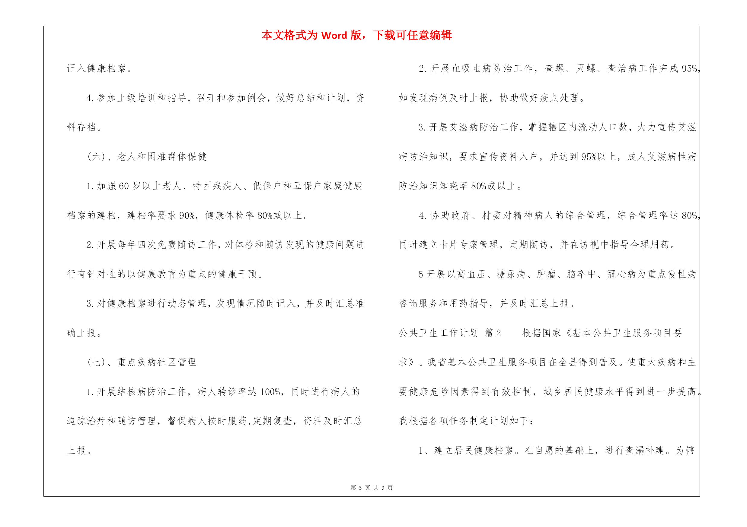 本文格式为Word版,下载可任意编辑第PAGE\*MERGEFORMAT9页共NUMPAGES\*MERGEFORMAT9页关于公共卫生工作计划三篇关于公共卫生工作计划三篇时间一晃而过,很快就要开展新的工作了,何不好好地做个工作计划呢?写工作计划需要注意哪些问题呢?下面是我精心整理的公共卫生工作计划3篇,希望对大家有所帮助。公共卫生工作计划篇1为了确保今年公共卫生服务项目的顺利完成,提高农民群众的健康水平,促进我路南经济社会的协调发展和社会主义新农村建设,特制定20xx年公共卫生工作及社区卫生服务工作计划如下:一、进一步加强领导,健全制度,规范行为。今年我站将进一步加强领导,落实到人,根据人口比例,组织实施好本辖区面向农村的十二项公共卫生服务内容,及时整理相关资料、及时上报、归档。二、公共卫生服务项目(一)、健康教育1.要求必须有工作计划和总结,内容详实。2.健康教育课每两个月开课一次,内容要有季节性、针对性,每次参加人员必须达到10人或以上,宣传栏内容同上,每季要有照片存档。(二)、健康管理1.家庭健康档案建档率要求90%,健康档案册中内容必须完整准确、无缺项,并输入电脑。2.要求责任医生及时将获得的健康体检、儿童预防接种、儿童体检、孕产妇系统管理、常见妇女病检查、职业体检、重点管理慢病、上门访视内容以及因病住院、门急诊等诊疗情况记入健康档案中,要求完整准确,建立动态、连续的家庭健康档案。3.每季开展一次免费上门访视服务,访视率必须达到95%或以上,随访和干预情况及时记入健康档案中,重点疾病的访视内容要求详细,完整清楚,真实可信,并及时进行汇总准确上报。4.掌握辖区内婚龄青年名单,积极动员欲婚青年进行婚前医学检查,确保优生优育。(三)、基本医疗惠民服务:1.建立健全各项规章制度,严格按照医疗技术操作规范,主要收费价格上墙,合理收费,积极控制医疗费用的不合理增长,按规定执行医疗优惠政策。2.责任医生必须由取得执业助理医师或执业医师资格的担任,对辖区内重点疾病诊疗情况记录要求完备,对居民的自诊或转诊率必须达90%。3.责任医生的满意率调查要求达到90%或以上。(四)、合作医疗便民服务1.责任医生必须熟悉合作医疗政策,并进行大力宣传,上门访视中确保每户农户获得合作医疗宣传资料,使各种人群对合作医疗政策的知晓率达85%。2.每季度公示本村参合人员报销情况,专人负责并保管好本村参合人员名册,登记项目要齐全、准确。3.方便群众报销进行代办,使参合人员能及时得到报销,农户对报销工作满意度达到90%或以上。(五)、妇女保健1.要求掌握辖区内育龄妇女和孕妇健康状况,动员和通知怀孕妇女进行孕产期保健管理,孕产妇住院分娩率必须达99%,孕产妇系统管理率达95%或以上,高危孕妇住院分娩率必须达100%。2.对孕产妇进行系统管理,做好早孕建册、产前检查和产后访视工作,并负责高危孕妇的筛查、追踪、随访和转诊;同时开展产前筛查、产前诊断阳性病例的追踪,了解分娩结局。3.开展常见妇女病普查工作,普查率达45%以上,并将检查情况记入健康档案。4.参加上级培训和指导,召开和参加例会,做好总结和计划,资料存档。(六)、老人和困难群体保健1.加强60岁以上老人、特困残疾人、低保户和五保户家庭健康档案的建档,建档率要求90%,健康体检率80%或以上。2.开展每年四次免费随访工作,对体检和随访发现的健康问题进行有针对性的以健康教育为重点的健康干预。3.对健康档案进行动态管理,发现情况随时记入,并及时汇总准确上报。(七)、重点疾病社区管理1.开展结核病防治工作,病人转诊率达100%,同时进行病人的追踪治疗和随访管理,督促病人按时服药,定期复查,资料及时汇总上报。2.开展血吸虫病防治工作,查螺、灭螺、查治病工作完成95%,如发现病例及时上报,协助做好疫点处理。3.开展艾滋病防治工作,掌握辖区内流动人口数,大力宣传艾滋病防治知识,要求宣传资料入户,并达到95%以上,成人艾滋病性病防治知识知晓率80%或以上。4.协助政府、村委对精神病人的综合管理,综合管理率达80%,同时建立卡片专案管理,定期随访,并在访视中指导合理用药。5开展以高血压、糖尿病、肿瘤、脑卒中、冠心病为重点慢性病咨询服务和用药指导,并及时汇总上报。公共卫生工作计划篇2根据国家《基本公共卫生服务项目要求》。我省基本公共卫生服务项目在全县得到普及。使重大疾病和主要健康危险因素得到有效控制,城乡居民健康水平得到进一步提高。我根据各项任务制定计划如下:1、建立居民健康档案。在自愿的基础上,进行查漏补建。为辖区常住人口建立统一、规范的居民健康档案,健康档案主要信息包括居民基本信息、主要健康问题及卫生服务记录等;健康档案要及时更新,并积极推进健康档案电子化管理。共建居民档案5051人。电子档案与纸质相符