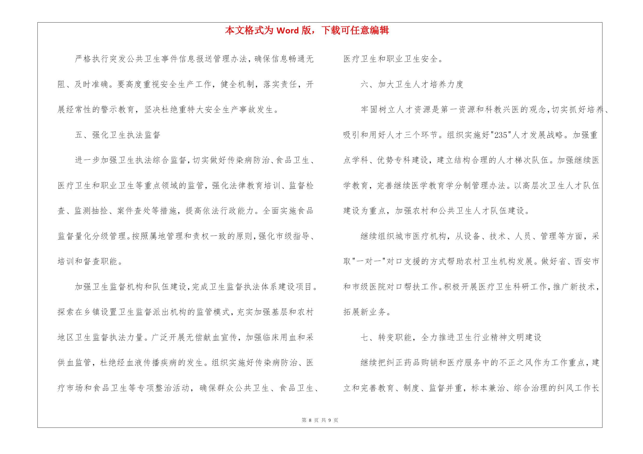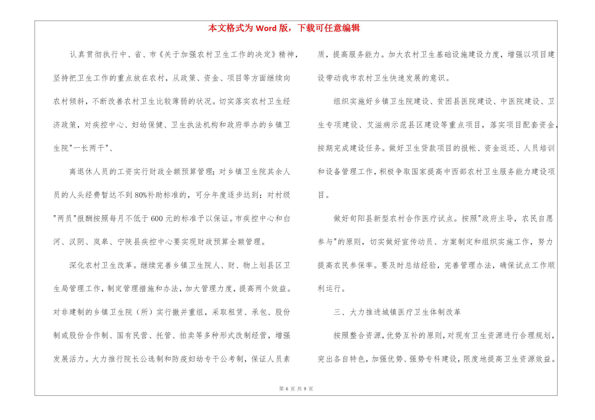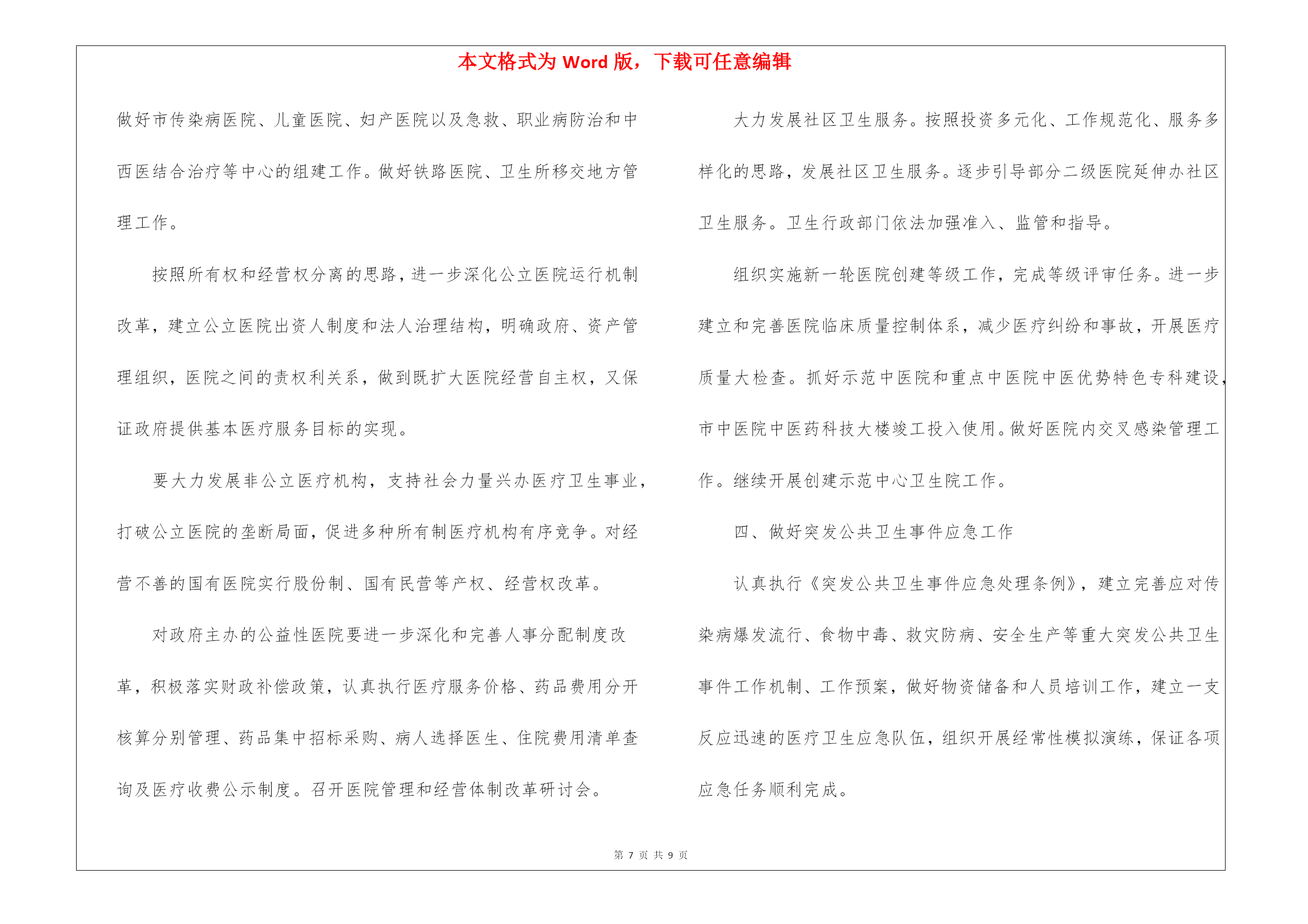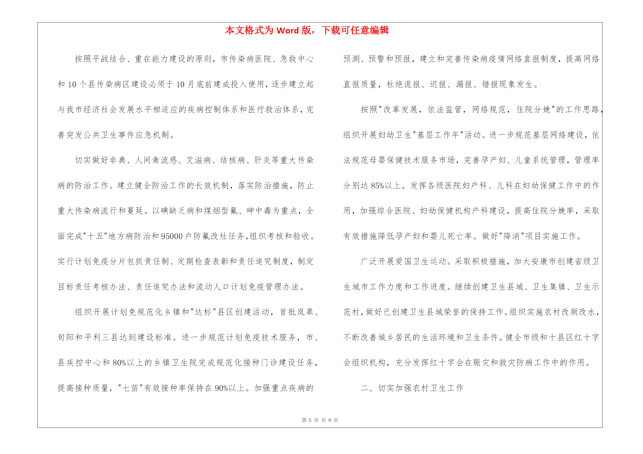 本文格式为Word版,下载可任意编辑第PAGE\*MERGEFORMAT9页共NUMPAGES\*MERGEFORMAT9页关于公共卫生工作计划三篇关于公共卫生工作计划三篇时间一晃而过,很快就要开展新的工作了,何不好好地做个工作计划呢?写工作计划需要注意哪些问题呢?下面是我精心整理的公共卫生工作计划3篇,希望对大家有所帮助。公共卫生工作计划篇1为了确保今年公共卫生服务项目的顺利完成,提高农民群众的健康水平,促进我路南经济社会的协调发展和社会主义新农村建设,特制定20xx年公共卫生工作及社区卫生服务工作计划如下:一、进一步加强领导,健全制度,规范行为。今年我站将进一步加强领导,落实到人,根据人口比例,组织实施好本辖区面向农村的十二项公共卫生服务内容,及时整理相关资料、及时上报、归档。二、公共卫生服务项目(一)、健康教育1.要求必须有工作计划和总结,内容详实。2.健康教育课每两个月开课一次,内容要有季节性、针对性,每次参加人员必须达到10人或以上,宣传栏内容同上,每季要有照片存档。(二)、健康管理1.家庭健康档案建档率要求90%,健康档案册中内容必须完整准确、无缺项,并输入电脑。2.要求责任医生及时将获得的健康体检、儿童预防接种、儿童体检、孕产妇系统管理、常见妇女病检查、职业体检、重点管理慢病、上门访视内容以及因病住院、门急诊等诊疗情况记入健康档案中,要求完整准确,建立动态、连续的家庭健康档案。3.每季开展一次免费上门访视服务,访视率必须达到95%或以上,随访和干预情况及时记入健康档案中,重点疾病的访视内容要求详细,完整清楚,真实可信,并及时进行汇总准确上报。4.掌握辖区内婚龄青年名单,积极动员欲婚青年进行婚前医学检查,确保优生优育。(三)、基本医疗惠民服务:1.建立健全各项规章制度,严格按照医疗技术操作规范,主要收费价格上墙,合理收费,积极控制医疗费用的不合理增长,按规定执行医疗优惠政策。2.责任医生必须由取得执业助理医师或执业医师资格的担任,对辖区内重点疾病诊疗情况记录要求完备,对居民的自诊或转诊率必须达90%。3.责任医生的满意率调查要求达到90%或以上。(四)、合作医疗便民服务1.责任医生必须熟悉合作医疗政策,并进行大力宣传,上门访视中确保每户农户获得合作医疗宣传资料,使各种人群对合作医疗政策的知晓率达85%。2.每季度公示本村参合人员报销情况,专人负责并保管好本村参合人员名册,登记项目要齐全、准确。3.方便群众报销进行代办,使参合人员能及时得到报销,农户对报销工作满意度达到90%或以上。(五)、妇女保健1.要求掌握辖区内育龄妇女和孕妇健康状况,动员和通知怀孕妇女进行孕产期保健管理,孕产妇住院分娩率必须达99%,孕产妇系统管理率达95%或以上,高危孕妇住院分娩率必须达100%。2.对孕产妇进行系统管理,做好早孕建册、产前检查和产后访视工作,并负责高危孕妇的筛查、追踪、随访和转诊;同时开展产前筛查、产前诊断阳性病例的追踪,了解分娩结局。3.开展常见妇女病普查工作,普查率达45%以上,并将检查情况记入健康档案。4.参加上级培训和指导,召开和参加例会,做好总结和计划,资料存档。(六)、老人和困难群体保健1.加强60岁以上老人、特困残疾人、低保户和五保户家庭健康档案的建档,建档率要求90%,健康体检率80%或以上。2.开展每年四次免费随访工作,对体检和随访发现的健康问题进行有针对性的以健康教育为重点的健康干预。3.对健康档案进行动态管理,发现情况随时记入,并及时汇总准确上报。(七)、重点疾病社区管理1.开展结核病防治工作,病人转诊率达100%,同时进行病人的追踪治疗和随访管理,督促病人按时服药,定期复查,资料及时汇总上报。2.开展血吸虫病防治工作,查螺、灭螺、查治病工作完成95%,如发现病例及时上报,协助做好疫点处理。3.开展艾滋病防治工作,掌握辖区内流动人口数,大力宣传艾滋病防治知识,要求宣传资料入户,并达到95%以上,成人艾滋病性病防治知识知晓率80%或以上。4.协助政府、村委对精神病人的综合管理,综合管理率达80%,同时建立卡片专案管理,定期随访,并在访视中指导合理用药。5开展以高血压、糖尿病、肿瘤、脑卒中、冠心病为重点慢性病咨询服务和用药指导,并及时汇总上报。公共卫生工作计划篇2根据国家《基本公共卫生服务项目要求》。我省基本公共卫生服务项目在全县得到普及。使重大疾病和主要健康危险因素得到有效控制,城乡居民健康水平得到进一步提高。我根据各项任务制定计划如下:1、建立居民健康档案。在自愿的基础上,进行查漏补建。为辖区常住人口建立统一、规范的居民健康档案,健康档案主要信息包括居民基本信息、主要健康问题及卫生服务记录等;健康档案要及时更新,并积极推进健康档案电子化管理。共建居民档案5051人。电子档案与纸质相符