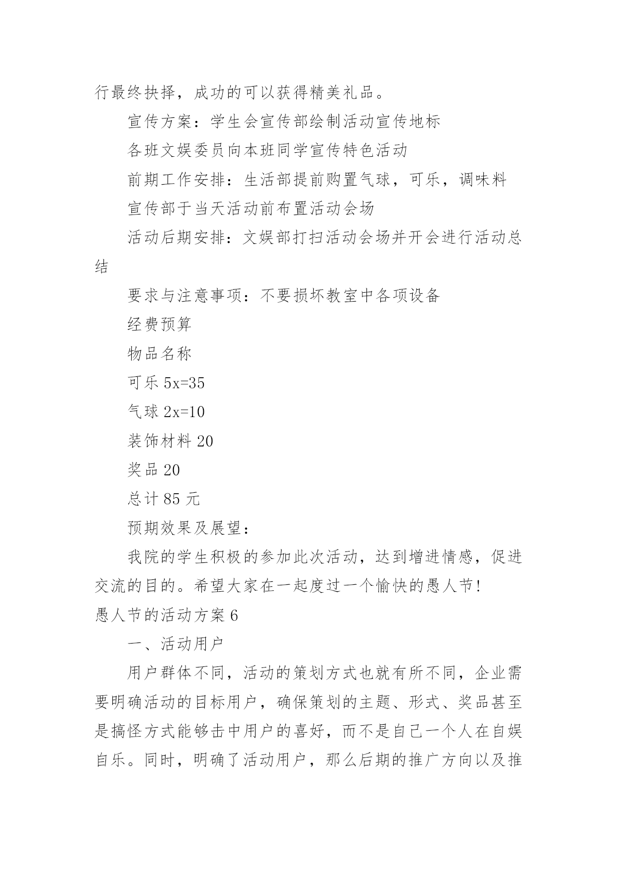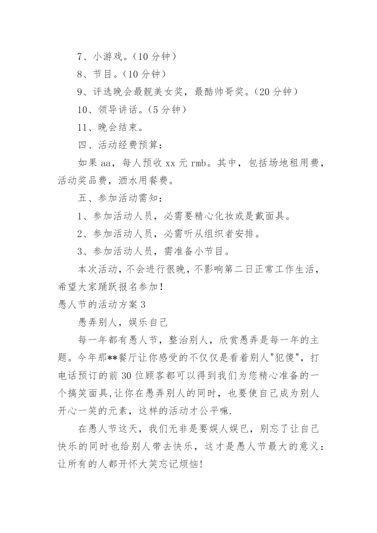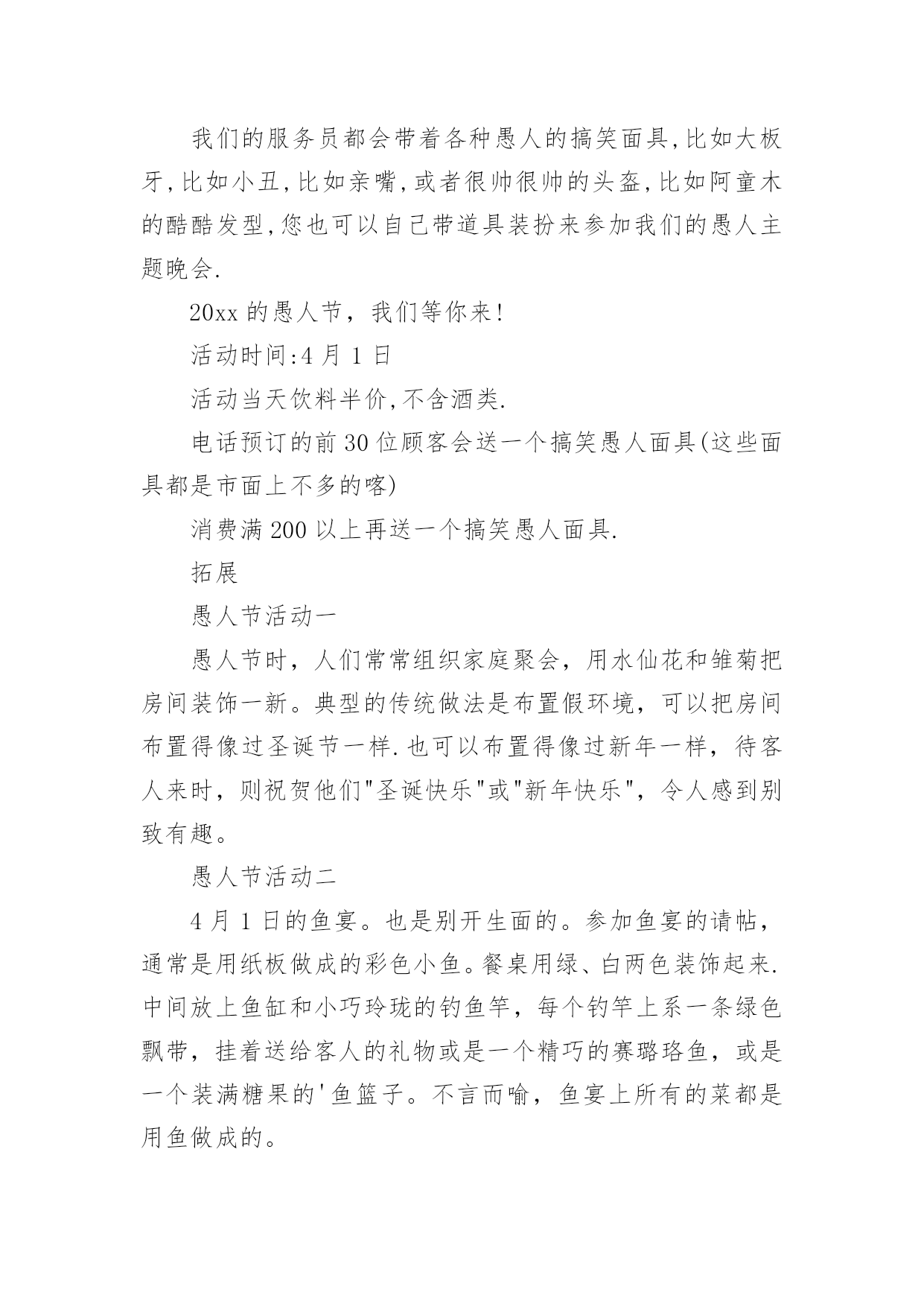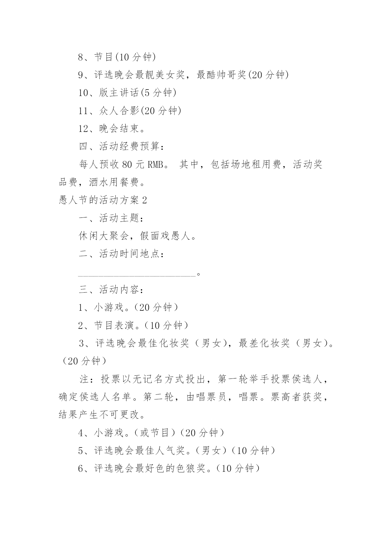 愚人节的活动方案愚人节的活动方案为了确保事情或工作有序有力开展,常常要根据具体情况预先制定方案,方案属于计划类文书的一种。那要怎么制定科学的方案呢?以下是小编精心整理的愚人节的活动方案,仅供参考,大家一起来看看吧。愚人节的活动方案1一、活动主题:休闲大聚会,假面戏愚人二、活动时间地点:活动时间:公元20xx年4月1日20:00地点待定:三、活动内容:1、小游戏:(20分钟)2、节目表演:(10分钟)3、评选晚会最佳化装奖(男女),最差化装奖(男女)。(20分钟)注:投票以无记名方式投出,第一轮举手投票侯选人,确定侯选人名单。第二轮,由唱票员,唱票。票高者获奖,结果产生不可更改。4、小游戏(或节目)(20分钟)5、评选晚会最佳人气奖(男女)(10分钟)6、评选晚会最好色的色狼奖(10分钟)7、小游戏(10分钟)8、节目(10分钟)9、评选晚会最靓美女奖,最酷帅哥奖(20分钟)10、版主讲话(5分钟)11、众人合影(20分钟)12、晚会结束。四、活动经费预算:每人预收80元RMB。其中,包括场地租用费,活动奖品费,酒水用餐费。愚人节的活动方案2一、活动主题:休闲大聚会,假面戏愚人。二、活动时间地点:_______________________。三、活动内容:1、小游戏。(20分钟)2、节目表演。(10分钟)3、评选晚会最佳化妆奖(男女),最差化妆奖(男女)。(20分钟)注:投票以无记名方式投出,第一轮举手投票侯选人,确定侯选人名单。第二轮,由唱票员,唱票。票高者获奖,结果产生不可更改。4、小游戏。(或节目)(20分钟)5、评选晚会最佳人气奖。(男女)(10分钟)6、评选晚会最好色的色狼奖。(10分钟)7、小游戏。(10分钟)8、节目。(10分钟)9、评选晚会最靓美女奖,最酷帅哥奖。(20分钟)10、领导讲话。(5分钟)11、晚会结束。四、活动经费预算:如果aa,每人预收xx元rmb。其中,包括场地租用费,活动奖品费,酒水用餐费。五、参加活动需知:1、参加活动人员,必需要精心化妆或是戴面具。2、参加活动人员,必需听从组织者安排。3、参加活动人员,需准备小节目。本次活动,不会进行很晚,不影响第二日正常工作生活,希望大家踊跃报名参加!愚人节的活动方案3愚弄别人,娱乐自己每一年都有愚人节,整治别人,欣赏愚弄是每一年的主题。今年那**餐厅让你感受的不仅仅是看着别人"犯傻",打电话预订的前30位顾客都可以得到我们为您精心准备的一个搞笑面具,让你在愚弄别人的同时,也要使自己成为别人开心一笑的元素,这样的活动才公平嘛.在愚人节这天,我们无非是要娱人娱已,别忘了让自己快乐的同时也给别人带去快乐,这才是愚人节最大的意义:让所有的人都开怀大笑忘记烦恼!我们的服务员都会带着各种愚人的搞笑面具,比如大板牙,比如小丑,比如亲嘴,或者很帅很帅的头盔,比如阿童木的酷酷发型,您也可以自己带道具装扮来参加我们的愚人主题晚会.20xx的愚人节,我们等你来!活动时间:4月1日活动当天饮料半价,不含酒类.电话预订的前30位顾客会送一个搞笑愚人面具(这些面具都是市面上不多的喀)消费满200以上再送一个搞笑愚人面具.拓展愚人节活动一愚人节时,人们常常组织家庭聚会,用水仙花和雏菊把房间装饰一新。典型的传统做法是布置假环境,可以把房间布置得像过圣诞节一样.也可以布置得像过新年一样,待客人来时,则祝贺他们"圣诞快乐"或"新年快乐",令人感到别致有趣。愚人节活动二4月1日的鱼宴。也是别开生面的。参加鱼宴的请帖,通常是用纸板做成的彩色小鱼。餐桌用绿、白两色装饰起来.中间放上鱼缸和小巧玲珑的钓鱼竿,每个钓竿上系一条绿色飘带,挂着送给客人的礼物或是一个精巧的赛璐珞鱼,或是一个装满糖果的'鱼篮子。不言而喻,鱼宴上所有的菜都是用鱼做成的。愚人节活动三在愚人节的聚会上,还有一种做假菜的风俗。有人曾经描述过一个典型的愚人节菜谱:先是一道"色拉",莴苣叶上撒满了绿胡椒,但是把叶子揭开后,才发现下面原来是牡蛎鸡尾酒;第二道菜是"烤土豆",其实下面是甜面包屑和鲜蘑;此后上的菜还有用蟹肉作伪装的烧鸡和埋藏在西红柿色拉下面的覆盆子冰淇淋。饭后,客人还可以从药丸盒里取食糖果。愚人节活动四不过愚人节最典型的活动还是大家互相开玩笑,用假话捉弄对方。有的人把细线拴着的钱包丢在大街上,自己在暗处拉着线的另一端。一旦有人捡起钱包,他们就出其不意地猛然把钱包拽走。还有人把砖头放在破帽子下面搁在马路当中,然后等着看谁来了会踢它。小孩们会告诉父母说自己的书包破了个洞,或者脸上有个黑点.等大人俯身来看时,他们就一边喊着"四月傻瓜"。一边笑着跑开去。总之,每逢愚人节这一天,动物园和水族馆还会接到不少打给菲什(鱼)先生泰歌(老虎)先生的电话,常常惹得工作人员掐断电话线,以便减少麻烦。愚人节的活动方案4黑暗餐厅推出愚人节黑暗陶