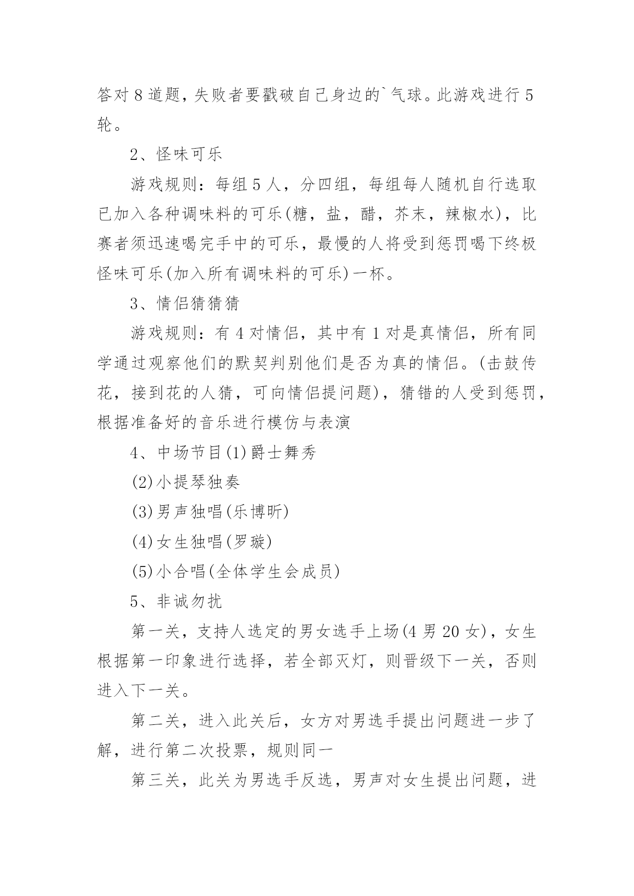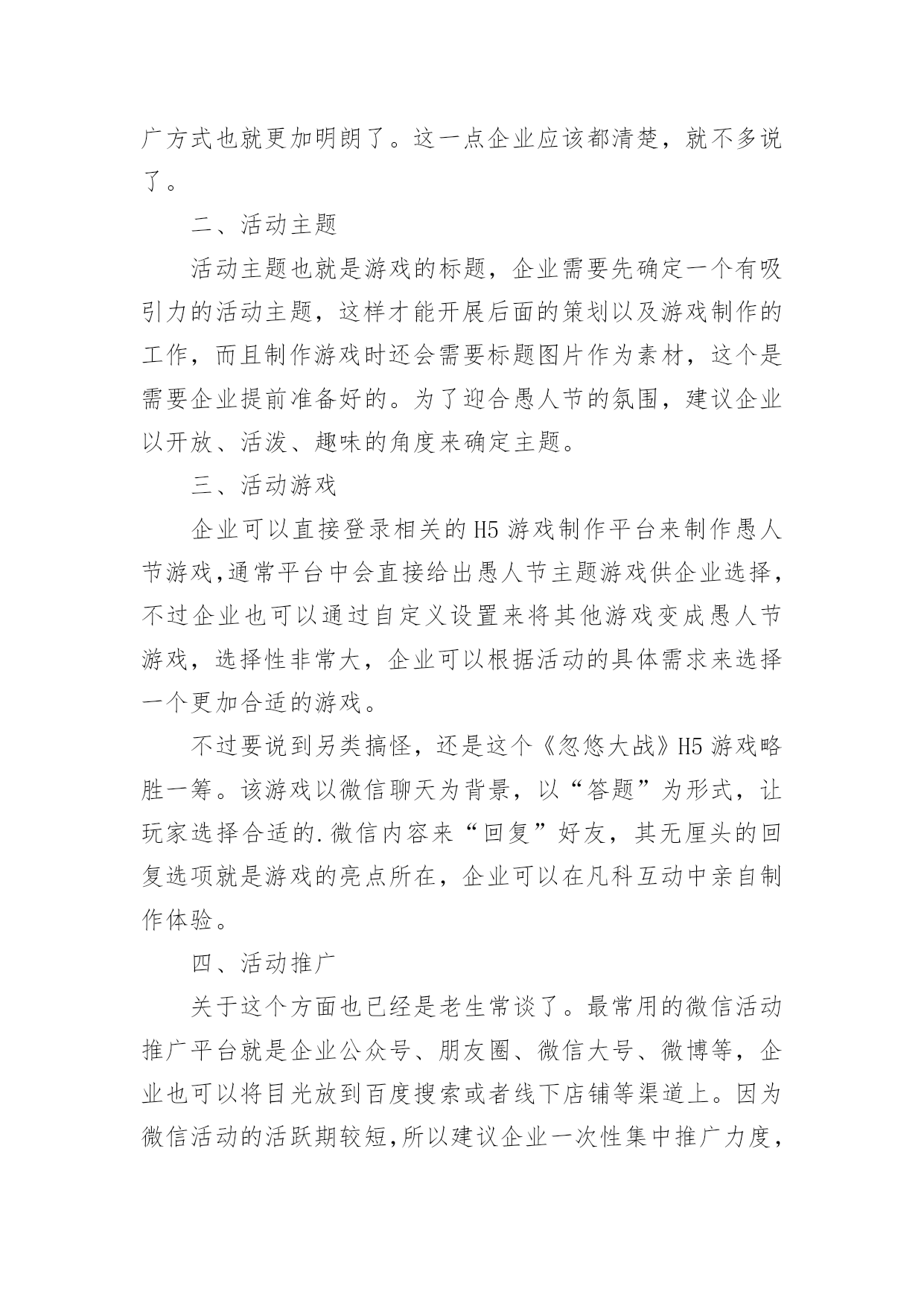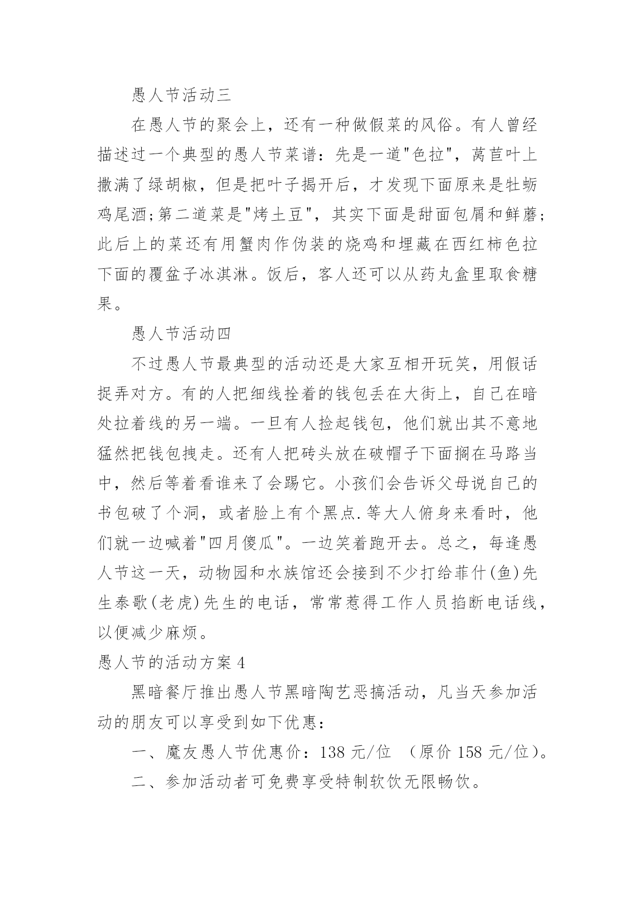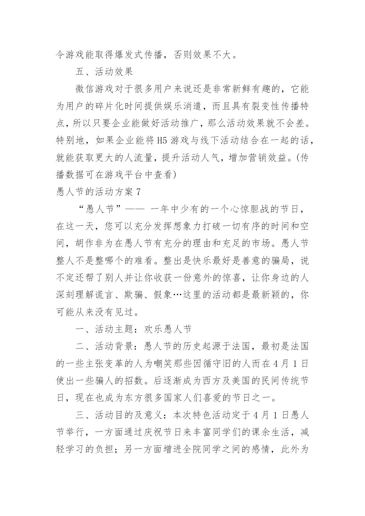 愚人节的活动方案愚人节的活动方案为了确保事情或工作有序有力开展,常常要根据具体情况预先制定方案,方案属于计划类文书的一种。那要怎么制定科学的方案呢?以下是小编精心整理的愚人节的活动方案,仅供参考,大家一起来看看吧。愚人节的活动方案1一、活动主题:休闲大聚会,假面戏愚人二、活动时间地点:活动时间:公元20xx年4月1日20:00地点待定:三、活动内容:1、小游戏:(20分钟)2、节目表演:(10分钟)3、评选晚会最佳化装奖(男女),最差化装奖(男女)。(20分钟)注:投票以无记名方式投出,第一轮举手投票侯选人,确定侯选人名单。第二轮,由唱票员,唱票。票高者获奖,结果产生不可更改。4、小游戏(或节目)(20分钟)5、评选晚会最佳人气奖(男女)(10分钟)6、评选晚会最好色的色狼奖(10分钟)7、小游戏(10分钟)8、节目(10分钟)9、评选晚会最靓美女奖,最酷帅哥奖(20分钟)10、版主讲话(5分钟)11、众人合影(20分钟)12、晚会结束。四、活动经费预算:每人预收80元RMB。其中,包括场地租用费,活动奖品费,酒水用餐费。愚人节的活动方案2一、活动主题:休闲大聚会,假面戏愚人。二、活动时间地点:_______________________。三、活动内容:1、小游戏。(20分钟)2、节目表演。(10分钟)3、评选晚会最佳化妆奖(男女),最差化妆奖(男女)。(20分钟)注:投票以无记名方式投出,第一轮举手投票侯选人,确定侯选人名单。第二轮,由唱票员,唱票。票高者获奖,结果产生不可更改。4、小游戏。(或节目)(20分钟)5、评选晚会最佳人气奖。(男女)(10分钟)6、评选晚会最好色的色狼奖。(10分钟)7、小游戏。(10分钟)8、节目。(10分钟)9、评选晚会最靓美女奖,最酷帅哥奖。(20分钟)10、领导讲话。(5分钟)11、晚会结束。四、活动经费预算:如果aa,每人预收xx元rmb。其中,包括场地租用费,活动奖品费,酒水用餐费。五、参加活动需知:1、参加活动人员,必需要精心化妆或是戴面具。2、参加活动人员,必需听从组织者安排。3、参加活动人员,需准备小节目。本次活动,不会进行很晚,不影响第二日正常工作生活,希望大家踊跃报名参加!愚人节的活动方案3愚弄别人,娱乐自己每一年都有愚人节,整治别人,欣赏愚弄是每一年的主题。今年那**餐厅让你感受的不仅仅是看着别人"犯傻",打电话预订的前30位顾客都可以得到我们为您精心准备的一个搞笑面具,让你在愚弄别人的同时,也要使自己成为别人开心一笑的元素,这样的活动才公平嘛.在愚人节这天,我们无非是要娱人娱已,别忘了让自己快乐的同时也给别人带去快乐,这才是愚人节最大的意义:让所有的人都开怀大笑忘记烦恼!我们的服务员都会带着各种愚人的搞笑面具,比如大板牙,比如小丑,比如亲嘴,或者很帅很帅的头盔,比如阿童木的酷酷发型,您也可以自己带道具装扮来参加我们的愚人主题晚会.20xx的愚人节,我们等你来!活动时间:4月1日活动当天饮料半价,不含酒类.电话预订的前30位顾客会送一个搞笑愚人面具(这些面具都是市面上不多的喀)消费满200以上再送一个搞笑愚人面具.拓展愚人节活动一愚人节时,人们常常组织家庭聚会,用水仙花和雏菊把房间装饰一新。典型的传统做法是布置假环境,可以把房间布置得像过圣诞节一样.也可以布置得像过新年一样,待客人来时,则祝贺他们"圣诞快乐"或"新年快乐",令人感到别致有趣。愚人节活动二4月1日的鱼宴。也是别开生面的。参加鱼宴的请帖,通常是用纸板做成的彩色小鱼。餐桌用绿、白两色装饰起来.中间放上鱼缸和小巧玲珑的钓鱼竿,每个钓竿上系一条绿色飘带,挂着送给客人的礼物或是一个精巧的赛璐珞鱼,或是一个装满糖果的'鱼篮子。不言而喻,鱼宴上所有的菜都是用鱼做成的。愚人节活动三在愚人节的聚会上,还有一种做假菜的风俗。有人曾经描述过一个典型的愚人节菜谱:先是一道"色拉",莴苣叶上撒满了绿胡椒,但是把叶子揭开后,才发现下面原来是牡蛎鸡尾酒;第二道菜是"烤土豆",其实下面是甜面包屑和鲜蘑;此后上的菜还有用蟹肉作伪装的烧鸡和埋藏在西红柿色拉下面的覆盆子冰淇淋。饭后,客人还可以从药丸盒里取食糖果。愚人节活动四不过愚人节最典型的活动还是大家互相开玩笑,用假话捉弄对方。有的人把细线拴着的钱包丢在大街上,自己在暗处拉着线的另一端。一旦有人捡起钱包,他们就出其不意地猛然把钱包拽走。还有人把砖头放在破帽子下面搁在马路当中,然后等着看谁来了会踢它。小孩们会告诉父母说自己的书包破了个洞,或者脸上有个黑点.等大人俯身来看时,他们就一边喊着"四月傻瓜"。一边笑着跑开去。总之,每逢愚人节这一天,动物园和水族馆还会接到不少打给菲什(鱼)先生泰歌(老虎)先生的电话,常常惹得工作人员掐断电话线,以便减少麻烦。愚人节的活动方案4黑暗餐厅推出愚人节黑暗陶