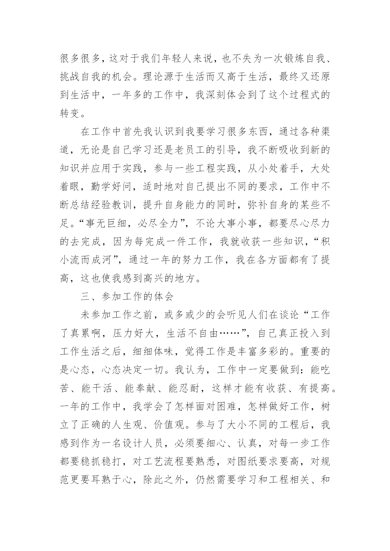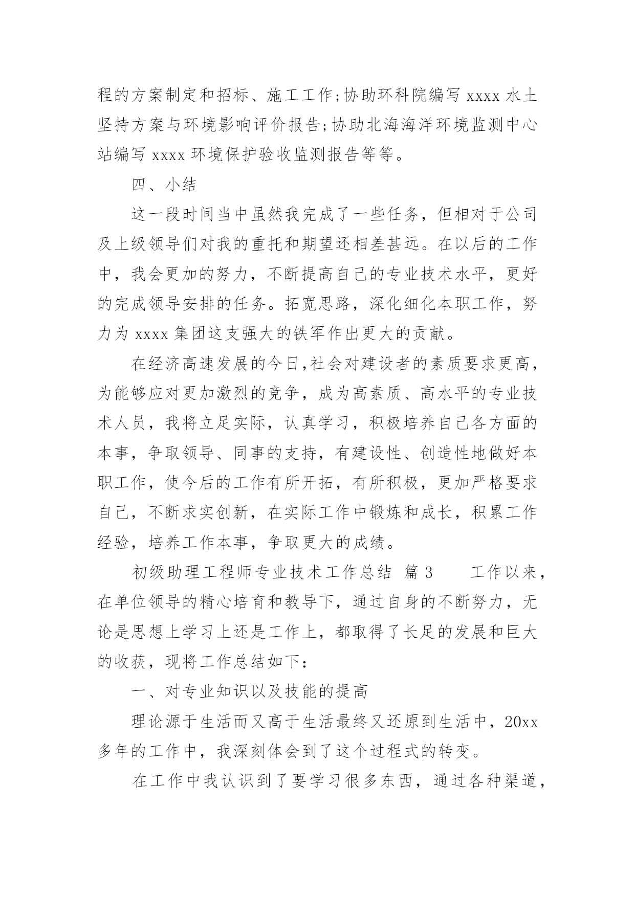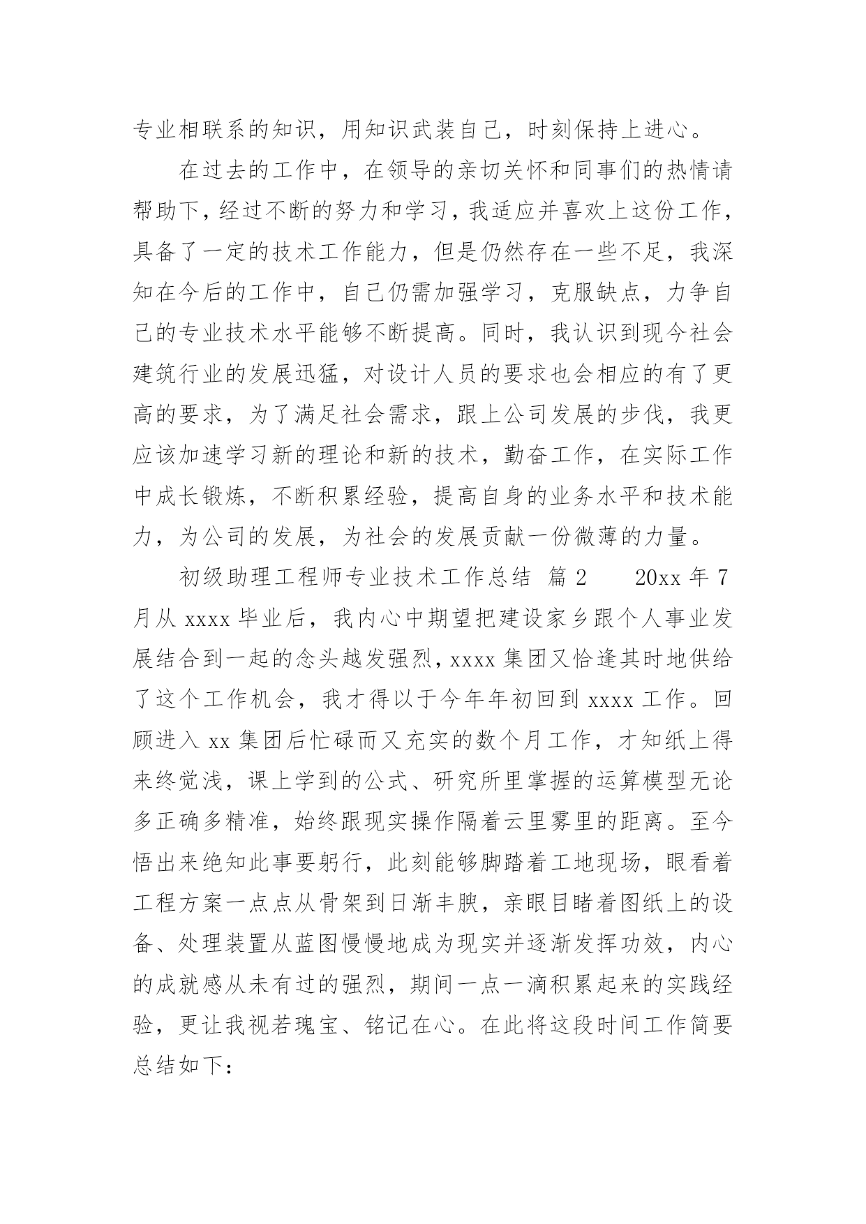初级助理工程师专业技术工作总结初级助理工程师专业技术工作总结(精选14篇)时间乘着年轮循序往前,一段时间的工作已经结束了,相信大家这段时间以来的收获肯定不少吧,好好地做个梳理并写一份工作总结吧。在写之前,可以先参考范文,以下是小编为大家整理的初级助理工程师专业技术工作总结(精选14篇),仅供参考,欢迎大家阅读。初级助理工程师专业技术工作总结篇1时光飞逝,眨眼间我已经步入社会参加工作近一年多的时间了。在这近一年的工作过程中,我收获良多,不仅加深了对原来学校中学习的知识理解,而且对以前书本中没有接触或接触不深的知识有了进一步的认识,开拓了视野,长了见识。工作以来,在单位领导的精心培育和教导下,通过自身的不断努力,无论是思想上、学习上还是工作上,都取得了长足的发展和巨大的收获,现将工作总结如下:一、思想上的进步作为一名预备党员,无论身置何处,要始终坚持认真学习马列主义、毛泽东思想、邓小平理论和“三个代表”重要思想,坚持实事求是,不断提高自身的政治思想觉悟与水平,不断探索与追求,努力保持一名共产党员的先进性。二、对专业知识以及技能的提高我在校期间学习的是机械方面的专业,于现在从事的工作有一点点不同,却也处处相通。正因为此,要学习的东西很多很多,这对于我们年轻人来说,也不失为一次锻炼自我、挑战自我的机会。理论源于生活而又高于生活,最终又还原到生活中,一年多的工作中,我深刻体会到了这个过程式的转变。在工作中首先我认识到我要学习很多东西,通过各种渠道,无论是自己学习还是老员工的引导,我不断吸收到新的知识并应用于实践,参与一些工程实践,从小处着手,大处着眼,勤学好问,适时地对自己提出不同的要求,工作中不断总结经验教训,提升自身能力的同时,弥补自身的某些不足。“事无巨细,必尽全力”,不论大事小事,都要尽心尽力的去完成,因为每完成一件工作,我就收获一些知识,“积小流而成河”,通过一年的努力工作,我在各方面都有了提高,这也使我感到高兴的地方。三、参加工作的体会未参加工作之前,或多或少的会听见人们在谈论“工作了真累啊,压力好大,生活不自由……”,自己真正投入到工作生活之后,细细体味,觉得工作是丰富多彩的。重要的是心态,心态决定一切。我认为,工作中一定要做到:能吃苦、能干活、能奉献、能忍耐,这样才能有收获、有提高。一年的工作中,我学会了怎样面对困难,怎样做好工作,树立了正确的人生观、价值观。参与了大小不同的工程后,我感到作为一名设计人员,必须要细心、认真,对每一步工作都要稳抓稳打,对工艺流程要熟悉,对图纸要求要高,对规范更要耳熟于心,除此之外,仍然需要学习和工程相关、和专业相联系的知识,用知识武装自己,时刻保持上进心。在过去的工作中,在领导的亲切关怀和同事们的热情请帮助下,经过不断的努力和学习,我适应并喜欢上这份工作,具备了一定的技术工作能力,但是仍然存在一些不足,我深知在今后的工作中,自己仍需加强学习,克服缺点,力争自己的专业技术水平能够不断提高。同时,我认识到现今社会建筑行业的发展迅猛,对设计人员的要求也会相应的有了更高的要求,为了满足社会需求,跟上公司发展的步伐,我更应该加速学习新的理论和新的技术,勤奋工作,在实际工作中成长锻炼,不断积累经验,提高自身的业务水平和技术能力,为公司的发展,为社会的发展贡献一份微薄的力量。初级助理工程师专业技术工作总结篇220xx年7月从xxxx毕业后,我内心中期望把建设家乡跟个人事业发展结合到一起的念头越发强烈,xxxx集团又恰逢其时地供给了这个工作机会,我才得以于今年年初回到xxxx工作。回顾进入xx集团后忙碌而又充实的数个月工作,才知纸上得来终觉浅,课上学到的公式、研究所里掌握的运算模型无论多正确多精准,始终跟现实操作隔着云里雾里的距离。至今悟出来绝知此事要躬行,此刻能够脚踏着工地现场,眼看着工程方案一点点从骨架到日渐丰腴,亲眼目睹着图纸上的设备、处理装置从蓝图慢慢地成为现实并逐渐发挥功效,内心的成就感从未有过的强烈,期间一点一滴积累起来的实践经验,更让我视若瑰宝、铭记在心。在此将这段时间工作简要总结如下:一、政治、思想方面来到xxxx集团后,除了工作态度上头的转变,学习模式到工作模式的转化,更深一步的思想变化是,我体会到了作为xxxx集团一员的团体荣誉感,身在环保项目部的团体意识,还有与同事们共同努力、并肩奋斗的团队精神,最重要的是将公司的未来发展视为己任的主人翁意识,对公司的前景充满了工作热情和完美期望。虽然大学期间我还未加入中国共产党,但在集团工作中看到党员们发挥的带头作用,我决定也以党员的标准严格要求自己,自觉理解监督和帮忙,坚持不懈地克服自身的缺点,争取在今后的漫长的岁月中经得住考验,早日加入伟大的中国。二、工作态度方面纵使离开学校多时,校训依旧是我心头永不磨灭的标杆——。因而无论在工作时还是生活